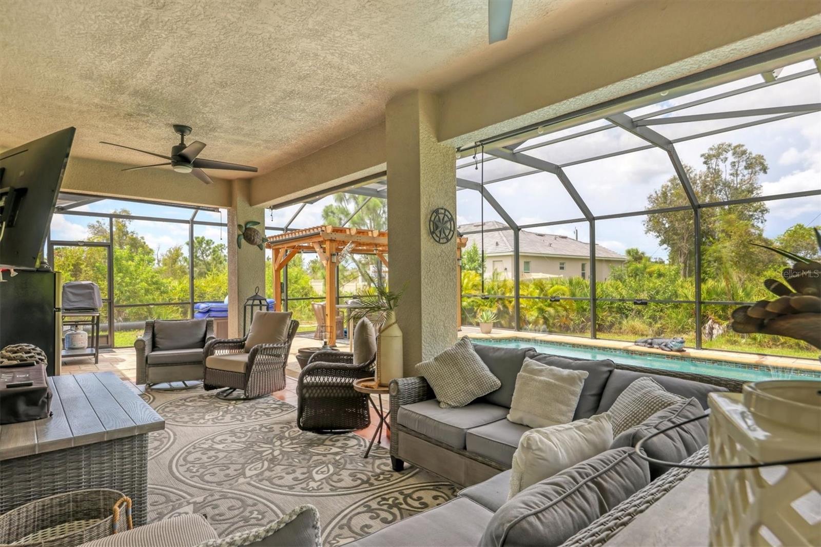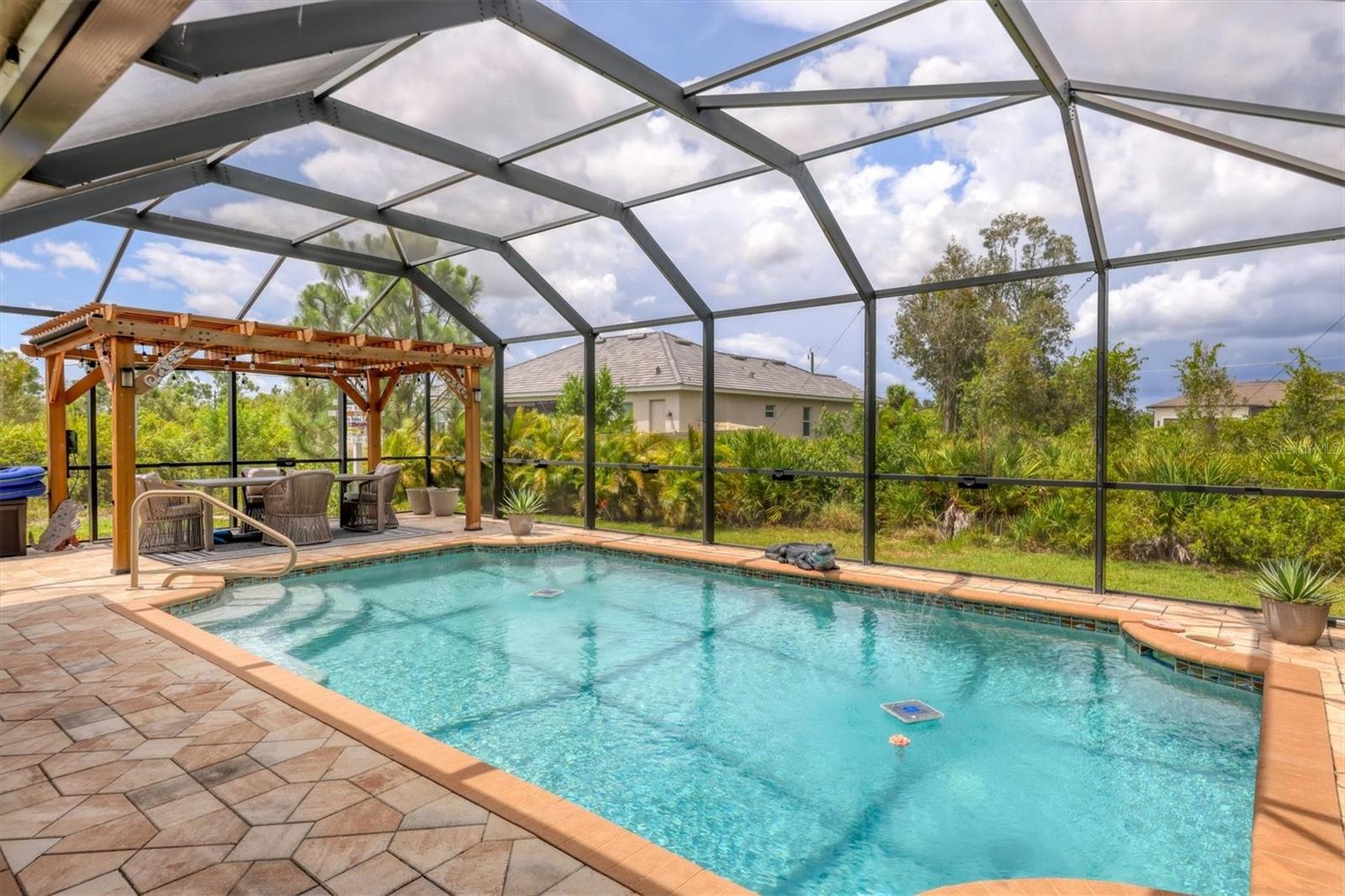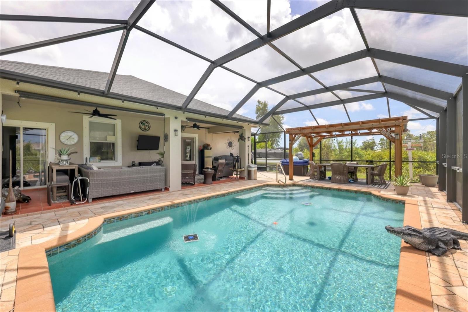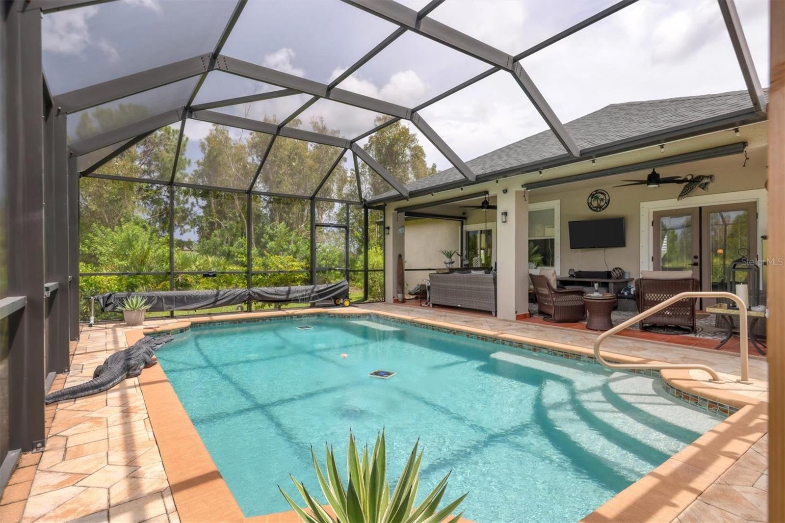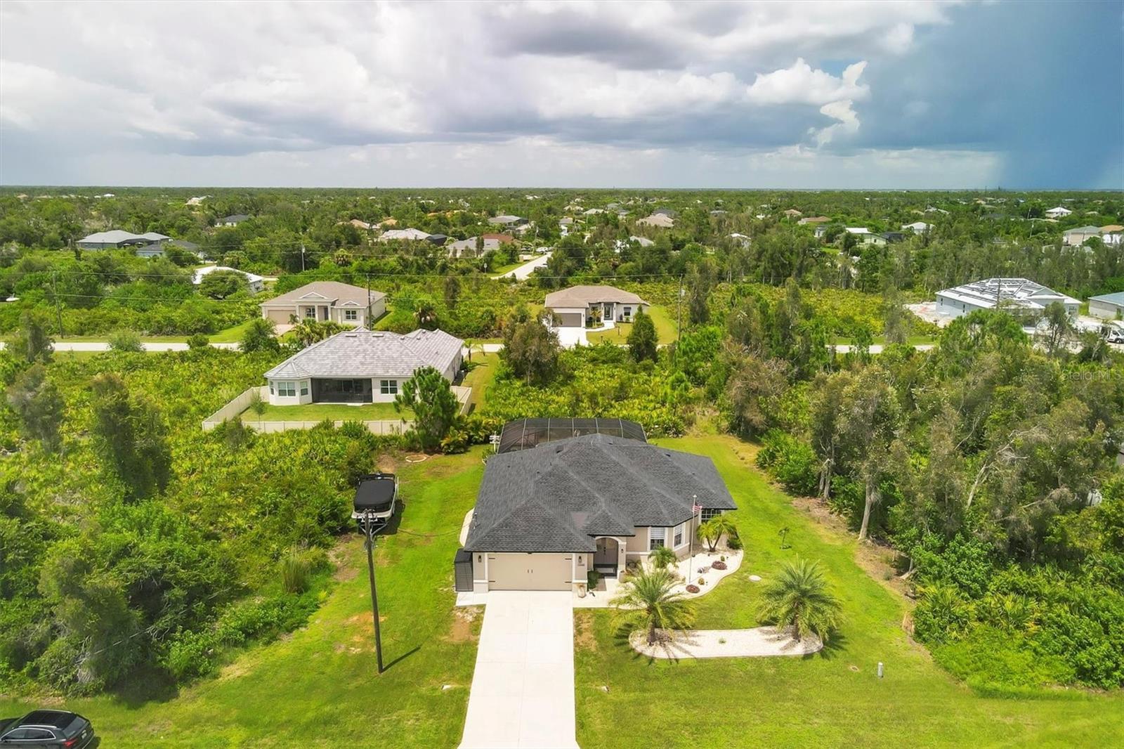 Beautiful pool home in desirable South Gulf Cove. This light bright home features 3 bedrooms, study/ den, and 2 full baths. The double entry doors lead into the living area with tons of natural light. This home offers tile throughout as well as soft neutral paint colors. The kitchen has plenty of cabinetry for storage, granite counter tops, stainless appliances and has an opening into the great room. The great room is complemented with french doors that lead out to the oversized lanai and heated pool area. The generous master suite has access to the lanai and pool area through the sliders that help bring in lots of natural light. The ensuite master bath is nicely appointed with dual sinks and walk in shower. This impeccably kept home is complete with hurricane shutters. Upgrade's include New pool screens, all new appliances, new landscaping, new paint interior and exterior and new flooring.