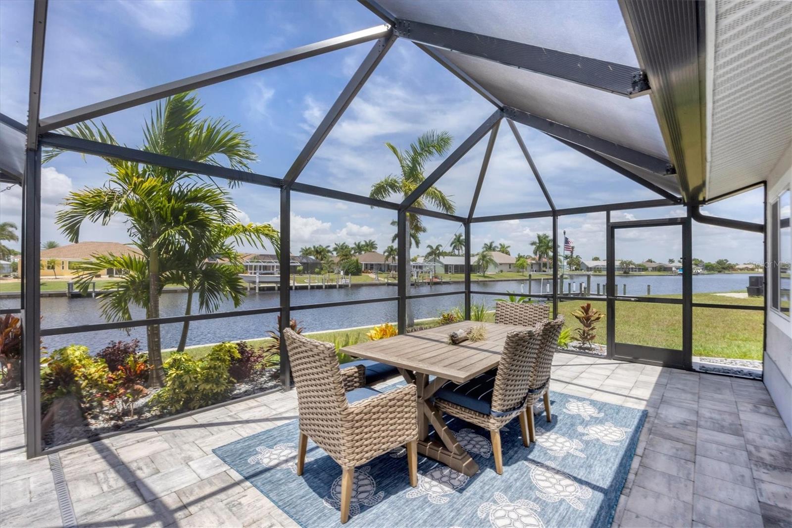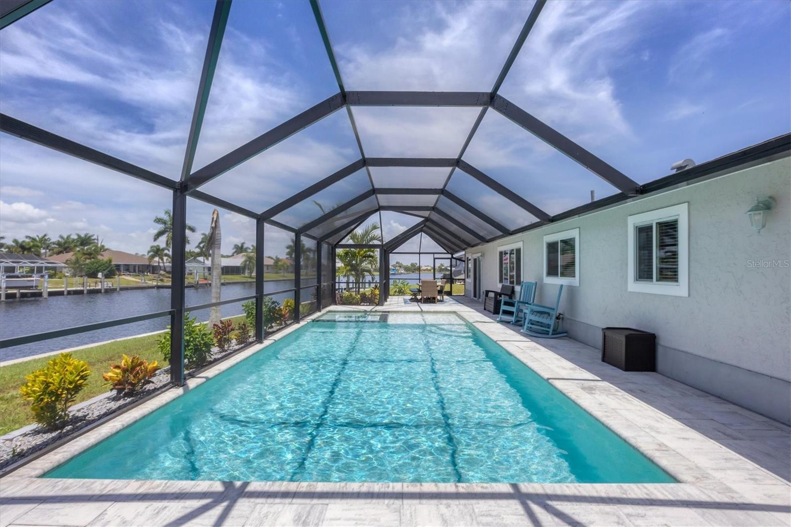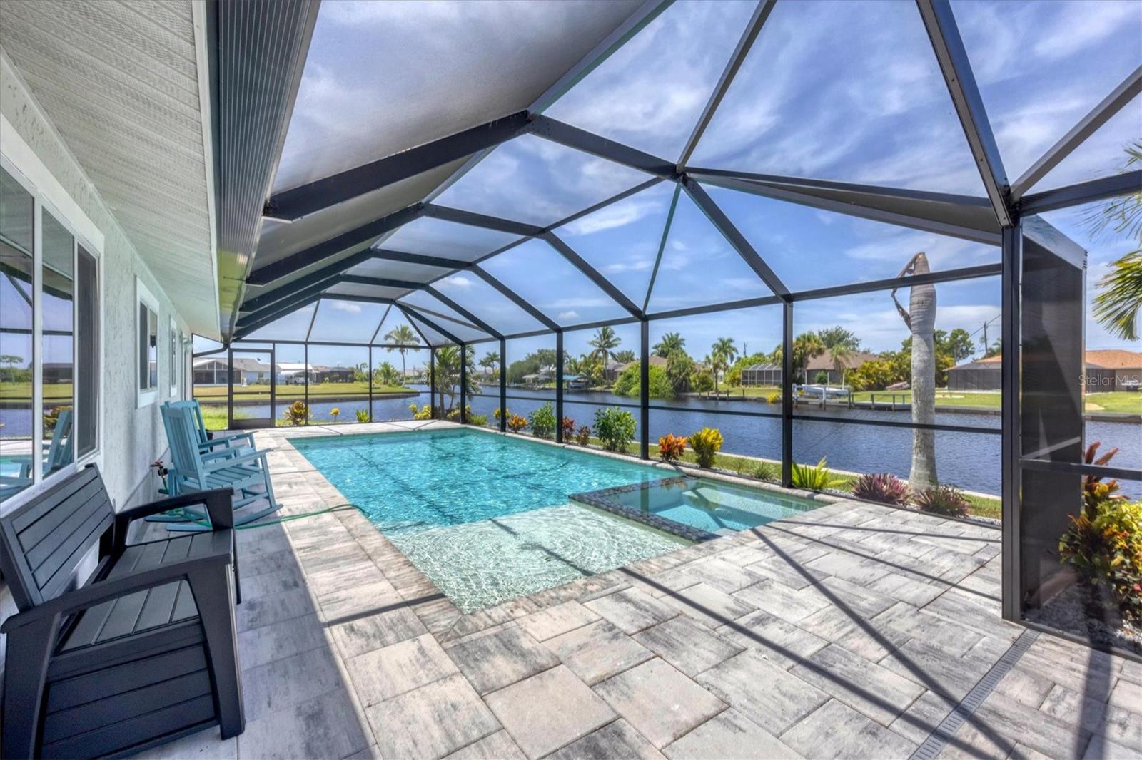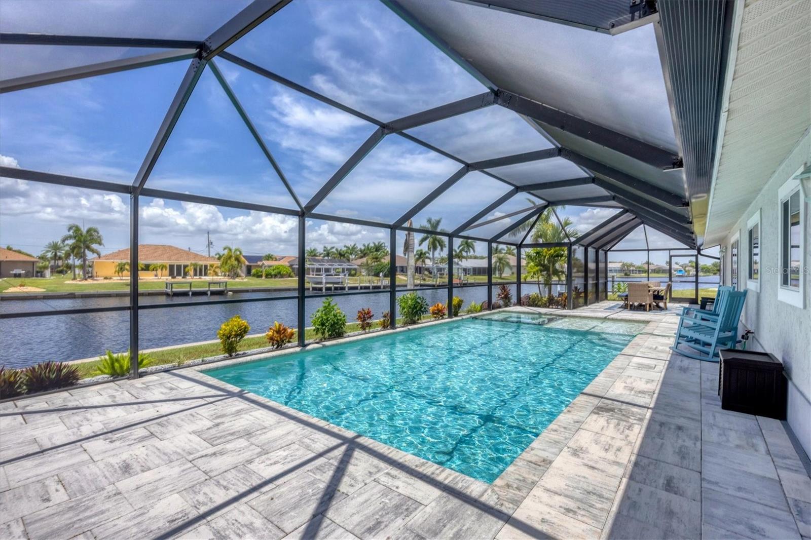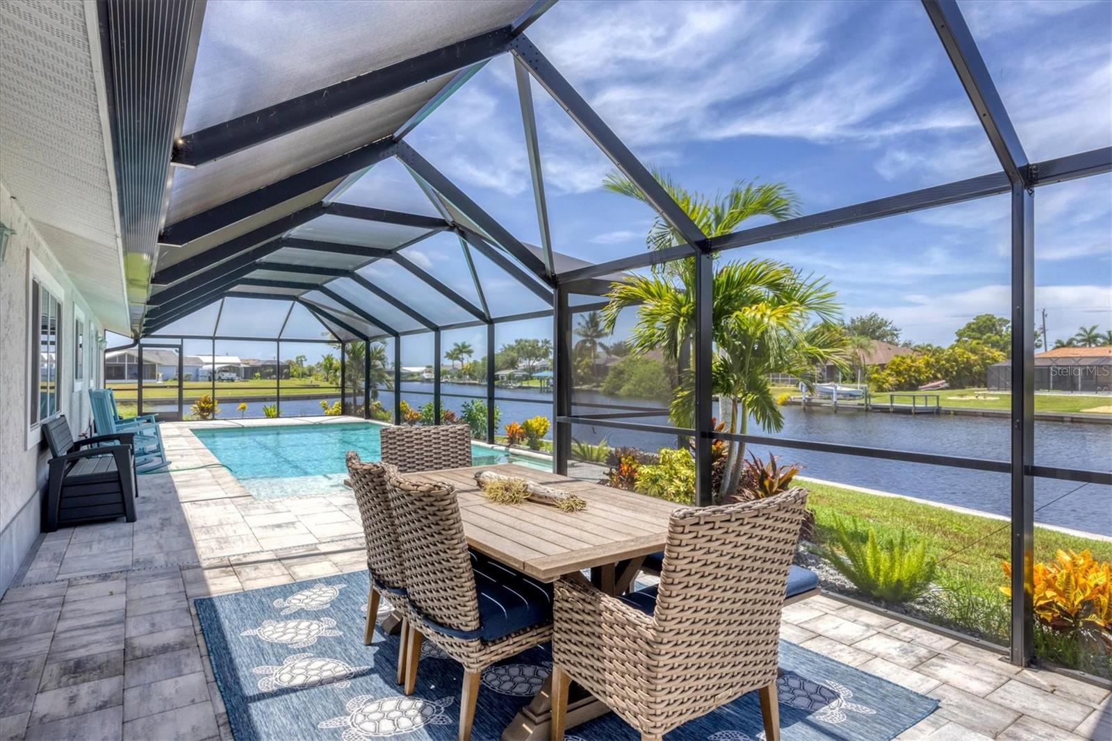 Waterfront living is redefined at this great saltwater-access furnished pool home that offers breathtaking water views of intersecting canals from this sailboat water tip lot. Enjoy easy access water frontage with the 210 foot concrete seawall, no bridges out, and captivating Western sunset views. A cul-de-sac location, professional landscaping with drip irrigation, 2022 roof, and impact windows are just a few of the exterior features this home has to offer. Inside, you'll find easy-care tile flooring and neutral paint colors throughout. The formal living room seamlessly flows into the dining area and kitchen, ideal for entertaining. The kitchen has white cabinets, a stepped-up breakfast bar, and ample countertop space for the perfect blend of style and functionality. The ensuite master bedroom has dual reach-in closets, while the master bath offers a spacious step-in shower. There are two additional bedrooms, both with dual reach-in closets and the shared guest bath has a great tub/shower combo. The family room and master bedroom both feature sliding glass doors, offering stunning views and convenient pool access. Stepping outside into the newly screened cage area from 2023, you'll immediately notice the stunning pavers installed in 2022, creating the perfect setting for the pool with its sundeck shelf and spa. The entire outdoor living space is framed by the serene beauty of the water beyond the screened area, offering an idyllic spot to relax and watch the boats sail by. When you are ready to explore the area, you will find plenty of shopping, dining, and events just a short drive away. Additionally, this home is located close to two major league baseball spring training facilities, boat ramps, kayak launches and several parks. Contact us today for a private showing.