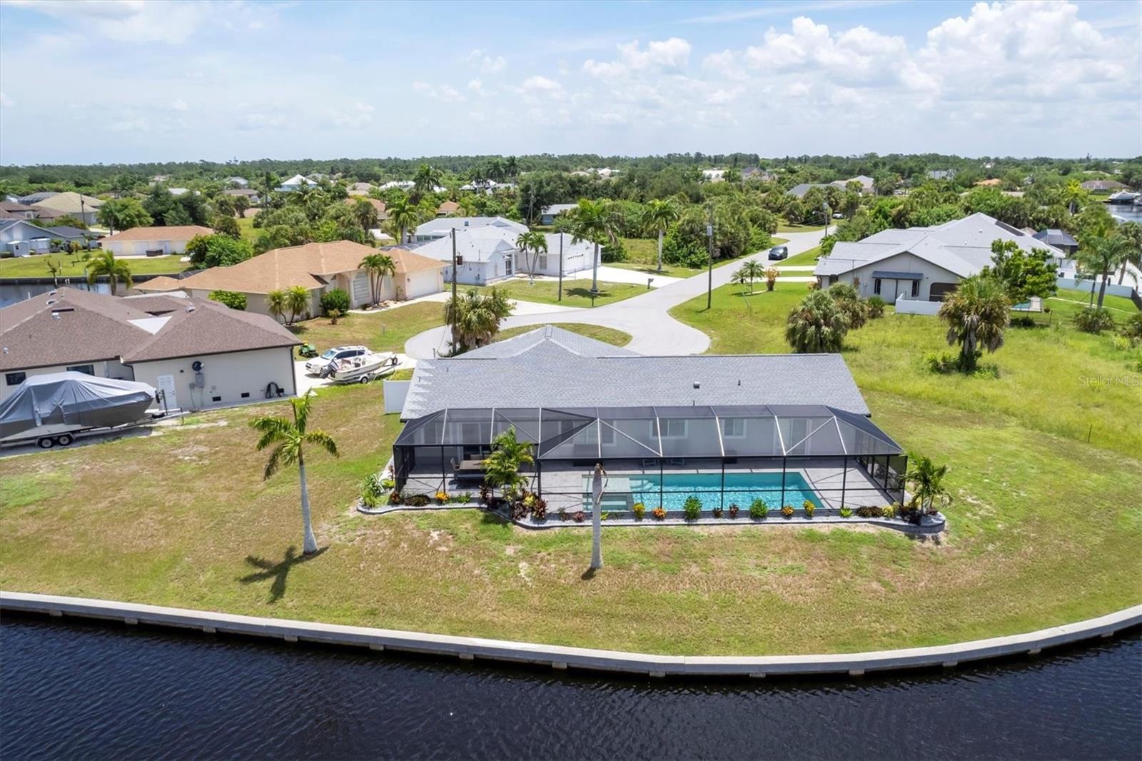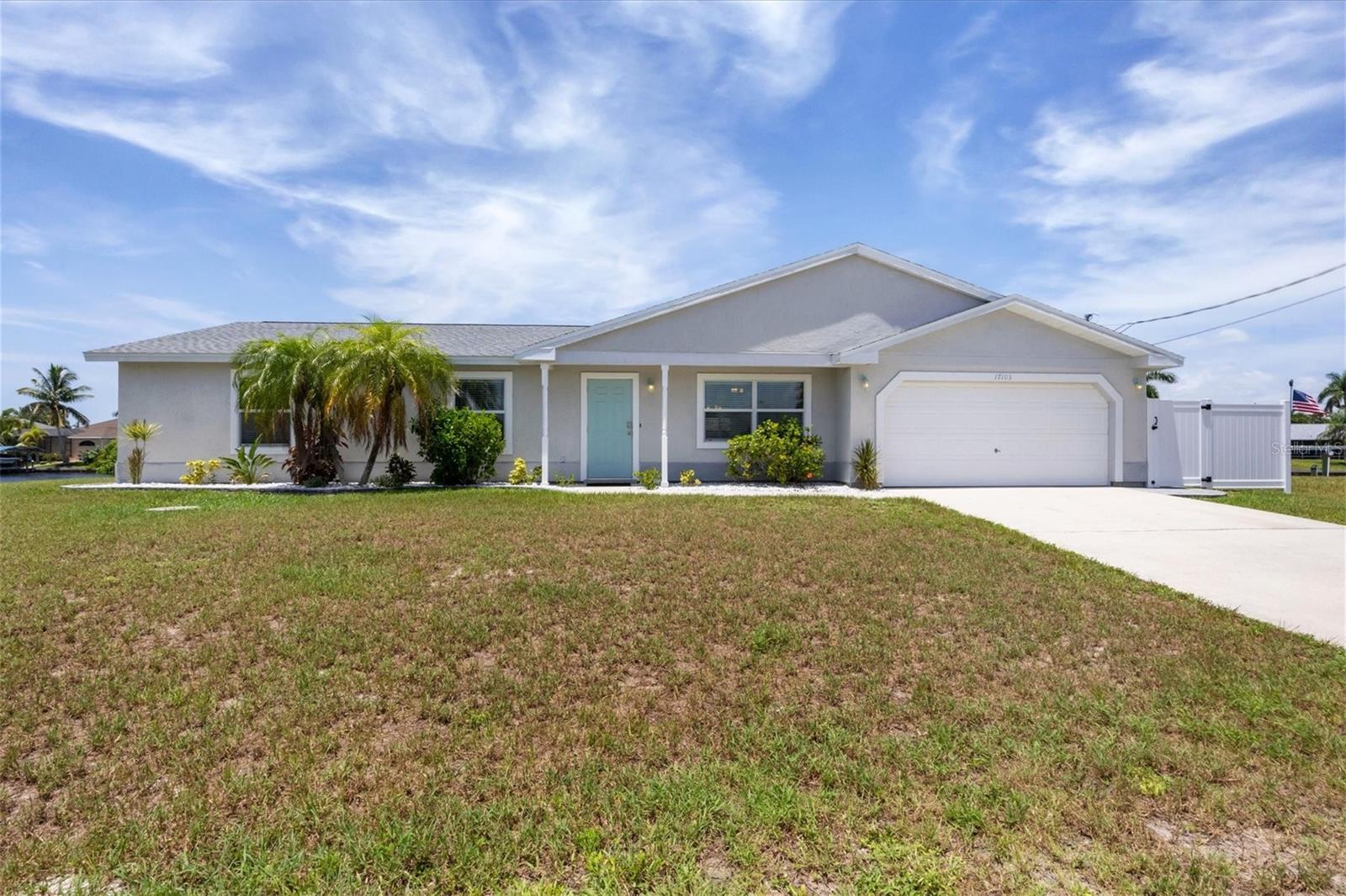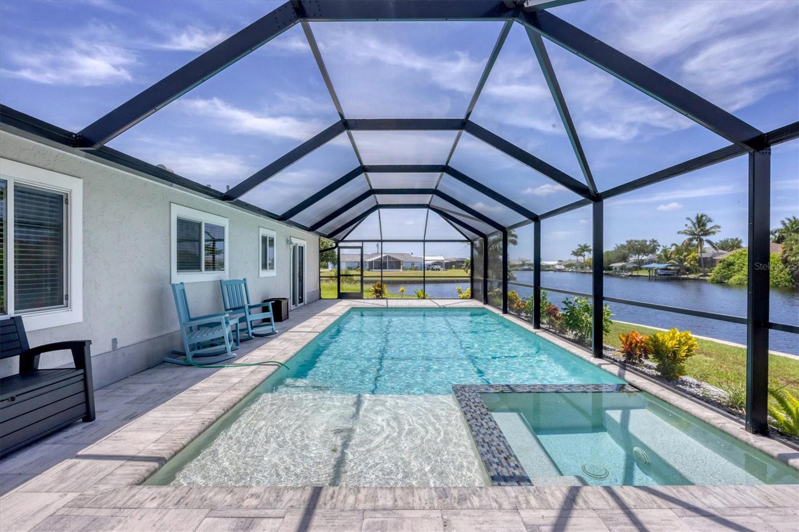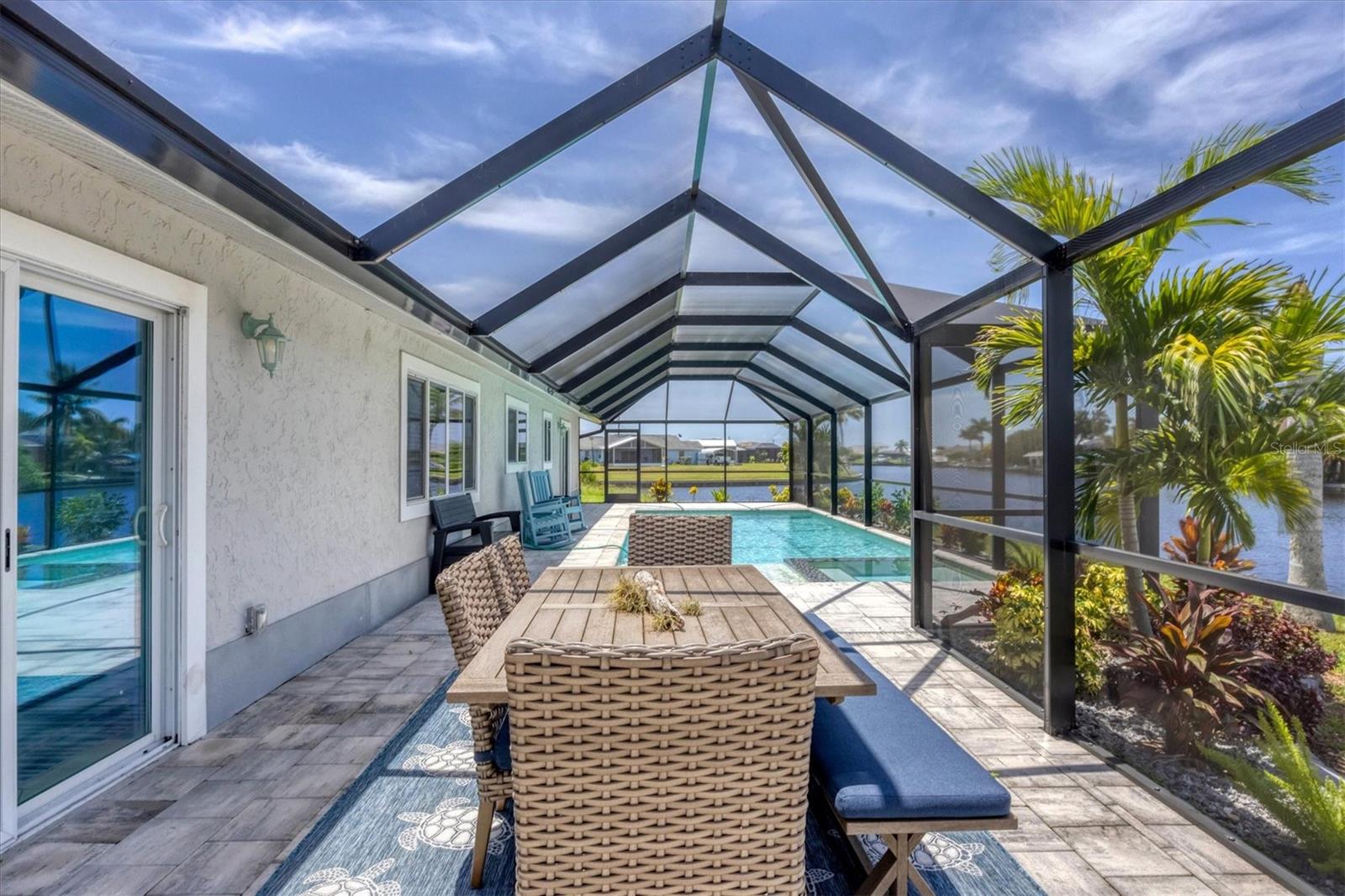 Waterfront living is redefined at this great saltwater-access furnished pool home that offers breathtaking water views of intersecting canals from this sailboat water tip lot. Enjoy easy access water frontage with the 210 foot concrete seawall, no bridges out, and captivating Western sunset views. A cul-de-sac location, professional landscaping with drip irrigation, 2022 roof, and impact windows are just a few of the exterior features this home has to offer. Inside, you'll find easy-care tile flooring and neutral paint colors throughout. The formal living room seamlessly flows into the dining area and kitchen, ideal for entertaining. The kitchen has white cabinets, a stepped-up breakfast bar, and ample countertop space for the perfect blend of style and functionality. The ensuite master bedroom has dual reach-in closets, while the master bath offers a spacious step-in shower. There are two additional bedrooms, both with dual reach-in closets and the shared guest bath has a great tub/shower combo. The family room and master bedroom both feature sliding glass doors, offering stunning views and convenient pool access. Stepping outside into the newly screened cage area from 2023, you'll immediately notice the stunning pavers installed in 2022, creating the perfect setting for the pool with its sundeck shelf and spa. The entire outdoor living space is framed by the serene beauty of the water beyond the screened area, offering an idyllic spot to relax and watch the boats sail by. When you are ready to explore the area, you will find plenty of shopping, dining, and events just a short drive away. Additionally, this home is located close to two major league baseball spring training facilities, boat ramps, kayak launches and several parks. Contact us today for a private showing.