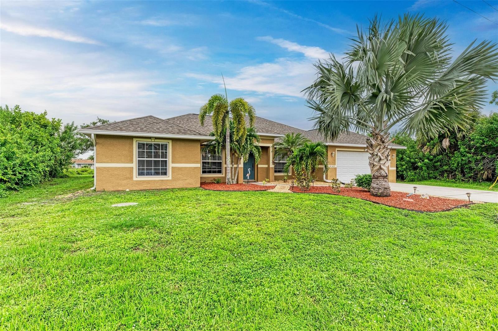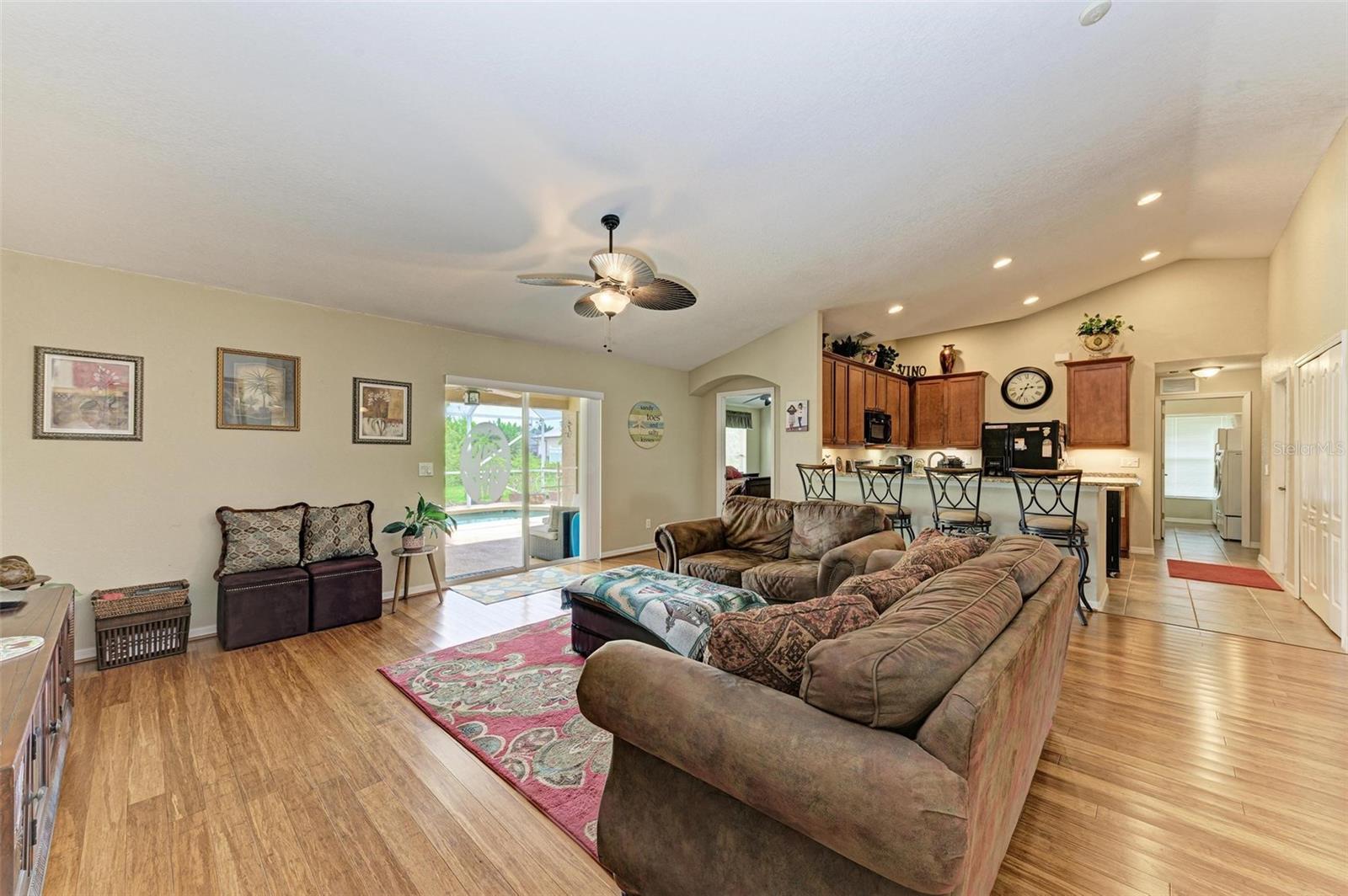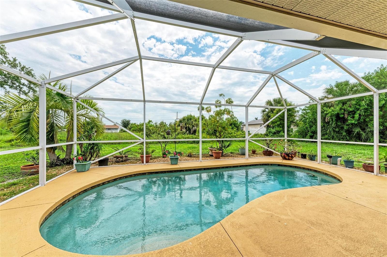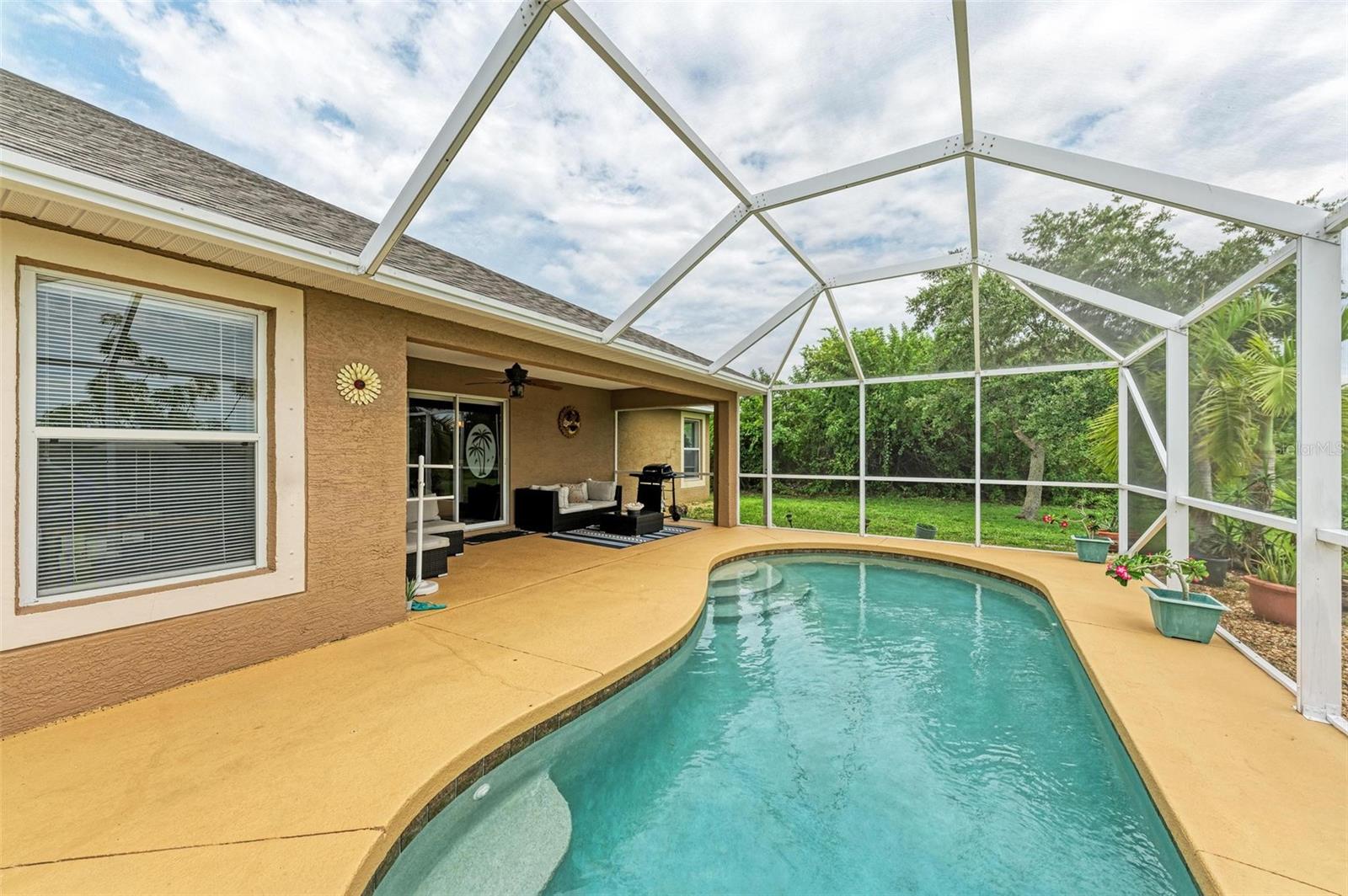 Well designed pool home in South Gulf Cove, a waterfront community where all lots are water accessible, is a great size for a large family. The single entry door leads into the living area with lots of natural light. As you step into this well defined, open floor plan home your eyes will be immediately drawn to its vaulted ceilings that create an airy atmosphere and sense of spaciousness. The rich, engineered bamboo flooring flows seamlessly throughout, offering both style and durability. The kitchen features gleaming granite counters and a breakfast bar that invites casual dining and social gatherings. The adjacent living and dining areas are bathed in natural light. This immaculate 2169 sf home features a den which can be utilized as a study, or extra guest room as it provides the opportunity to be as flexibile as your imagination. The kitchen features numerous cabinets and a large pantry for storage, granite counter tops, breakfast bar and desk. The great room is enhanced by a set of sliding doors that lead to the lanai/pool area to seamlessly combine exterior and interior environments. The generous owners' suite has access to the lanai and pool area through the sliders that help bring in lots of natural light. The room is a true retreat, boasting a generously sized walk-in closet that provides ample storage, and an ensuite bath designed for relaxation. The ensuite bath features dual sinks, garden tub and walk in shower. This well kept home is being offered with hurricane shutters, new asphalt shingle roof(2023), new lanai/pool screens (2023), gutters, and mature landscaping. The home reflects a perfect blend of functionality and comfort with excellent storage options throughout ensuring space for all your belongings. Further enticements included in this sale providing protection to you are an owners' transferable flood insurance policy and also a home warranty protection plan through July 2025. Why wait? Call for your private showing and buy now so you can start enjoying the Florida lifestyle in an area close to amenities of pristine beaches, boating, hiking and golfing opportunities, fine dining, and more!