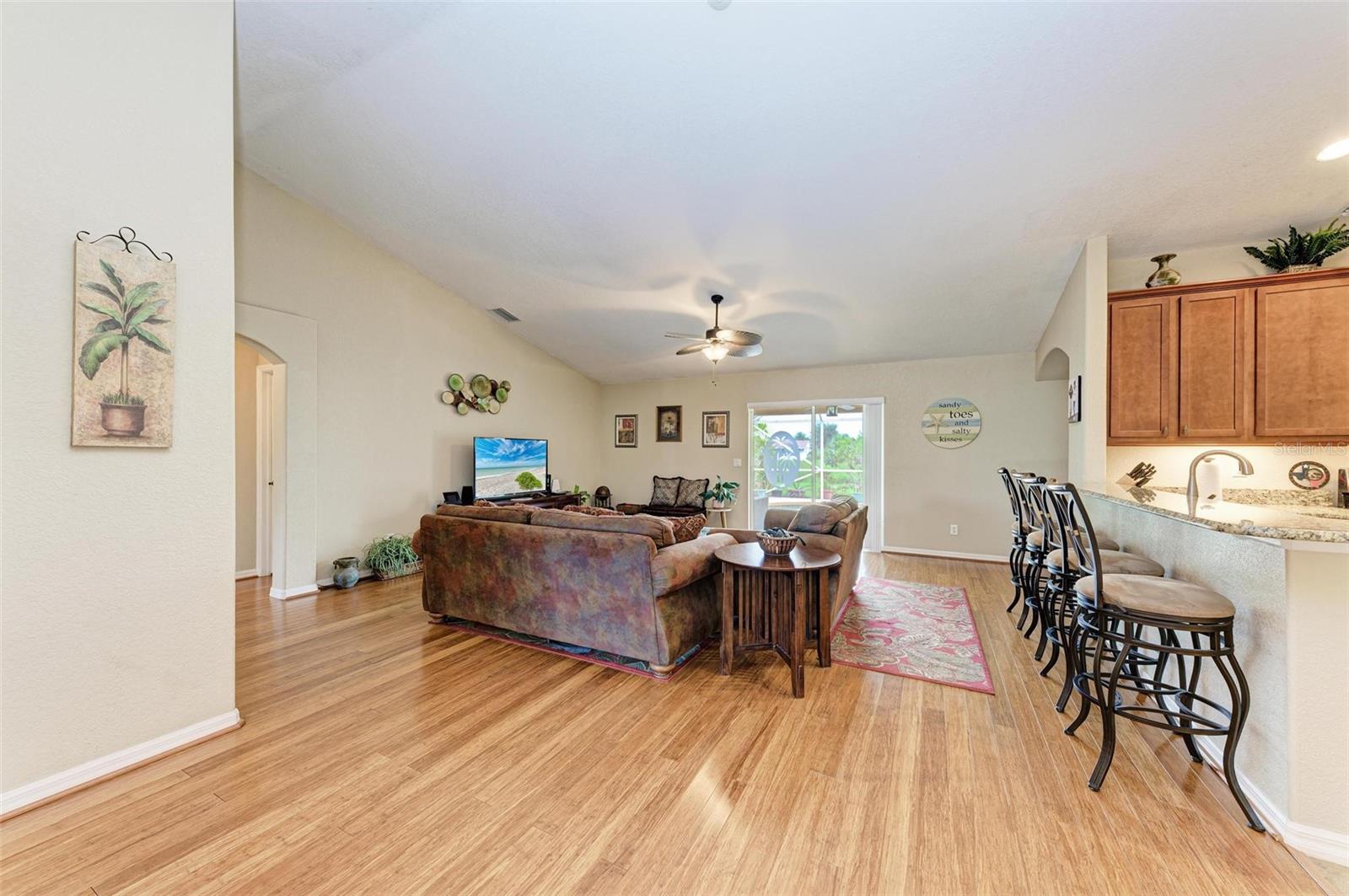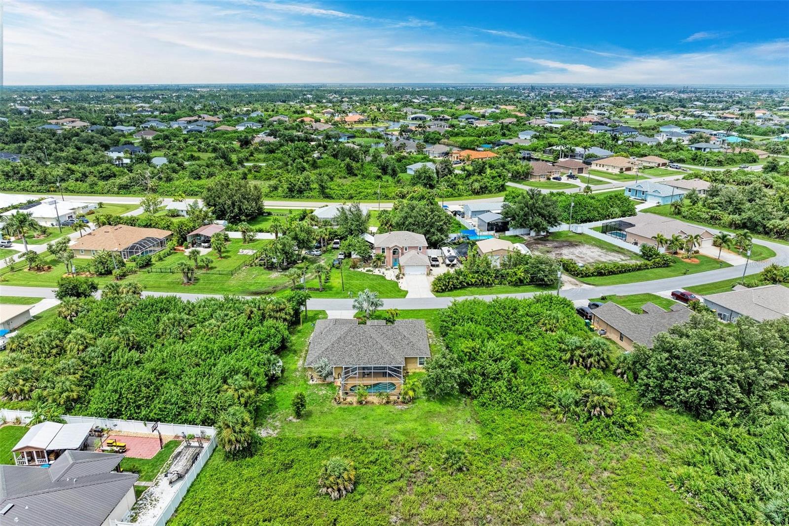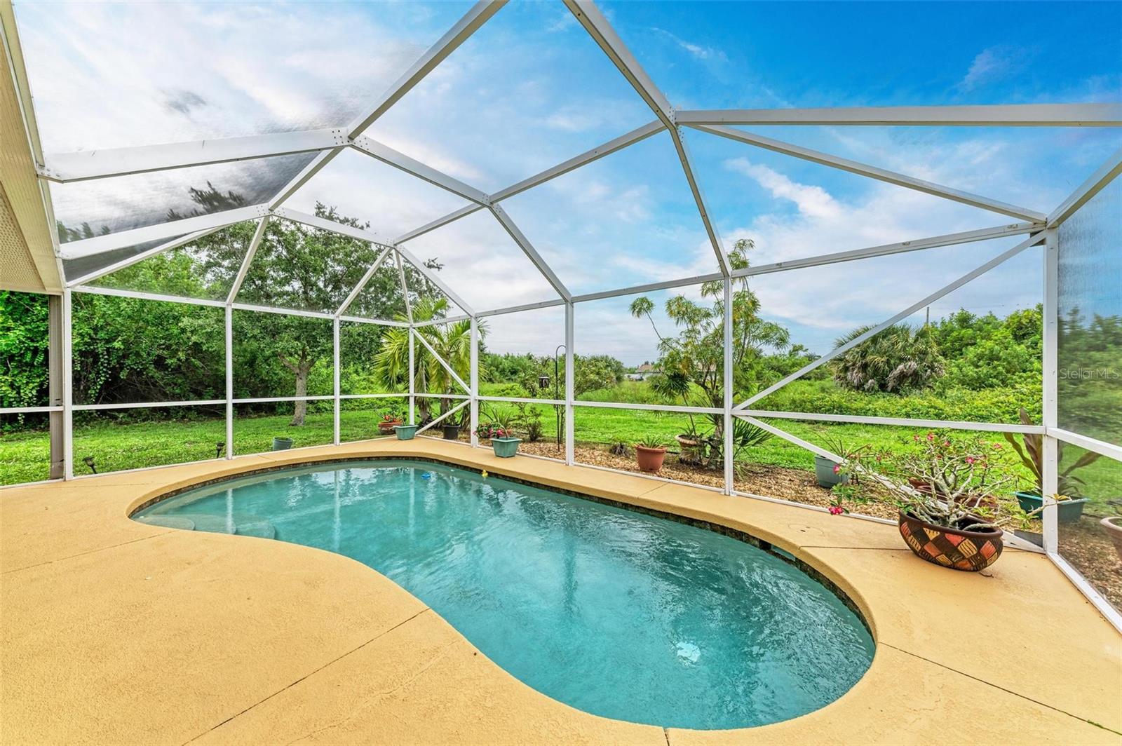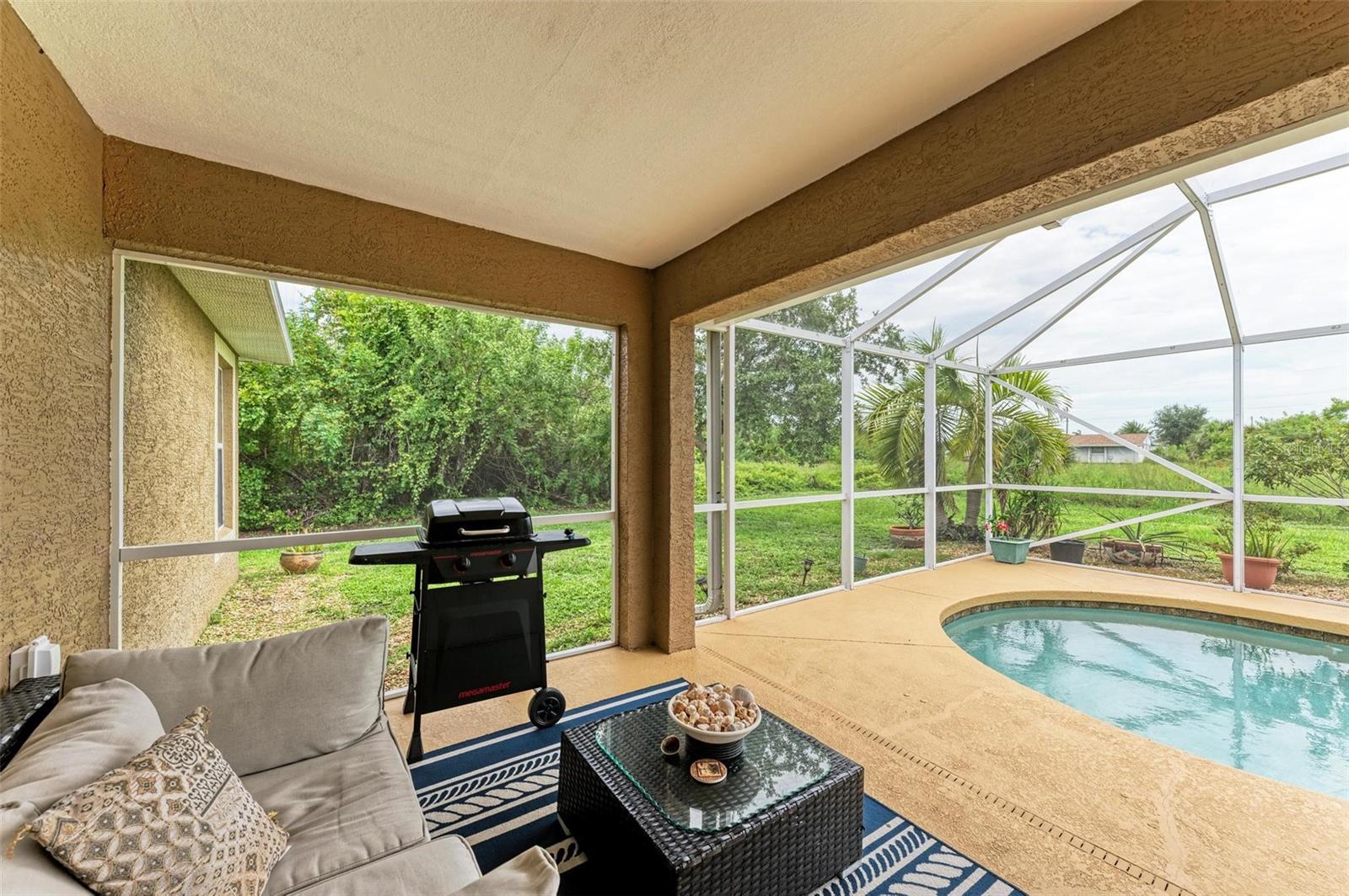 Well designed pool home in South Gulf Cove, a waterfront community where all lots are water accessible, is a great size for a large family. The single entry door leads into the living area with lots of natural light. As you step into this well defined, open floor plan home your eyes will be immediately drawn to its vaulted ceilings that create an airy atmosphere and sense of spaciousness. The rich, engineered bamboo flooring flows seamlessly throughout, offering both style and durability. The kitchen features gleaming granite counters and a breakfast bar that invites casual dining and social gatherings. The adjacent living and dining areas are bathed in natural light. This immaculate 2169 sf home features a den which can be utilized as a study, or extra guest room as it provides the opportunity to be as flexibile as your imagination. The kitchen features numerous cabinets and a large pantry for storage, granite counter tops, breakfast bar and desk. The great room is enhanced by a set of sliding doors that lead to the lanai/pool area to seamlessly combine exterior and interior environments. The generous owners' suite has access to the lanai and pool area through the sliders that help bring in lots of natural light. The room is a true retreat, boasting a generously sized walk-in closet that provides ample storage, and an ensuite bath designed for relaxation. The ensuite bath features dual sinks, garden tub and walk in shower. This well kept home is being offered with hurricane shutters, new asphalt shingle roof(2023), new lanai/pool screens (2023), gutters, and mature landscaping. The home reflects a perfect blend of functionality and comfort with excellent storage options throughout ensuring space for all your belongings. Further enticements included in this sale providing protection to you are an owners' transferable flood insurance policy and also a home warranty protection plan through July 2025. Why wait? Call for your private showing and buy now so you can start enjoying the Florida lifestyle in an area close to amenities of pristine beaches, boating, hiking and golfing opportunities, fine dining, and more!