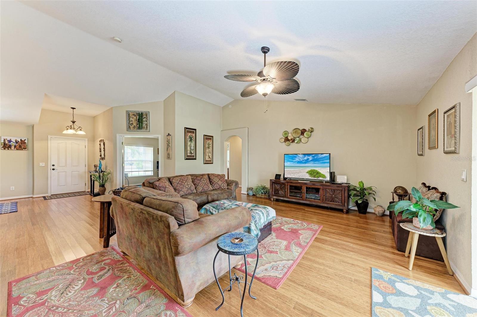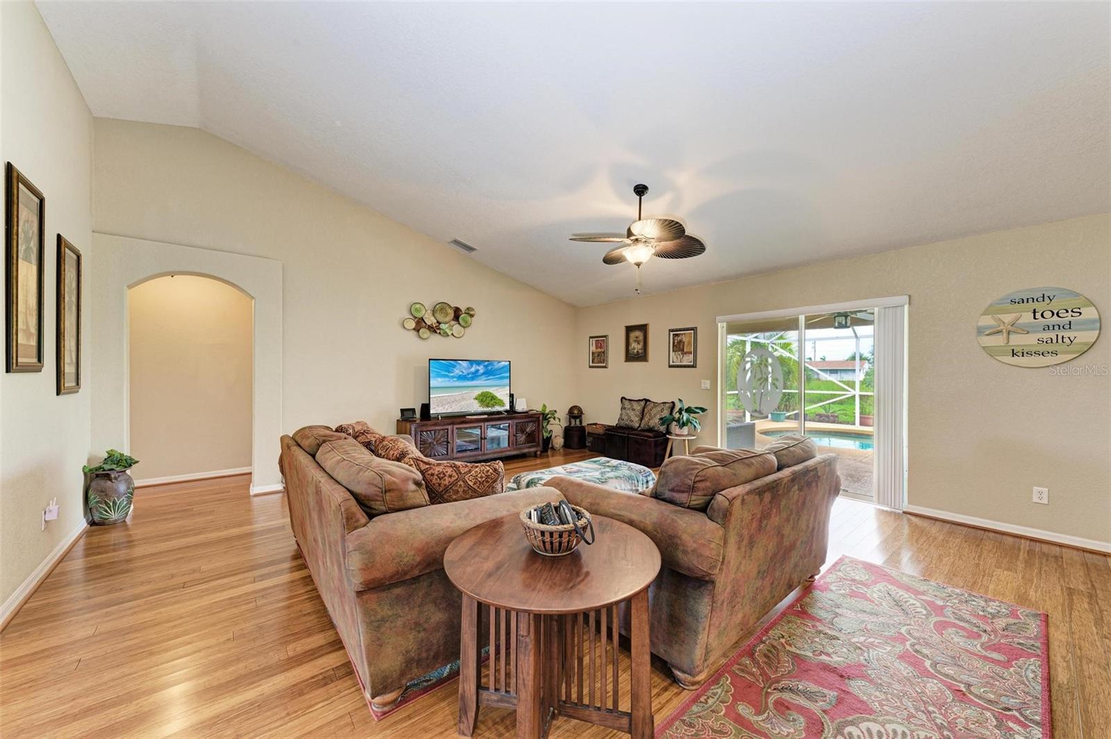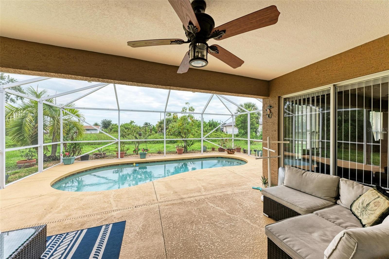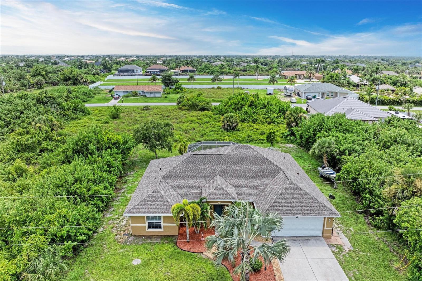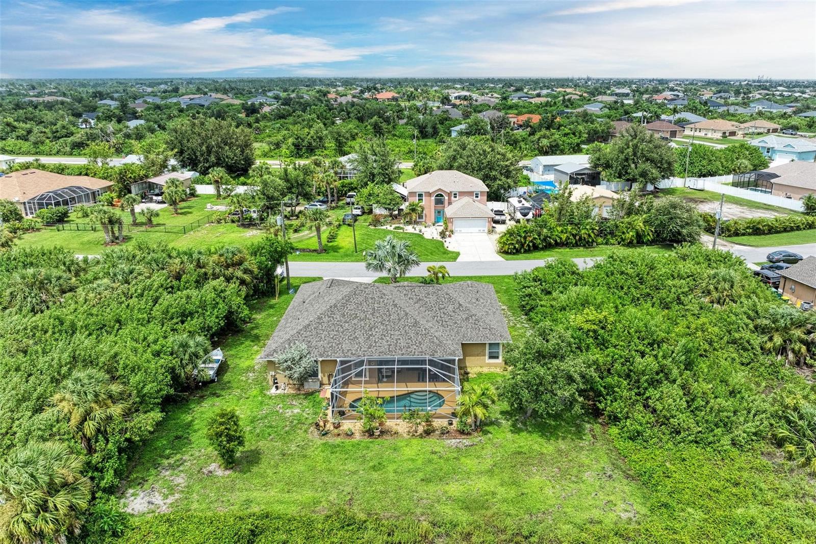 Well designed pool home in South Gulf Cove, a waterfront community where all lots are water accessible, is a great size for a large family. The single entry door leads into the living area with lots of natural light. As you step into this well defined, open floor plan home your eyes will be immediately drawn to its vaulted ceilings that create an airy atmosphere and sense of spaciousness. The rich, engineered bamboo flooring flows seamlessly throughout, offering both style and durability. The kitchen features gleaming granite counters and a breakfast bar that invites casual dining and social gatherings. The adjacent living and dining areas are bathed in natural light. This immaculate 2169 sf home features a den which can be utilized as a study, or extra guest room as it provides the opportunity to be as flexibile as your imagination. The kitchen features numerous cabinets and a large pantry for storage, granite counter tops, breakfast bar and desk. The great room is enhanced by a set of sliding doors that lead to the lanai/pool area to seamlessly combine exterior and interior environments. The generous owners' suite has access to the lanai and pool area through the sliders that help bring in lots of natural light. The room is a true retreat, boasting a generously sized walk-in closet that provides ample storage, and an ensuite bath designed for relaxation. The ensuite bath features dual sinks, garden tub and walk in shower. This well kept home is being offered with hurricane shutters, new asphalt shingle roof(2023), new lanai/pool screens (2023), gutters, and mature landscaping. The home reflects a perfect blend of functionality and comfort with excellent storage options throughout ensuring space for all your belongings. Further enticements included in this sale providing protection to you are an owners' transferable flood insurance policy and also a home warranty protection plan through July 2025. Why wait? Call for your private showing and buy now so you can start enjoying the Florida lifestyle in an area close to amenities of pristine beaches, boating, hiking and golfing opportunities, fine dining, and more!