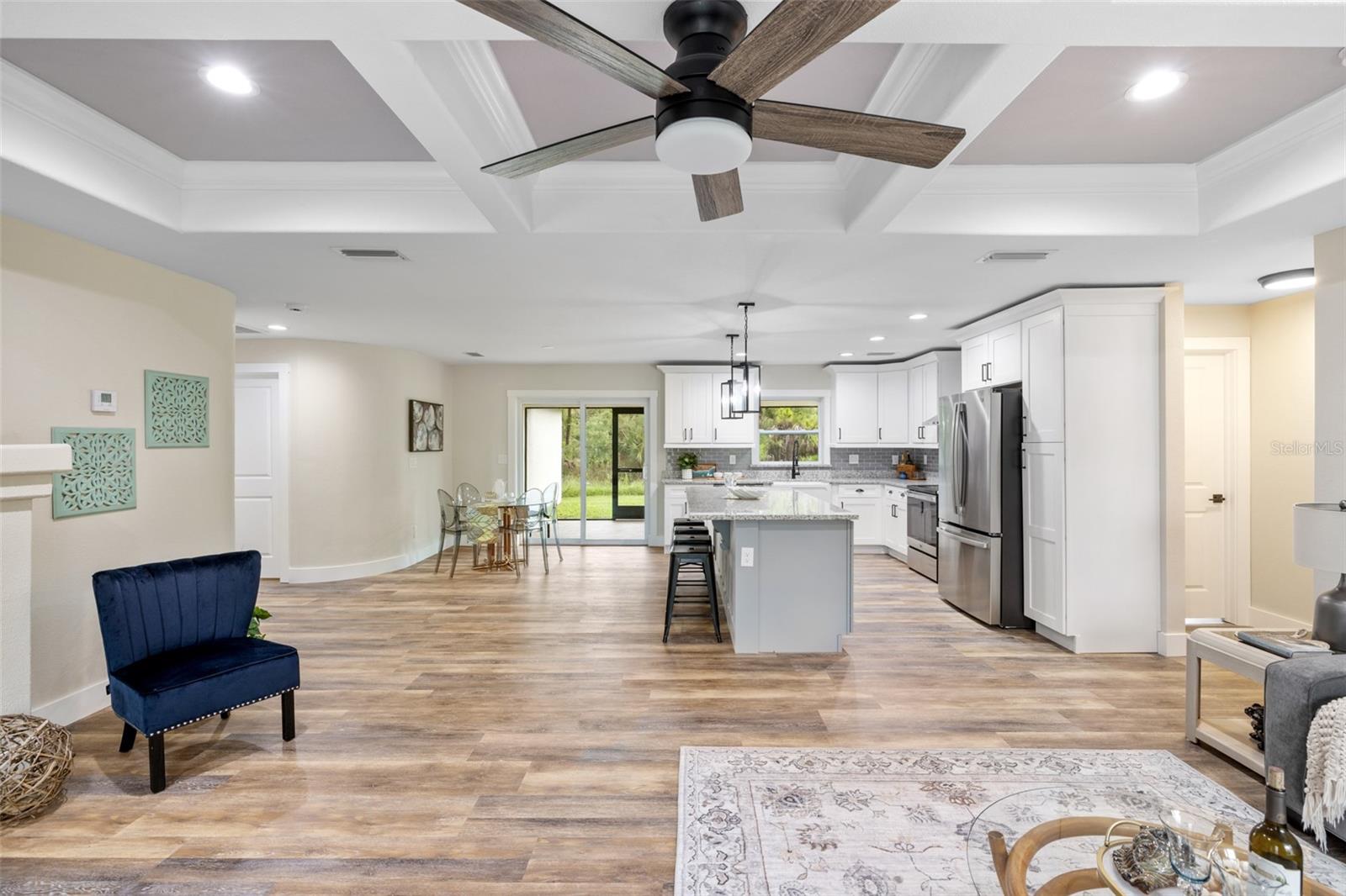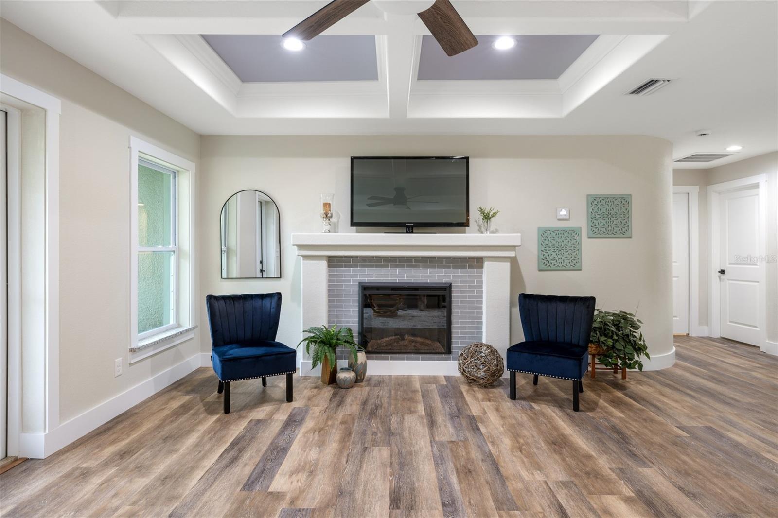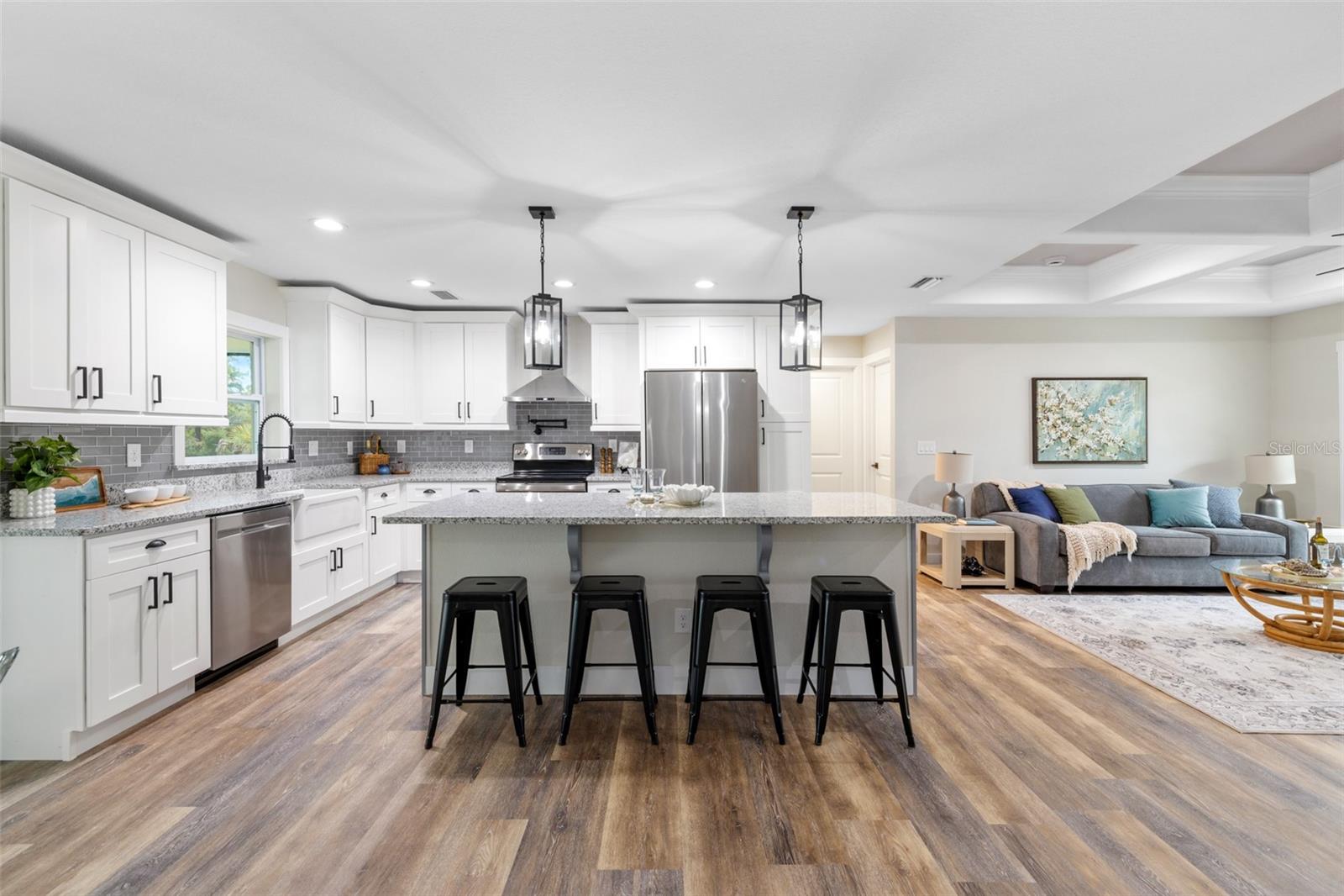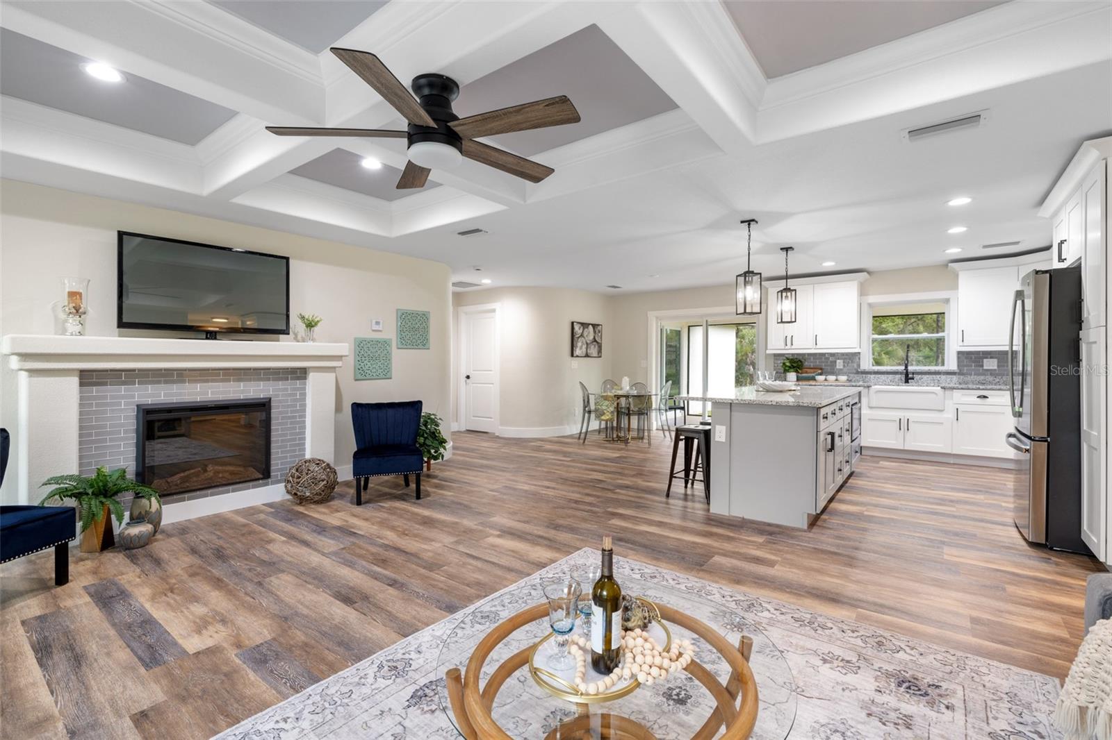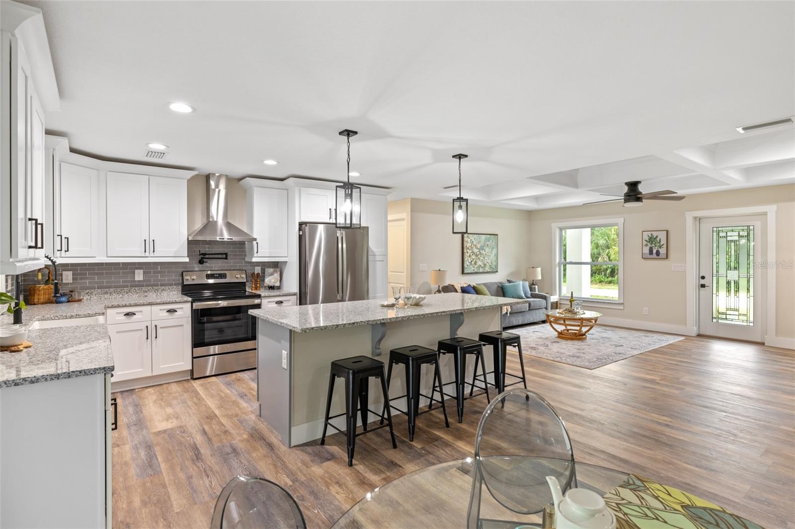 Price Improvement! Welcome to your dream home! This stunning new construction is the epitome of quality and craftsmanship, offering a lifestyle that feels like a vacation every day. From the moment you enter, you'll be captivated by the exquisite details and luxurious upgrades throughout. The open concept living space offers high, coffered ceilings with elegant crown molding and bullnose beading, creating a grand ambiance. Imagine relaxing in the living room, where a fireplace provides the perfect cozy atmosphere for cool evenings. The space seamlessly flows into an impressive open kitchen, where no detail has been overlooked. The kitchen features an oversized island with granite countertops, solid wood soft-close cabinets and drawers, stainless steel appliances, a cast iron farmhouse sink, and more! Designer pendant lighting and LED recessed lighting add a touch of modern elegance, making this kitchen both functional and beautiful. Adjacent to the kitchen is the dining area with radius walls and a sliding glass door that leads to a screened-in lanai. The lanai is complete with a wet bar and granite countertop, perfect for weekend barbecues or quiet afternoons spent enjoying the Florida sunshine. The master suite is a true retreat, offering both luxury and comfort. Imagine waking up each morning in your spacious bedroom, sliding open the glass doors, and stepping out onto your private lanai to enjoy a peaceful moment with your coffee, listening to the gentle sounds of nature. The en-suite master bath is fully equipped with dual sinks, granite countertops, a large Roman walk-in shower with upgraded tile and a niche for toiletries, and a private water closet. Barn doors lead to an expansive walk-in closet, with an additional closet providing even more storage. The split floor plan ensures privacy, with two additional large bedrooms, each with walk-in closets located on the opposite side of the home. Additional upgrades include 6" baseboards throughout, two-panel doors, granite windowsills, and an inside laundry room with pocket doors and a large walk-in closet. Living in this home means enjoying the finer details every day—upgraded design features indulge the quiet elegance of this property. You will also note that the exterior of the home is just as impressive, with a hurricane impact leaded glass front door and windows, large front and back yards, and professional landscaping. There’s plenty of room for a pool and a large storage shed, offering endless possibilities to create your own backyard oasis. Situated in a prime location, this home offers easy access to beaches, boating, restaurants, shopping, top notch golf courses and spring training facilities. The area is serviced by four airports making travel a breeze. With no HOA or CDD and city water you can enjoy all the amenities of Florida living without any of the hassles. This is more than just a house; it’s the home where your best memories will be made. Come live the dream in this spectacular new construction home, where every day feels like a vacation.
