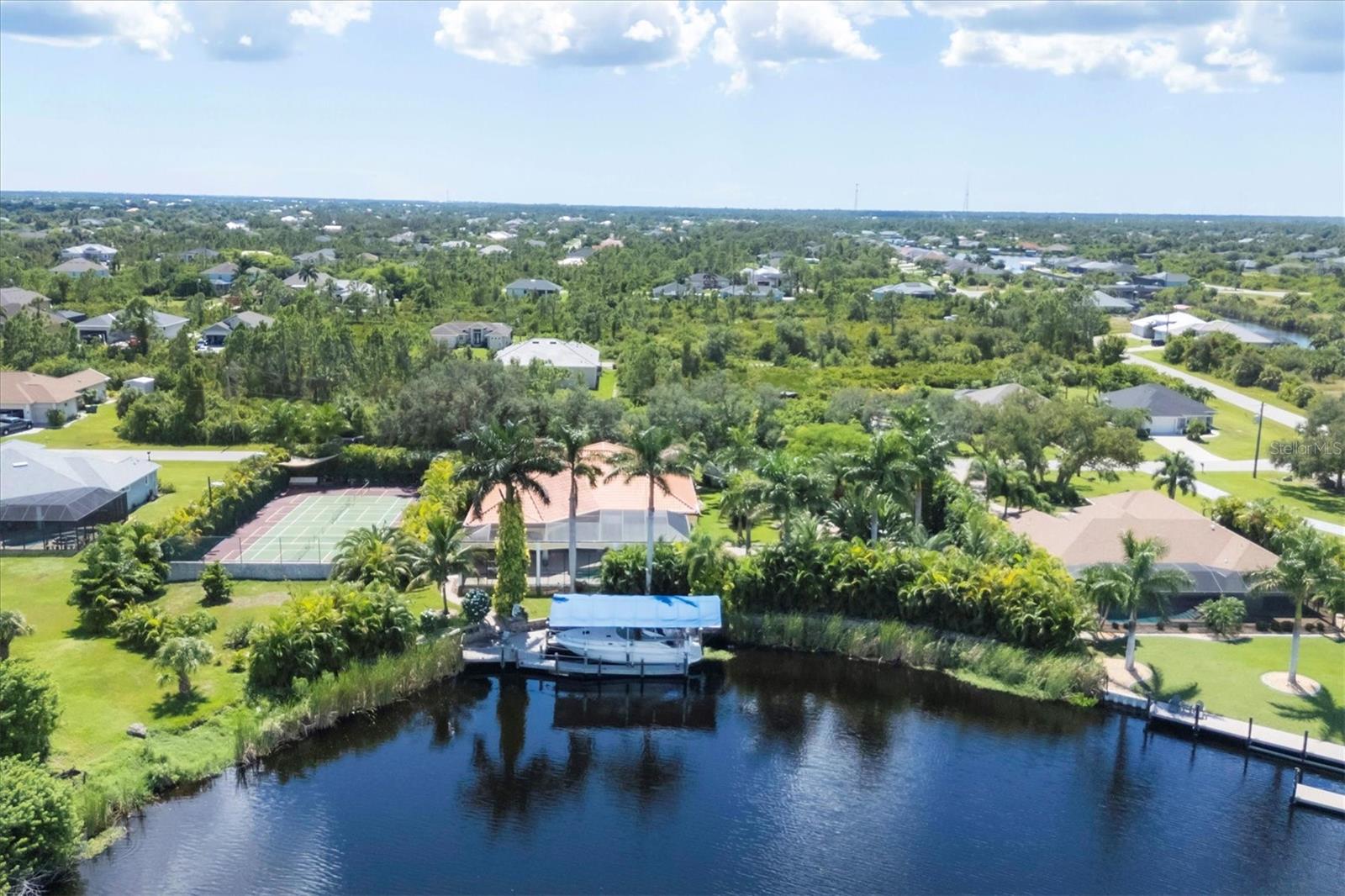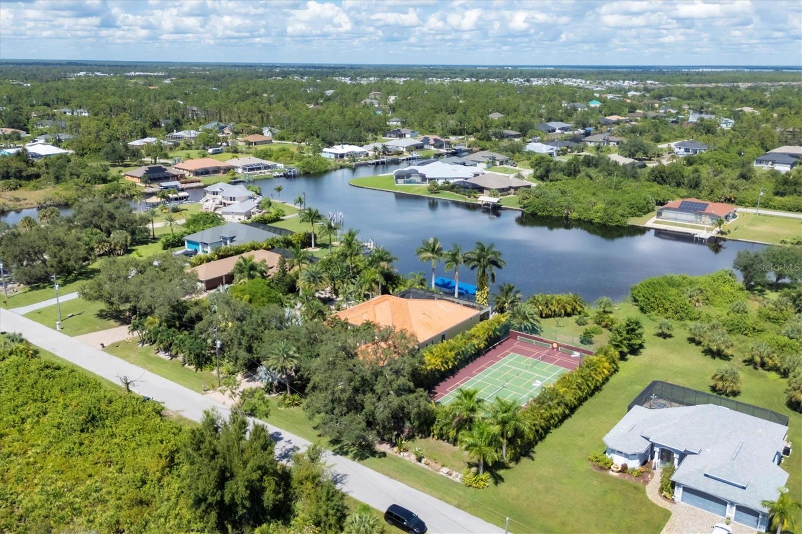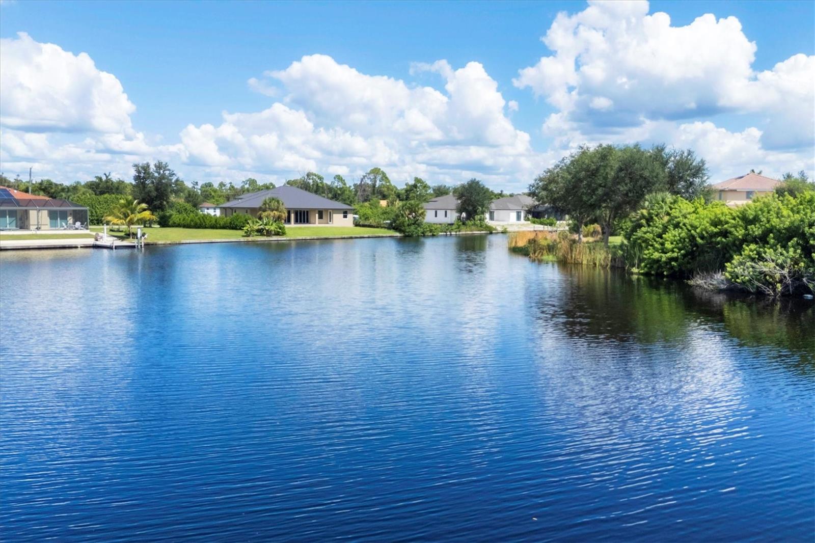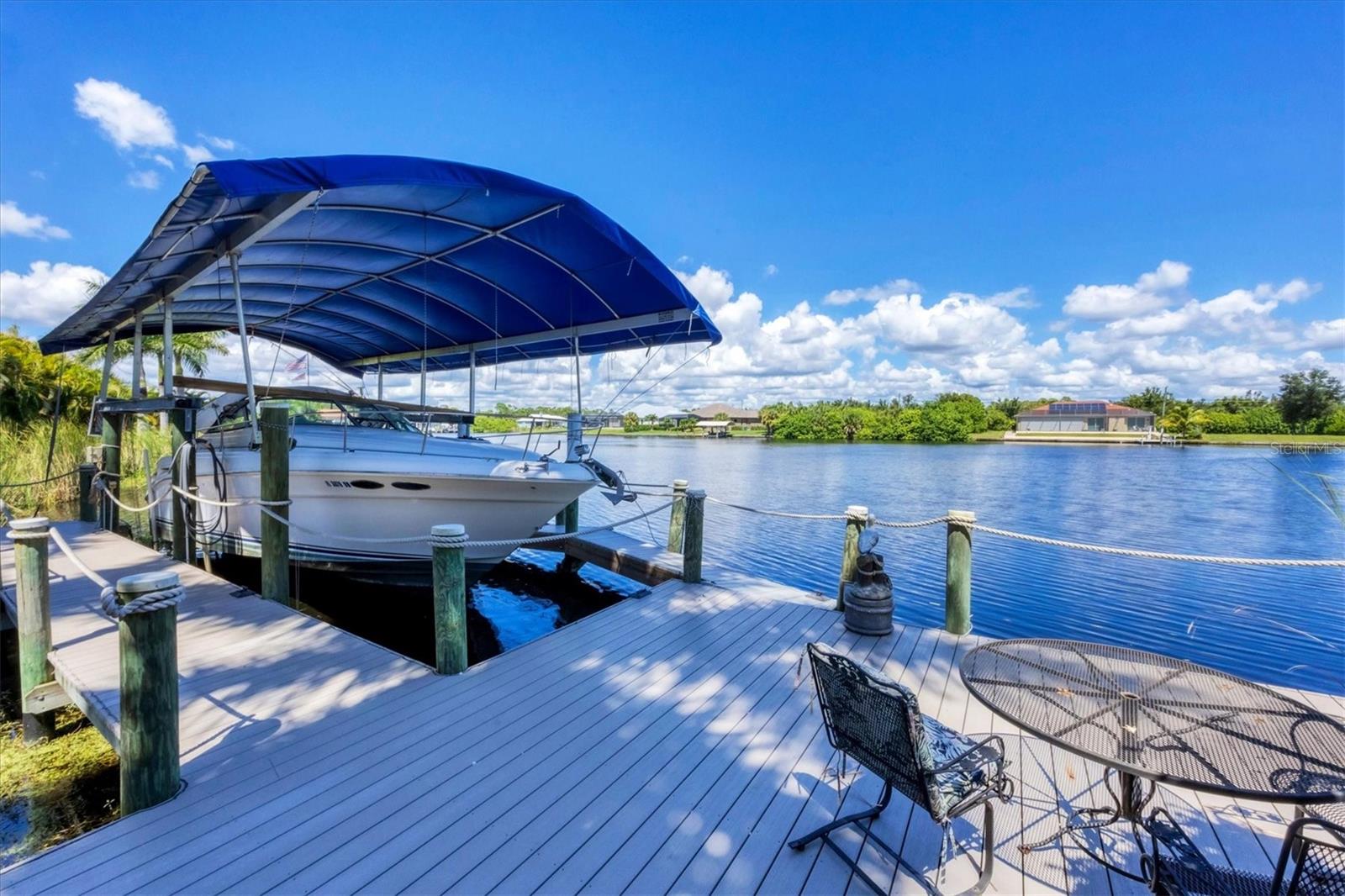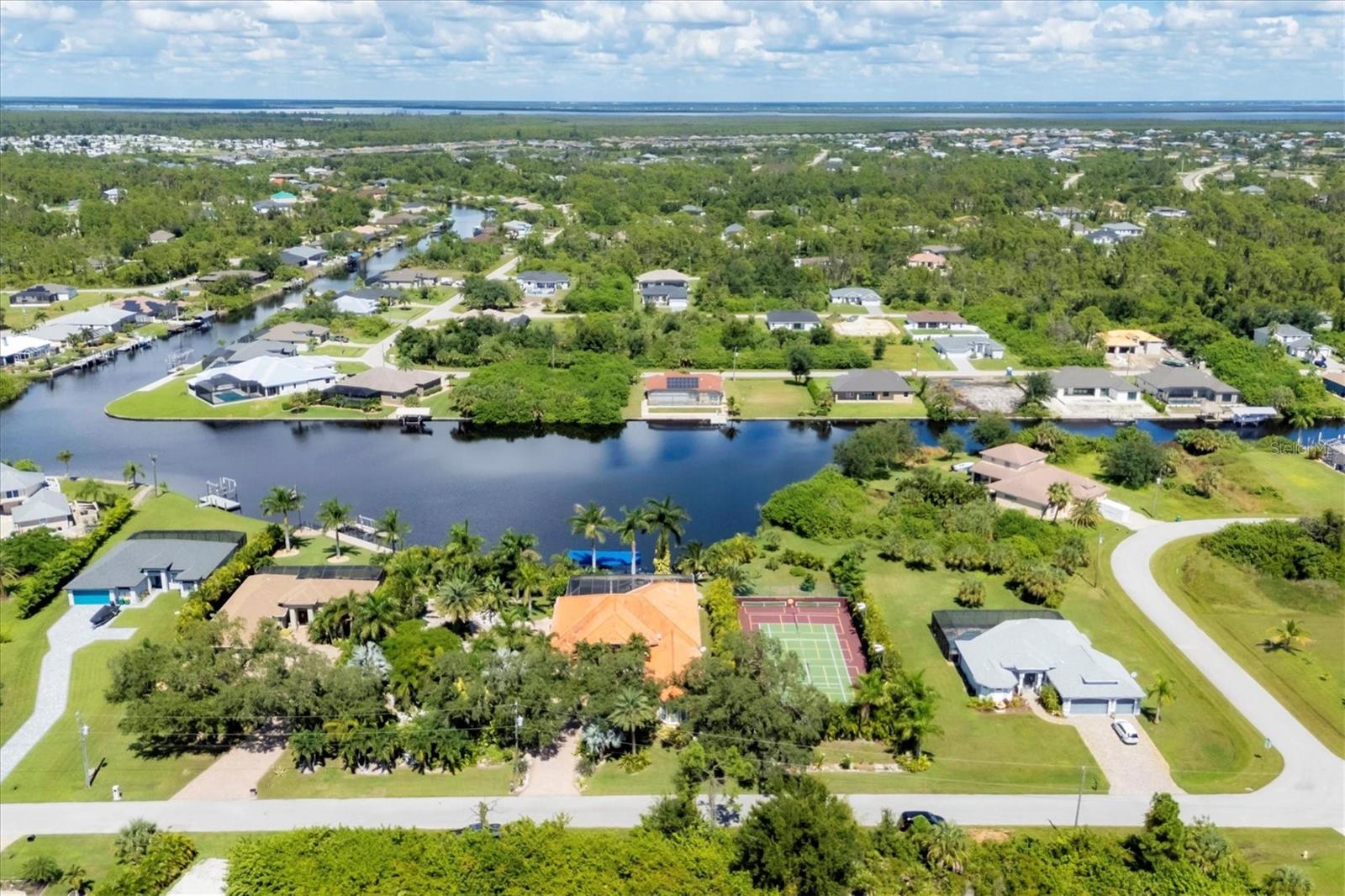 Experience luxury in this canal-front entertainment waterfront home! Set on over an acre across three spacious lots in a tranquil neighborhood off the beaten path, but with easy access to Boca Grande, Englewood beaches, & Port Charlotte shopping. This finely constructed 3 bed, 4 bath home offers elegance with soaring ceilings, natural light, and impeccable details. Enjoy stunning water views, arches, tray ceilings, custom moldings, solid core doors, plantation shutters, and more. The chef's kitchen boasts top-tier stainless steel appliances, custom cabinetry, and a breakfast bar. Perfect for entertaining, the home features two living rooms, a built-in bar, wine cooler, and three en-suite bedrooms. The master suite is a peaceful retreat with Brazilian mahogany floors, canal views, and a spa-like bath with dual sinks, a soaking tub, and a triple-head shower. Plus, a private office/den, tankless water heater, and two zoned A/C units for your comfort and enjoyment. The resort-style pool area, private fire pit, and lighted pickleball/tennis courts make this property a party paradise. Situated on the serene Zephyr Waterway, with 210 feet of seawall, a 25,000 lb boat lift, and an oversized trek dock, it's a boaters dream. For a full list of the features, please refer to the attachments. Schedule a private tour and experience the luxurious space and amenities this home offers!