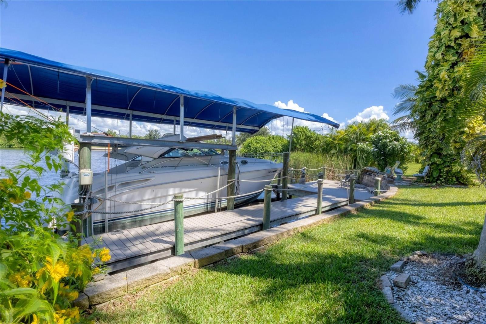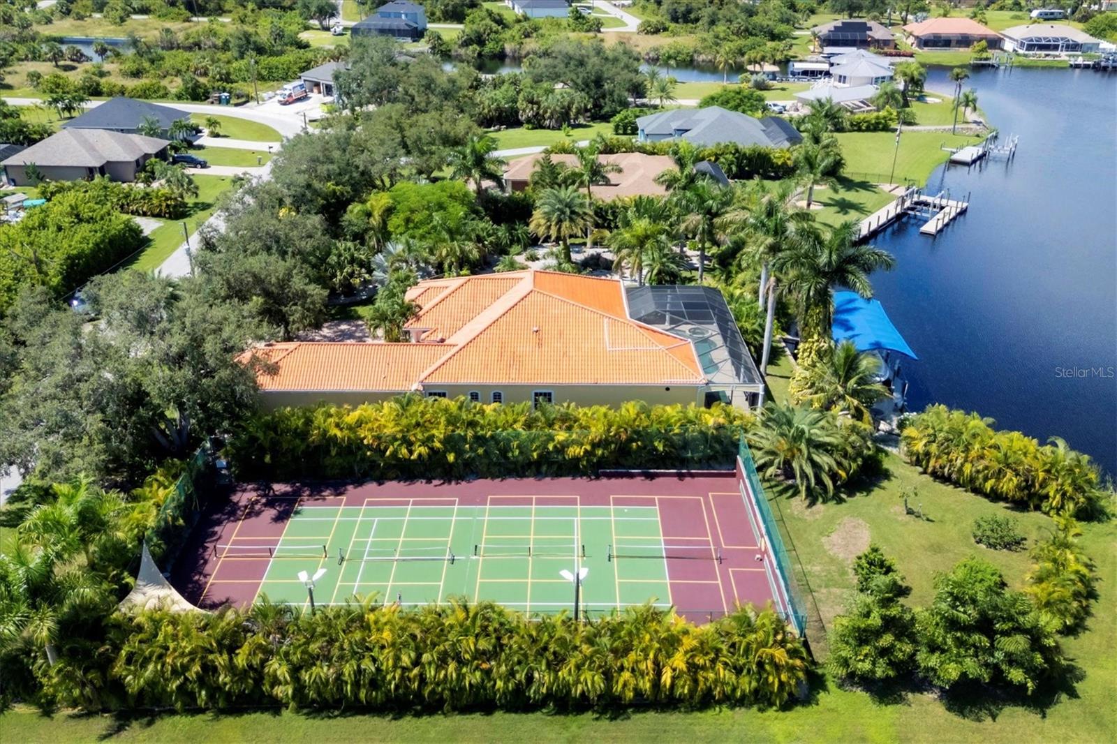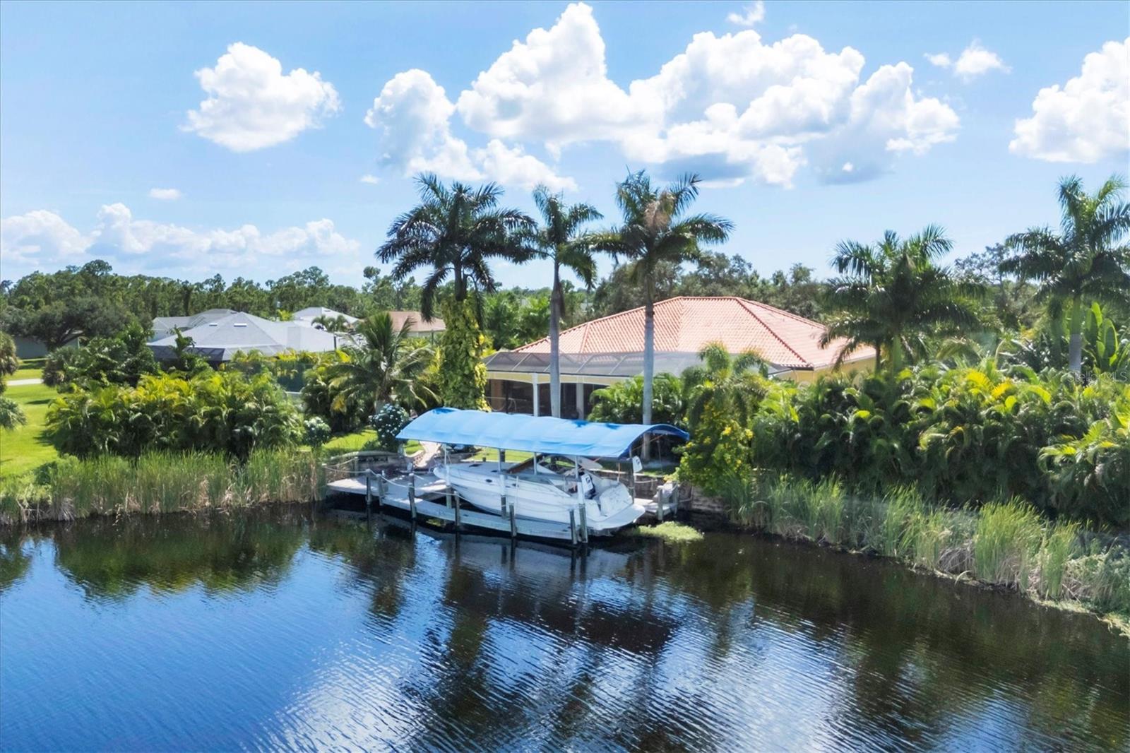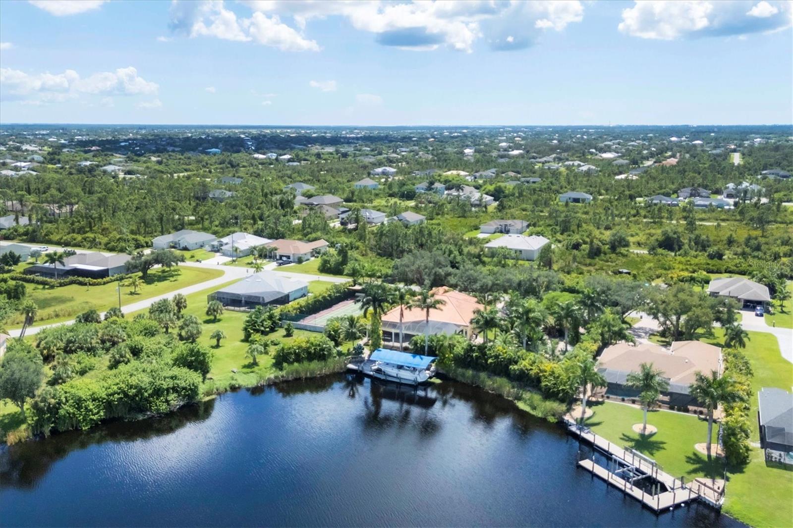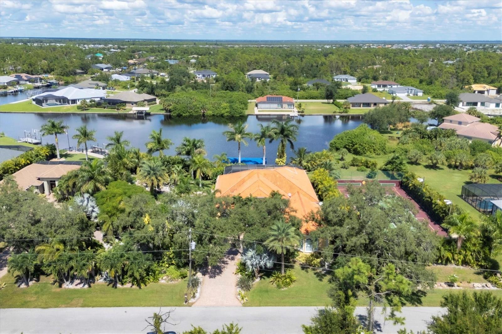 Experience luxury in this canal-front entertainment waterfront home! Set on over an acre across three spacious lots in a tranquil neighborhood off the beaten path, but with easy access to Boca Grande, Englewood beaches, & Port Charlotte shopping. This finely constructed 3 bed, 4 bath home offers elegance with soaring ceilings, natural light, and impeccable details. Enjoy stunning water views, arches, tray ceilings, custom moldings, solid core doors, plantation shutters, and more. The chef's kitchen boasts top-tier stainless steel appliances, custom cabinetry, and a breakfast bar. Perfect for entertaining, the home features two living rooms, a built-in bar, wine cooler, and three en-suite bedrooms. The master suite is a peaceful retreat with Brazilian mahogany floors, canal views, and a spa-like bath with dual sinks, a soaking tub, and a triple-head shower. Plus, a private office/den, tankless water heater, and two zoned A/C units for your comfort and enjoyment. The resort-style pool area, private fire pit, and lighted pickleball/tennis courts make this property a party paradise. Situated on the serene Zephyr Waterway, with 210 feet of seawall, a 25,000 lb boat lift, and an oversized trek dock, it's a boaters dream. For a full list of the features, please refer to the attachments. Schedule a private tour and experience the luxurious space and amenities this home offers!