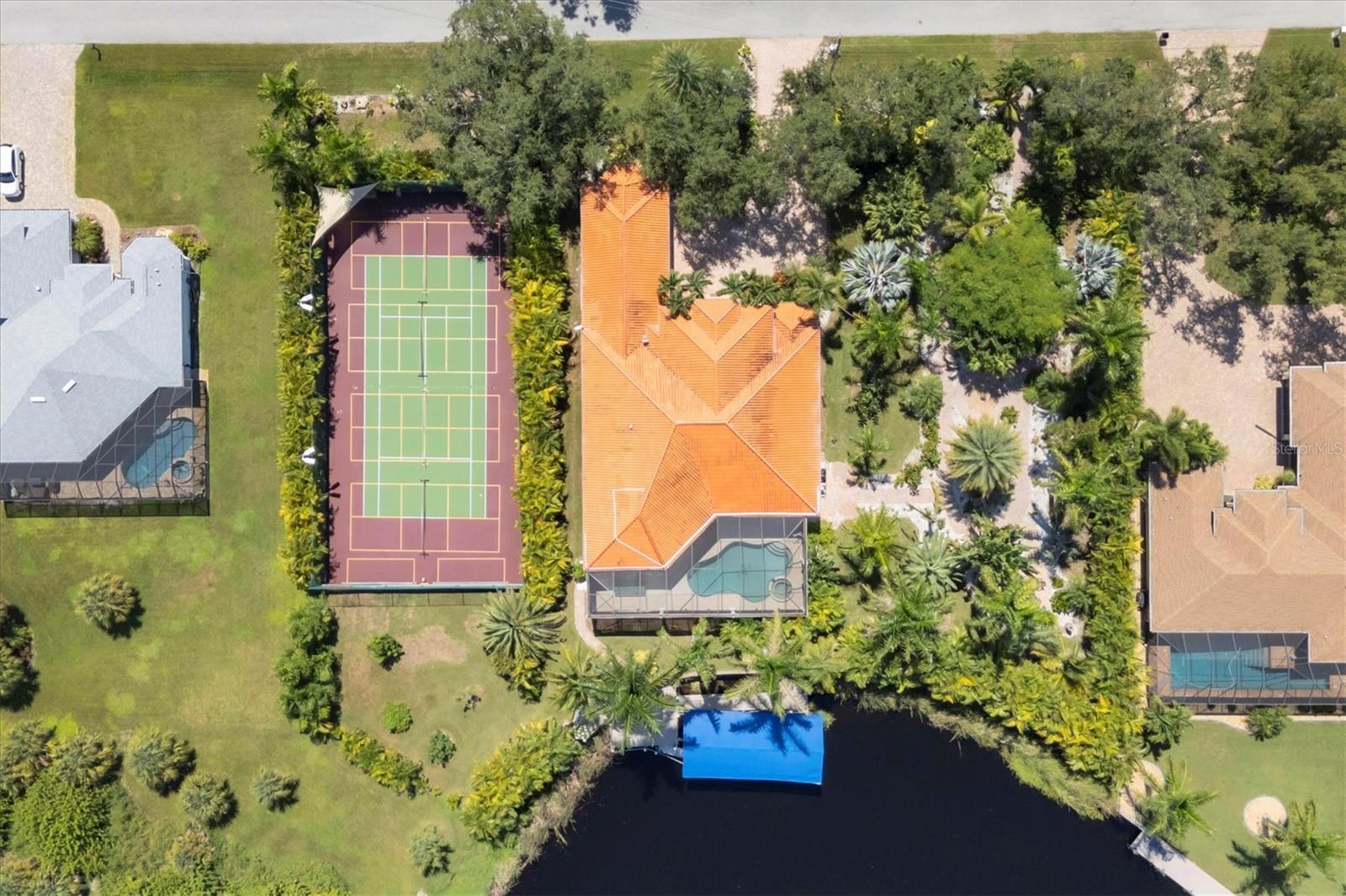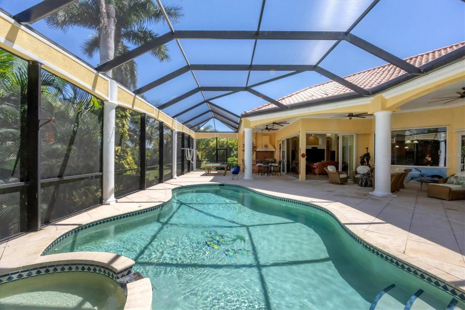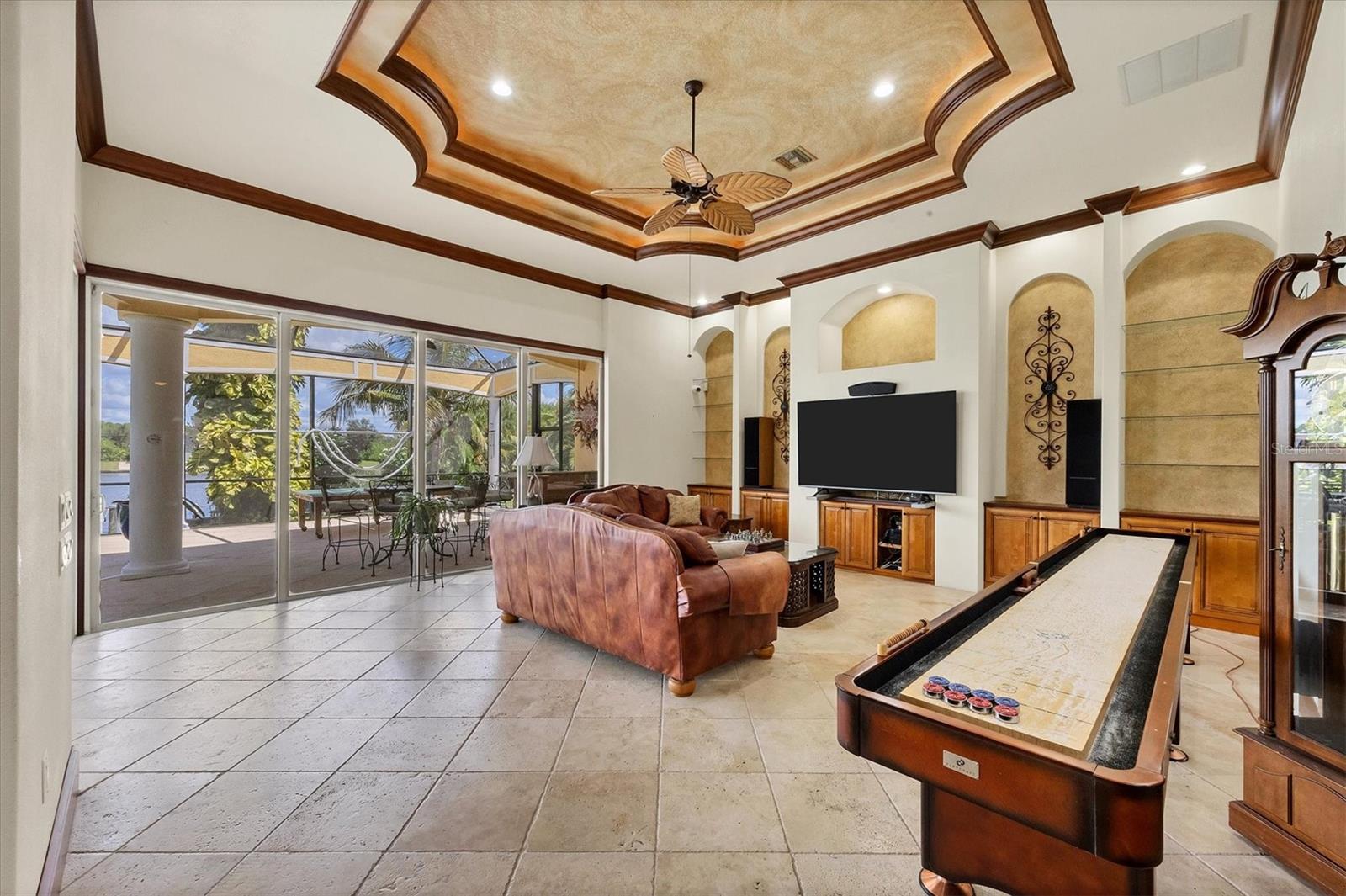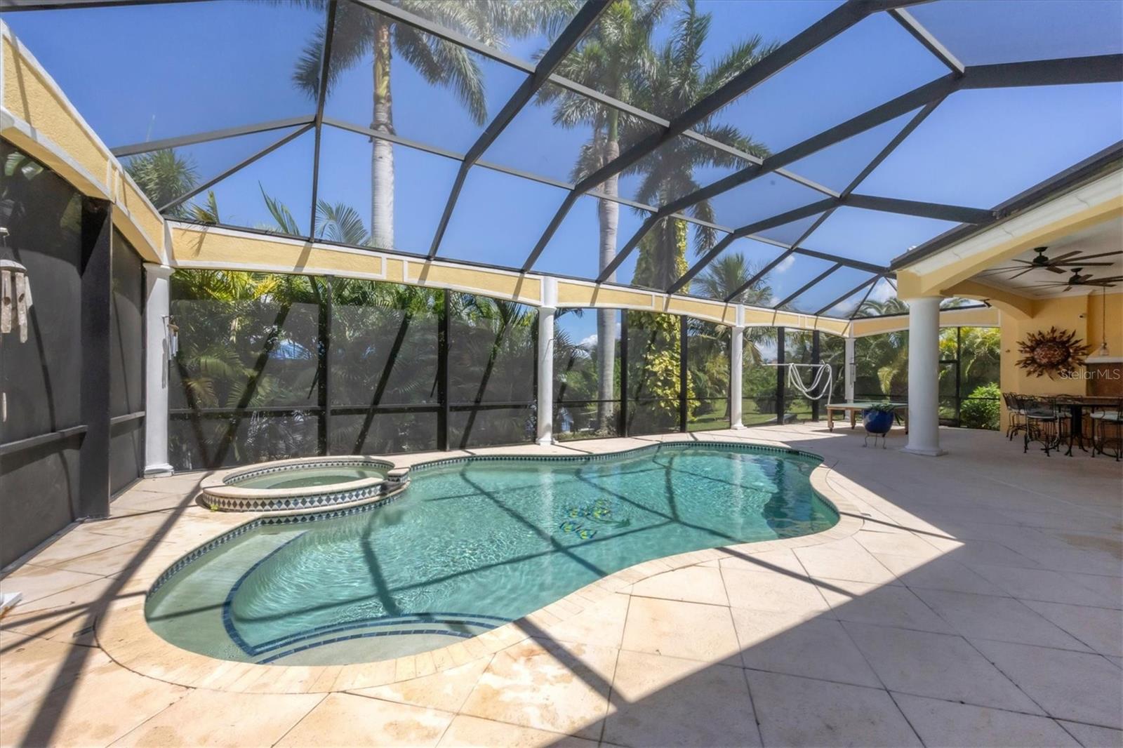 Experience luxury in this canal-front entertainment waterfront home! Set on over an acre across three spacious lots in a tranquil neighborhood off the beaten path, but with easy access to Boca Grande, Englewood beaches, & Port Charlotte shopping. This finely constructed 3 bed, 4 bath home offers elegance with soaring ceilings, natural light, and impeccable details. Enjoy stunning water views, arches, tray ceilings, custom moldings, solid core doors, plantation shutters, and more. The chef's kitchen boasts top-tier stainless steel appliances, custom cabinetry, and a breakfast bar. Perfect for entertaining, the home features two living rooms, a built-in bar, wine cooler, and three en-suite bedrooms. The master suite is a peaceful retreat with Brazilian mahogany floors, canal views, and a spa-like bath with dual sinks, a soaking tub, and a triple-head shower. Plus, a private office/den, tankless water heater, and two zoned A/C units for your comfort and enjoyment. The resort-style pool area, private fire pit, and lighted pickleball/tennis courts make this property a party paradise. Situated on the serene Zephyr Waterway, with 210 feet of seawall, a 25,000 lb boat lift, and an oversized trek dock, it's a boaters dream. For a full list of the features, please refer to the attachments. Schedule a private tour and experience the luxurious space and amenities this home offers!