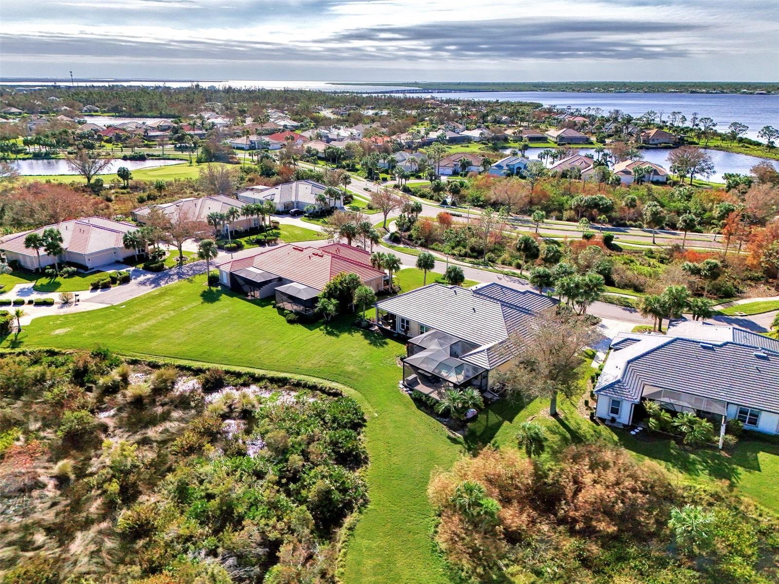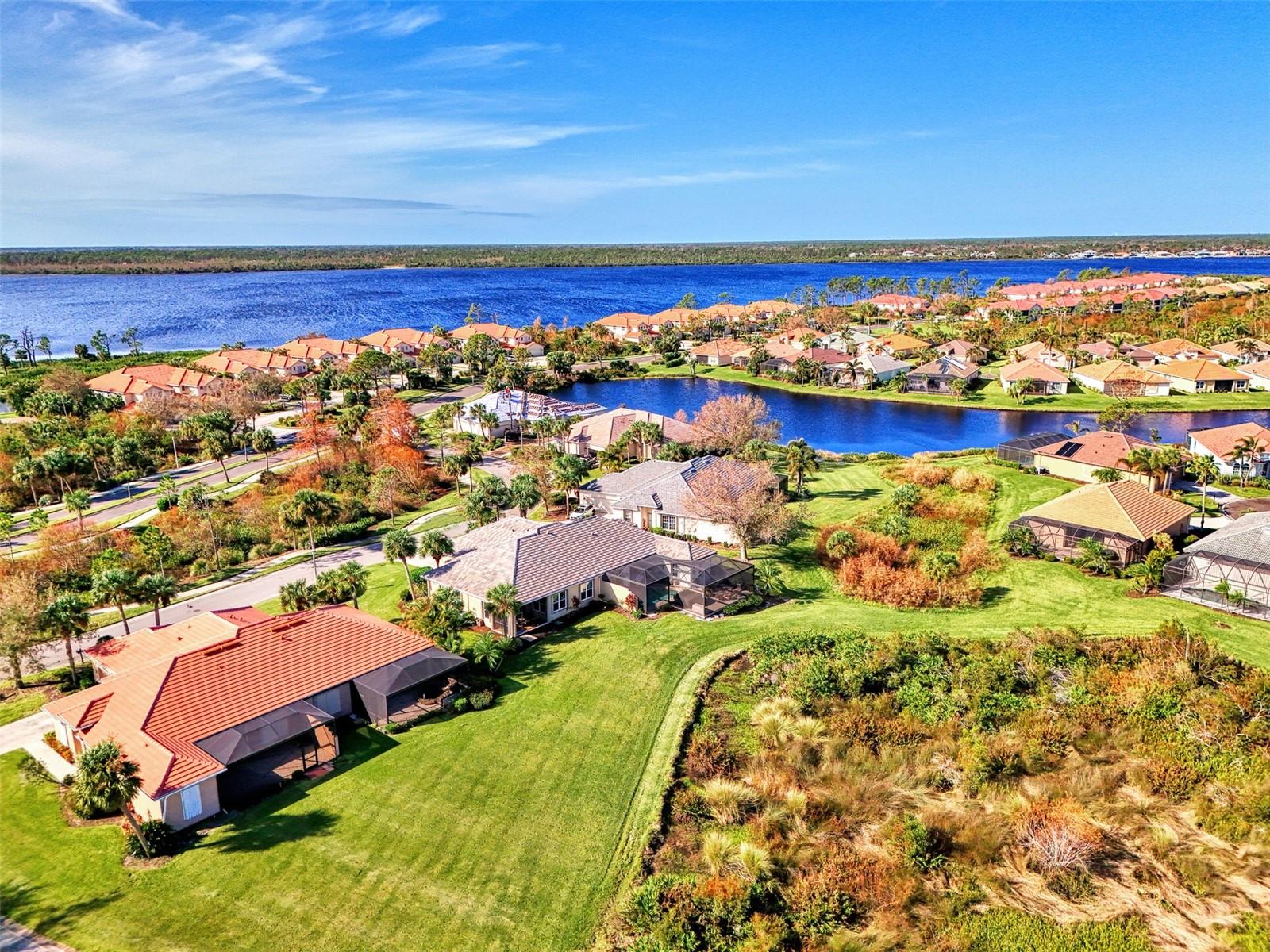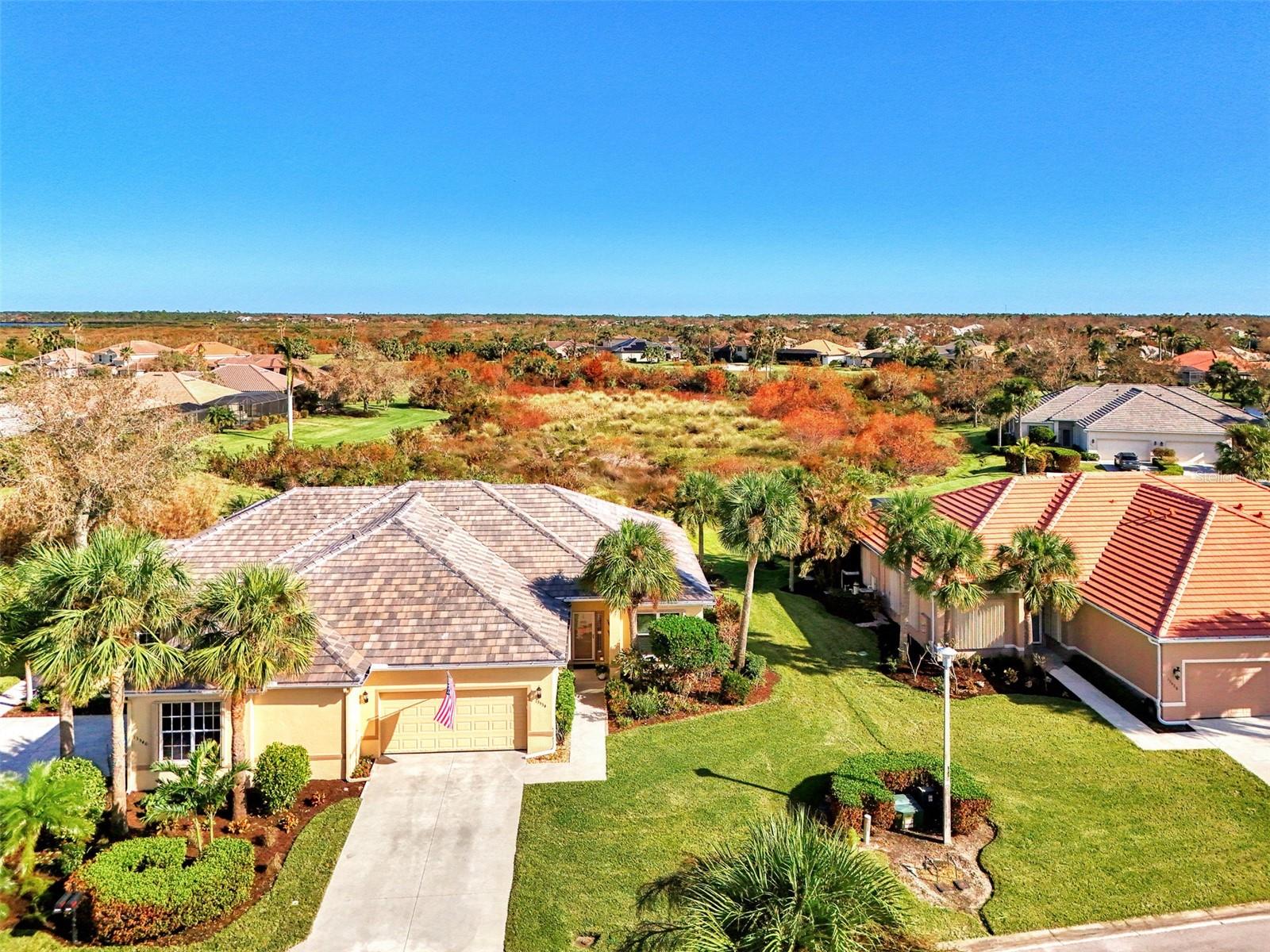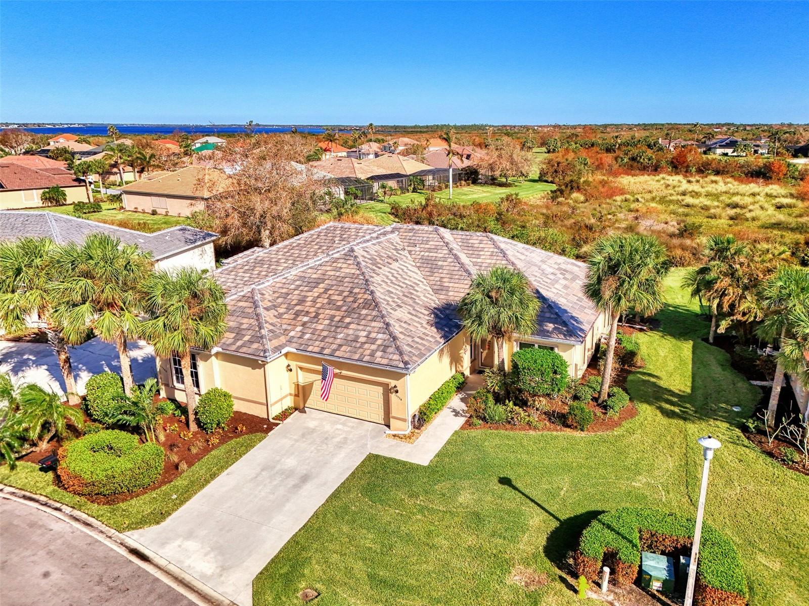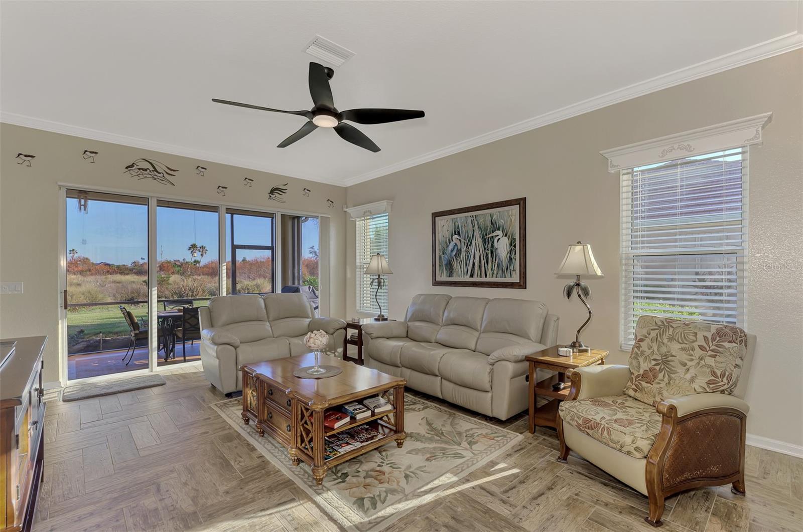 PRICE CHANGE! New Roof 2024! Welcome to your dream home in the serene gated community of Riverwood! A pristine well maintained 2 Bedroom, 2 Bath plus Den JUNIPER VILLA with its very scenic open-wide natural view of preserve and wild-life. In the quaint peaceful, established landscape neighborhood of Marlin Cove this home features many recent updates starting as you enter the front door with the stunning Herringbone pattern wood look tile flooring throughout the living area into the bathrooms. Spacious kitchen with wood cabinets, granite countertops, graphite sink and updated stainless steel appliances. The primary bedroom suite boasts the comfort of new carpet, a large walk-in closet with 10' ceiling and a beautiful updated modern bathroom with a large walk-in shower, elevated vanity w/dual sinks & light fixture. French doors lead you to a private office/den currently being used as a formal dining area. Added features include; NEW windows, RECENTLY painted interior, NEW ceiling fans in Living Room & Kitchen, NEW Garage Epoxy flooring & door opener, Hunter Douglas Vertiglide-Style blind on the lanai slider, storm door at front door, hurricane shutters and crown molding. This is Florida Living at its Best! Don't let this extraordinary opportunity slip away! GOLF CLUB NAMED *TOP 50 US COURSES* *GOLF ADVISOR* *2018*, ACTIVITY CENTER CAMPUS INCLUDES LAP & RESORT STYLE POOL, FITNESS CENTER, PICKLE-BALL COURTS, SMALL AND LARGE DOG PARKS, TENNIS COURTS, LAWN CROQUET, BOCCE COURTS, CRAFT ROOM, LIBRARY AND SOCIAL ACTIVITIES! Additional fees apply for Riverwood Golf Club & Private Beach Club on Manasota Key. Riverwood is Close to Tampa Bay Rays Spring Training Facility, Atlanta Braves Spring Training Facility, Gulf Beaches, Carlotte Harbor, Myakka River, Punta Gorda, Englewood and Boca Grande. Riverwood, a Perfect Blend of Florida's Nature and Resort Lifestyle.
