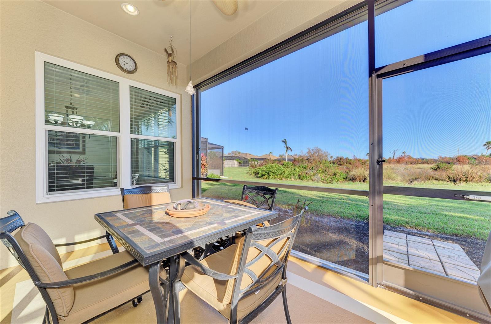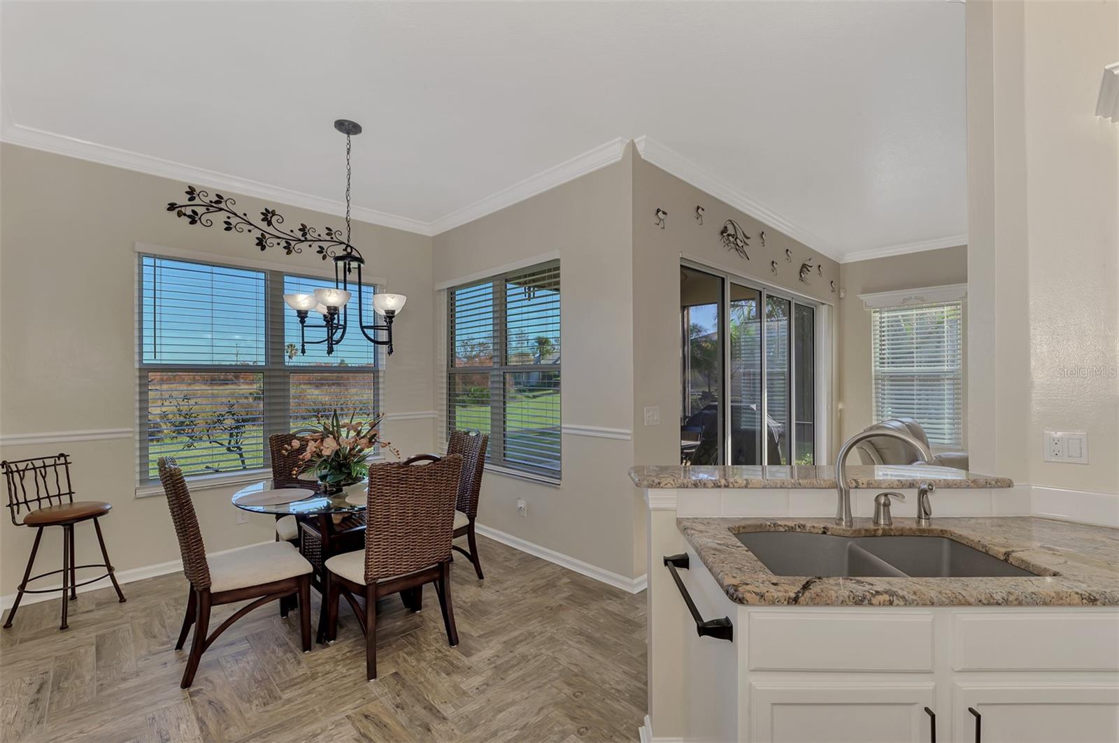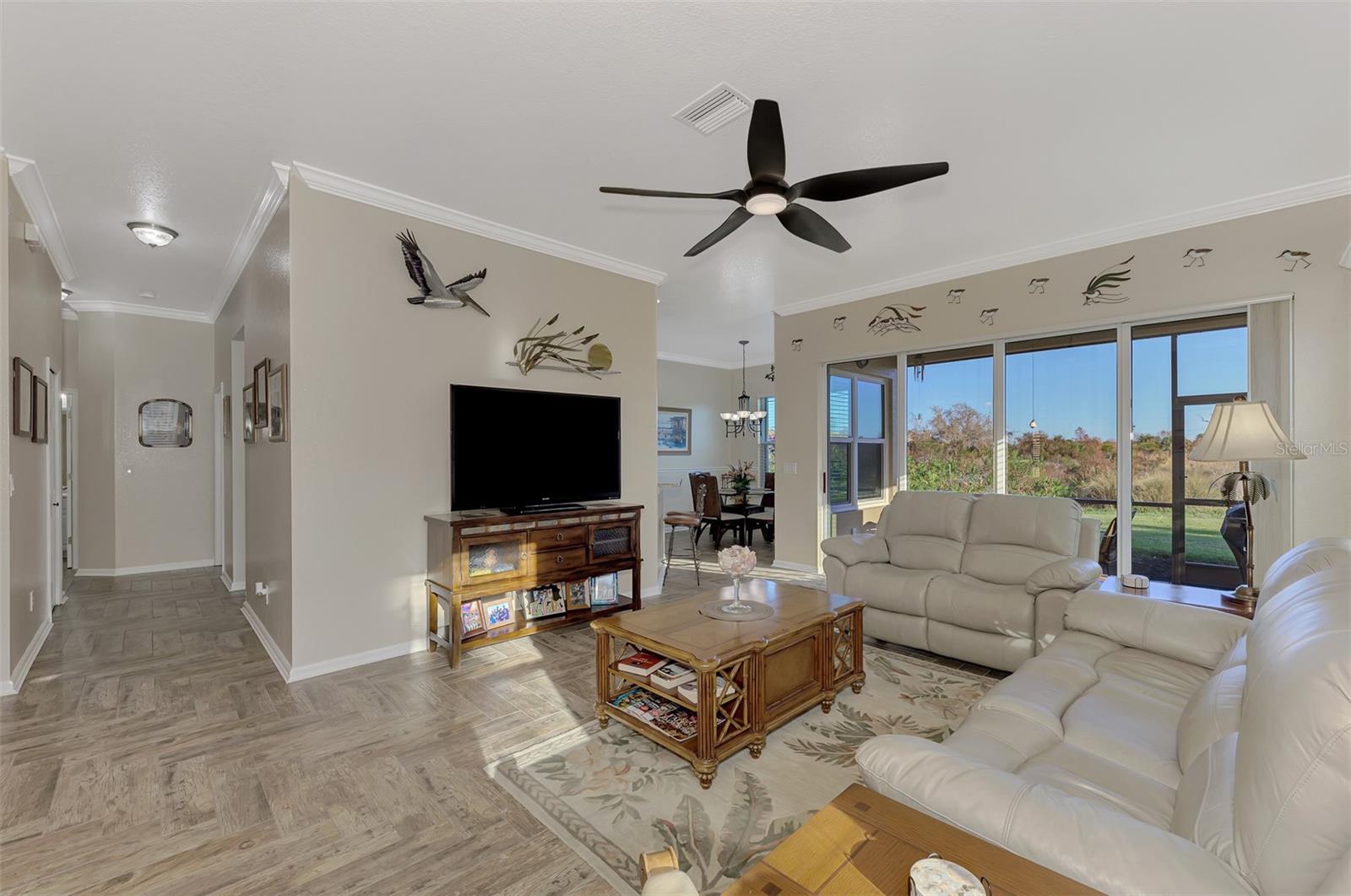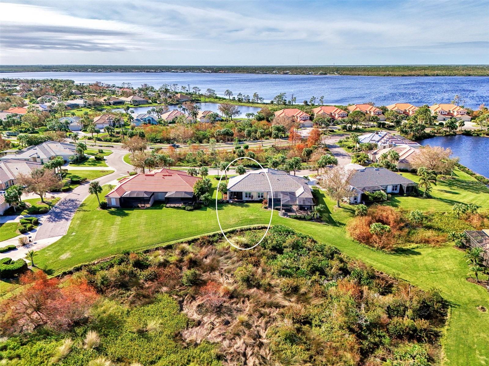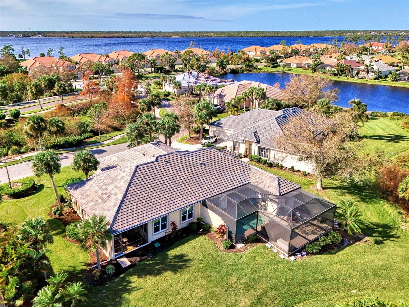 PRICE CHANGE! New Roof 2024! Welcome to your dream home in the serene gated community of Riverwood! A pristine well maintained 2 Bedroom, 2 Bath plus Den JUNIPER VILLA with its very scenic open-wide natural view of preserve and wild-life. In the quaint peaceful, established landscape neighborhood of Marlin Cove this home features many recent updates starting as you enter the front door with the stunning Herringbone pattern wood look tile flooring throughout the living area into the bathrooms. Spacious kitchen with wood cabinets, granite countertops, graphite sink and updated stainless steel appliances. The primary bedroom suite boasts the comfort of new carpet, a large walk-in closet with 10' ceiling and a beautiful updated modern bathroom with a large walk-in shower, elevated vanity w/dual sinks & light fixture. French doors lead you to a private office/den currently being used as a formal dining area. Added features include; NEW windows, RECENTLY painted interior, NEW ceiling fans in Living Room & Kitchen, NEW Garage Epoxy flooring & door opener, Hunter Douglas Vertiglide-Style blind on the lanai slider, storm door at front door, hurricane shutters and crown molding. This is Florida Living at its Best! Don't let this extraordinary opportunity slip away! GOLF CLUB NAMED *TOP 50 US COURSES* *GOLF ADVISOR* *2018*, ACTIVITY CENTER CAMPUS INCLUDES LAP & RESORT STYLE POOL, FITNESS CENTER, PICKLE-BALL COURTS, SMALL AND LARGE DOG PARKS, TENNIS COURTS, LAWN CROQUET, BOCCE COURTS, CRAFT ROOM, LIBRARY AND SOCIAL ACTIVITIES! Additional fees apply for Riverwood Golf Club & Private Beach Club on Manasota Key. Riverwood is Close to Tampa Bay Rays Spring Training Facility, Atlanta Braves Spring Training Facility, Gulf Beaches, Carlotte Harbor, Myakka River, Punta Gorda, Englewood and Boca Grande. Riverwood, a Perfect Blend of Florida's Nature and Resort Lifestyle.
