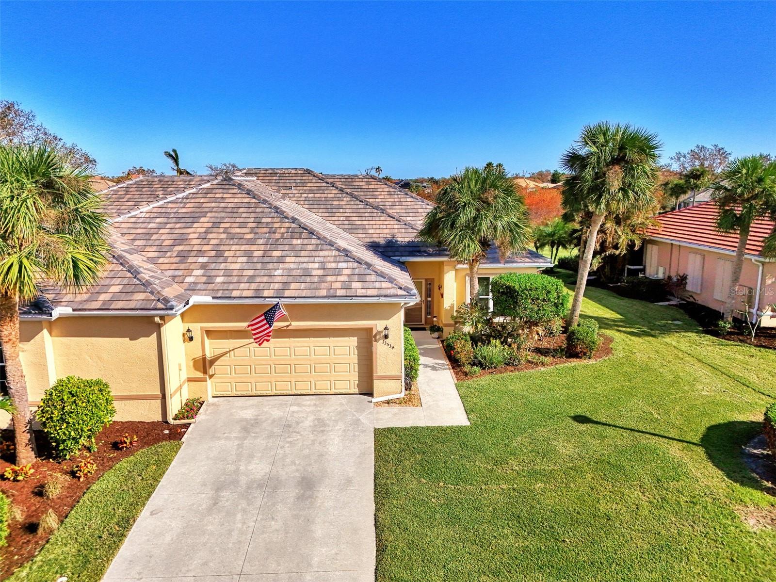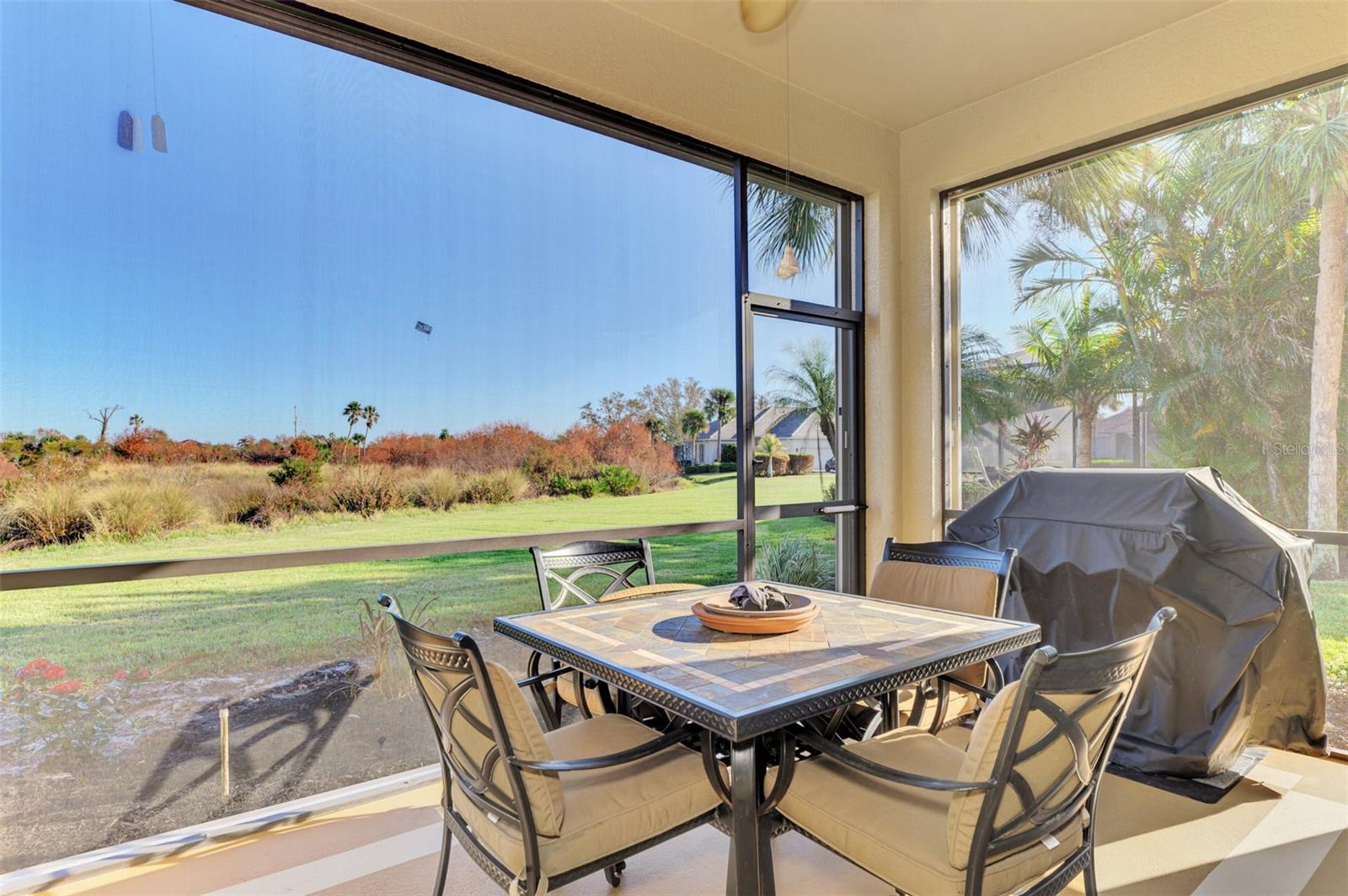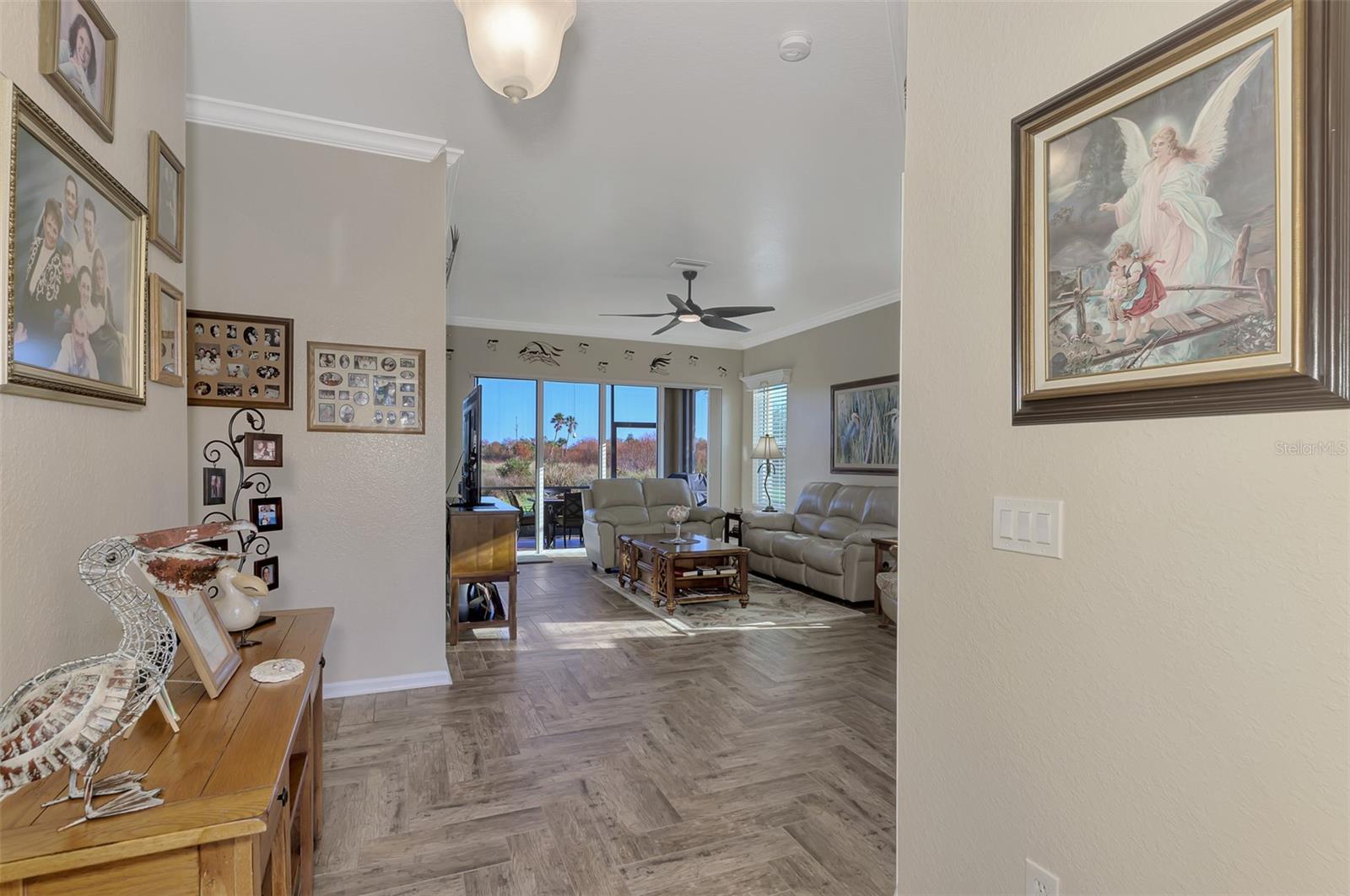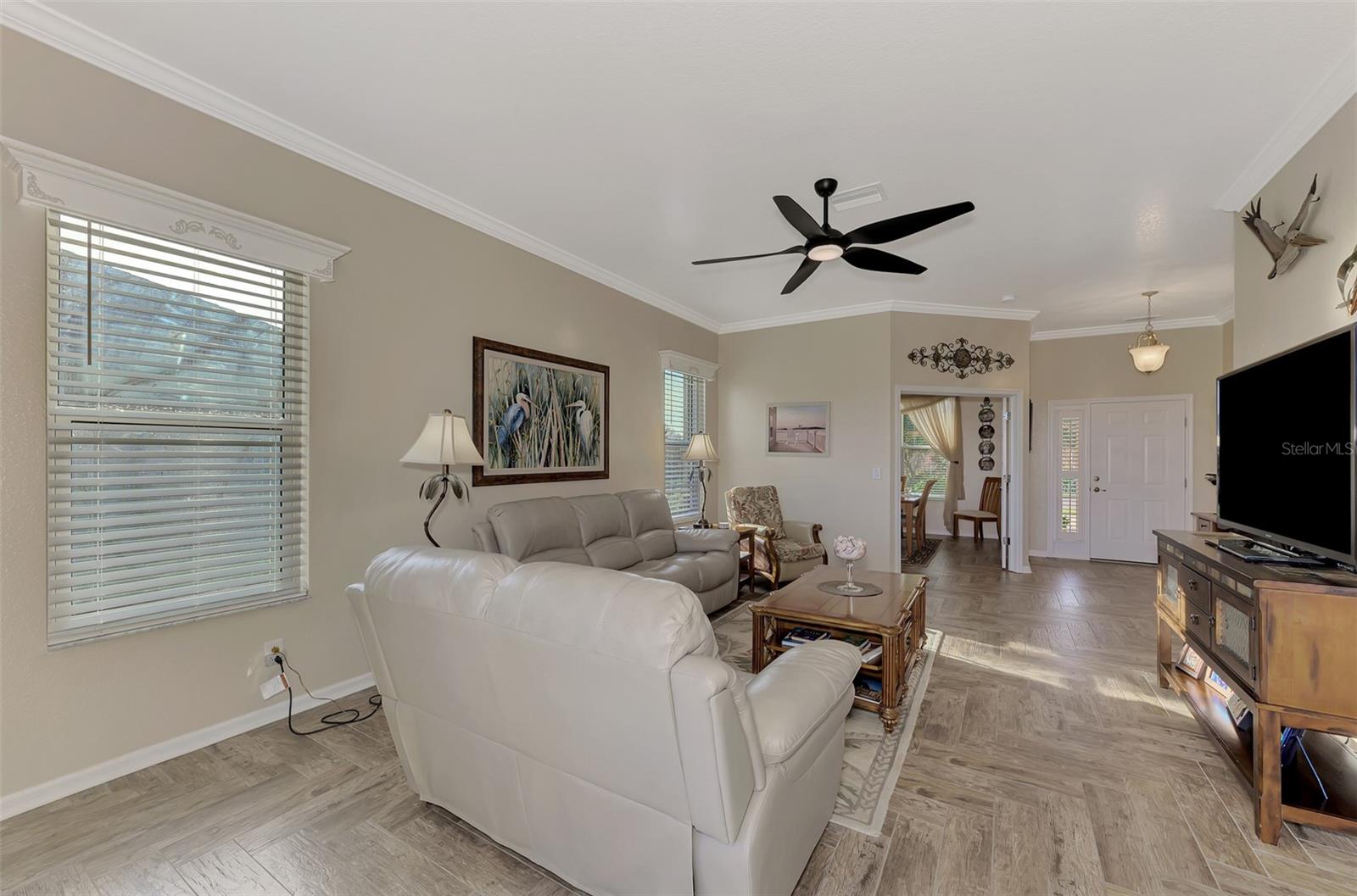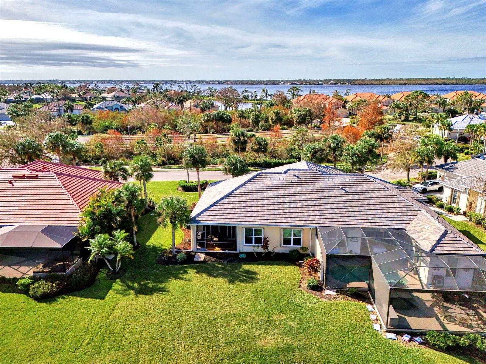 PRICE CHANGE! New Roof 2024! Welcome to your dream home in the serene gated community of Riverwood! A pristine well maintained 2 Bedroom, 2 Bath plus Den JUNIPER VILLA with its very scenic open-wide natural view of preserve and wild-life. In the quaint peaceful, established landscape neighborhood of Marlin Cove this home features many recent updates starting as you enter the front door with the stunning Herringbone pattern wood look tile flooring throughout the living area into the bathrooms. Spacious kitchen with wood cabinets, granite countertops, graphite sink and updated stainless steel appliances. The primary bedroom suite boasts the comfort of new carpet, a large walk-in closet with 10' ceiling and a beautiful updated modern bathroom with a large walk-in shower, elevated vanity w/dual sinks & light fixture. French doors lead you to a private office/den currently being used as a formal dining area. Added features include; NEW windows, RECENTLY painted interior, NEW ceiling fans in Living Room & Kitchen, NEW Garage Epoxy flooring & door opener, Hunter Douglas Vertiglide-Style blind on the lanai slider, storm door at front door, hurricane shutters and crown molding. This is Florida Living at its Best! Don't let this extraordinary opportunity slip away! GOLF CLUB NAMED *TOP 50 US COURSES* *GOLF ADVISOR* *2018*, ACTIVITY CENTER CAMPUS INCLUDES LAP & RESORT STYLE POOL, FITNESS CENTER, PICKLE-BALL COURTS, SMALL AND LARGE DOG PARKS, TENNIS COURTS, LAWN CROQUET, BOCCE COURTS, CRAFT ROOM, LIBRARY AND SOCIAL ACTIVITIES! Additional fees apply for Riverwood Golf Club & Private Beach Club on Manasota Key. Riverwood is Close to Tampa Bay Rays Spring Training Facility, Atlanta Braves Spring Training Facility, Gulf Beaches, Carlotte Harbor, Myakka River, Punta Gorda, Englewood and Boca Grande. Riverwood, a Perfect Blend of Florida's Nature and Resort Lifestyle.