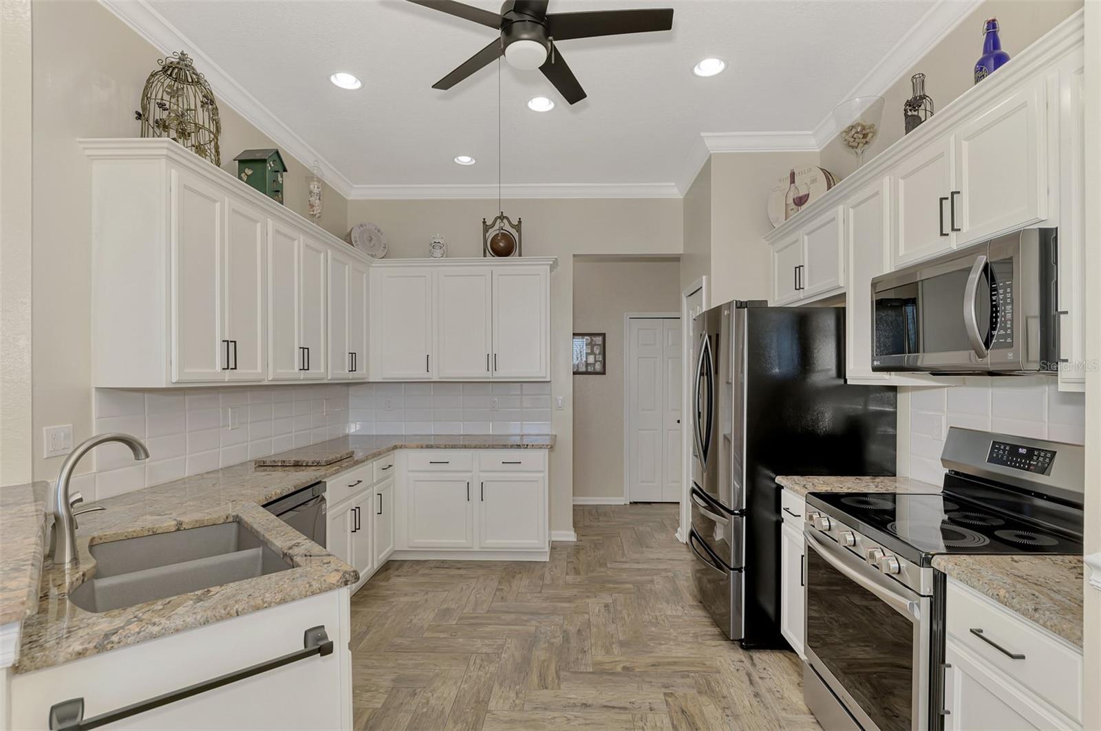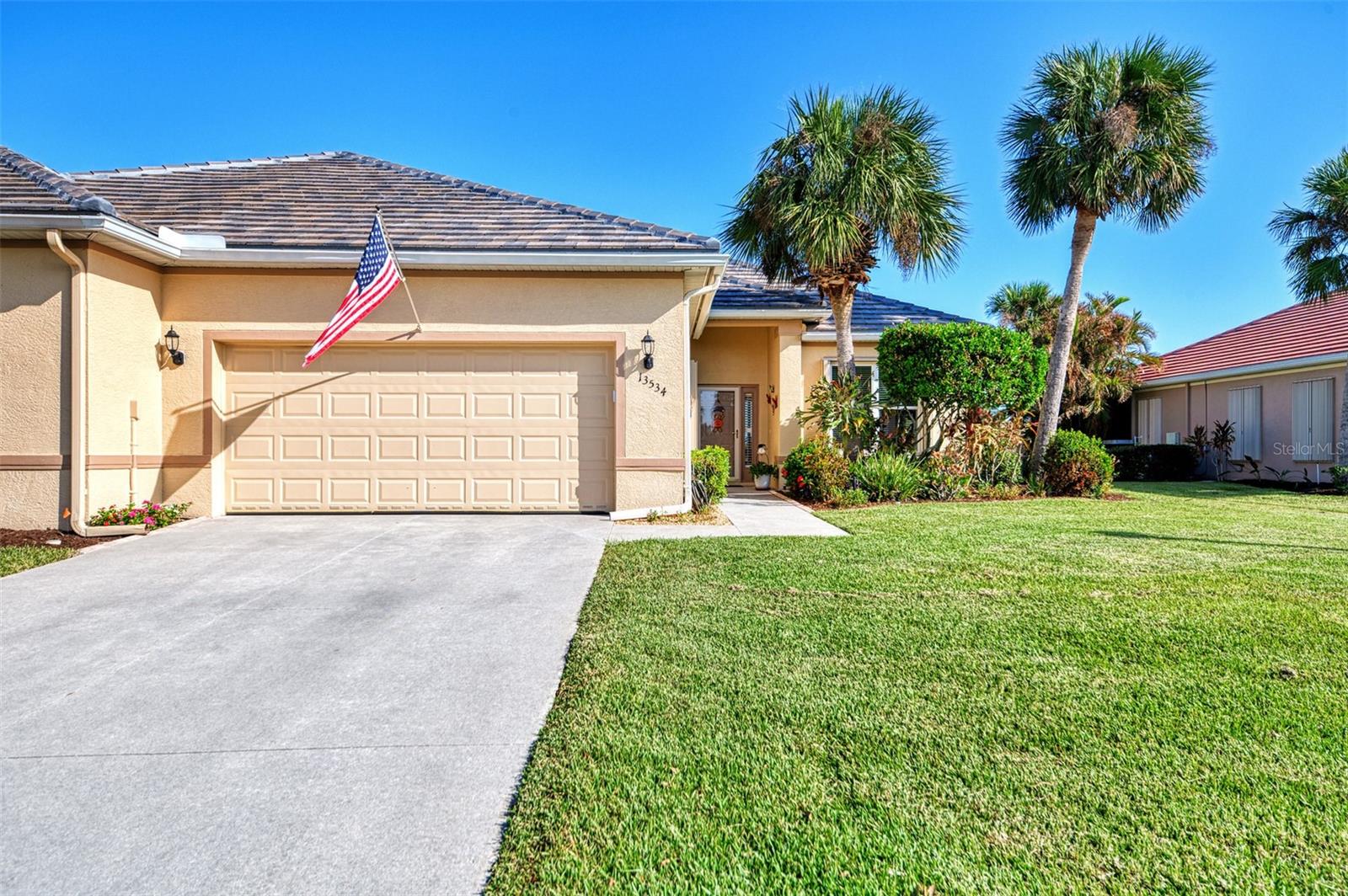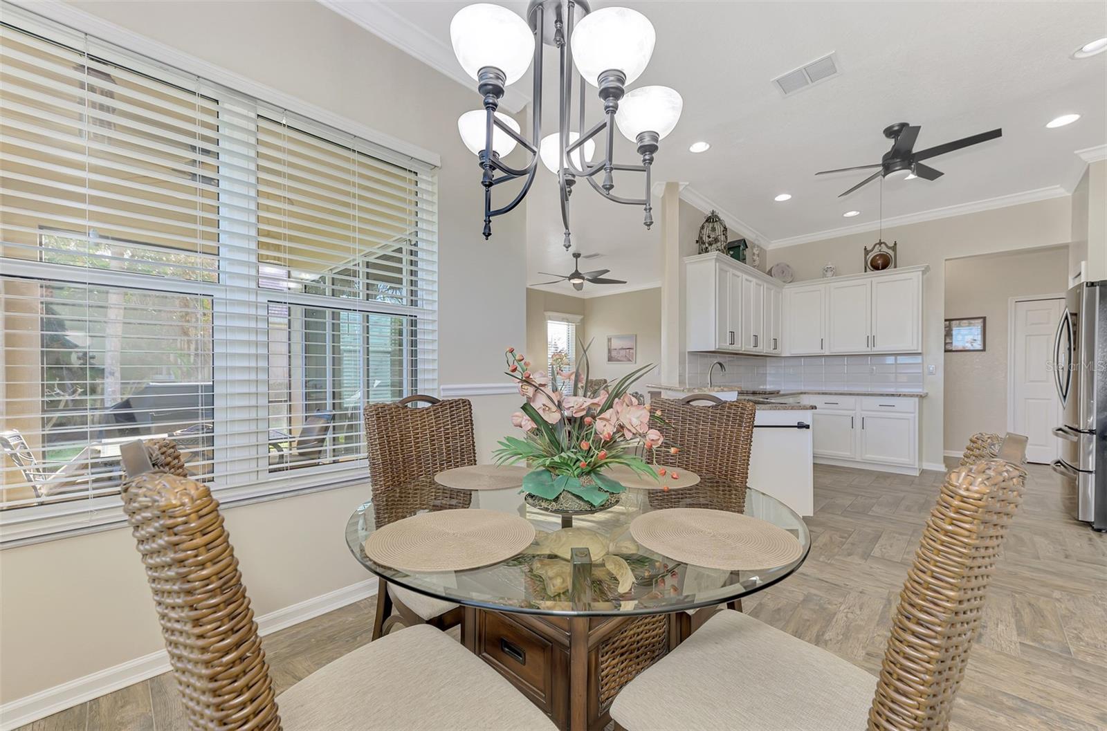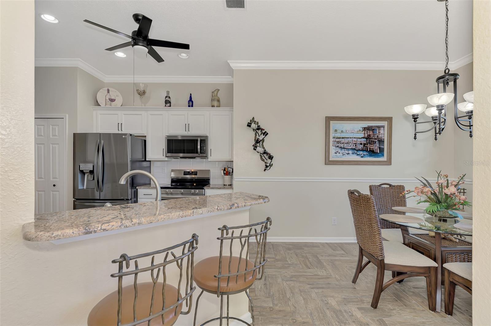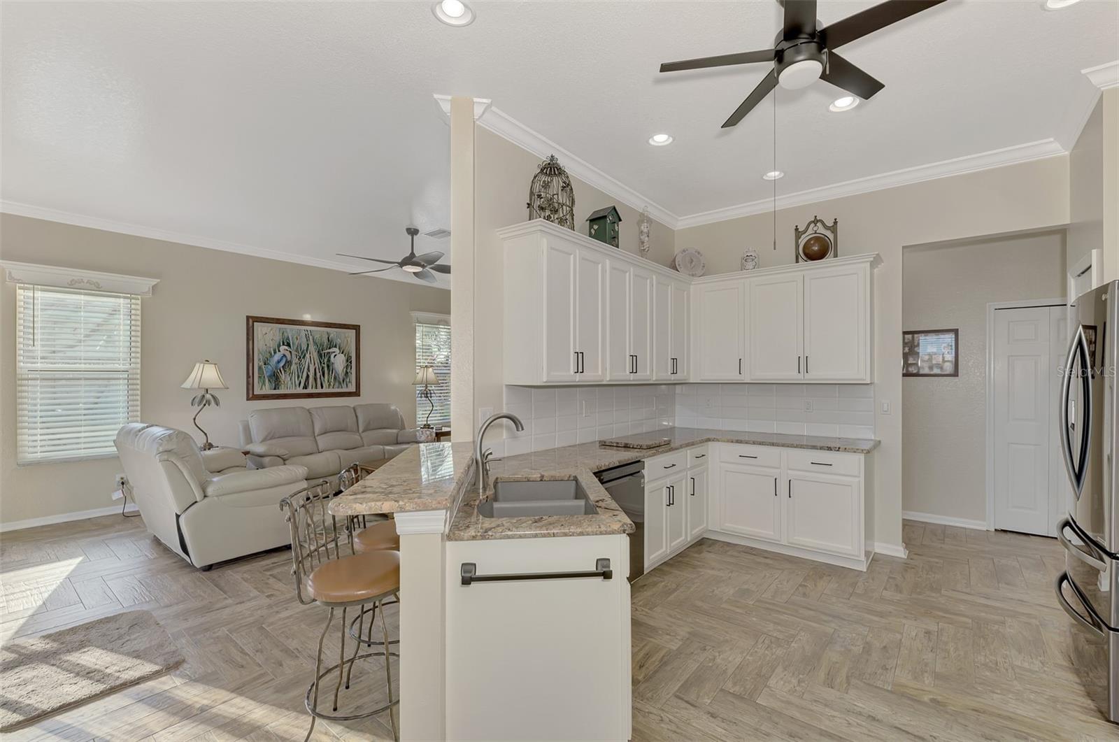 PRICE CHANGE! New Roof 2024! Welcome to your dream home in the serene gated community of Riverwood! A pristine well maintained 2 Bedroom, 2 Bath plus Den JUNIPER VILLA with its very scenic open-wide natural view of preserve and wild-life. In the quaint peaceful, established landscape neighborhood of Marlin Cove this home features many recent updates starting as you enter the front door with the stunning Herringbone pattern wood look tile flooring throughout the living area into the bathrooms. Spacious kitchen with wood cabinets, granite countertops, graphite sink and updated stainless steel appliances. The primary bedroom suite boasts the comfort of new carpet, a large walk-in closet with 10' ceiling and a beautiful updated modern bathroom with a large walk-in shower, elevated vanity w/dual sinks & light fixture. French doors lead you to a private office/den currently being used as a formal dining area. Added features include; NEW windows, RECENTLY painted interior, NEW ceiling fans in Living Room & Kitchen, NEW Garage Epoxy flooring & door opener, Hunter Douglas Vertiglide-Style blind on the lanai slider, storm door at front door, hurricane shutters and crown molding. This is Florida Living at its Best! Don't let this extraordinary opportunity slip away! GOLF CLUB NAMED *TOP 50 US COURSES* *GOLF ADVISOR* *2018*, ACTIVITY CENTER CAMPUS INCLUDES LAP & RESORT STYLE POOL, FITNESS CENTER, PICKLE-BALL COURTS, SMALL AND LARGE DOG PARKS, TENNIS COURTS, LAWN CROQUET, BOCCE COURTS, CRAFT ROOM, LIBRARY AND SOCIAL ACTIVITIES! Additional fees apply for Riverwood Golf Club & Private Beach Club on Manasota Key. Riverwood is Close to Tampa Bay Rays Spring Training Facility, Atlanta Braves Spring Training Facility, Gulf Beaches, Carlotte Harbor, Myakka River, Punta Gorda, Englewood and Boca Grande. Riverwood, a Perfect Blend of Florida's Nature and Resort Lifestyle.