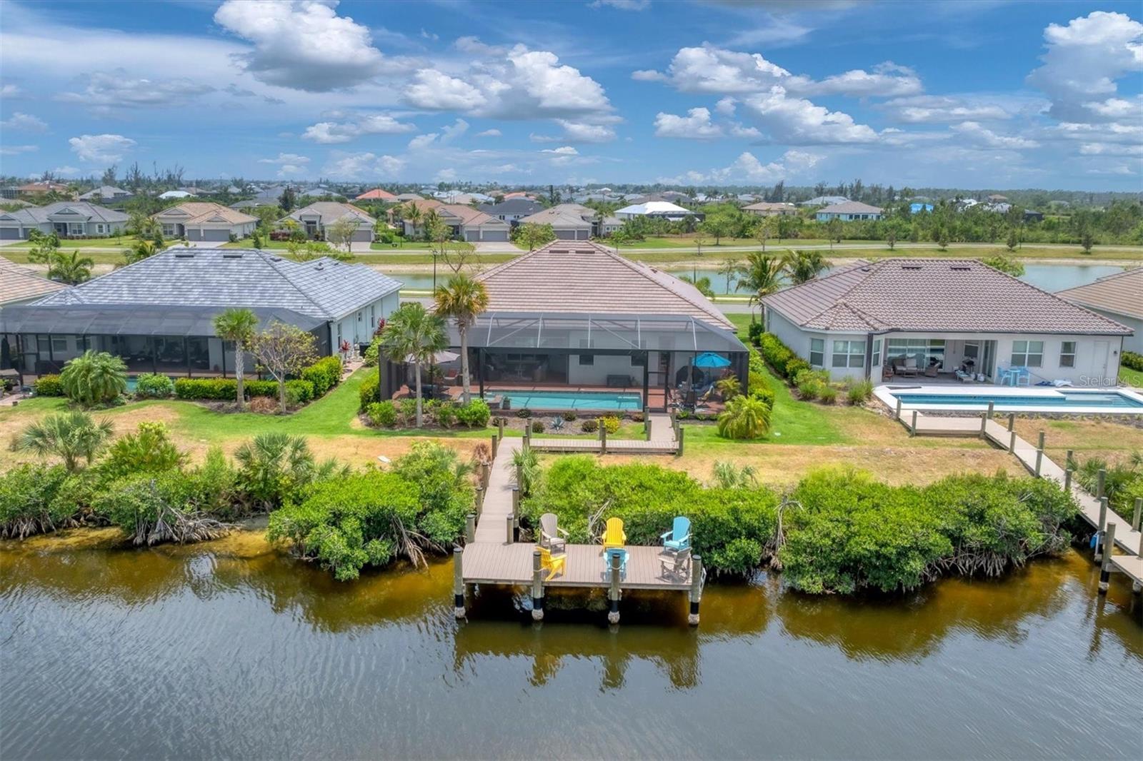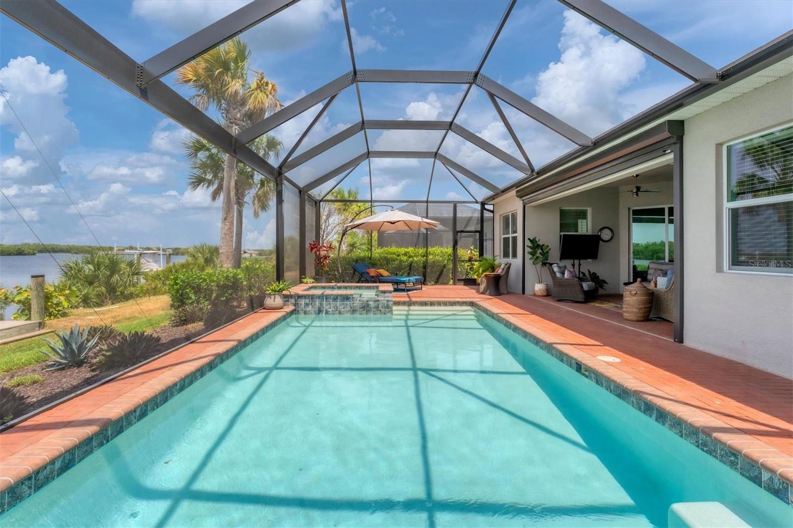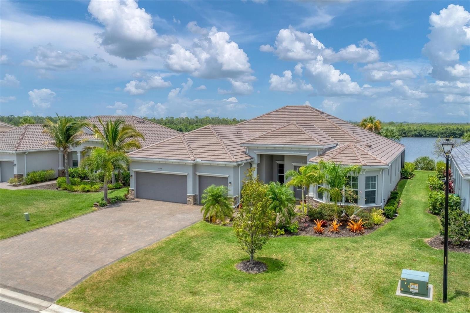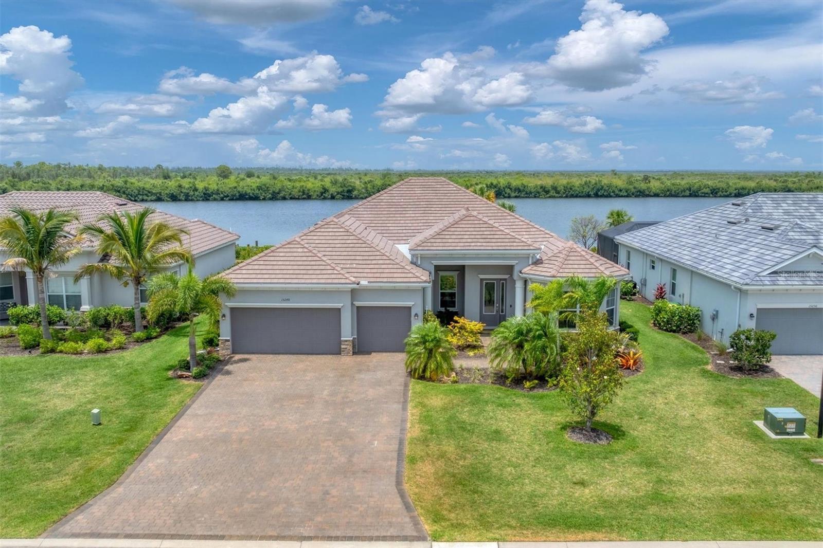 Experience exclusive waterfront living at Harbor West, a serene, deed-restricted gated community designed for boating and fishing enthusiasts—where golf carts are always welcome! This stunning 2020-built home features 4 bedrooms plus a den and 3 baths, along with a coveted three-car garage with an epoxy-coated floor. Inside, enjoy expansive waterfront views and stylish upgrades like tray ceilings, crown molding, and diagonally set tile flooring. The layout includes a foyer, formal living room, and dining area that are separate from the centrally located kitchen, which opens to the breakfast nook and family room—ideal for both entertaining and privacy. The kitchen has white 42” shaker-style cabinets, granite countertops, a tile backsplash, and a breakfast bar. With an aquarium window and multiple sliding glass doors, the living areas offer breathtaking views of the water. The master bedroom is a true retreat, featuring sliding doors to the pool, a cozy sitting area, tray ceiling, and a spacious walk-in closet, plus an additional reach-in closet. The master bath includes a large dual sink, soaking tub, walk-in shower, and abundant natural light. Guest bedrooms are thoughtfully placed on the opposite side of the home for added privacy. Step outside to a beautiful pool and spa area surrounded by panoramic screens that maximize your views of the waterway. Composite decking leads to the dock, perfect for relaxing with a cocktail or casting a line for a day of fishing. The exterior is beautifully landscaped and includes an irrigation system, a paver driveway, a 2024 tile roof, whole-house impact windows and sliding doors, and a storm smart screen on the lanai. Low HOA fees cover lawn irrigation, grass cutting, tree pruning, and common area maintenance. Leasing is allowed for a minimum of 30 days with HOA approval. Located in a fantastic waterfront area with no bridges, you can easily launch your boat from your dock and spend the day on the Gulf of Mexico enjoying beautiful sandy beaches, world-class fishing, or dining at waterfront restaurants. Prefer to stay on land? You’ll find several golf courses, dining options, and shopping experiences nearby. Don’t let this beautiful Harbor West home pass you by—schedule your showing today!