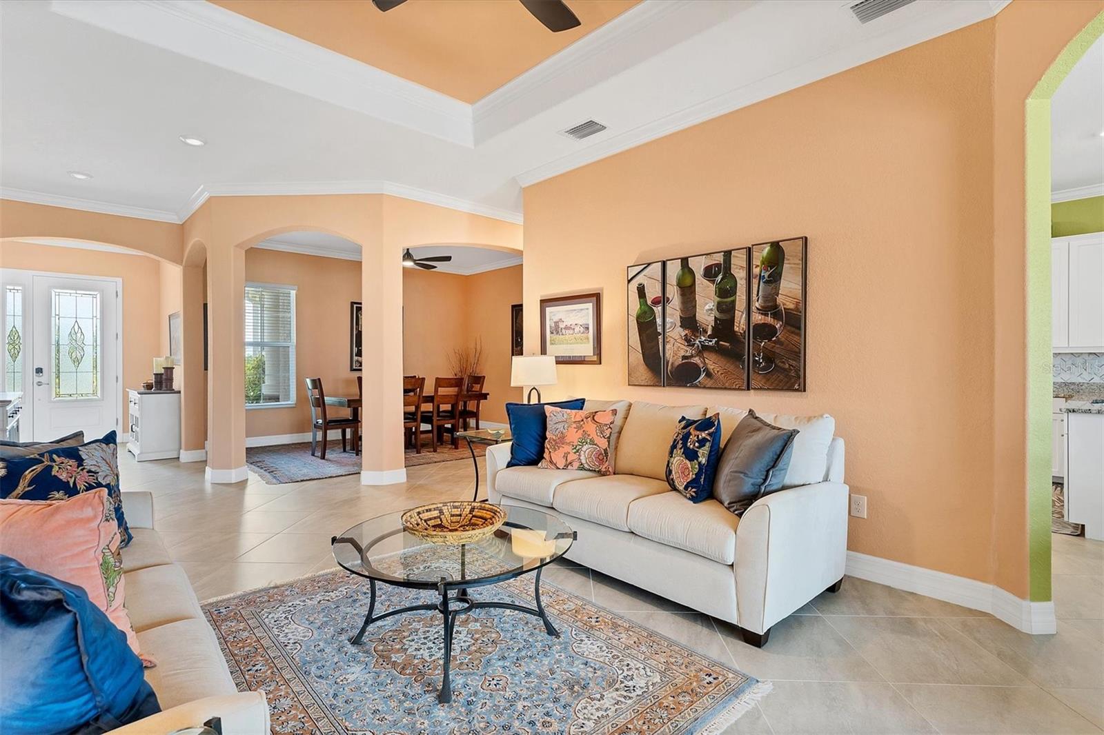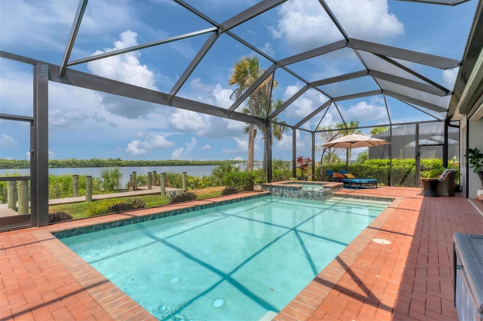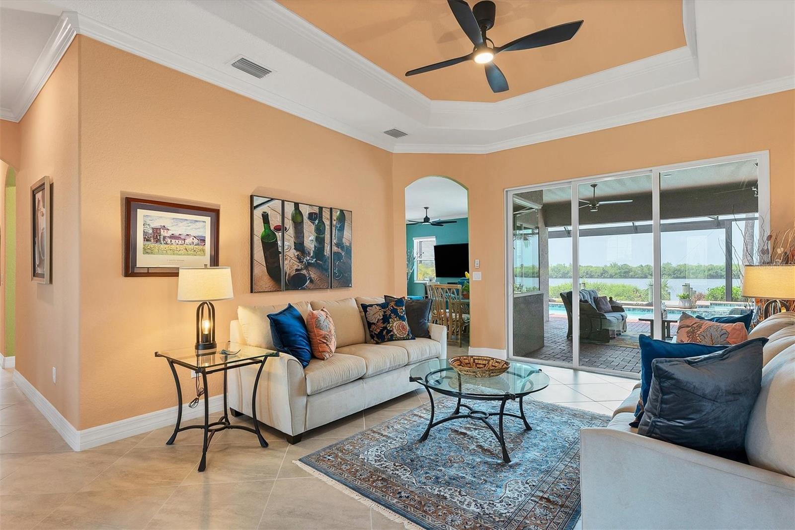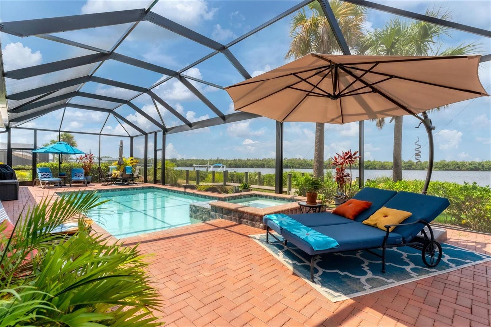 Experience exclusive waterfront living at Harbor West, a serene, deed-restricted gated community designed for boating and fishing enthusiasts—where golf carts are always welcome! This stunning 2020-built home features 4 bedrooms plus a den and 3 baths, along with a coveted three-car garage with an epoxy-coated floor. Inside, enjoy expansive waterfront views and stylish upgrades like tray ceilings, crown molding, and diagonally set tile flooring. The layout includes a foyer, formal living room, and dining area that are separate from the centrally located kitchen, which opens to the breakfast nook and family room—ideal for both entertaining and privacy. The kitchen has white 42” shaker-style cabinets, granite countertops, a tile backsplash, and a breakfast bar. With an aquarium window and multiple sliding glass doors, the living areas offer breathtaking views of the water. The master bedroom is a true retreat, featuring sliding doors to the pool, a cozy sitting area, tray ceiling, and a spacious walk-in closet, plus an additional reach-in closet. The master bath includes a large dual sink, soaking tub, walk-in shower, and abundant natural light. Guest bedrooms are thoughtfully placed on the opposite side of the home for added privacy. Step outside to a beautiful pool and spa area surrounded by panoramic screens that maximize your views of the waterway. Composite decking leads to the dock, perfect for relaxing with a cocktail or casting a line for a day of fishing. The exterior is beautifully landscaped and includes an irrigation system, a paver driveway, a 2024 tile roof, whole-house impact windows and sliding doors, and a storm smart screen on the lanai. Low HOA fees cover lawn irrigation, grass cutting, tree pruning, and common area maintenance. Leasing is allowed for a minimum of 30 days with HOA approval. Located in a fantastic waterfront area with no bridges, you can easily launch your boat from your dock and spend the day on the Gulf of Mexico enjoying beautiful sandy beaches, world-class fishing, or dining at waterfront restaurants. Prefer to stay on land? You’ll find several golf courses, dining options, and shopping experiences nearby. Don’t let this beautiful Harbor West home pass you by—schedule your showing today!