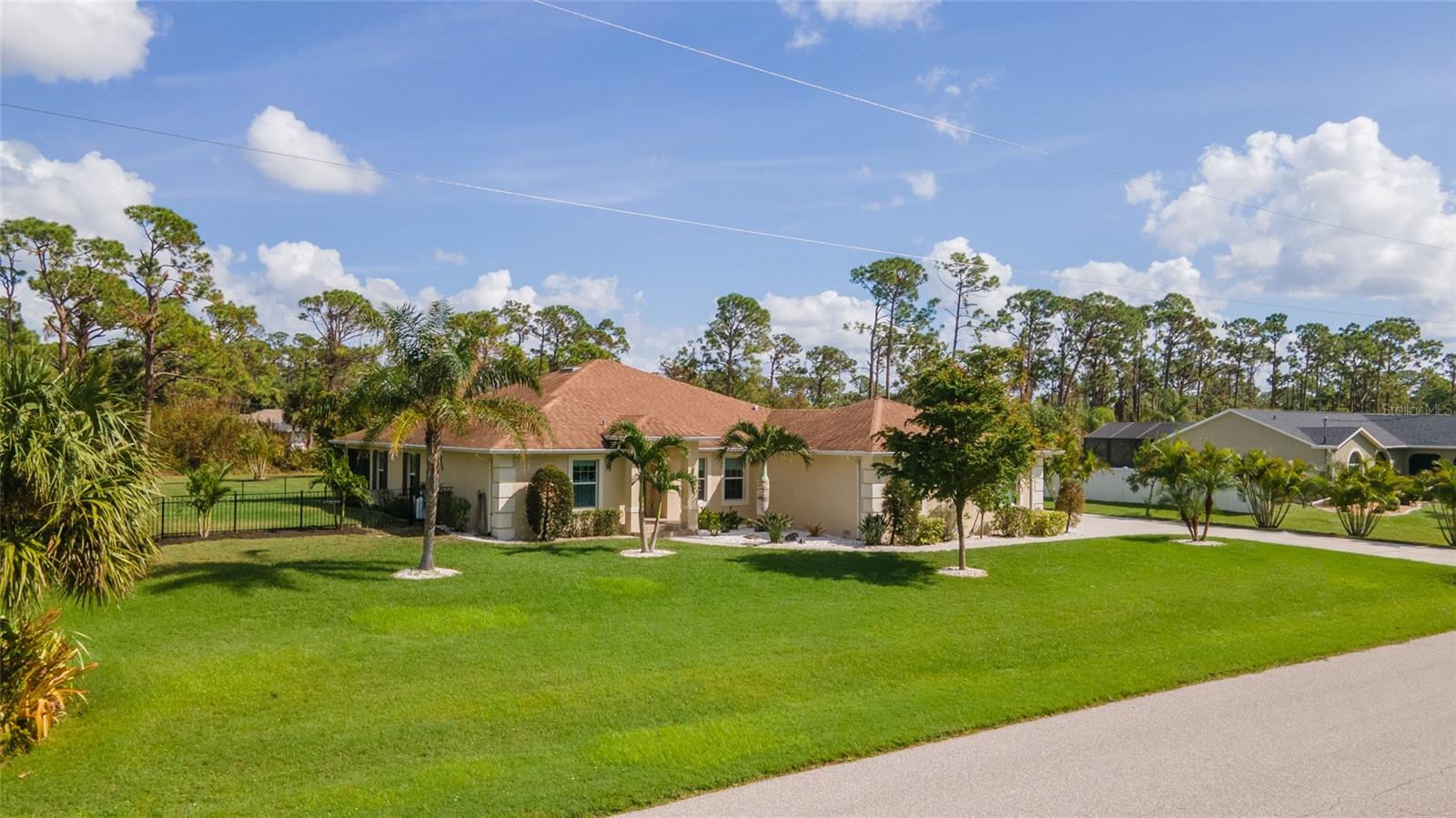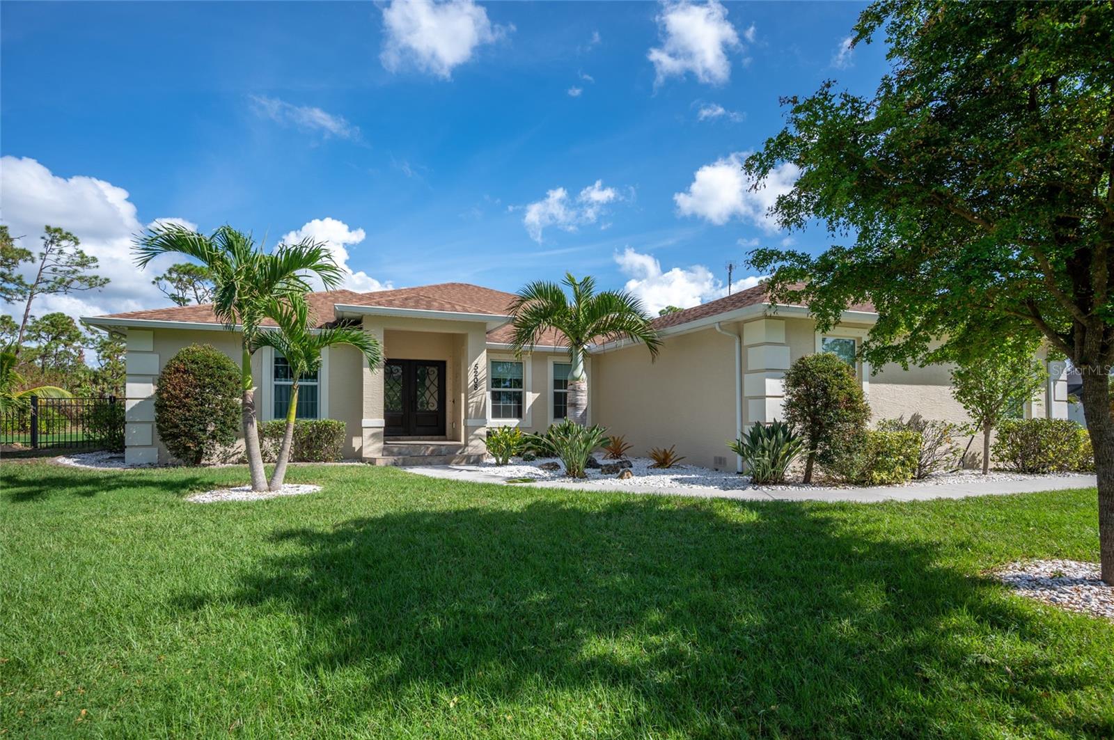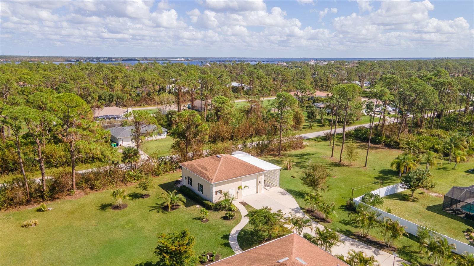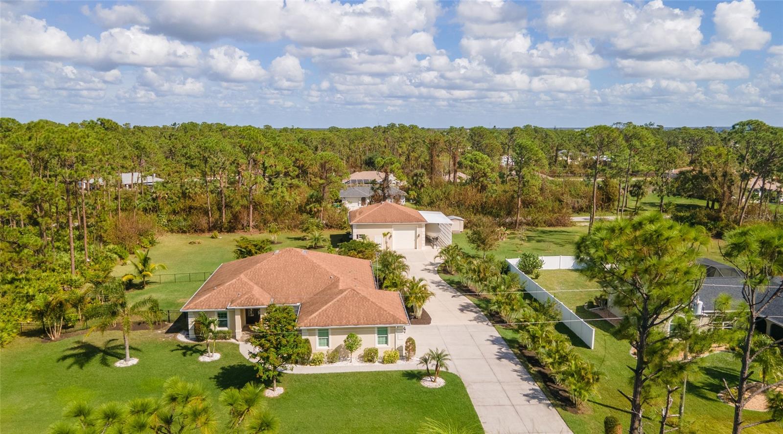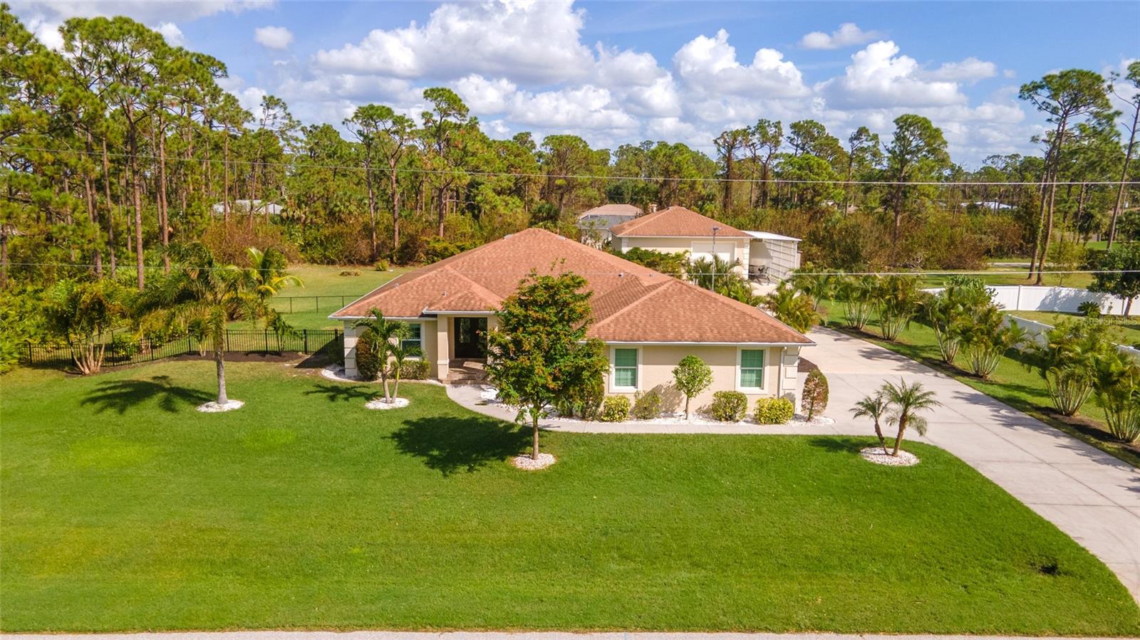 One or more photo(s) has been virtually staged. <p>This property has it all! This luxury retreat sits on OVER AN ACRE in Gulf Cove and includes BOTH AN ATTACHED AND DETACHED GARAGE for you to park ALL your vehicles and toys, along with an RV carport! Plus, MULTIPLE SHEDS and OFFICES on the property will give you all the extra space you need. Your stunning home is filled to the brim with CUSTOM FEATURES to make you the envy of all your friends and family! Be sure to view the Custom Features Sheet for a FULL LIST OF UPGRADES! <p>Step inside and be welcomed by the WOOD FLOORING underfoot and the grandeur of CATHEDRAL CEILINGS above. The gourmet kitchen is a chef’s dream, featuring QUARTZ COUNTERTOPS, PULL-OUT DRAWERS, and SOFT-CLOSE CABINETS for a refined touch. Equipped with a three-compartment sink, stainless steel appliances, built-in microwave, and an ITALIAN GAS RANGE WITH CENTER GRIDDLE. Ample cabinetry offers abundant storage, while UNDER-CABINET LIGHTING creates the perfect warm ambiance. Use your DRY BAR to mix your favorite drinks or make it your own coffee bar. You have the option to serve your meals at the convenient BREAKFAST BAR or formal dining room where they can relax and savor your cuisine. <p>Your PRIMARY SUITE allows you to unwind in a private sanctuary, featuring TRAY CEILINGS, a spacious WALK-IN CLOSET, and elegant FRENCH DOORS to the lanai. The en-suite bathroom offers a spa-like haven with a HEATED BIDET TOILET and a TOWEL WARMER for added comfort. DUAL SINKS set in quartz countertops and a stunning walk-in shower, complete with a custom backsplash and a built-in bench, invites you to rejuvenate in style. Your guests will feel right at home with a fancy GLASS POCKET DOOR to close off their two guest bedrooms. One bedroom features a double built-in closet, while the other boasts a spacious walk-in closet that could easily double as a sewing or craft space. Finally, your HOME OFFICE can be used for personal hobbies or professional work while you close the FRENCH DOORS for added privacy. <p>Invite your guests outside to relax in the DESIGNER SCREENED-IN LANAI, a perfect spot for lounging and entertaining in the fresh air. A 50x50 SIDE FENCED DOG RUN provides a safe and comfortable space for your pets with a WROUGHT IRON FENCE facing the front. A walkway leads to your impressive 36' x 40' DETACHED GARAGE with a FULL BATHROOM and ample space to accommodate UP TO FIVE CARS or even a CLASS C RV. Inside, you’ll find a PRIVATE OFFICE, a dedicated WORKSHOP AREA, and abundant storage shelves, making it as versatile as it is spacious. Plus, an RV carport with a 50 AMP hookup that accommodates a Class A motorhome makes this property ideal for those with a boat, RV, or car collection. The CARPORT'S CONCRETE SLAB WAS POURED WITH FOOTERS, reducing the cost of enclosing this area. And for added convenience, you have access to your rear storage from inside the detached garage and a separate GARDEN SHED is ready to store all your lawn tools! <p>Located in scenic Gulf Cove, join an optional HOA to take advantage of their PRIVATE BOAT RAMP FOR LARGE BOATS and park only about a mile away will take you directly to the Gulf of Mexico! You will have easy access to 776 and a variety of shopping & dining options. Travel to numerous golf courses, or head to area beaches by heading south to Boca Grande or west to Englewood and Manasota Beaches. Experience 2 MAJOR LEAGUE BASEBALL SPRING TRAINING STADIUMS nearby. Call now to schedule a showing before your Florida dream home passes you by!