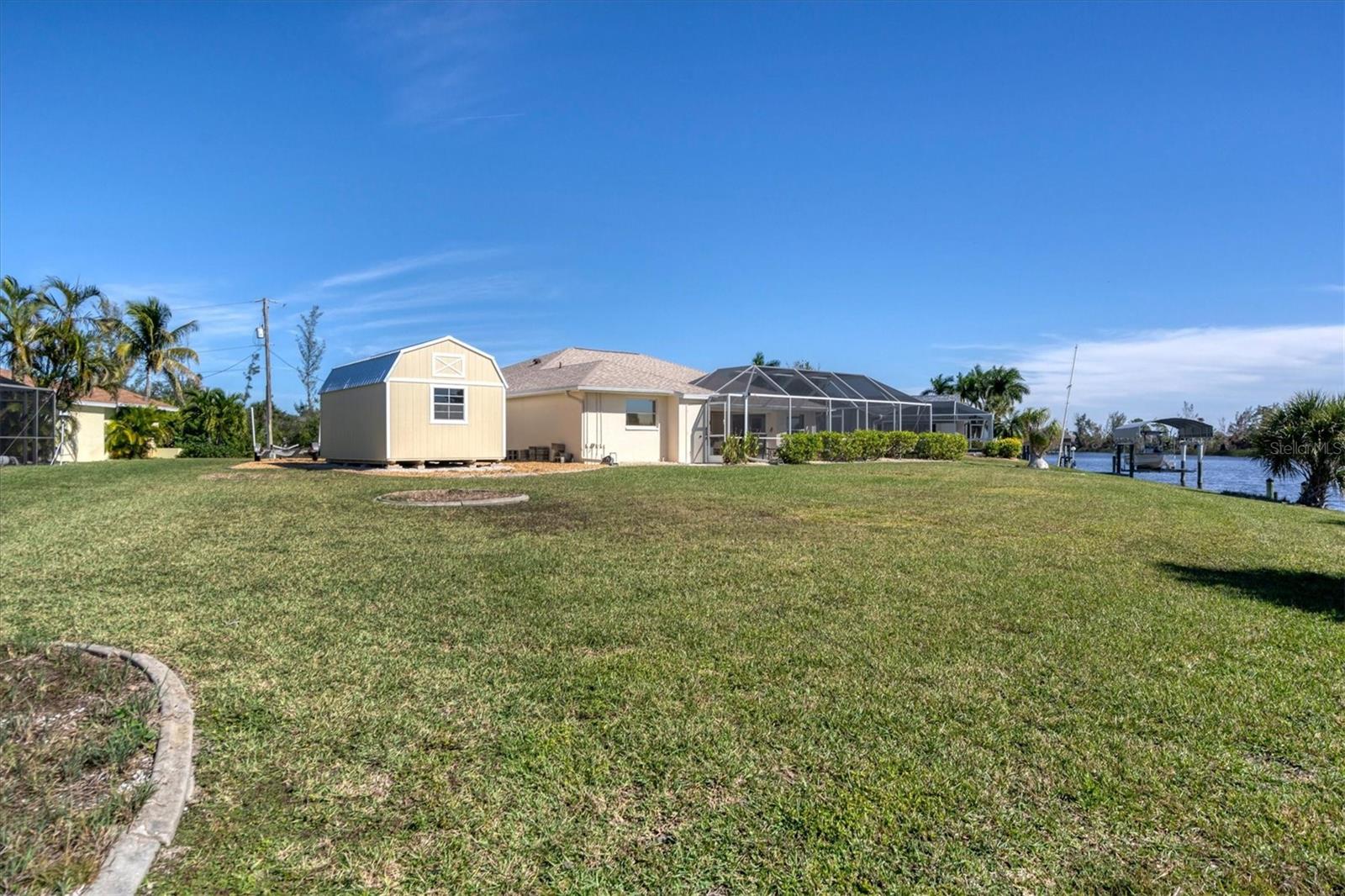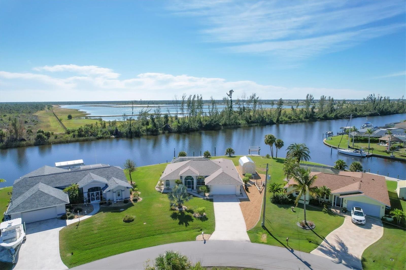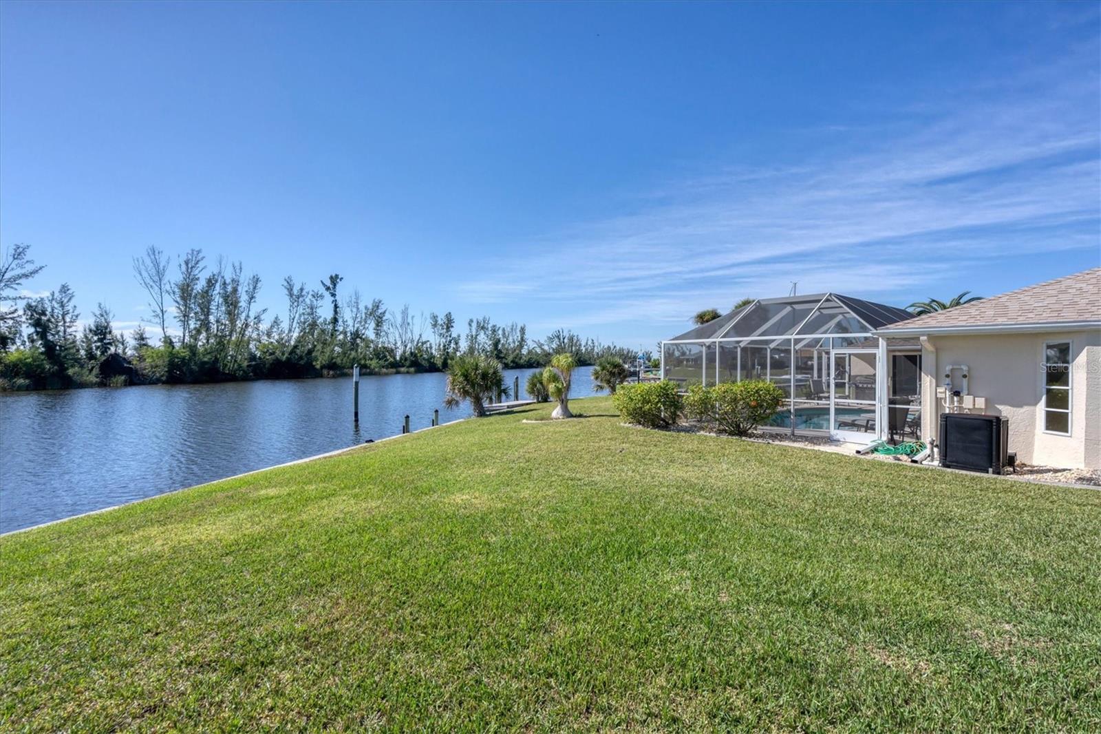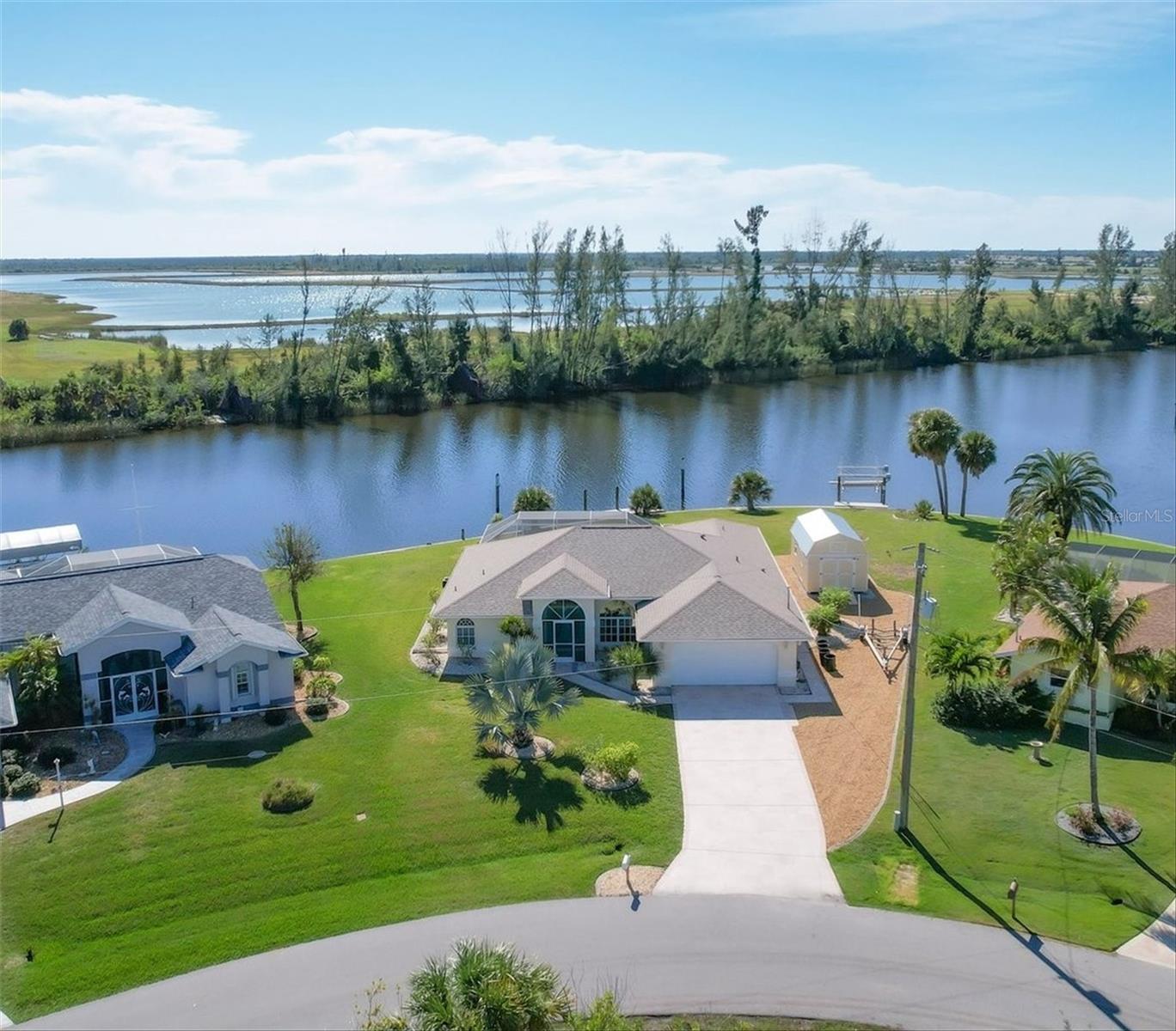 Location! Location! Location! This house sits on a beautiful tip lot with 167' frontage on the extra wide Santa Cruz Waterway with a preserve of trees beyond for a completely natural view. Hard to see any neighbors while sitting on the pool lanai, for extra privacy. Two different docks, one has a 10k power boat lift, the other is perfect for a sailboat. No bridges, direct out through the neighborhood lagoon and protected lock system, with easy boating up two different fresh water rivers, explore the wide estuary of Gasparilla Sound, and then boat up/down the ICW or beyond the barrier islands to the Gulf of Mexico. Perfect boating property. The house itself is older, but well maintained with so many recent updates you won't have any worries for quite awhile. New roof, shed, A/C, pool pump, irrigation pump. High elevation and the protective lock system protects the property from storm surges. With a beautiful Owner's suite on one side of the house, with sliders to the pool lanai and an ensuite bath with dual vanities, a tub and walk-in shower. The other 2 guest bedrooms are on the other side of the house with a shared bathroom with hall access to the pool lanai. The oak kitchen has tons of open counter prep space, a walk-in pantry, and a breakfast bar. The often-accessed refrigerator is set outside the main flow of the kitchen. Walls of glass open for an easy indoor/outdoor lifestyle with the best view in the neighborhood.