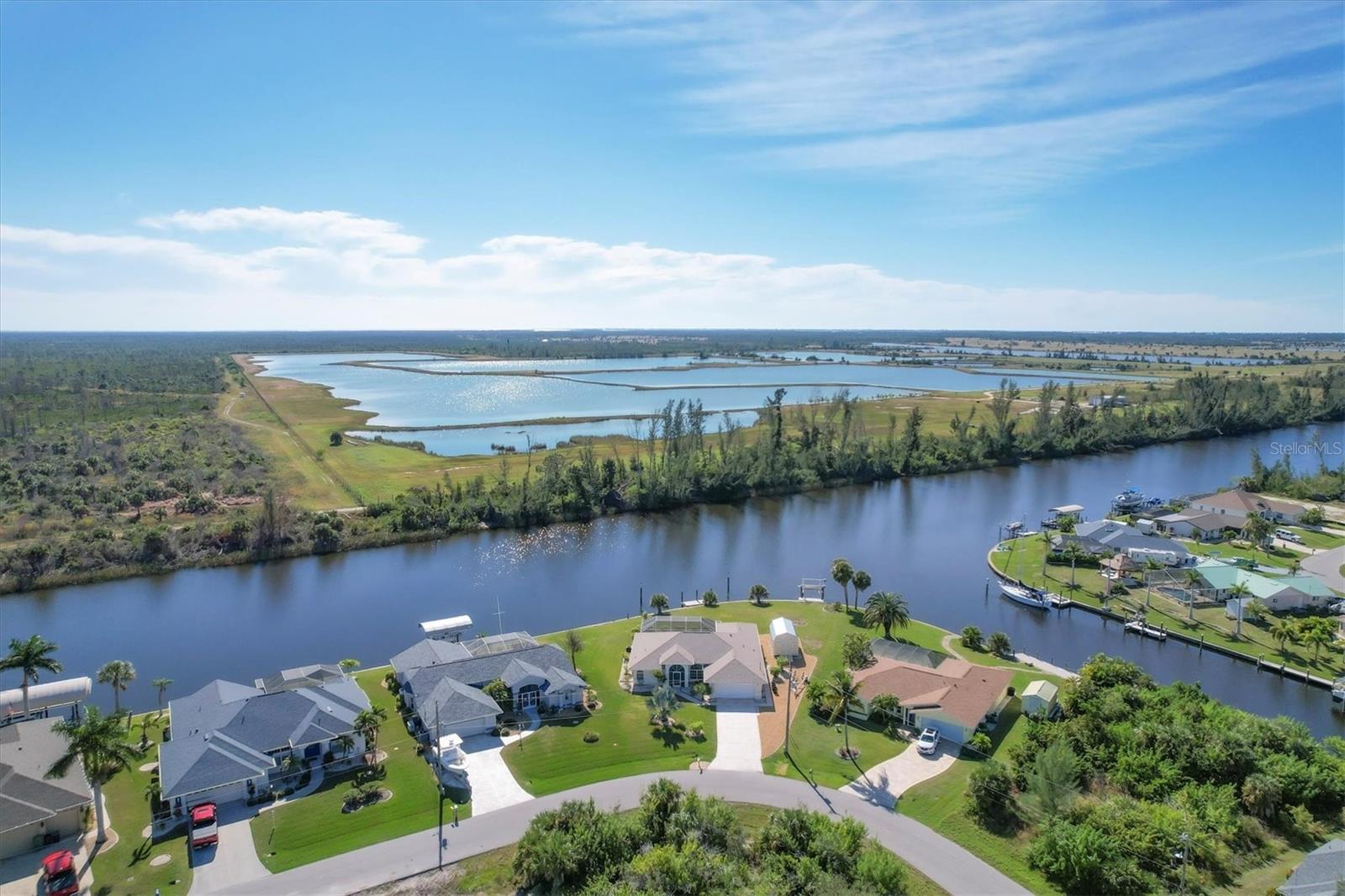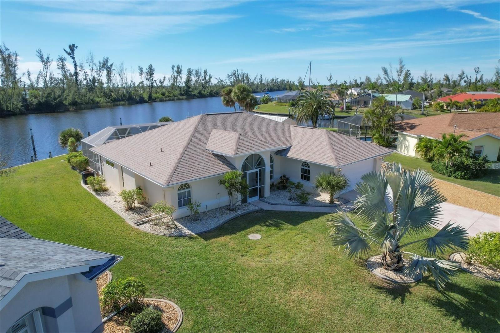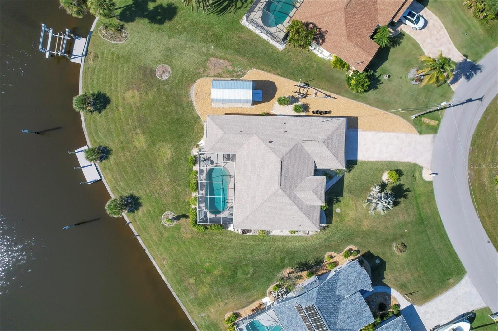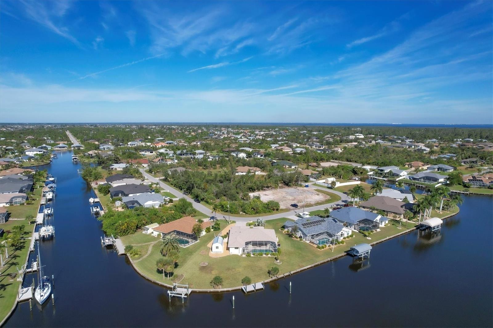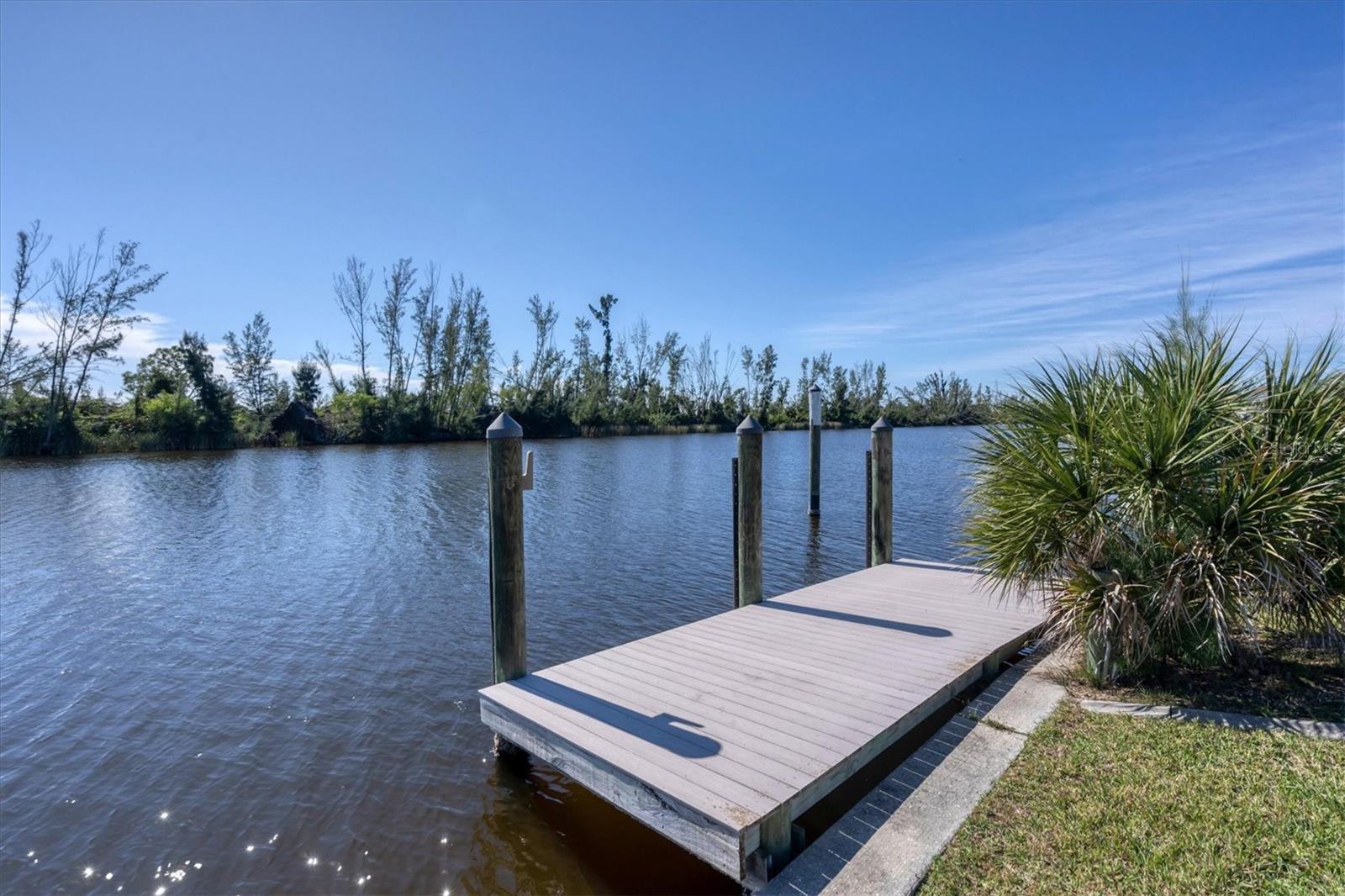 Location! Location! Location! This house sits on a beautiful tip lot with 167' frontage on the extra wide Santa Cruz Waterway with a preserve of trees beyond for a completely natural view. Hard to see any neighbors while sitting on the pool lanai, for extra privacy. Two different docks, one has a 10k power boat lift, the other is perfect for a sailboat. No bridges, direct out through the neighborhood lagoon and protected lock system, with easy boating up two different fresh water rivers, explore the wide estuary of Gasparilla Sound, and then boat up/down the ICW or beyond the barrier islands to the Gulf of Mexico. Perfect boating property. The house itself is older, but well maintained with so many recent updates you won't have any worries for quite awhile. New roof, shed, A/C, pool pump, irrigation pump. High elevation and the protective lock system protects the property from storm surges. With a beautiful Owner's suite on one side of the house, with sliders to the pool lanai and an ensuite bath with dual vanities, a tub and walk-in shower. The other 2 guest bedrooms are on the other side of the house with a shared bathroom with hall access to the pool lanai. The oak kitchen has tons of open counter prep space, a walk-in pantry, and a breakfast bar. The often-accessed refrigerator is set outside the main flow of the kitchen. Walls of glass open for an easy indoor/outdoor lifestyle with the best view in the neighborhood.