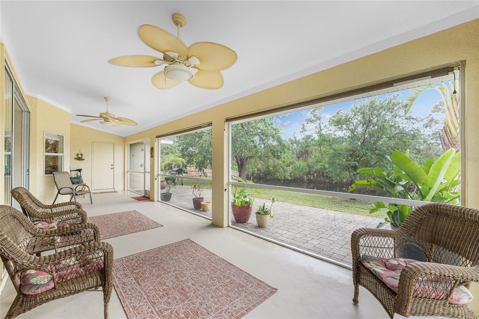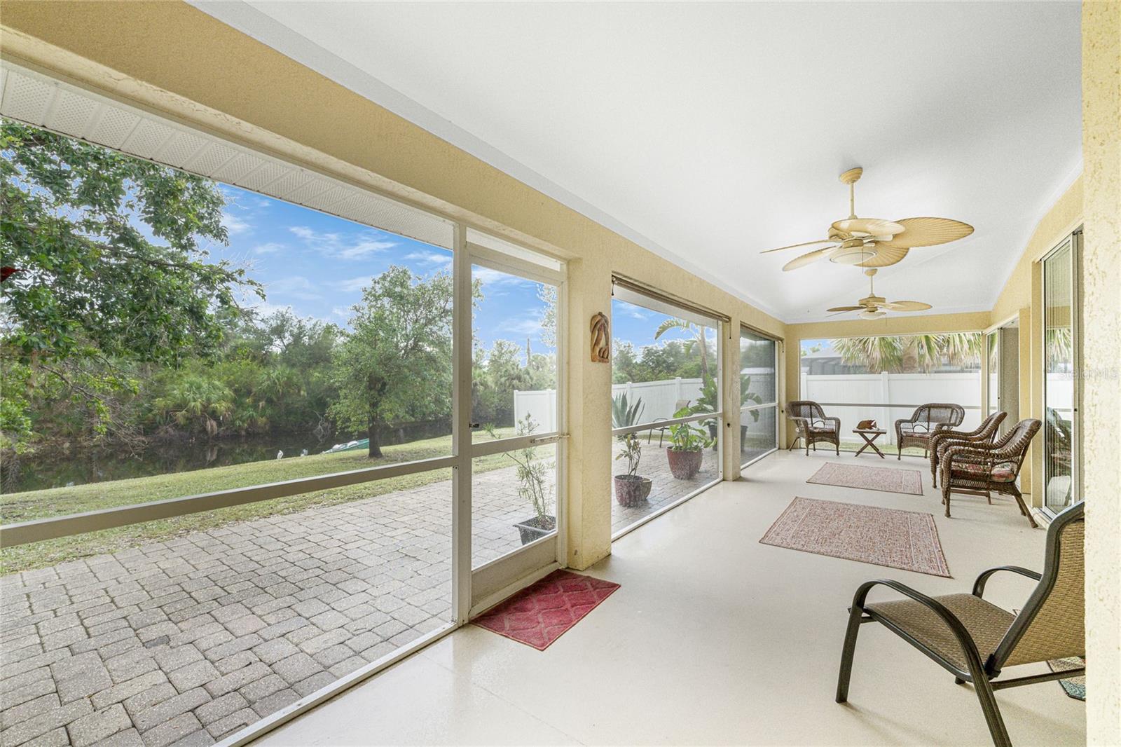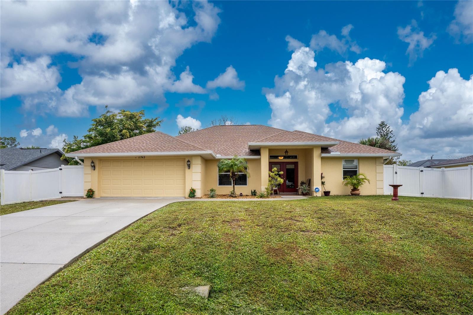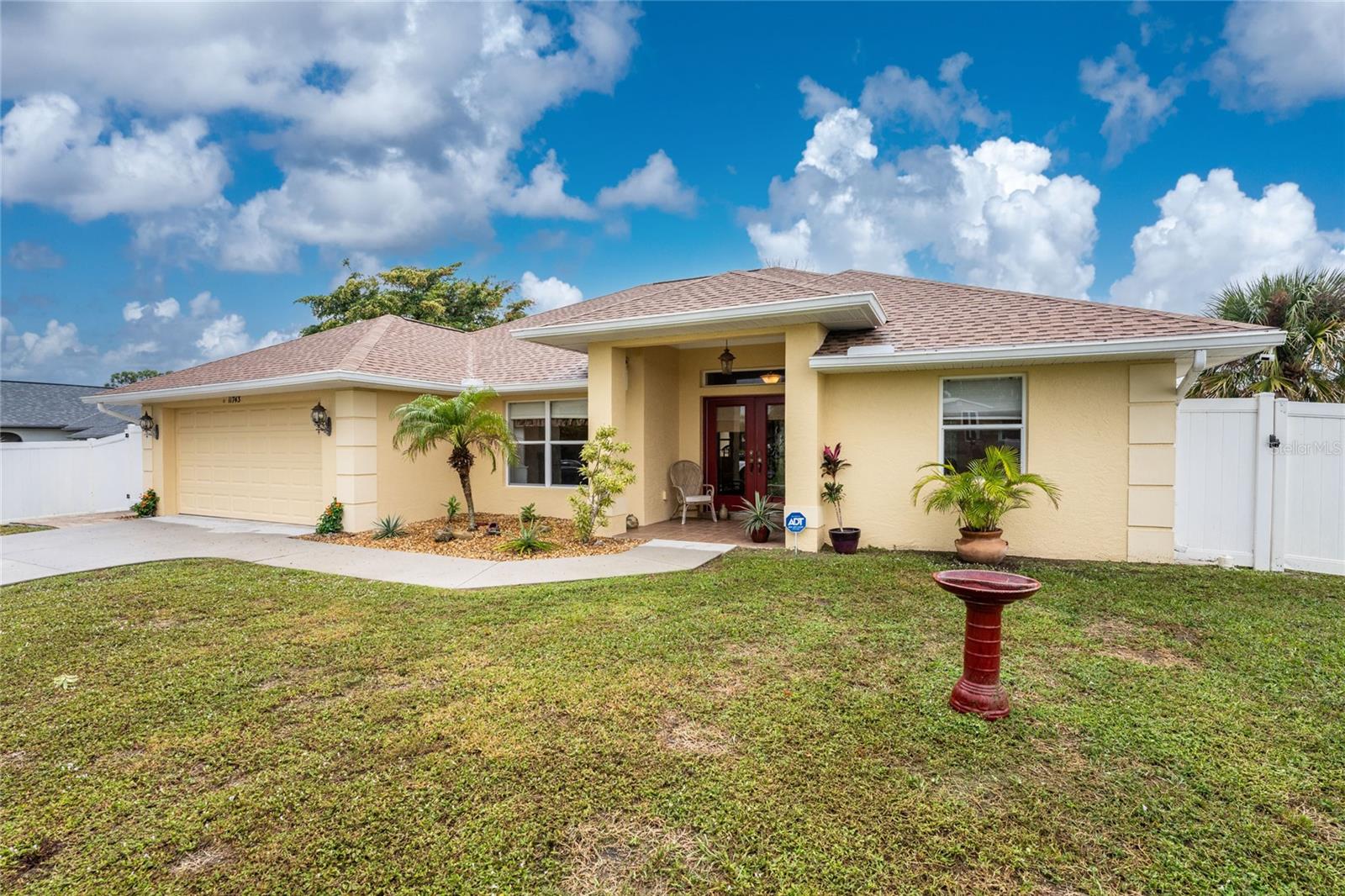 Need two MASTER SUITES? AND HUGE LANAI? No HOA either! Quick closing is possible! Take a look at this CUSTOM BUILT ROBERTS HOME, featuring two extra large bedroom suites - perfect for when those guests come to visit or that teenager who needs their own bathroom! This well maintained home on a Freshwater canal leading to BLUEBERRY LAKE features a gracious entry with tiled flooring and double front doors! Living/dining area has a cathedral ceiling w/ceiling fan, tiled flooring and 8' POCKET sliding glass doors leading to the lanai. Kitchen has both a breakfast bar AND nook area, providing choices for that morning cup of Joe or your lunch! Appliances include: Frigidaire smooth top stove and microwave, GE dishwasher, & Maytag French door refrigerator. Large walk in butler's pantry is just off the kitchen and provides loads of storage! Main bedroom has a 2' bumpout providing extra floor space, tray ceiling with fan, Walk in closet AND a wall closet, updated carpeted flooring and another set of sliding glass doors to the lanai! Main bath includes a Roman shower, raised height vanity with cultured marble top, linen closet, and tiled flooring. Bedroom #2 - which is your 2nd MASTER SUITE - also has a tray ceiling with fan, wall closet, direct access to the 2nd bath, and large windows in the rear, providing a view of the waterway! 2nd bath features a combo tub/shower, raised height vanity with cultured marble top, tiled flooring and exterior door, setting it up to be a pool bath if you ever added a pool! Large laundry room has a ceiling fan, utility tub, updated Speed Queen washer and dryer, and tiled flooring. Two car garage has an automatic garage door and pull down steps for access to the attic for storage. Huge lanai has TWO ceiling fans, outside shower and leads right out to the paver patio! Plenty of space for outdoor entertaining! Roof new in 2023. NOT IN A MANDATORY FLOOD ZONE SO YOUR LENDER WILL NOT REQUIRE FLOOD INSURANCE, SAVING YOU THOUSANDS OF DOLLARS OVER THE LIFE THAT YOU OWN YOUR HOME! Close to shopping, restaurants and just a short drive to area beaches! Come make this home your Florida get a way!!
