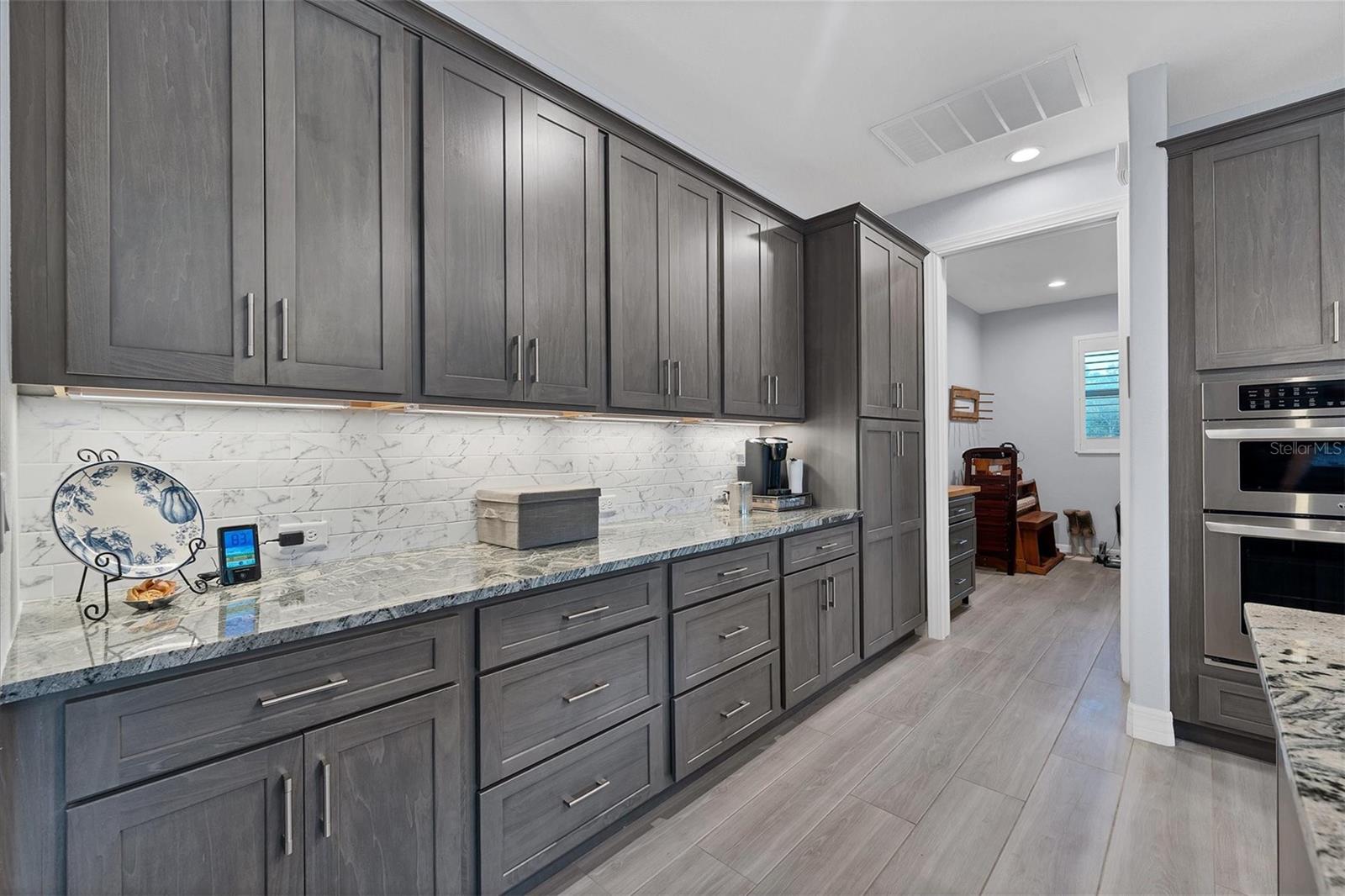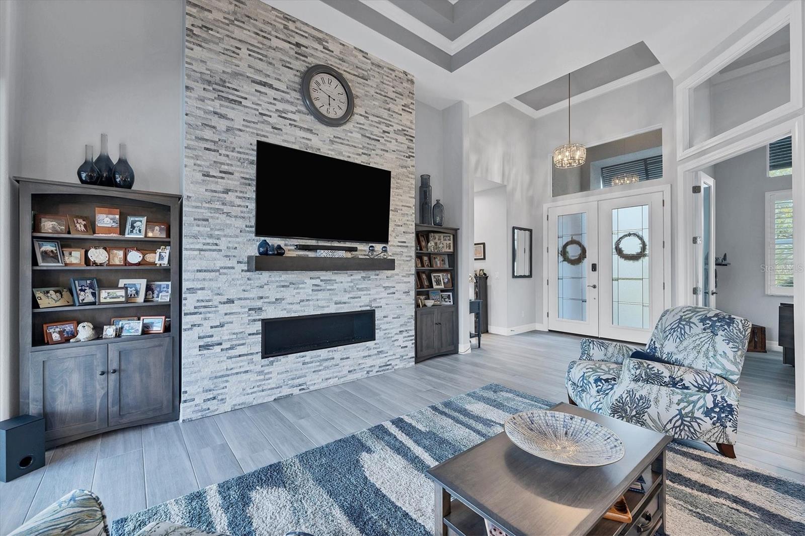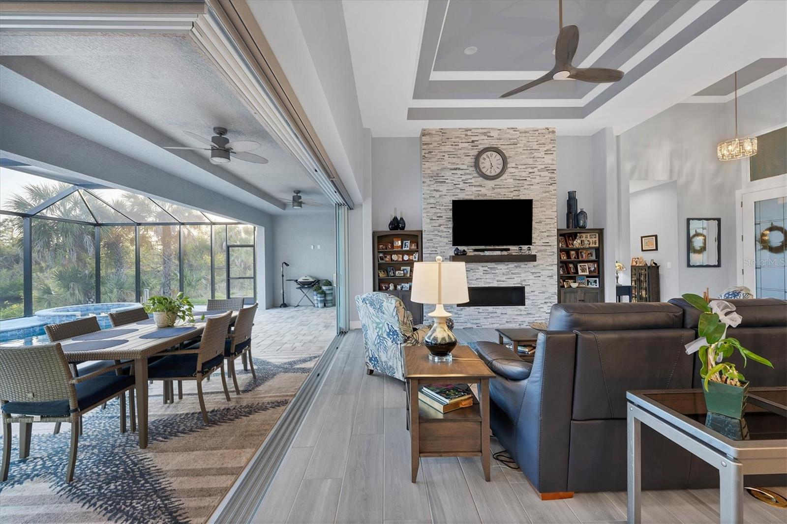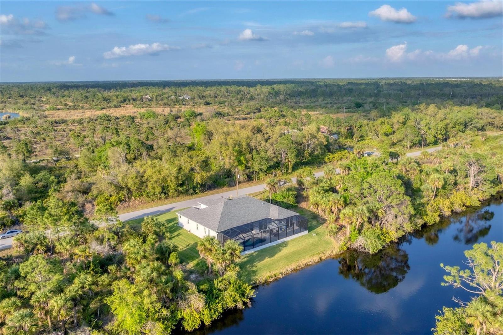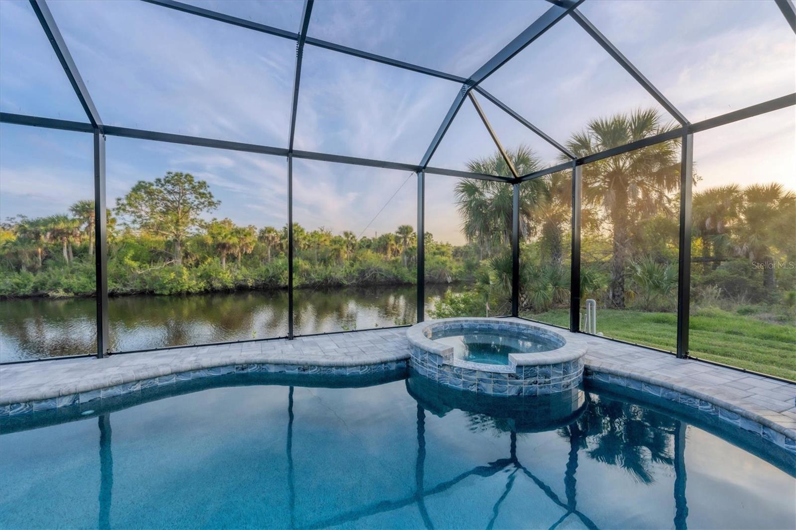 Stepping through the front door your eye is drawn to the beautiful, spacious interior, the pool right outside, and the water view beyond. Your first impression will be “Wow”, and the closer you look the more you will love it.This three-bedroom two-bath house has the open floor plan you want with the large kitchen, living area, and dining area combined as one. Slide the impact doors open and enjoy the large covered lanai for even more room. The owner’s suite is located on one side and the laundry room, garage, second bath and two bedrooms are on the other. The den is just to your left as you enter. This is a perfect place for someone who works from home or you could set up a cozy sitting area away from the main living area.This DM Dean home was completed in 2023 and is better than standard new construction in so many ways. If you purchase this home you will know the exact cost and it will be ready for you to move in the day you close. These are significant improvements over the new construction process. Beyond this, the list of upgrades is long and impressive. All are available in a list for you to review; many are obvious as you look through the house. The building is very energy efficient due to the spray foam insulation and impact windows. The flooring is upgraded plank look porcelain tile throughout. All shower entries are wide and with no barrier so it is easy for everyone. This house is equipped with a 500 gallon propane tank that is used for the whole house generator that will come on automatically when needed. The propane also feeds the fireplace, cook top, oven, and dryer. There custom closets, central vacuum, and upgraded appliances and cabinets speak to the overall quality of the home. This house is on a quiet street already and this property is a triple lot to ensure your privacy in the future. Audio/visual recording equipment may be in operation inside and outside the house.