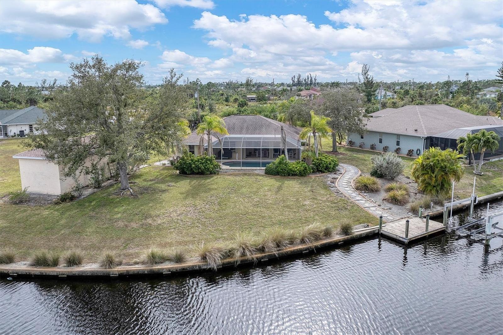 LOCATION * LOCATION * LOCATION * WATERFRONT * POOL HOME * OVERSIZED TIP LOT * 166 ft. of CEMENT SEA WALL * DOCK AND 6K LIFT * SPECTACULAR WATER VIEW !!! In the WATERFRONT BOATING Community of SOUTH GULF COVE With Boating access to the Gulf of Mexico and Surrounding ISLANDS. Only 1 Bridge to a Quick and Easy Out to the Lagoon and Charlotte Harbour. This Home features 3 Spacious Bedrooms, 2 full Baths, OPEN FLOOR PLAN, Vaulted Ceilings, Sliders to LANAI and Spacious POOL area. Living Room has nice Tile floors, Ceiling fans and Light Fixtures. Kitchen has STAINLESS STEEL appliances to include Refrigeator, NEW LG STOVE, NEW LG MICROWAVE, Large PANTRY Closet, Dishwasher, Double Sink, Nice Countertops and Cabinets. BREAKFAST NOOK with large picture window to maximize your WATER VIEW and Sliders to Lanai. Split GUEST BEDROOMS and Full Bath with Tub and Linen Closet. Primary Suite has a Large Walk-in Closet, Vanity, Linen closet, Tiled Shower, NEW plank flooring and Sliders to Lanai. A sparkling SALT WATER POOL to Enjoy and covered outdoor dining and entertaining any day of the year. There is a 16’ BOAT DOCK with WATER, ELECTRIC and 6K LIFT, Nice Spacious back yard with Mature Landscaping and Another very special feature of this property is the 504 sq. feet tandem DETACHED GARAGE, which includes an 8’ tall overhead door which can accommodate your recreational vehicles. This home has FULL HURRICANE PROTECTION with ACCORDION SHUTTERS INSTALLED in 2019, a NEW OVERHEAD DOOR in the main garage installed 2019, NEW ROOF 2016, POOL PUMP 2019 and MORE features include...Screened Garage Door, NEW A/C and HEAT PUMP, NEW WASHER and DRYER. SOUTH GULF COVE is only minutes away from Southwest FLORIDA BEACHES in BOCA GRANDE and MANASOTA KEY with boating access to the Gulf of Mexico and Surrounding ISLANDS. Community offers several nice parks, boat ramp,marinas and a yacht club. With several Golf Courses, WORLD CLASS FISHING, Shopping and Great Restaurants only minutes away!!! HOA is OPTIONAL!!! EXPERIENCE the FLORIDA LIFESTYLE !!!