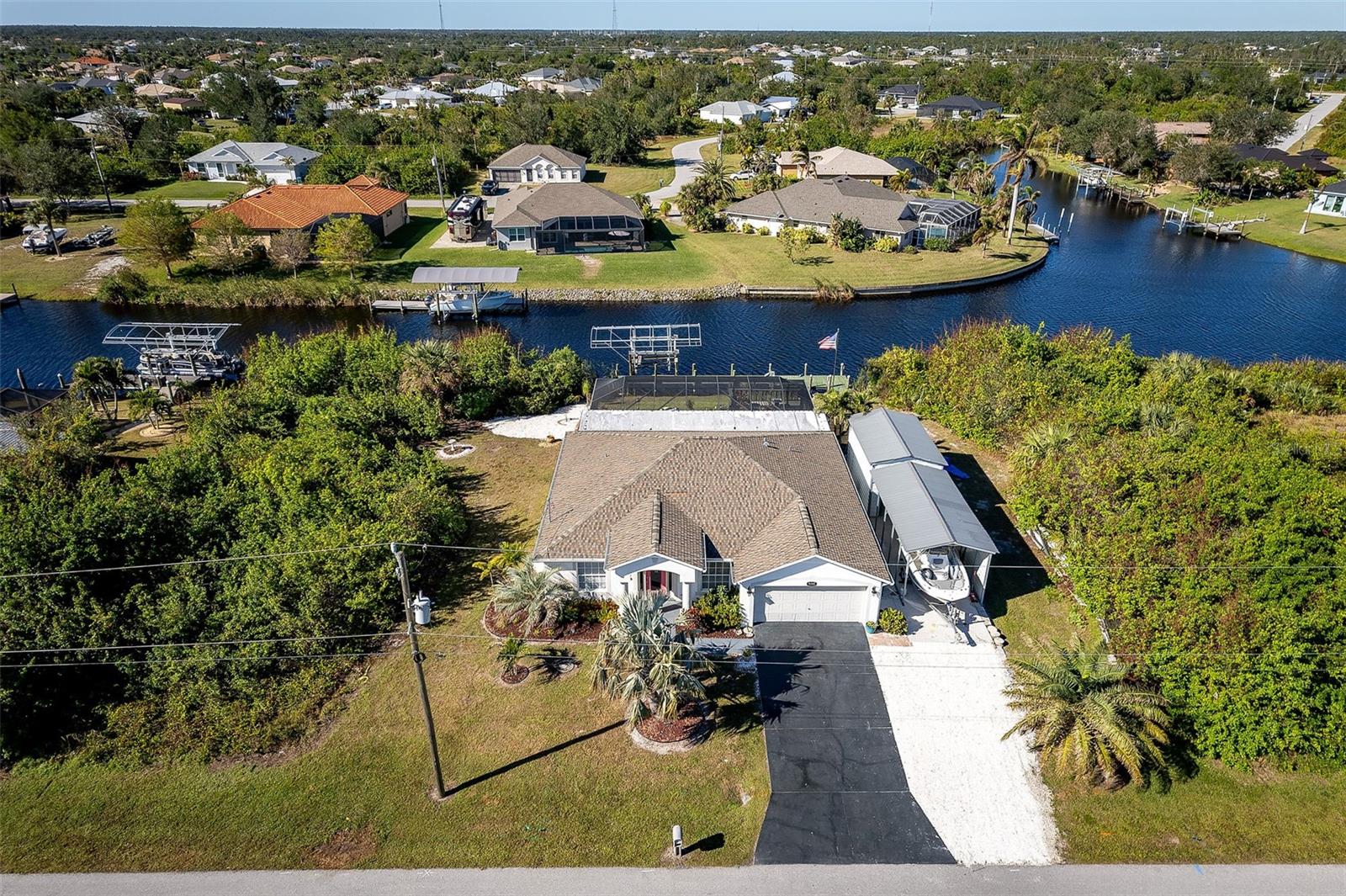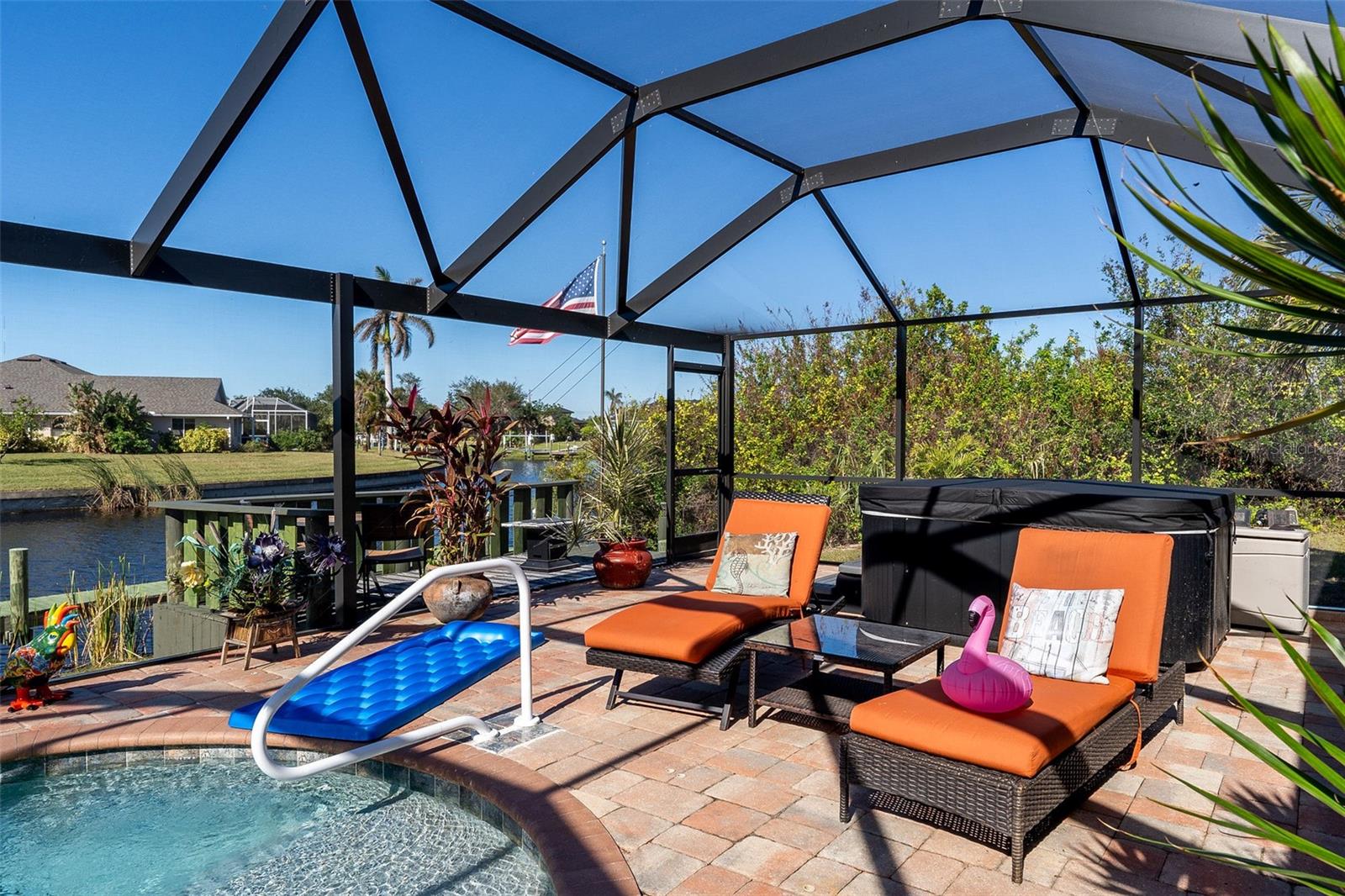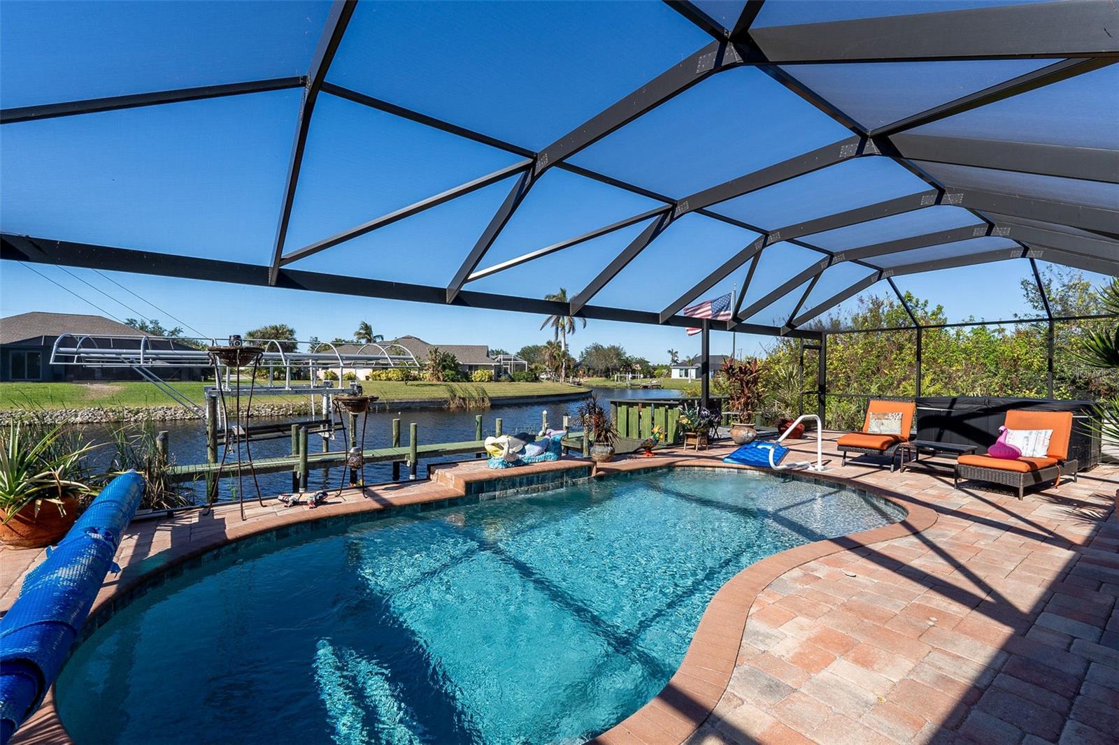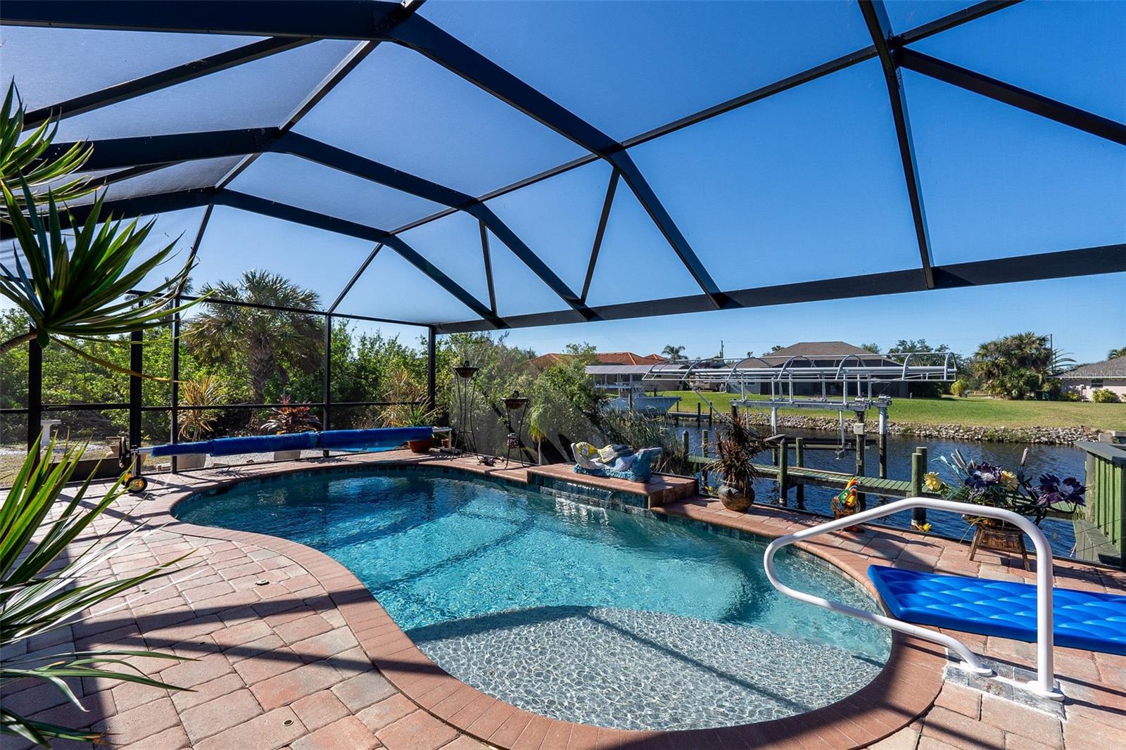 Amazing Opportunity ~ Gulf Access Pool Home in South Gulf Cove! Welcome to this UNIQUE WATERFRONT RETREAT featuring a HEATED POOL with waterfall feature, HUGE dock, COVERED 10,000lb Boat Lift, Sunset Deck, Detached Garage (2021) and 12'x30' Carport in the beautiful Gulf Access community, South Gulf Cove. WOW! This Coastal-inspired 3-bedroom, 2-bathroom Gulf Access home offers the perfect blend of comfort, style and outdoor living. Whether you're a boating enthusiast or simply love the tranquil beauty of the waterfront lifestyle, this property has it all. Step inside to discover a spacious floor plan with luxury vinyl plank flooring and volume ceilings, offering plenty of natural light and seamless flow between the casual and formal living, dining, and kitchen areas. The kitchen is a chef’s delight with stainless steel appliances, high top bar seating and ample cabinet space, perfect for preparing meals to enjoy in your waterfront paradise. The master suite is a true retreat, featuring a private en-suite bath, dual sinks, and newly updated TILED walk-in shower. Two additional generously sized bedrooms provide plenty of space for family or guests, a home office or craft room. The home is designed for easy living with coastal touches and a split- bedroom floor plan for added privacy. Step outside to your own backyard TROPICAL PARADISE! Your sparkling Salt-Water Pool (2018) with Waterfall Feature, Tiki Bar with wall-mount TV, and Brand New Hot Tub (2024) and expansive paver pool deck will be inviting you to relax and unwind on sunny days and starry nights, while the outdoor party deck area is perfect for entertaining or star-gazing with picturesque views of the spectacular sunsets and intersecting waterways. BOATERS will love the private boat dock and covered lift, providing access to the Gulf of Mexico and endless opportunities for boating, fishing, and exploring Southwest Florida's waterways. And wait, there's more! This property has an extended driveway leading to a carport and Detached 12'x20' Garage (2021) with front and back overhead doors. Other Features include NEW Screen Enclosure (2023), NEW complete AC changeout (2019) top of the line LG Thin Q Washer/Dryer (2022), 30 amp RV Hookup, workshop, and more! Located in the highly sought-after South Gulf Cove community, this home is just minutes away from world-class beaches, dining, shopping, and golf courses. Only 20-30 minute drive to downtown Punta Gorda, the cultural district of Venice, and vibrant new Wellen Park! Whether you're looking for a seasonal getaway or a year-round residence, 9300 Miami Circle offers the ultimate in Florida living. Don’t miss your chance to own this exceptional waterfront property. Take our 3D Tour and Call today to schedule your private tour!