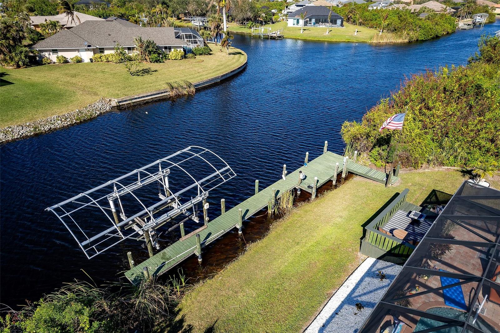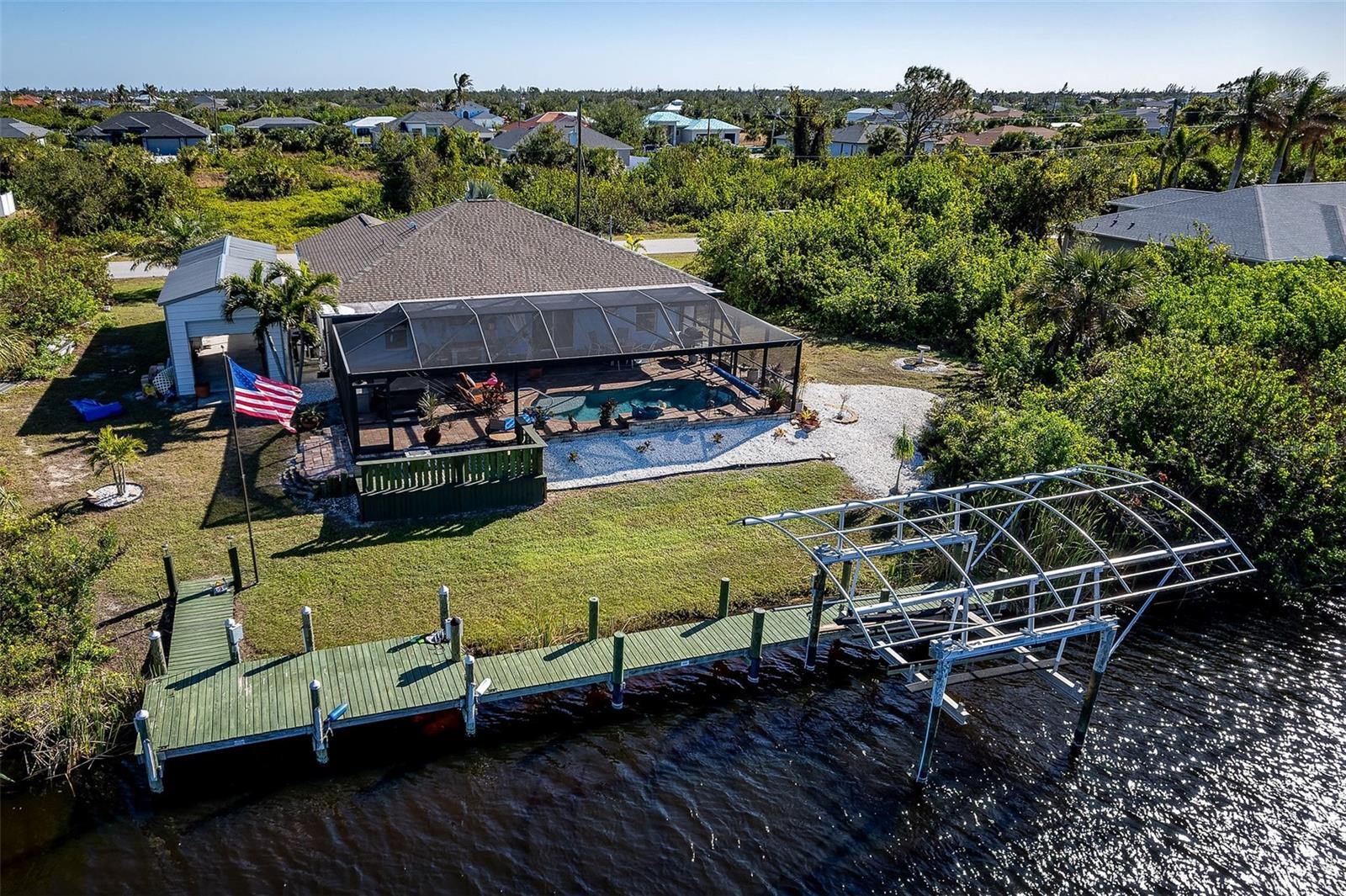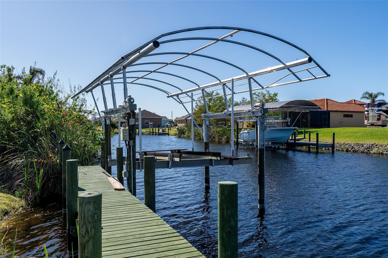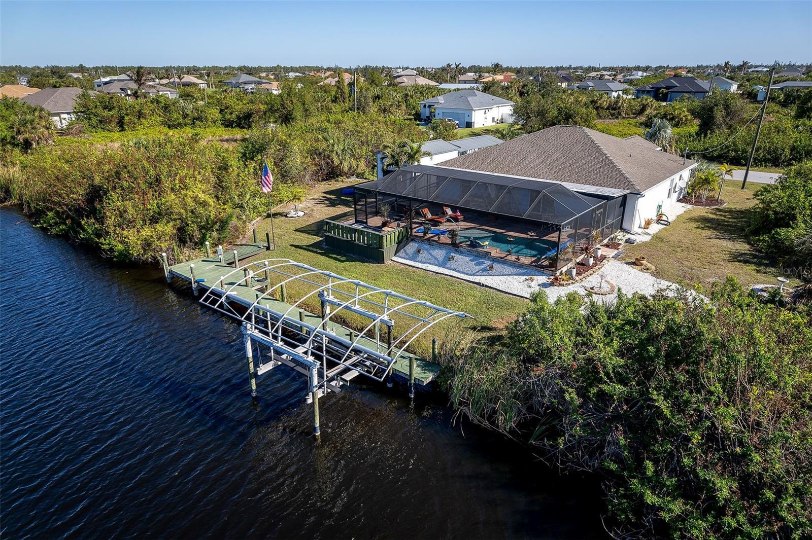 Amazing Opportunity ~ Gulf Access Pool Home in South Gulf Cove! Welcome to this UNIQUE WATERFRONT RETREAT featuring a HEATED POOL with waterfall feature, HUGE dock, COVERED 10,000lb Boat Lift, Sunset Deck, Detached Garage (2021) and 12'x30' Carport in the beautiful Gulf Access community, South Gulf Cove. WOW! This Coastal-inspired 3-bedroom, 2-bathroom Gulf Access home offers the perfect blend of comfort, style and outdoor living. Whether you're a boating enthusiast or simply love the tranquil beauty of the waterfront lifestyle, this property has it all. Step inside to discover a spacious floor plan with luxury vinyl plank flooring and volume ceilings, offering plenty of natural light and seamless flow between the casual and formal living, dining, and kitchen areas. The kitchen is a chef’s delight with stainless steel appliances, high top bar seating and ample cabinet space, perfect for preparing meals to enjoy in your waterfront paradise. The master suite is a true retreat, featuring a private en-suite bath, dual sinks, and newly updated TILED walk-in shower. Two additional generously sized bedrooms provide plenty of space for family or guests, a home office or craft room. The home is designed for easy living with coastal touches and a split- bedroom floor plan for added privacy. Step outside to your own backyard TROPICAL PARADISE! Your sparkling Salt-Water Pool (2018) with Waterfall Feature, Tiki Bar with wall-mount TV, and Brand New Hot Tub (2024) and expansive paver pool deck will be inviting you to relax and unwind on sunny days and starry nights, while the outdoor party deck area is perfect for entertaining or star-gazing with picturesque views of the spectacular sunsets and intersecting waterways. BOATERS will love the private boat dock and covered lift, providing access to the Gulf of Mexico and endless opportunities for boating, fishing, and exploring Southwest Florida's waterways. And wait, there's more! This property has an extended driveway leading to a carport and Detached 12'x20' Garage (2021) with front and back overhead doors. Other Features include NEW Screen Enclosure (2023), NEW complete AC changeout (2019) top of the line LG Thin Q Washer/Dryer (2022), 30 amp RV Hookup, workshop, and more! Located in the highly sought-after South Gulf Cove community, this home is just minutes away from world-class beaches, dining, shopping, and golf courses. Only 20-30 minute drive to downtown Punta Gorda, the cultural district of Venice, and vibrant new Wellen Park! Whether you're looking for a seasonal getaway or a year-round residence, 9300 Miami Circle offers the ultimate in Florida living. Don’t miss your chance to own this exceptional waterfront property. Take our 3D Tour and Call today to schedule your private tour!