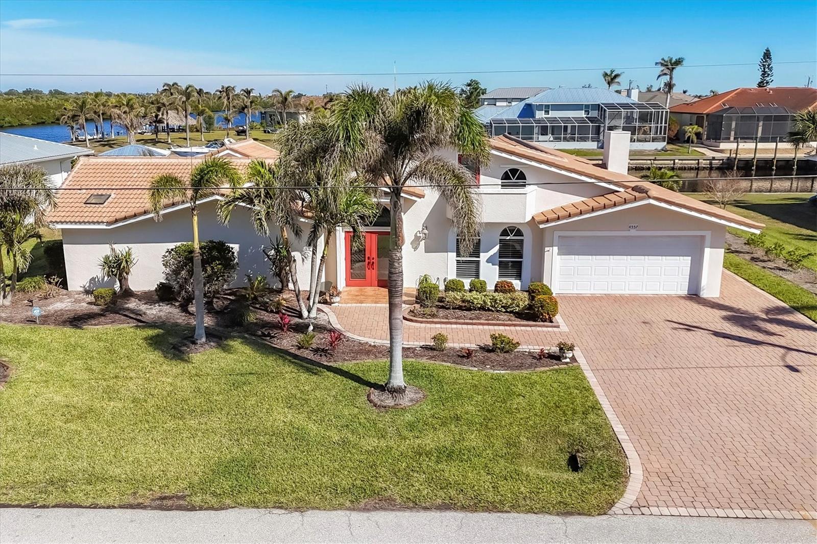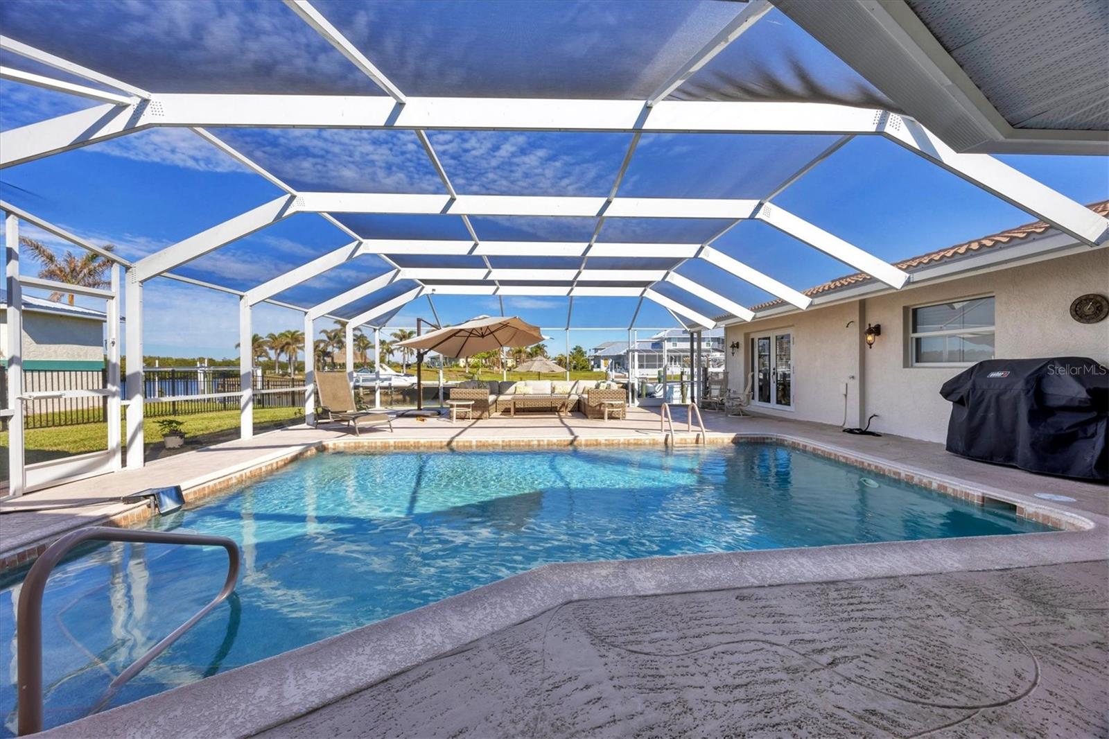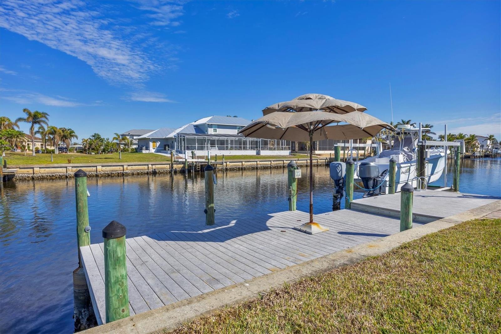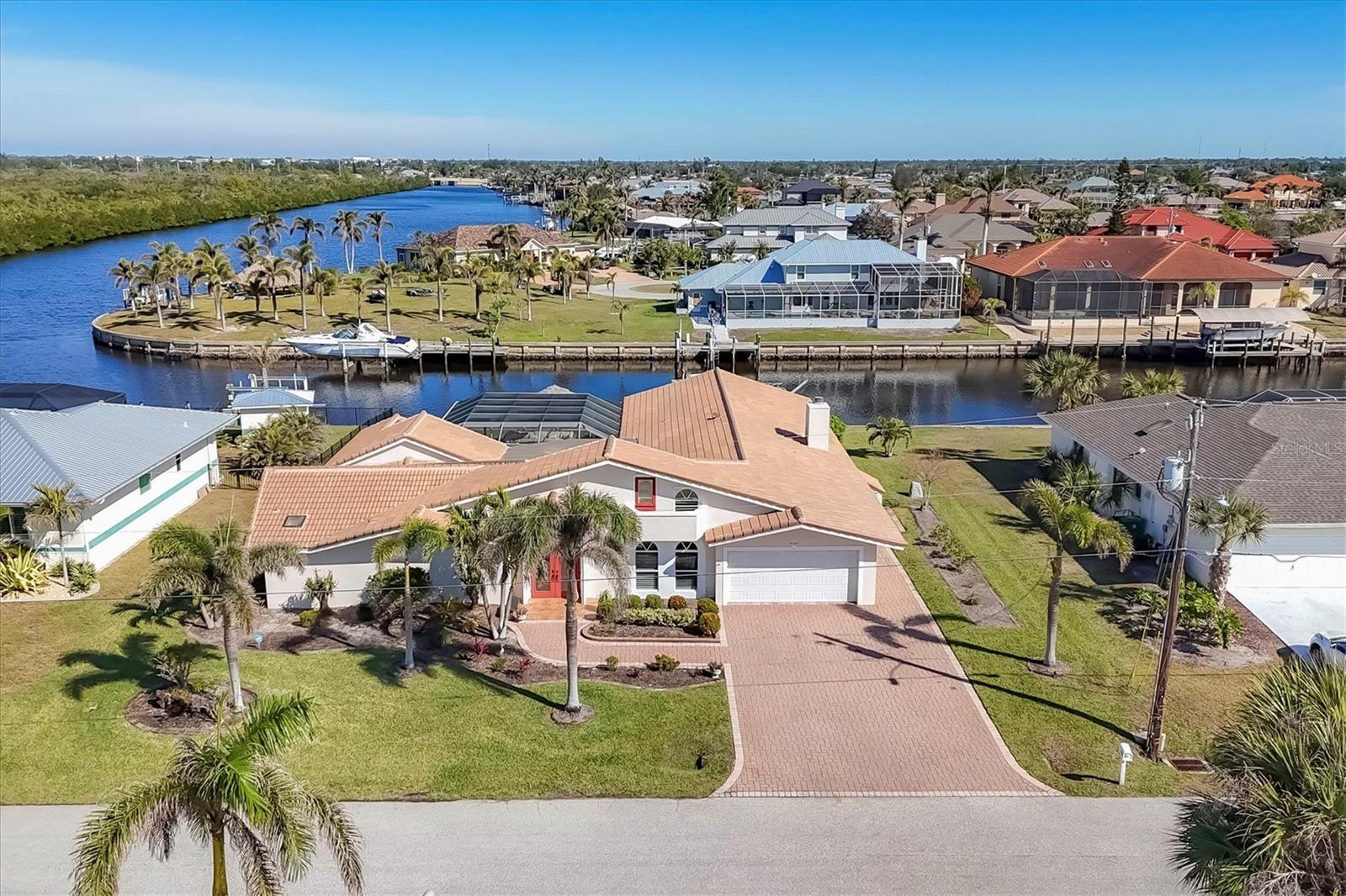 Canal-front views, endless boating adventures and island-inspired charm create a sense of laidback bliss throughout this spacious home. Granting large areas to gather, entertain or relax, the bright interiors are complemented by vibrant exteriors that epitomize indoor-outdoor living. The sprawling floorplan is accentuated and enhanced with eye-catching stained-glass finishes, beamed coffered ceilings, built-ins, dazzling light fixtures, a showcase wood-burning fireplace, and open-concept dwelling. Welcomed through double glass doors into the foyer, a formal living room transitions you into the heart of the home, where the combined family room, dining area and kitchen bring everyone together. Boasting a wealth of cabinetry, island peninsula with bar seating, built-in stainless appliances and sliders that provide seamless flow to the lanai, the kitchen is sure to offer unlimited hosting opportunities. Today’s discerning homeowner relishes space versatility for wellness, preferences, and entertaining, which this residence has with four generous guest bedrooms and an upstairs nook, including a personal balcony. Fashion the bedrooms as an office, game room, hobby area, or in-law quarters to meet all your needs. A primary suite with gracious en-suite bath including a garden tub and walk-in shower featuring a rain shower head will allow you sanctuary at the end of the day. Friends and family alike will enjoy spending time year-round in the backyard, alfresco meals on the screened lanai showcasing a beverage bar, taking a refreshing dip in the large pool, fishing from the dock and watching nature unfold on the canal, and exploring the coast by boat. The 40-foot Trex dock includes water and electric, a 10,000-lb lift and two davits to fulfill your captain’s dreams. This is everything you’ve wanted in a waterfront home.