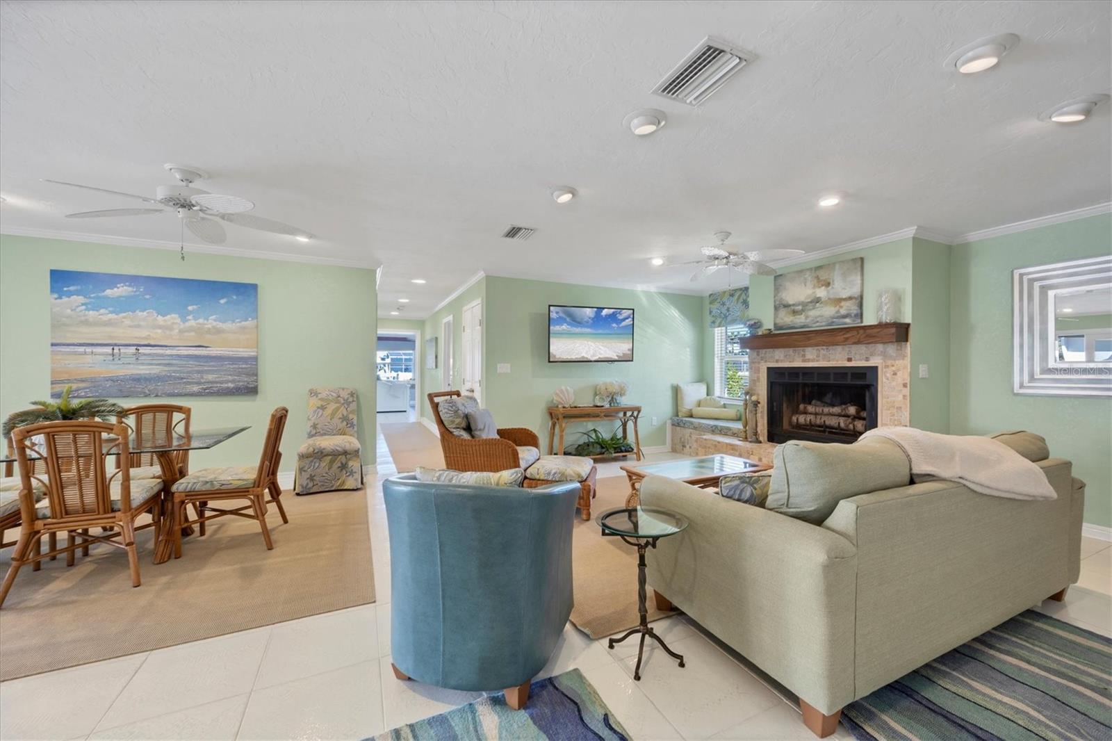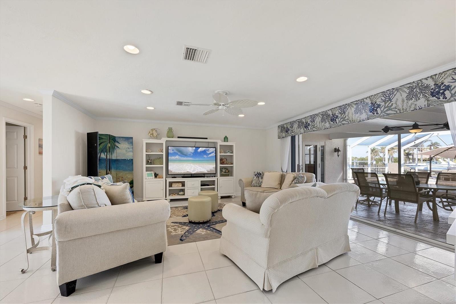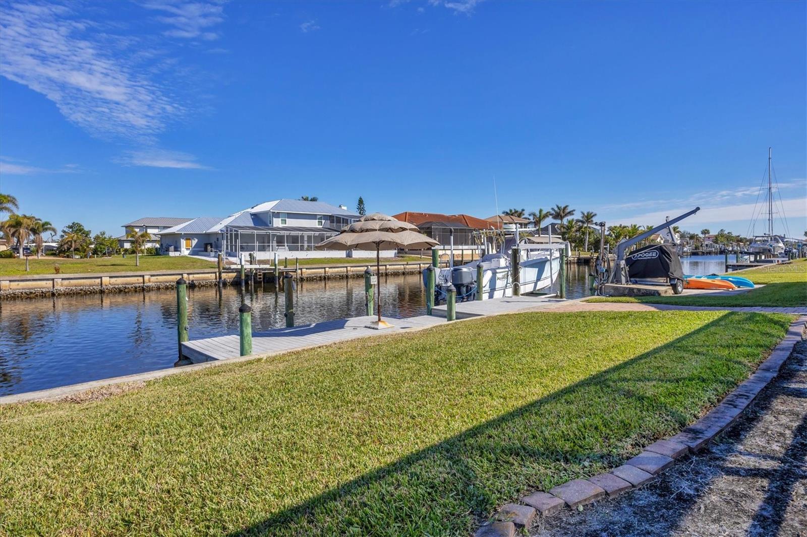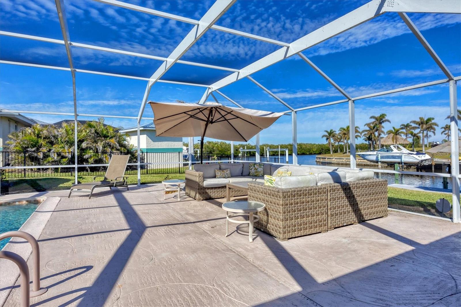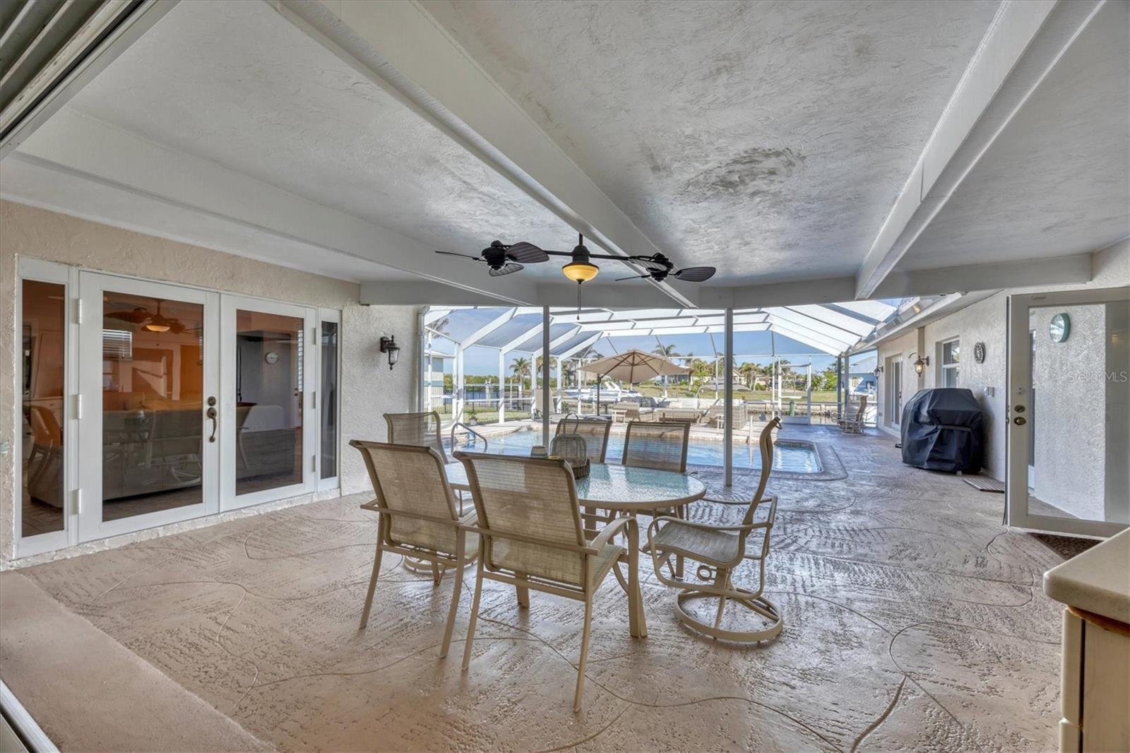 Canal-front views, endless boating adventures and island-inspired charm create a sense of laidback bliss throughout this spacious home. Granting large areas to gather, entertain or relax, the bright interiors are complemented by vibrant exteriors that epitomize indoor-outdoor living. The sprawling floorplan is accentuated and enhanced with eye-catching stained-glass finishes, beamed coffered ceilings, built-ins, dazzling light fixtures, a showcase wood-burning fireplace, and open-concept dwelling. Welcomed through double glass doors into the foyer, a formal living room transitions you into the heart of the home, where the combined family room, dining area and kitchen bring everyone together. Boasting a wealth of cabinetry, island peninsula with bar seating, built-in stainless appliances and sliders that provide seamless flow to the lanai, the kitchen is sure to offer unlimited hosting opportunities. Today’s discerning homeowner relishes space versatility for wellness, preferences, and entertaining, which this residence has with four generous guest bedrooms and an upstairs nook, including a personal balcony. Fashion the bedrooms as an office, game room, hobby area, or in-law quarters to meet all your needs. A primary suite with gracious en-suite bath including a garden tub and walk-in shower featuring a rain shower head will allow you sanctuary at the end of the day. Friends and family alike will enjoy spending time year-round in the backyard, alfresco meals on the screened lanai showcasing a beverage bar, taking a refreshing dip in the large pool, fishing from the dock and watching nature unfold on the canal, and exploring the coast by boat. The 40-foot Trex dock includes water and electric, a 10,000-lb lift and two davits to fulfill your captain’s dreams. This is everything you’ve wanted in a waterfront home.