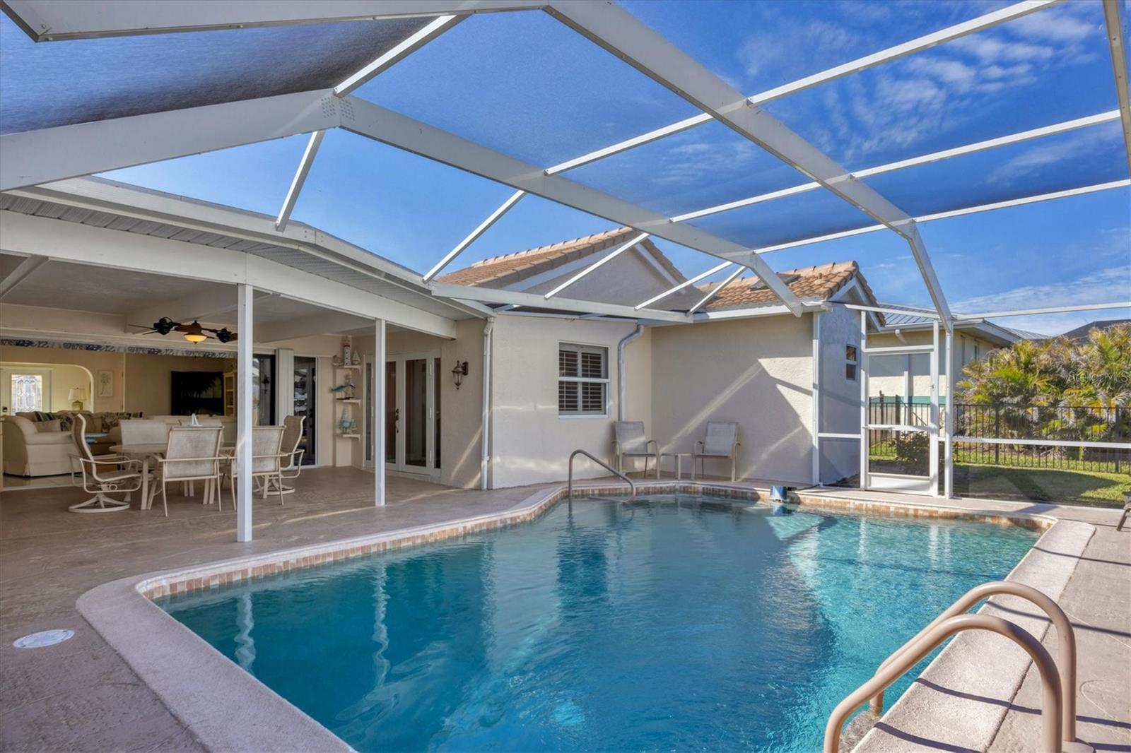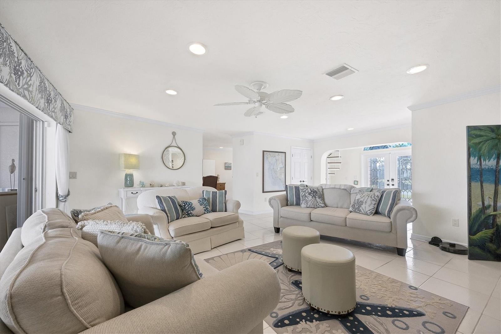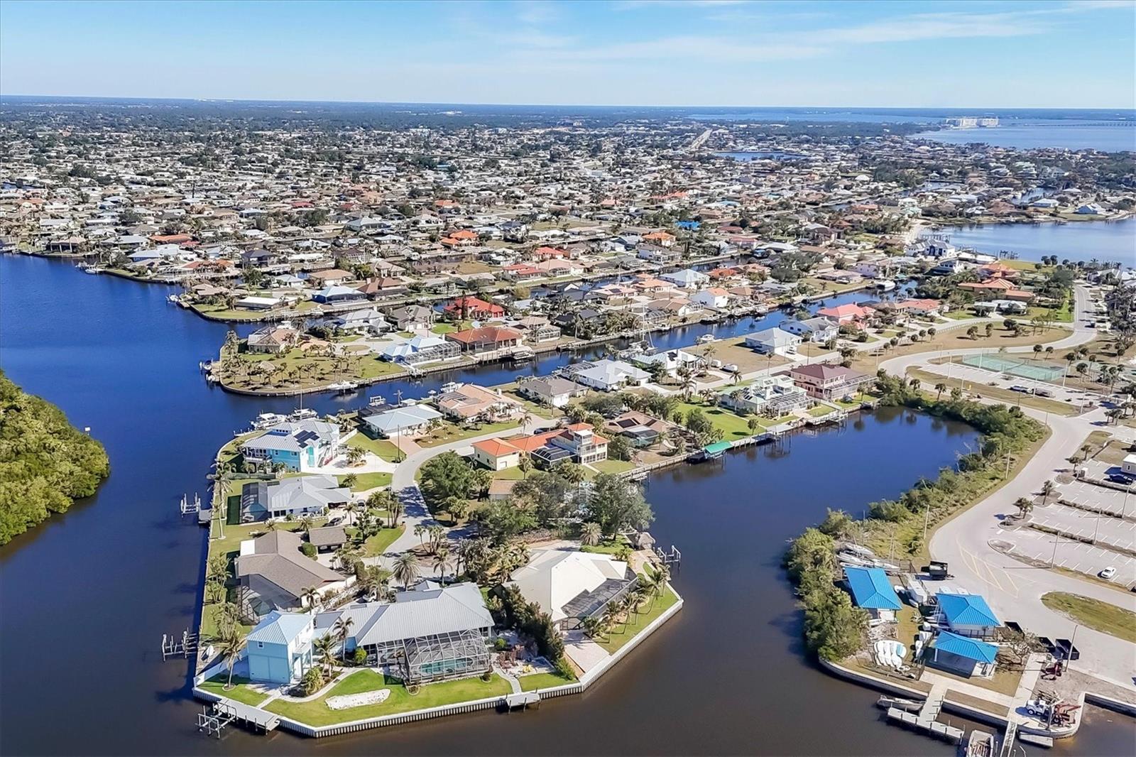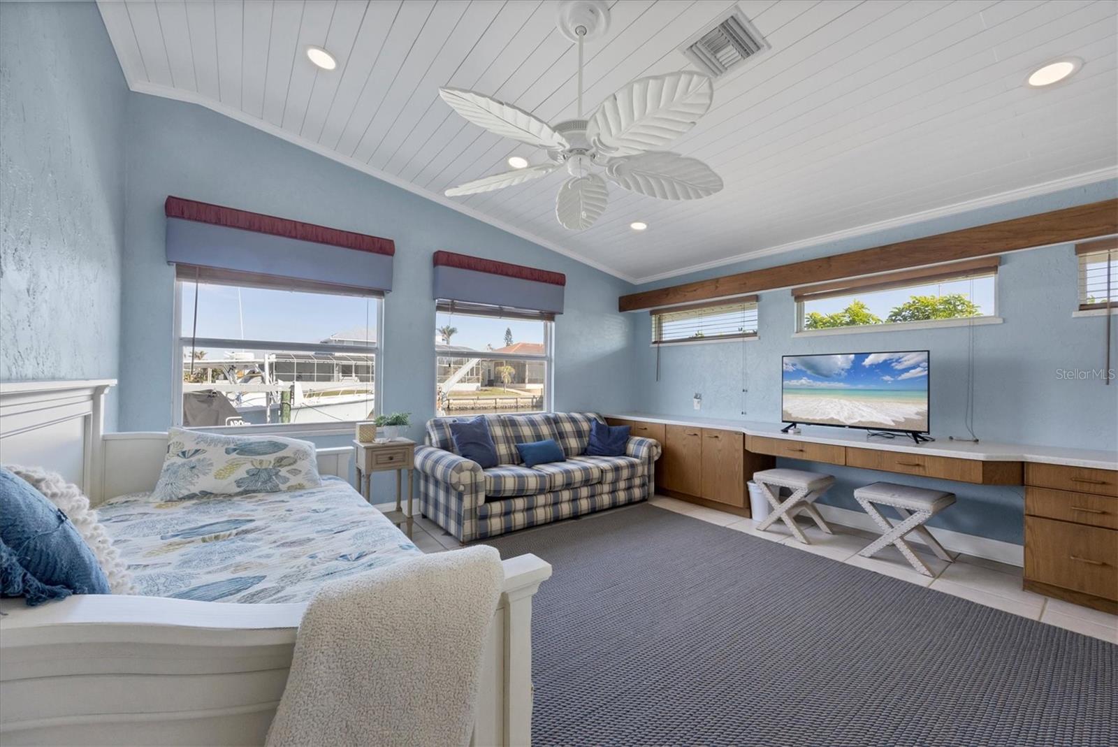 Canal-front views, endless boating adventures and island-inspired charm create a sense of laidback bliss throughout this spacious home. Granting large areas to gather, entertain or relax, the bright interiors are complemented by vibrant exteriors that epitomize indoor-outdoor living. The sprawling floorplan is accentuated and enhanced with eye-catching stained-glass finishes, beamed coffered ceilings, built-ins, dazzling light fixtures, a showcase wood-burning fireplace, and open-concept dwelling. Welcomed through double glass doors into the foyer, a formal living room transitions you into the heart of the home, where the combined family room, dining area and kitchen bring everyone together. Boasting a wealth of cabinetry, island peninsula with bar seating, built-in stainless appliances and sliders that provide seamless flow to the lanai, the kitchen is sure to offer unlimited hosting opportunities. Today’s discerning homeowner relishes space versatility for wellness, preferences, and entertaining, which this residence has with four generous guest bedrooms and an upstairs nook, including a personal balcony. Fashion the bedrooms as an office, game room, hobby area, or in-law quarters to meet all your needs. A primary suite with gracious en-suite bath including a garden tub and walk-in shower featuring a rain shower head will allow you sanctuary at the end of the day. Friends and family alike will enjoy spending time year-round in the backyard, alfresco meals on the screened lanai showcasing a beverage bar, taking a refreshing dip in the large pool, fishing from the dock and watching nature unfold on the canal, and exploring the coast by boat. The 40-foot Trex dock includes water and electric, a 10,000-lb lift and two davits to fulfill your captain’s dreams. This is everything you’ve wanted in a waterfront home.