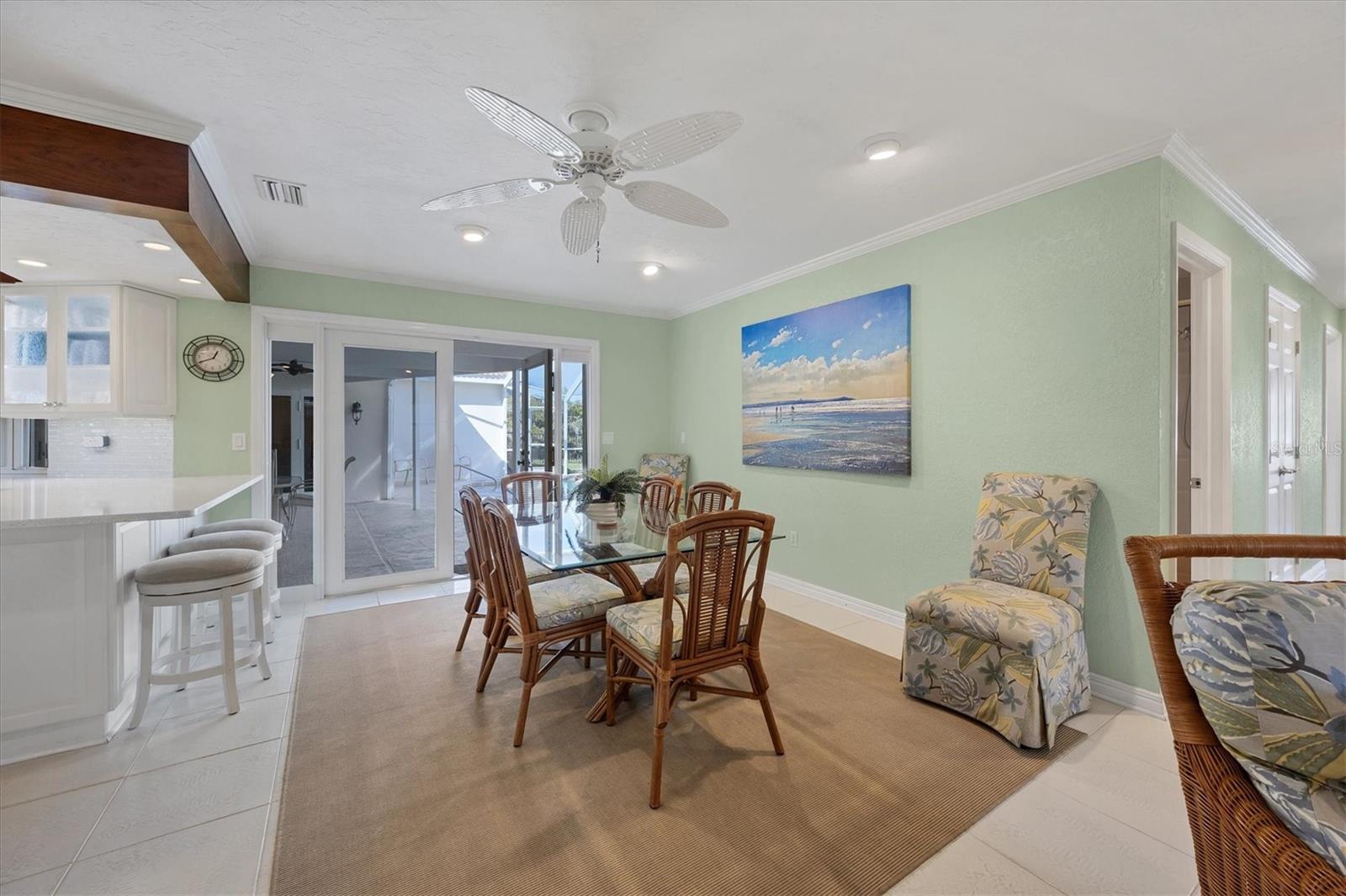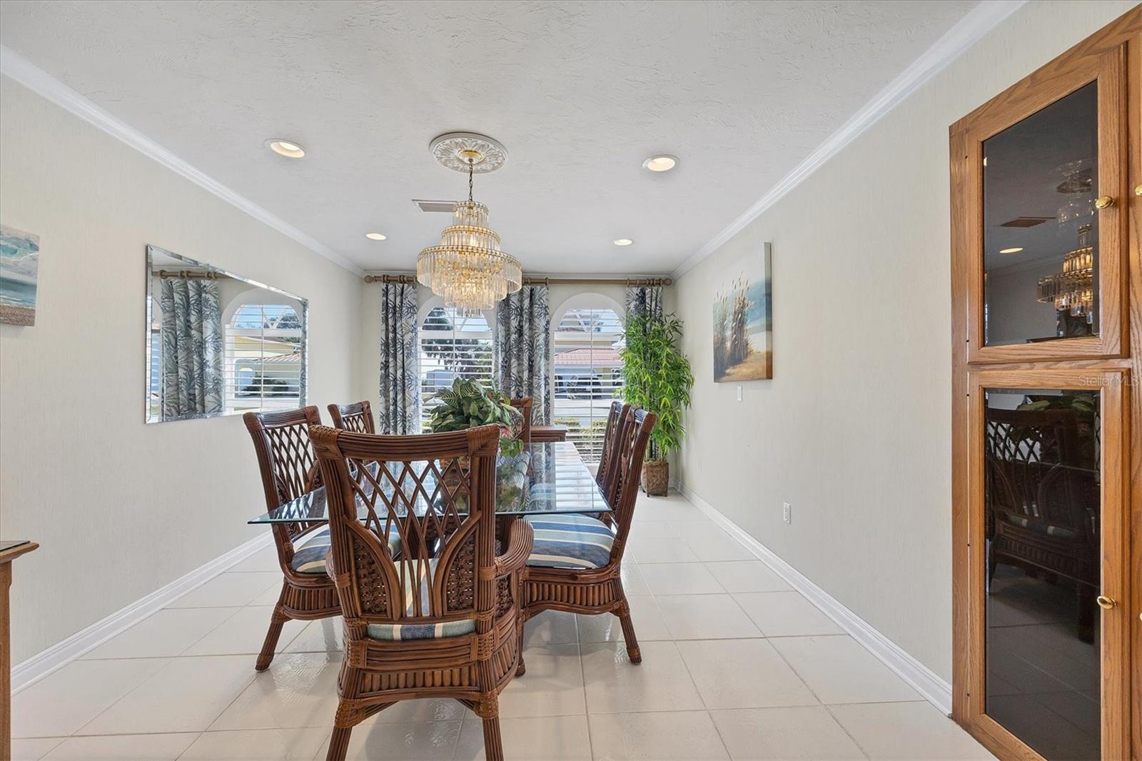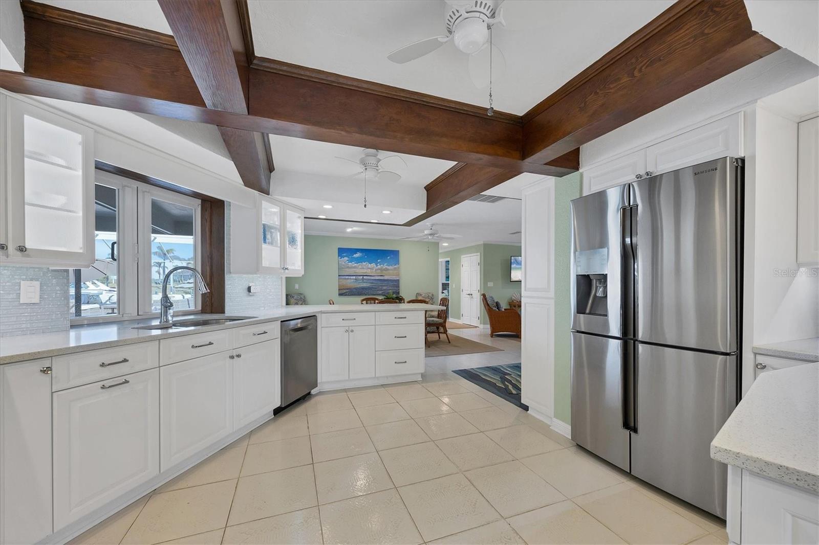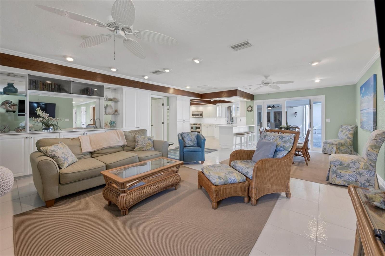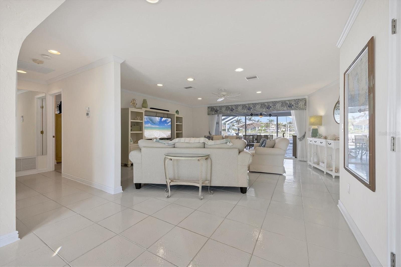 Canal-front views, endless boating adventures and island-inspired charm create a sense of laidback bliss throughout this spacious home. Granting large areas to gather, entertain or relax, the bright interiors are complemented by vibrant exteriors that epitomize indoor-outdoor living. The sprawling floorplan is accentuated and enhanced with eye-catching stained-glass finishes, beamed coffered ceilings, built-ins, dazzling light fixtures, a showcase wood-burning fireplace, and open-concept dwelling. Welcomed through double glass doors into the foyer, a formal living room transitions you into the heart of the home, where the combined family room, dining area and kitchen bring everyone together. Boasting a wealth of cabinetry, island peninsula with bar seating, built-in stainless appliances and sliders that provide seamless flow to the lanai, the kitchen is sure to offer unlimited hosting opportunities. Today’s discerning homeowner relishes space versatility for wellness, preferences, and entertaining, which this residence has with four generous guest bedrooms and an upstairs nook, including a personal balcony. Fashion the bedrooms as an office, game room, hobby area, or in-law quarters to meet all your needs. A primary suite with gracious en-suite bath including a garden tub and walk-in shower featuring a rain shower head will allow you sanctuary at the end of the day. Friends and family alike will enjoy spending time year-round in the backyard, alfresco meals on the screened lanai showcasing a beverage bar, taking a refreshing dip in the large pool, fishing from the dock and watching nature unfold on the canal, and exploring the coast by boat. The 40-foot Trex dock includes water and electric, a 10,000-lb lift and two davits to fulfill your captain’s dreams. This is everything you’ve wanted in a waterfront home.