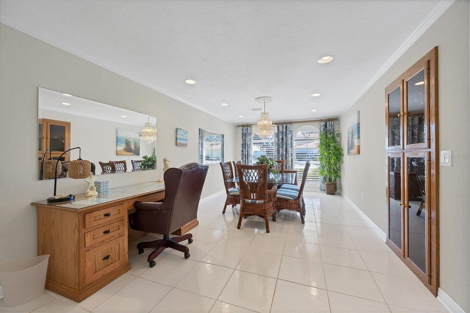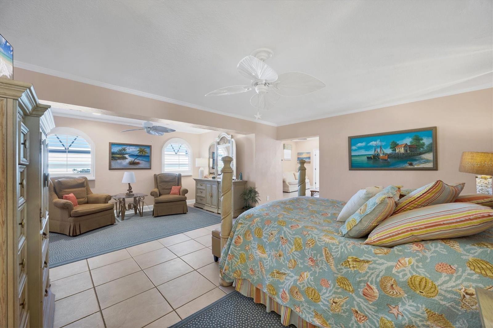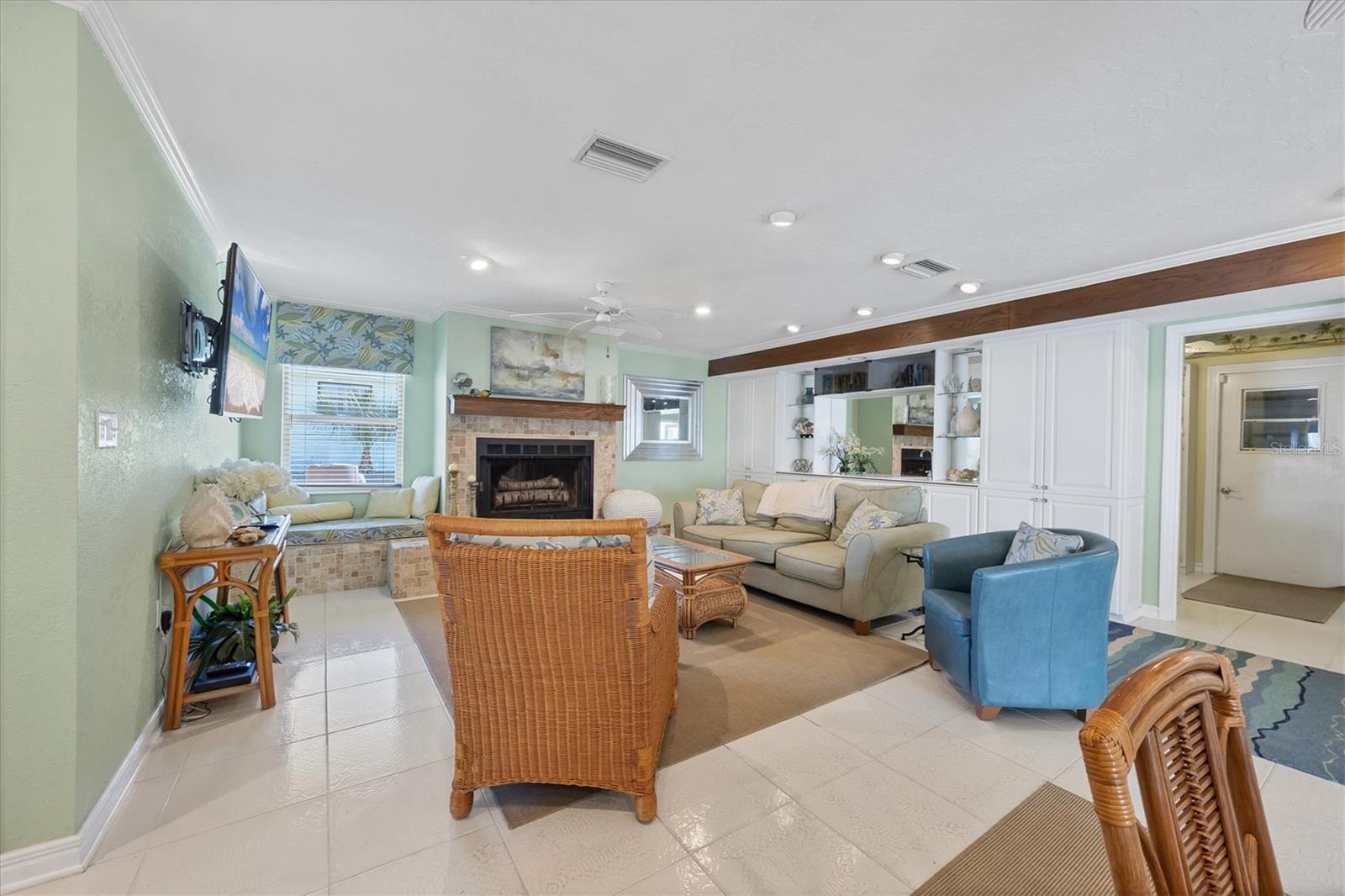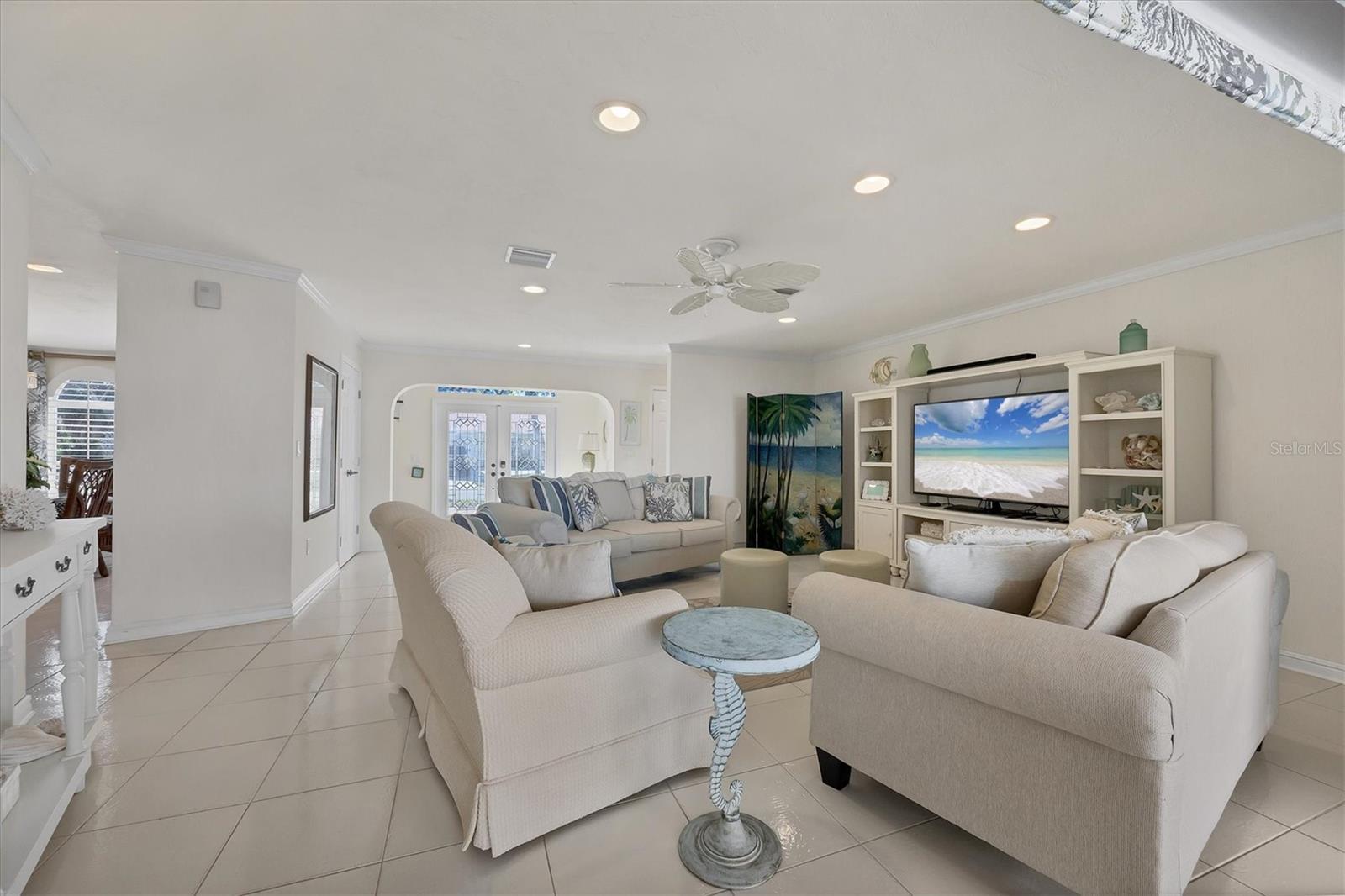 Canal-front views, endless boating adventures and island-inspired charm create a sense of laidback bliss throughout this spacious home. Granting large areas to gather, entertain or relax, the bright interiors are complemented by vibrant exteriors that epitomize indoor-outdoor living. The sprawling floorplan is accentuated and enhanced with eye-catching stained-glass finishes, beamed coffered ceilings, built-ins, dazzling light fixtures, a showcase wood-burning fireplace, and open-concept dwelling. Welcomed through double glass doors into the foyer, a formal living room transitions you into the heart of the home, where the combined family room, dining area and kitchen bring everyone together. Boasting a wealth of cabinetry, island peninsula with bar seating, built-in stainless appliances and sliders that provide seamless flow to the lanai, the kitchen is sure to offer unlimited hosting opportunities. Today’s discerning homeowner relishes space versatility for wellness, preferences, and entertaining, which this residence has with four generous guest bedrooms and an upstairs nook, including a personal balcony. Fashion the bedrooms as an office, game room, hobby area, or in-law quarters to meet all your needs. A primary suite with gracious en-suite bath including a garden tub and walk-in shower featuring a rain shower head will allow you sanctuary at the end of the day. Friends and family alike will enjoy spending time year-round in the backyard, alfresco meals on the screened lanai showcasing a beverage bar, taking a refreshing dip in the large pool, fishing from the dock and watching nature unfold on the canal, and exploring the coast by boat. The 40-foot Trex dock includes water and electric, a 10,000-lb lift and two davits to fulfill your captain’s dreams. This is everything you’ve wanted in a waterfront home.