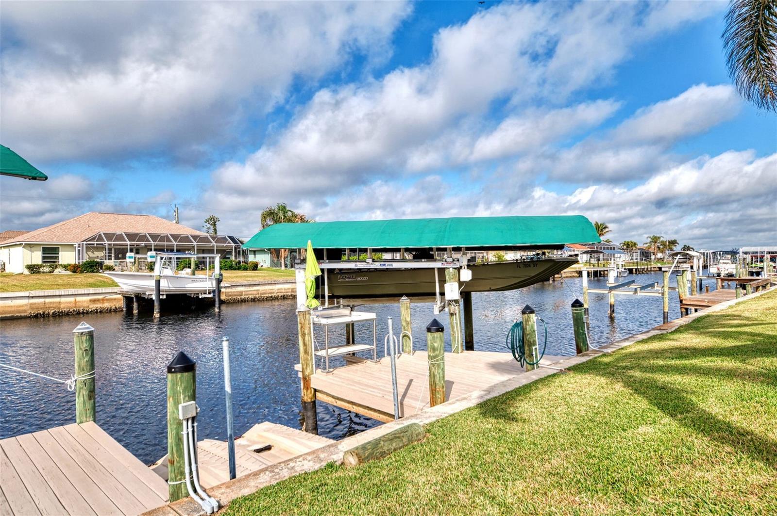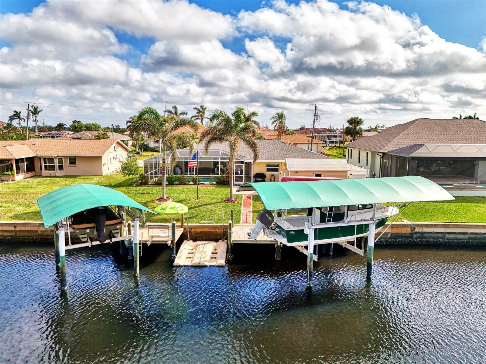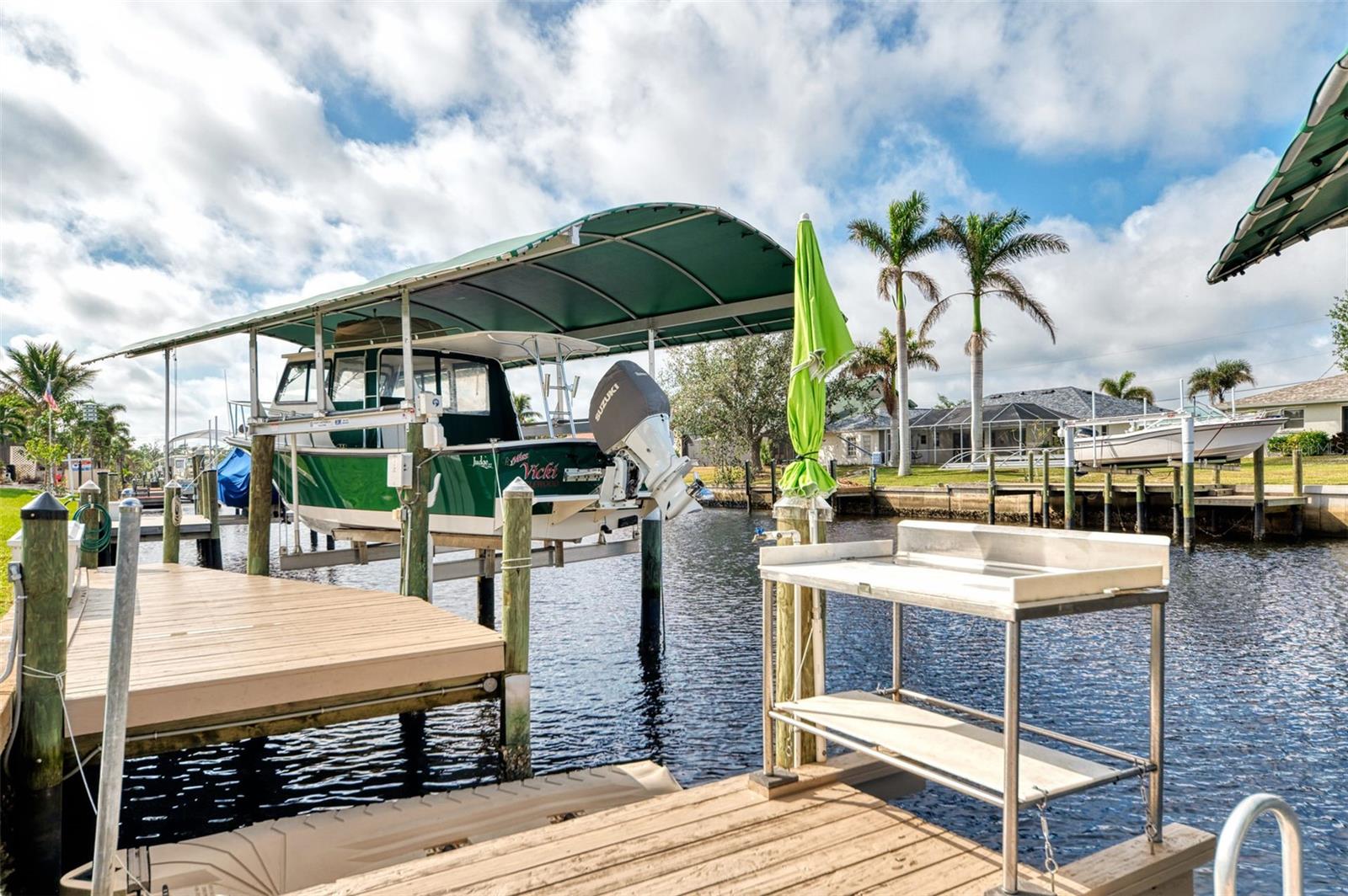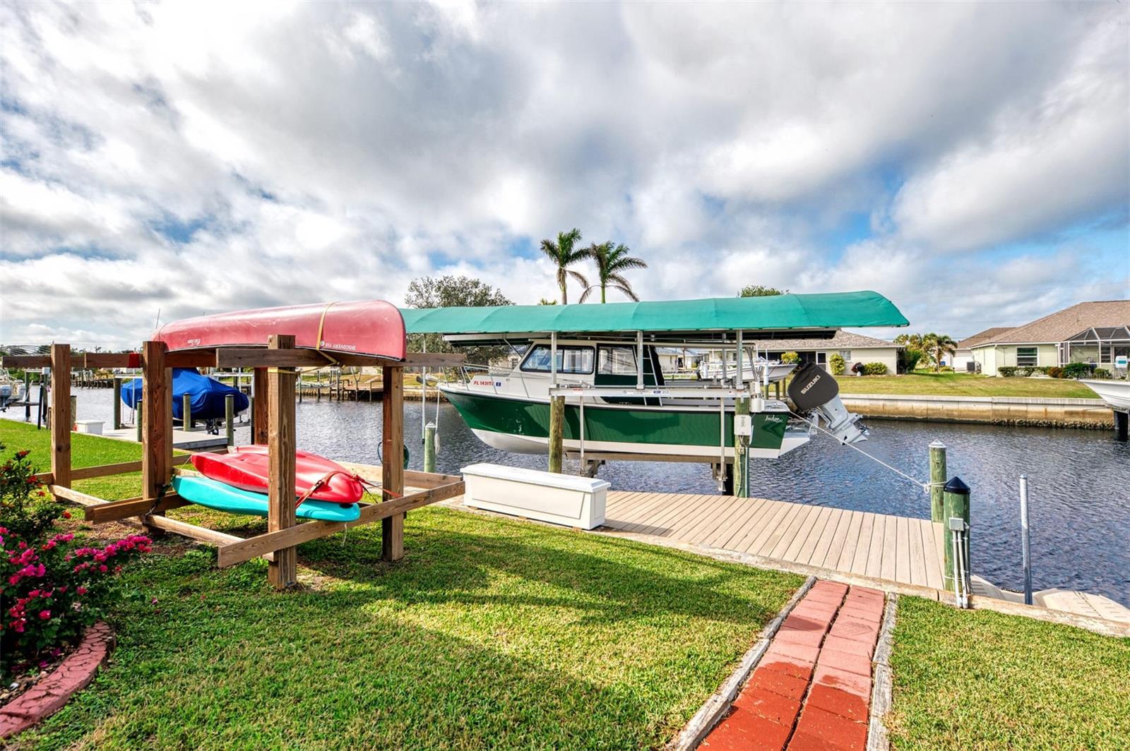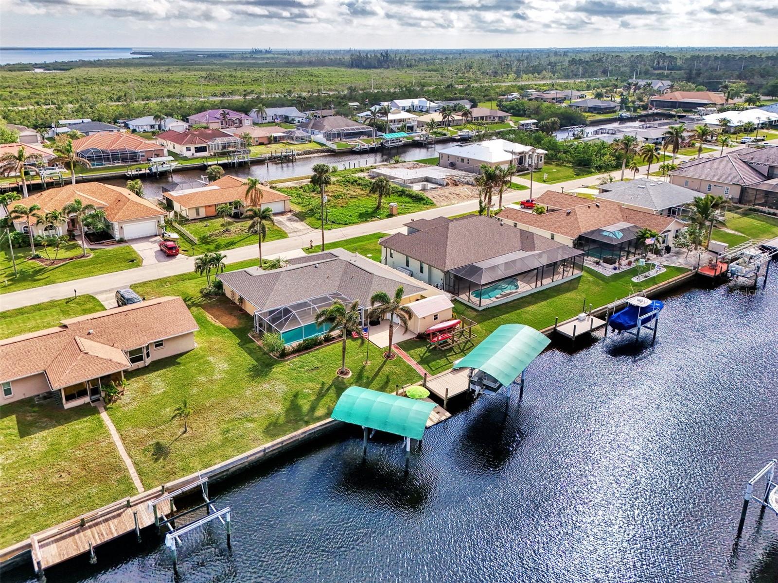 Welcome to 5231 Conner Terrace — a true boater’s paradise located in the quiet, desirable waterfront community of Gulf Cove. Just minutes from world-class fishing in the Myakka River, Charlotte Harbor, Boca Grande Pass, and the Gulf of Mexico, this impeccably maintained home offers the ultimate Florida lifestyle for water enthusiasts. Situated on a prime waterfront lot with 80 feet of concrete seawall, this 3-bedroom, 2-bath residence is packed with exceptional features. The property includes two expansive boat docks — the first with a 10’ x 30’ platform, 13’ x 35’ cover, a 12,000-pound boat lift, electric, water, remote control, and an 8-foot deck box for storage. The second dock measures 10’ x 16’ with a 13’ x 25’ cover, 6,000-pound lift, water, electric, and remote control. A double floating jet ski dock adds even more functionality, and a stainless steel/teflon fish cleaning station with running water and umbrella mount makes post-fishing cleanup comfortable and convenient. For paddle craft lovers, a pressure-treated storage rack holds kayaks, canoes, or jon boats for easy access to the water. Inside, you’ll find a thoughtfully updated interior featuring laminate and tile flooring throughout. The gourmet kitchen is ideal for entertaining, complete with granite countertops, solid wood cabinetry, a built-in wine cooler, and a bar sink. The home also includes a 10’ x 16’ utility shed with electricity, a concrete boat/trailer pad located in front of the garage, and a storm-rated tie-down system with four anchor points to secure your vessel during severe weather. Enjoy outdoor living year-round with a heated pool and spa enclosed in a spacious lanai. The pool cage and screens were replaced and repaired in December 2022. A dedicated dog run adds convenience for pet owners. Built with durability and safety in mind, the home features impact-resistant windows and a hurricane-rated garage door with remote control. Best of all, this property has never experienced flooding even during Hurricanes Ian, Helene, or Milton. With its unbeatable combination of location, features, and lifestyle, 5231 Conner Terrace is a rare opportunity to own a true waterfront gem. Schedule your private showing today!