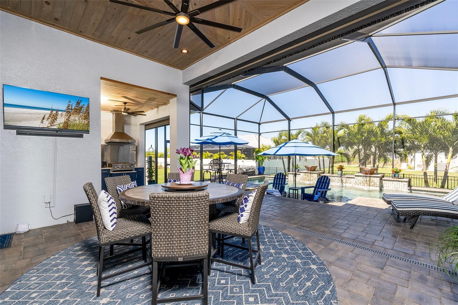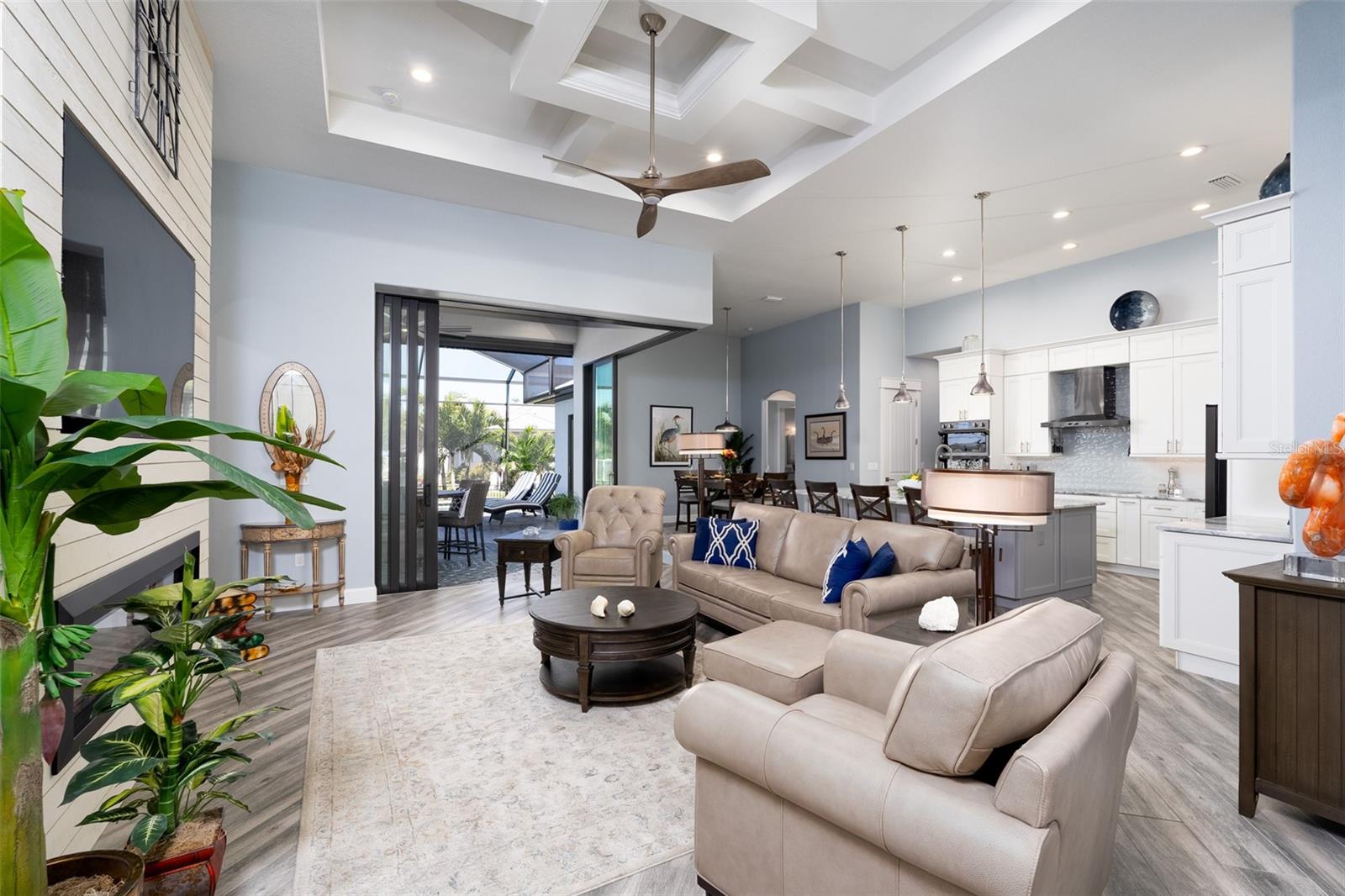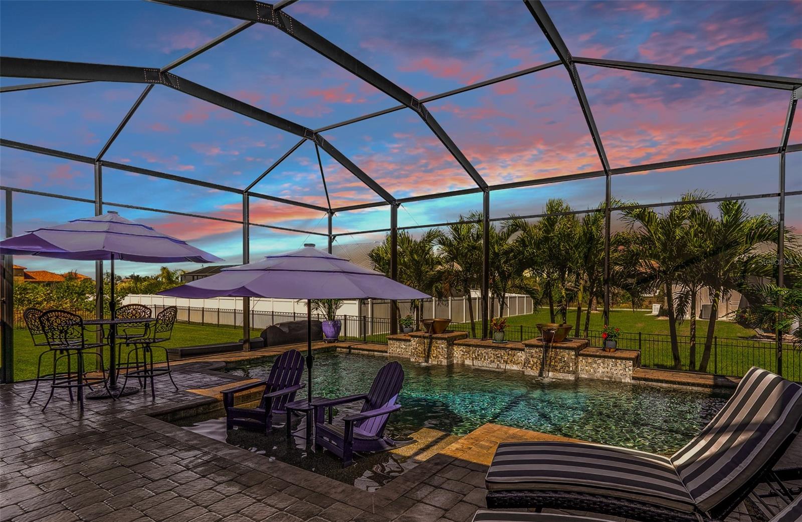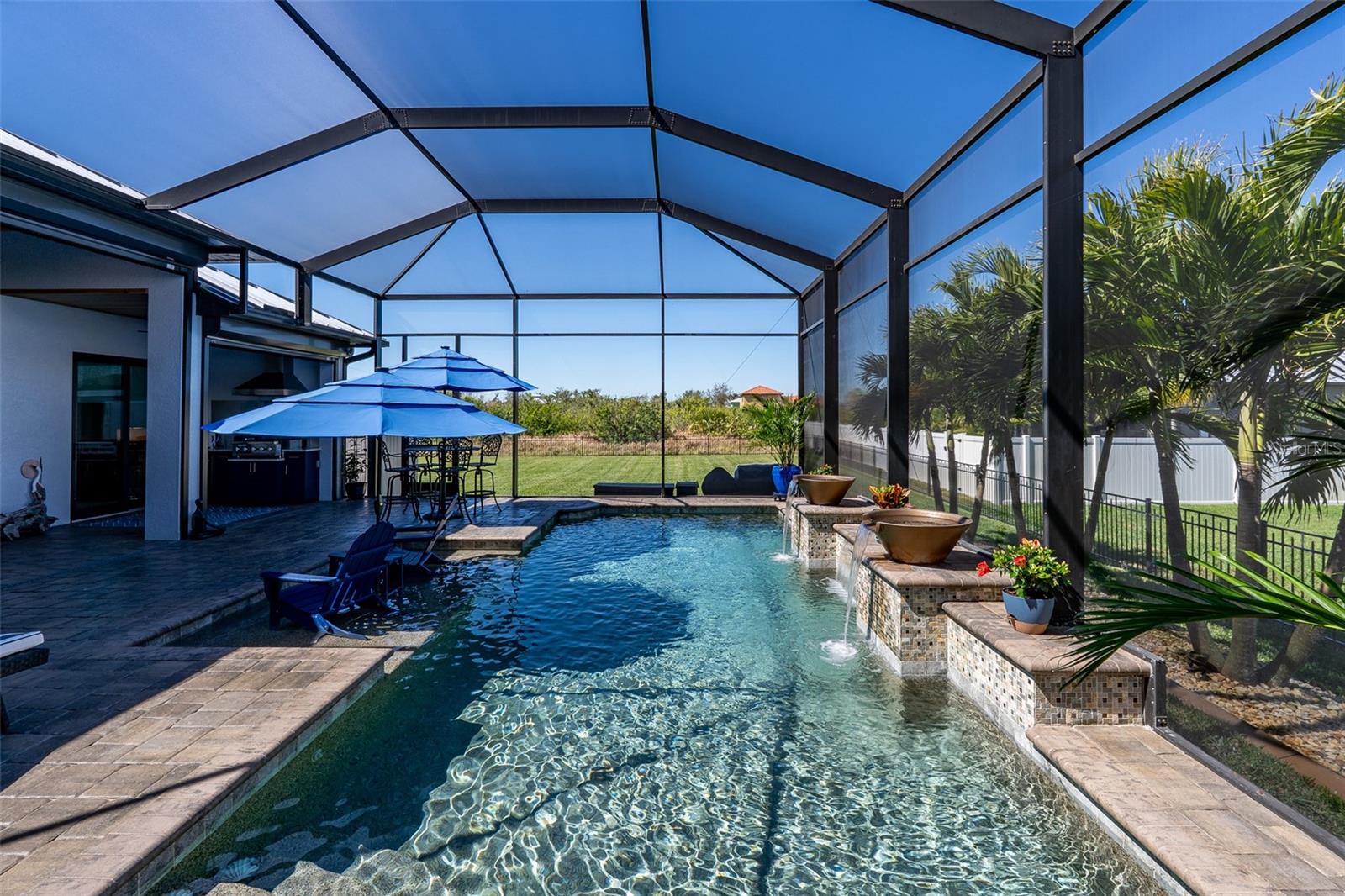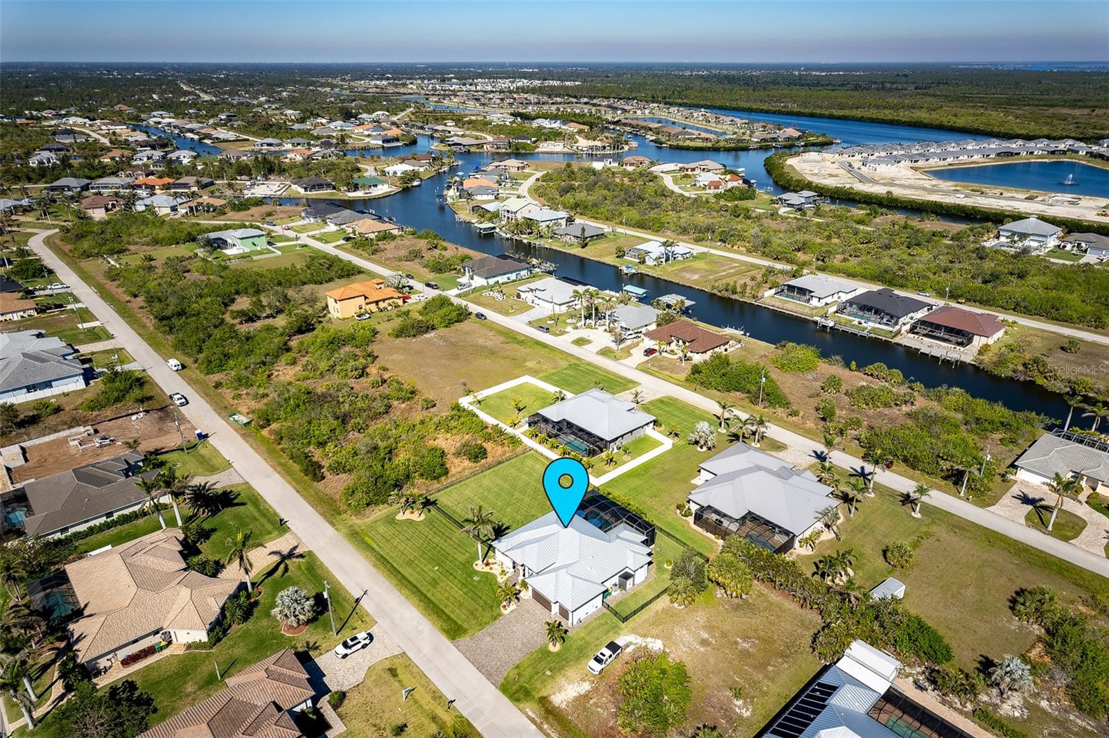 Welcome to this EXQUISITE CUSTOM home, a true masterpiece of DESIGN and LUXURY! Nestled in the prestigious South Gulf Cove community just a short distance from Boca Grande, this nearly half-acre estate offers the perfect blend of sophistication and security. This upgraded home boasts over 3500 square feet of meticulously crafted indoor and outdoor living spaces, and features a NEW 2023 Standing Seam Metal Roof, High Impact Windows Doors and Sliders, Cypress Wood Lanai Ceilings and wrought-iron fenced backyard. From the moment you arrive, you'll appreciate the superior presentation and character of the property. As you enter the double front doors, you'll notice Coffered Ceilings, 10' ZERO CORNER Sliders, Crown moulding and extensive woodwork, 8' Interior Doors and Porcelain tile flooring throughout. The Home Office with french doors offers executive workspace and privacy. At the heart of the home is the GOURMET kitchen with GRANDE CENTER ISLAND built with full depth cabinetry on BOTH sides to gain maximum storage and functionality, and the modern farmhouse-style sink and sleek hardware perfectly complement the space. The 42" Upper Cabinets with dove-tail and soft-close elements are topped with another row of cabinets for additional storage. Equipped with a Black Stainless Refrigerator, Built-In Wall Oven and Convection Microwave, Dishwasher (new '24) and Induction Cooktop, this kitchen is built for both everyday living and entertaining. Deluxe Cambria Quartz countertops and glass tile backsplash set the tone for the exceptional beauty throughout the home, while over and under-cabinet lighting adds a touch of ambiance. The Great Room is designed for effortless entertaining, featuring a cozy fireplace, wall mount TV and Shiplap surround that exudes elegance and charm. Coffered ceilings elevate the room’s sophistication, while 10-foot tall sliding doors create a seamless flow between the indoor and outdoor spaces. Step outside where you’ll see the Cypress Wood Ceiling design, a visually striking feature and conversation piece. The commercial-grade OUDOOR KITCHEN features a stainless steel backsplash, vent hood, built-in fridge, and wall mount TV. You'll also appreciate the convenience of Kevlar Electric Roll Down Hurricane protection on the Lanai which allows you to leave outdoor furnishings in place. The Primary Bedroom has Sliders and a Transom window, Tray Ceiling with Fan and elegant En Suite with separate Vanities, a free-standing Tub, Roman walk-through Shower, Ambient Lighting and separate Water Closet. The Large Walk-In Closet is outfitted with California-style Built-Ins and flows straight to the Laundry Room for your convenience. Two Guest Rooms with finished Walk-In closets and ceiling fans share a Bath with Tiled Shower, Linen Closet, and Pool Access. The backyard OASIS features a crystal blue HEATED swimming pool with two cascading waterfall Feature Bowls, Sun shelf and Lighting for a mood-enhancing atmosphere. The paver deck and outdoor patio provide lovely spaces for relaxation and entertainment, while the screen enclosure ensures comfort year-round. Your 3 CAR GARAGE offers insulated 8' doors, overhead storage, epoxy floor, metal storage cabinets, service door and exterior storage cabinets. The resort-like landscaping and lighting distinguish this property as a SHOWSTOPPER! Don’t miss your chance to make this UNIQUE property yours!