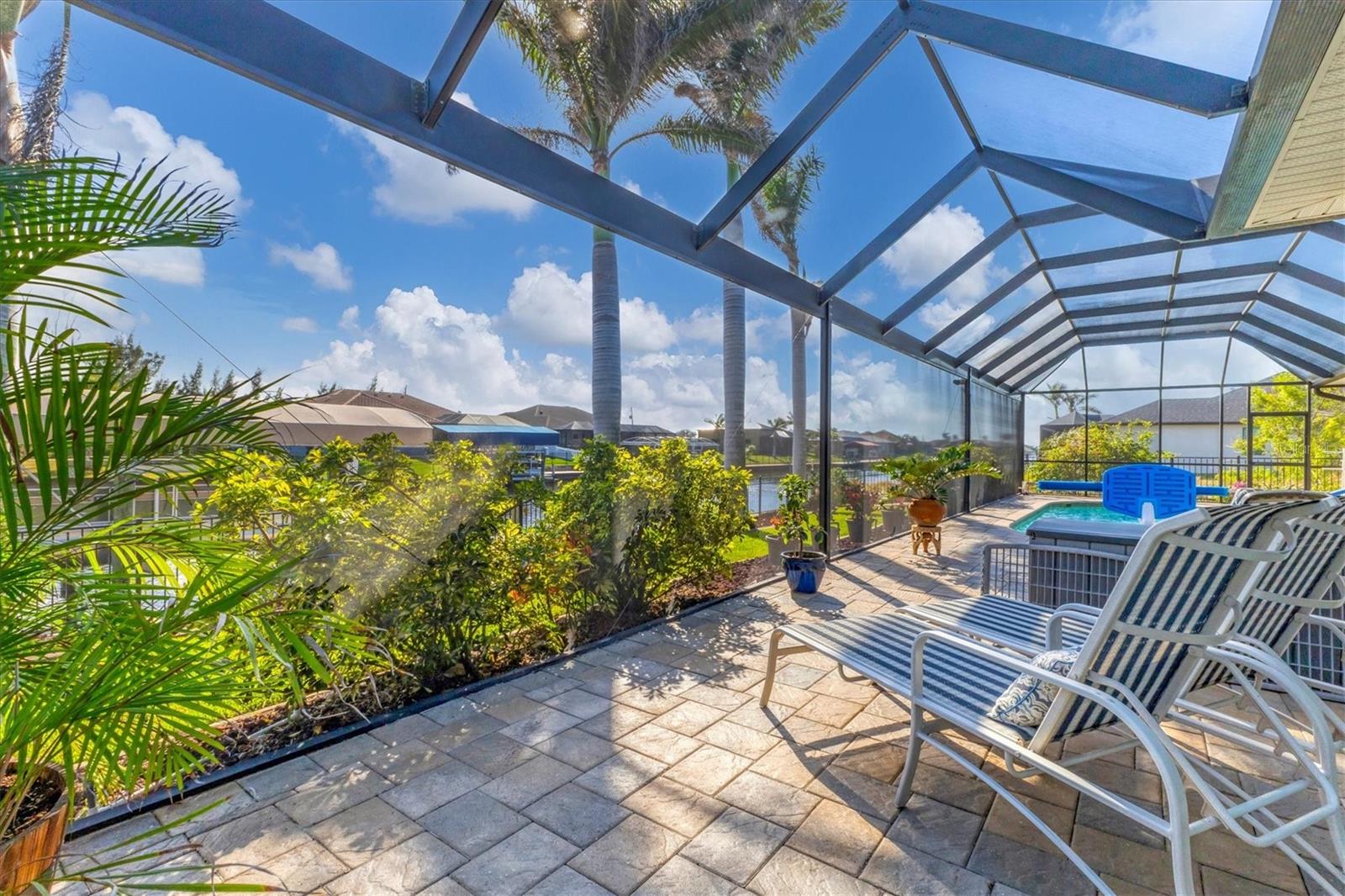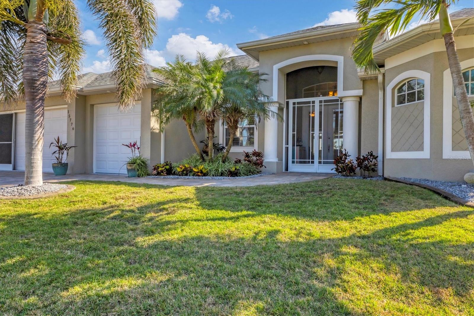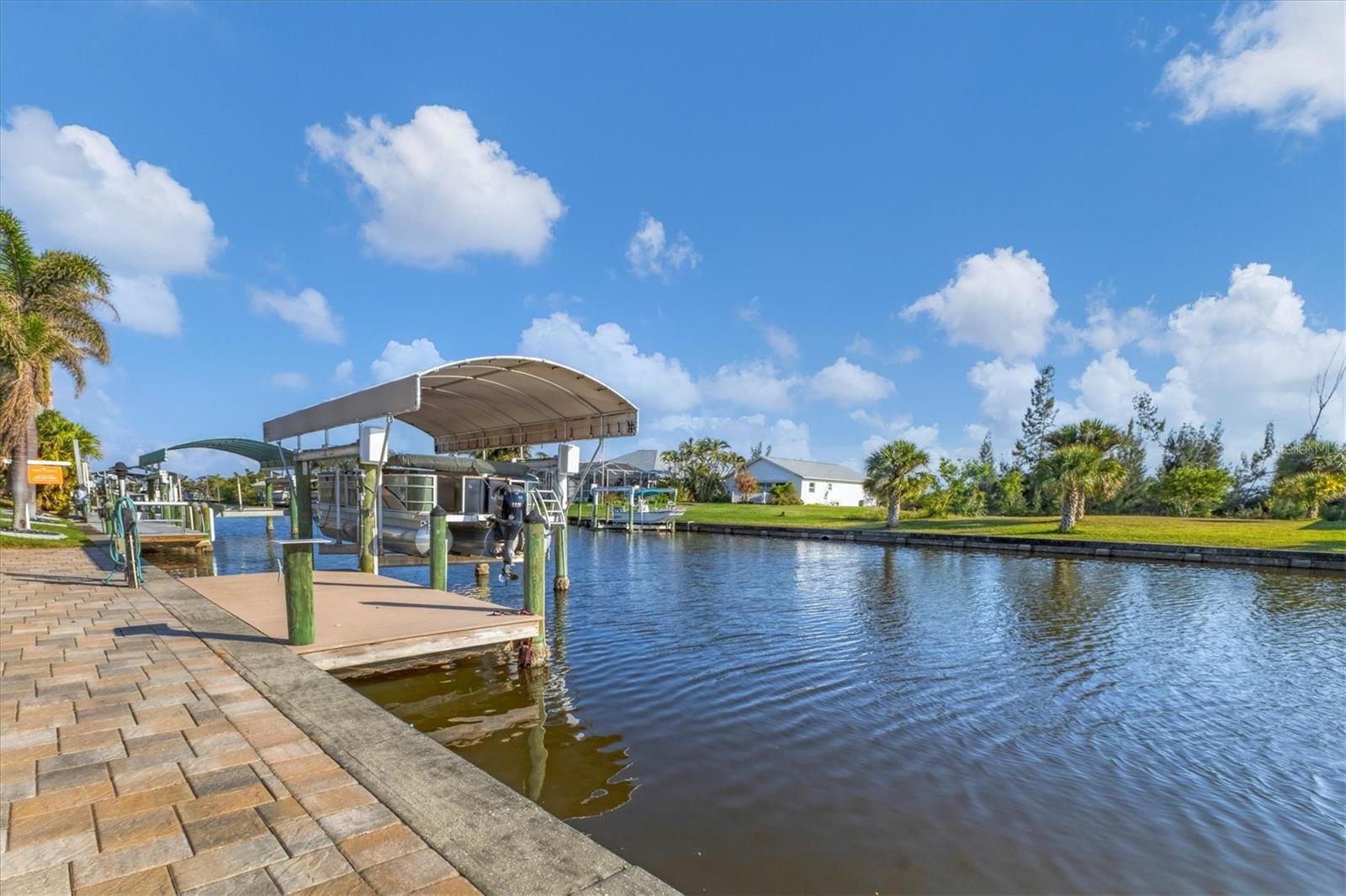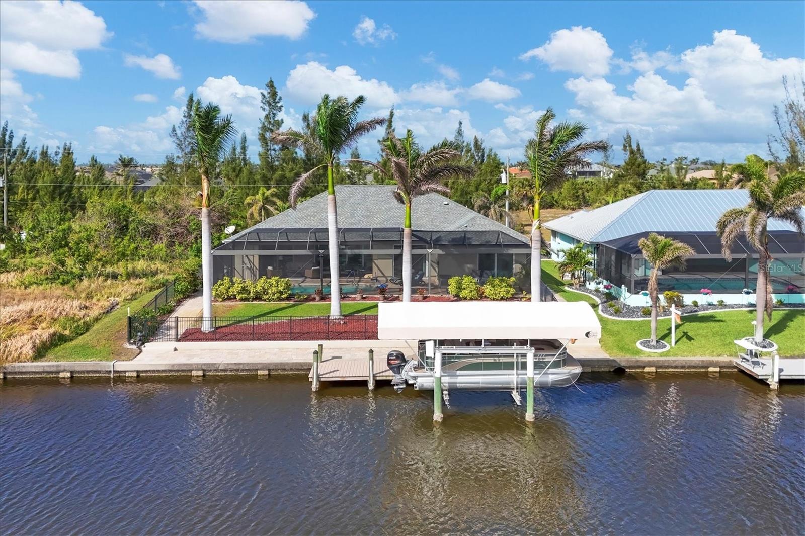 Discover this stunning 3-bedroom, 2-bathroom pool home with a den in the sought-after South Gulf Cove community. Boasting Southern exposure on a canal, this home offers breathtaking waterfront views and quick Gulf access with a Trex dock, 10,000 lb covered boat lift, seawall, and water/electric hookups. Step inside to find luxury vinyl flooring throughout, 8’ doors, and hurricane impact windows and doors. The living room features tray ceilings with lighting, crown molding, an elegant built-in wall accent, an electric fireplace, and expansive zero-corner sliders, seamlessly blending indoor and outdoor living. The gourmet kitchen is a chef’s dream, complete with a breakfast bar, stainless steel appliances, a stunning tile backsplash, solid wood cabinets with under-cabinet lighting, a closet pantry, granite countertops, and a dedicated coffee/wet bar. The primary suite is a private retreat with lanai access, his-and-her walk-in closets, and a luxurious en-suite bath featuring dual sinks and a large walk-in tile shower with a bench and dual shower heads. The split-bedroom floor plan ensures privacy, with spacious guest bedrooms featuring plantation shutters and a guest bath that provides direct pool access. The den/home office includes dual built-in desks for convenience. Additional interior highlights include stylish ceiling fans in every room, a central vacuum system, a fully equipped laundry room with a sink and cabinets, and wiring for a security system. The 3-car garage is a standout, offering epoxy flooring, a 2024 garage door, a screen door for two bays, and built-in cabinetry. The outdoor oasis features an oversized paver driveway and walkways, mature landscaping with Royal Palms, and a screened front entry leading to the elegant double doors. The heated saltwater pool is surrounded by a spacious lanai with panoramic screens for unobstructed water views, an outdoor shower, a sink and refrigerator, and a fully fenced, irrigated backyard. The lanai was rescreened in 2023, and the home boasts a new 2023 roof and a hurricane shutter for added protection. This waterfront gem offers the ultimate Florida lifestyle—luxury, comfort, and direct boating access to the Gulf. Don’t miss your chance to own this exceptional home!