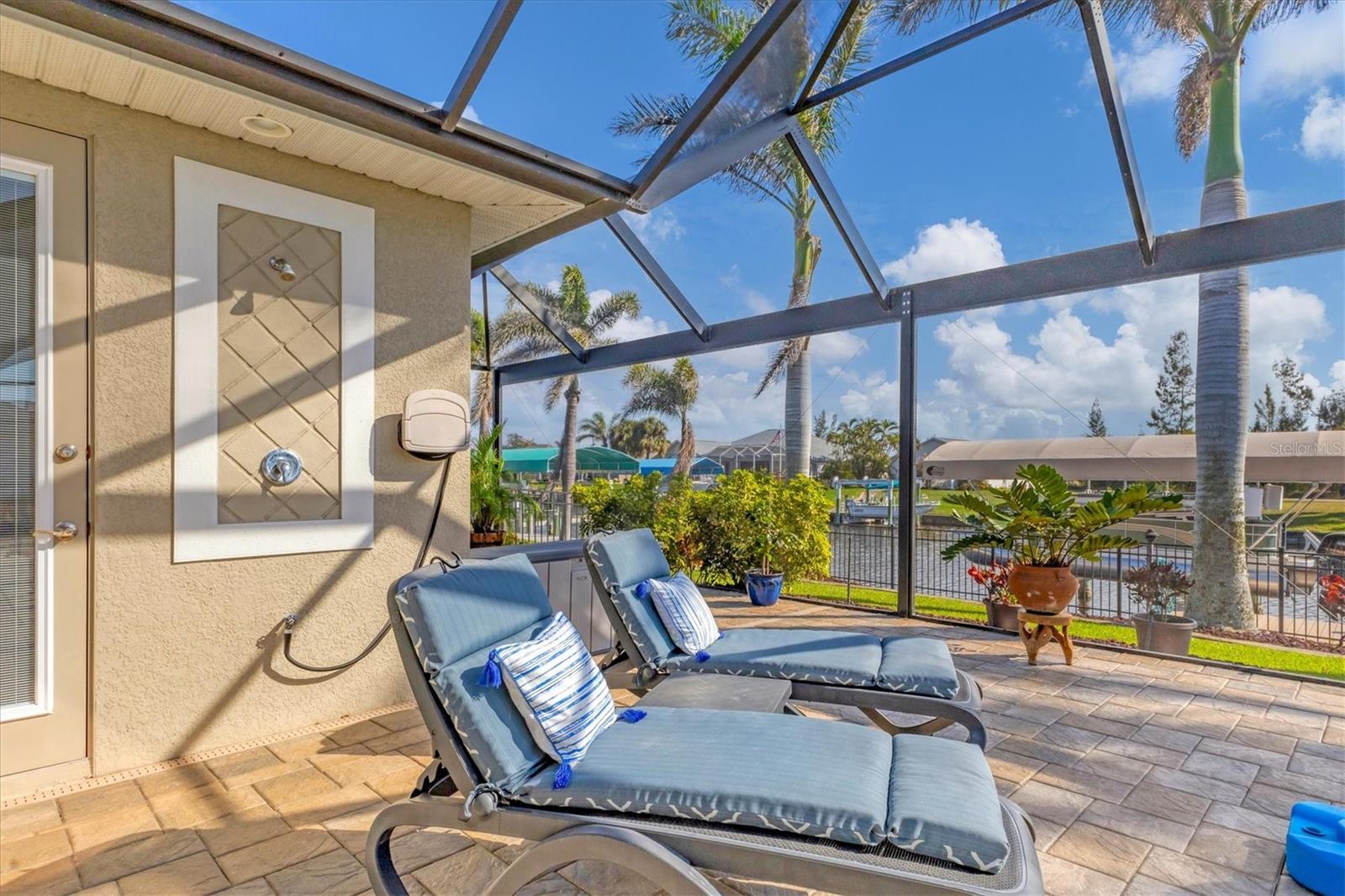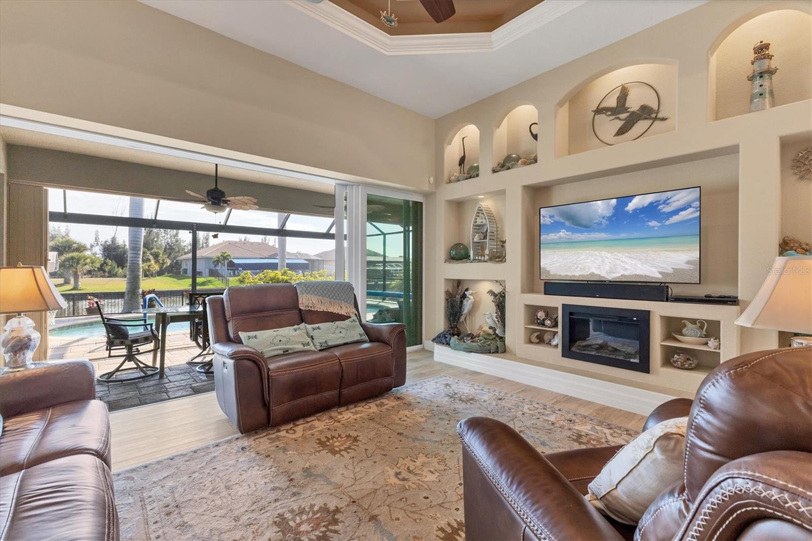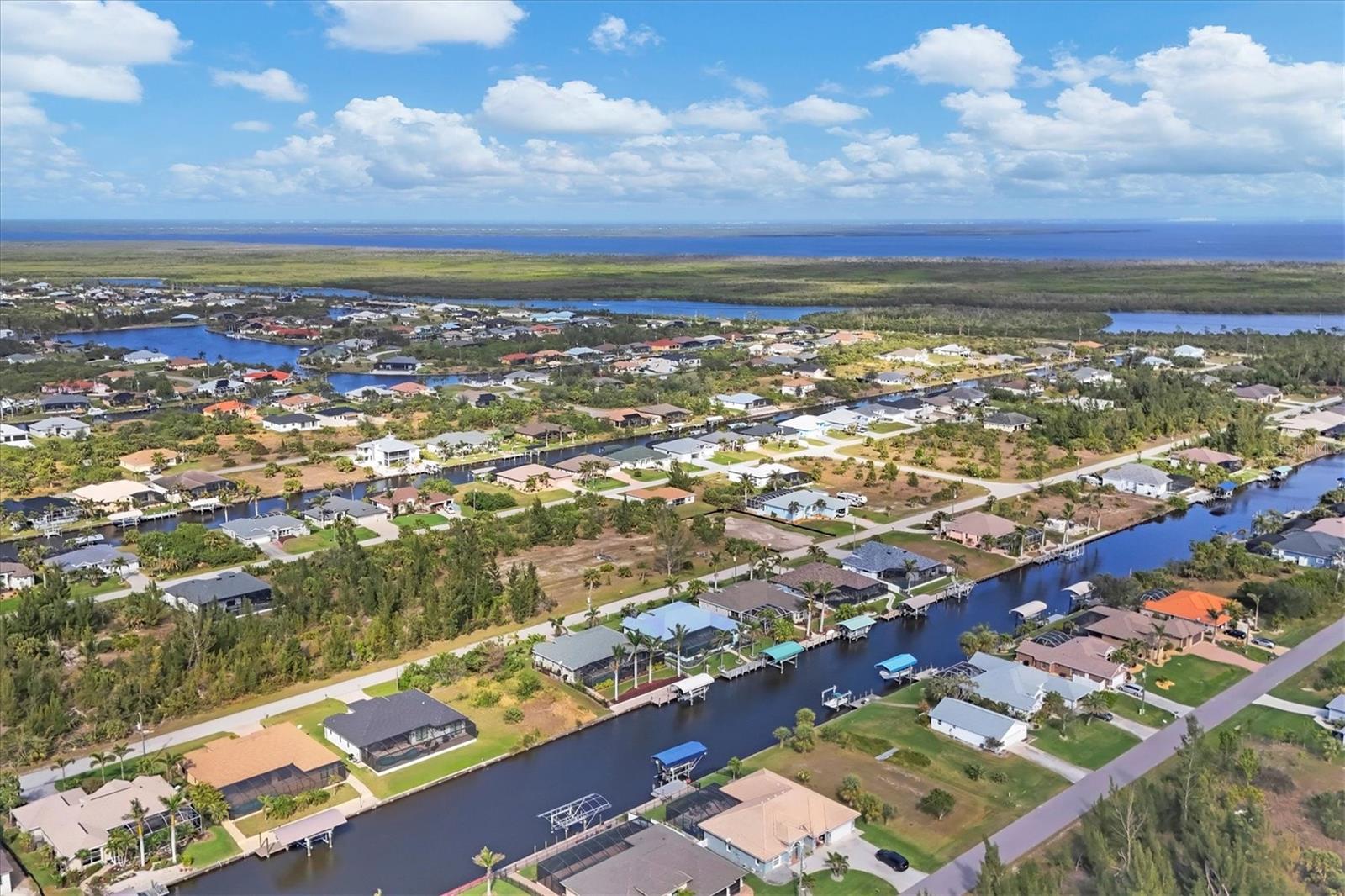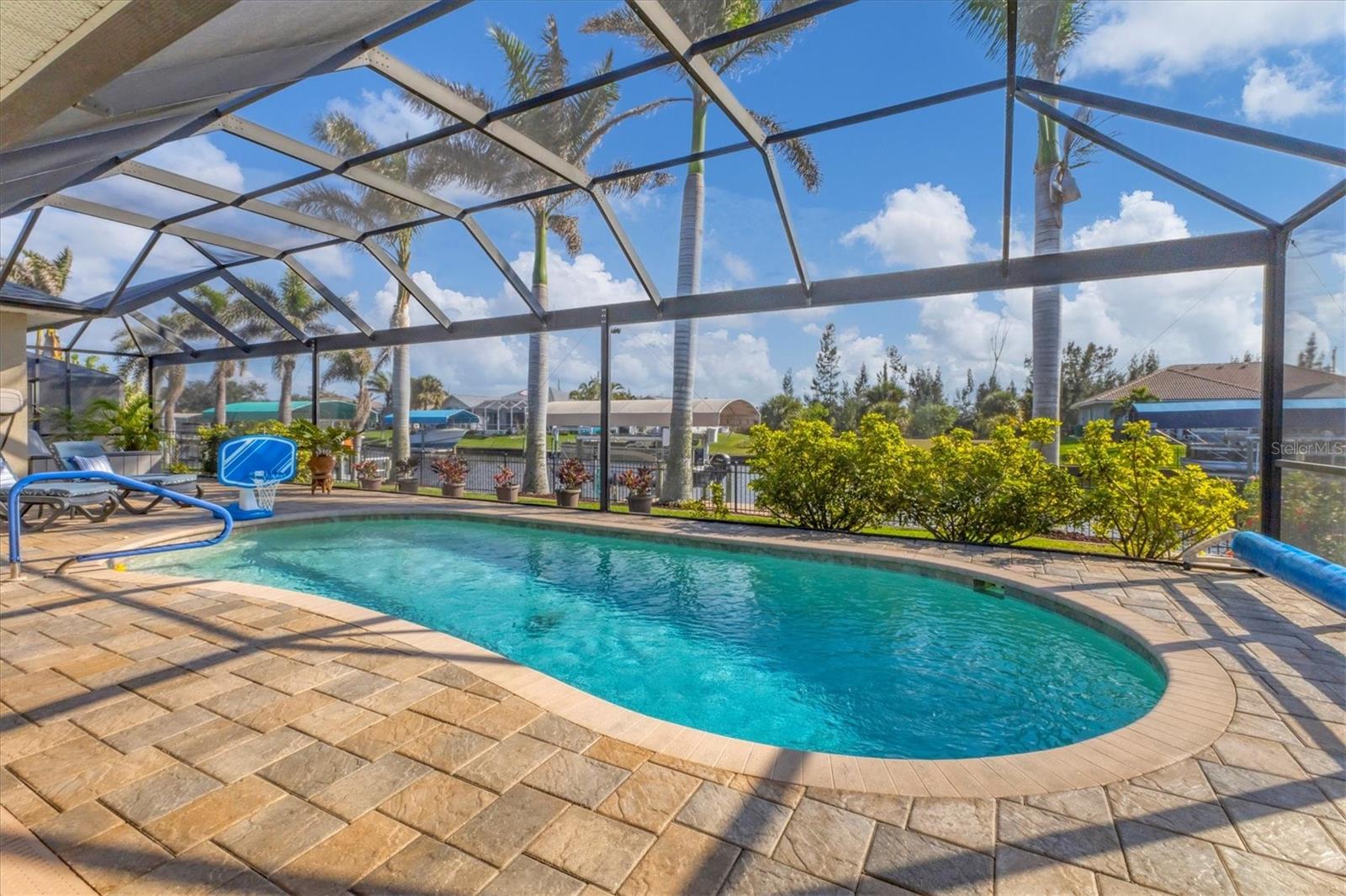 Discover this stunning 3-bedroom, 2-bathroom pool home with a den in the sought-after South Gulf Cove community. Boasting Southern exposure on a canal, this home offers breathtaking waterfront views and quick Gulf access with a Trex dock, 10,000 lb covered boat lift, seawall, and water/electric hookups. Step inside to find luxury vinyl flooring throughout, 8’ doors, and hurricane impact windows and doors. The living room features tray ceilings with lighting, crown molding, an elegant built-in wall accent, an electric fireplace, and expansive zero-corner sliders, seamlessly blending indoor and outdoor living. The gourmet kitchen is a chef’s dream, complete with a breakfast bar, stainless steel appliances, a stunning tile backsplash, solid wood cabinets with under-cabinet lighting, a closet pantry, granite countertops, and a dedicated coffee/wet bar. The primary suite is a private retreat with lanai access, his-and-her walk-in closets, and a luxurious en-suite bath featuring dual sinks and a large walk-in tile shower with a bench and dual shower heads. The split-bedroom floor plan ensures privacy, with spacious guest bedrooms featuring plantation shutters and a guest bath that provides direct pool access. The den/home office includes dual built-in desks for convenience. Additional interior highlights include stylish ceiling fans in every room, a central vacuum system, a fully equipped laundry room with a sink and cabinets, and wiring for a security system. The 3-car garage is a standout, offering epoxy flooring, a 2024 garage door, a screen door for two bays, and built-in cabinetry. The outdoor oasis features an oversized paver driveway and walkways, mature landscaping with Royal Palms, and a screened front entry leading to the elegant double doors. The heated saltwater pool is surrounded by a spacious lanai with panoramic screens for unobstructed water views, an outdoor shower, a sink and refrigerator, and a fully fenced, irrigated backyard. The lanai was rescreened in 2023, and the home boasts a new 2023 roof and a hurricane shutter for added protection. This waterfront gem offers the ultimate Florida lifestyle—luxury, comfort, and direct boating access to the Gulf. Don’t miss your chance to own this exceptional home!