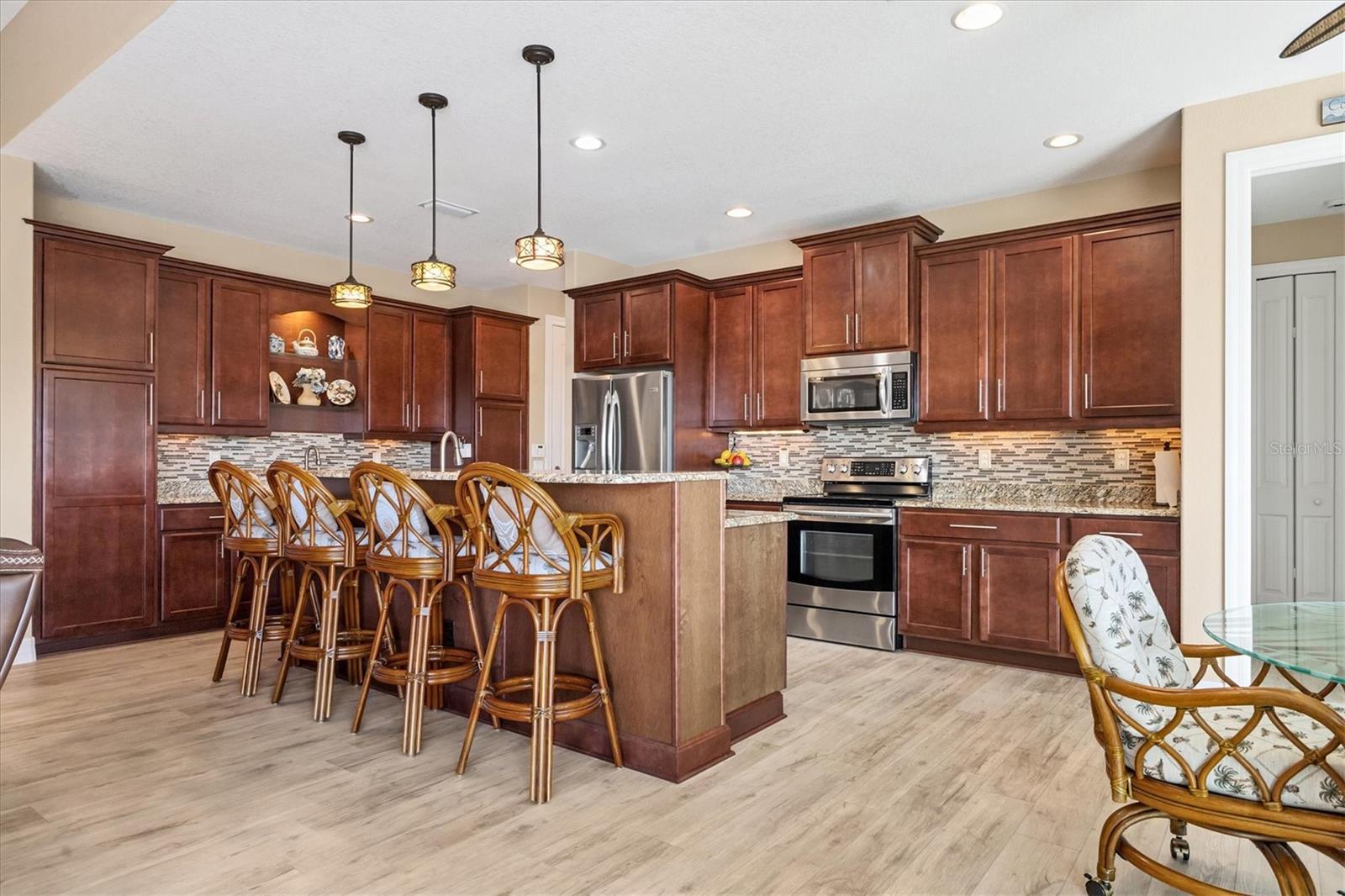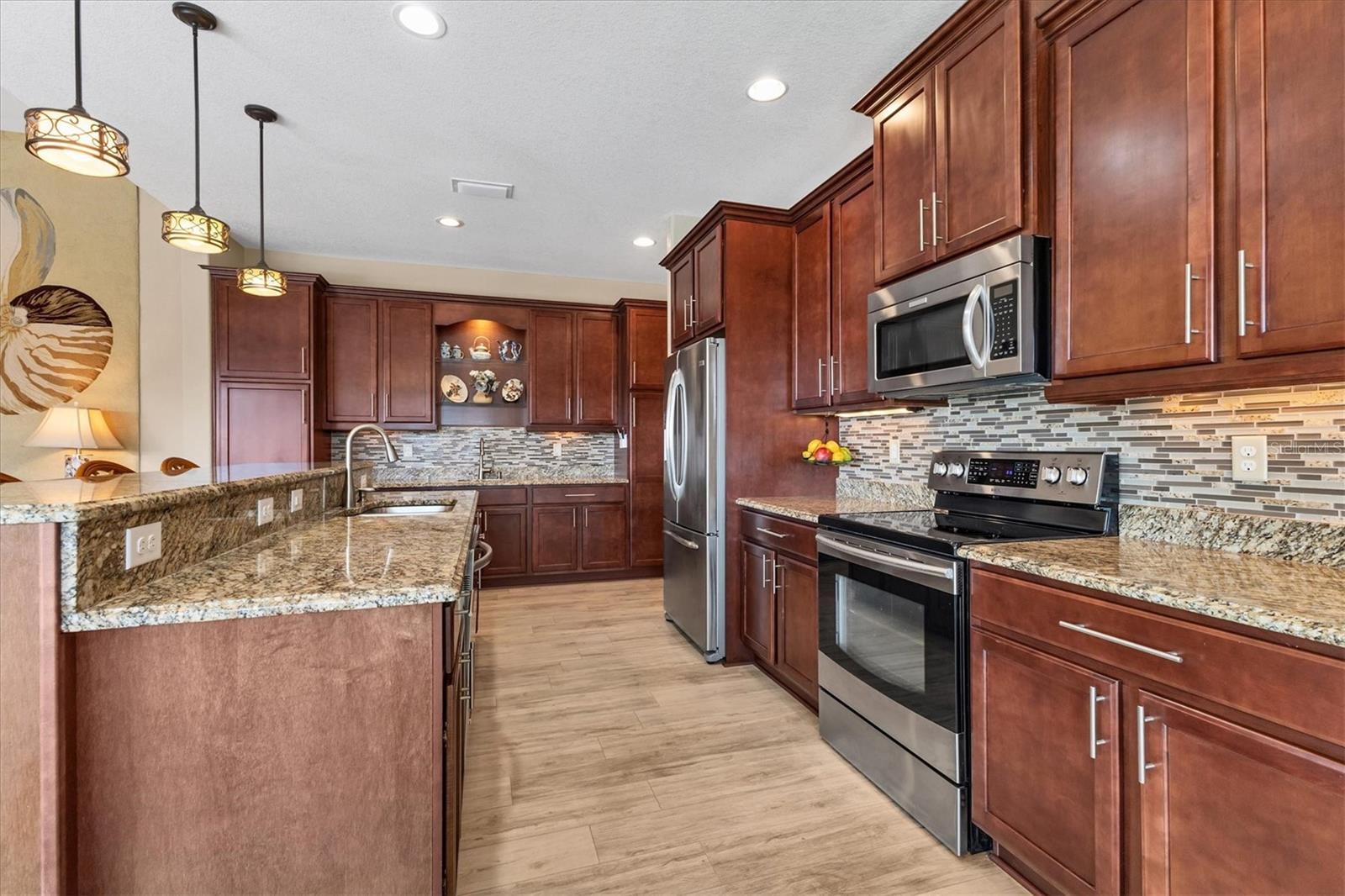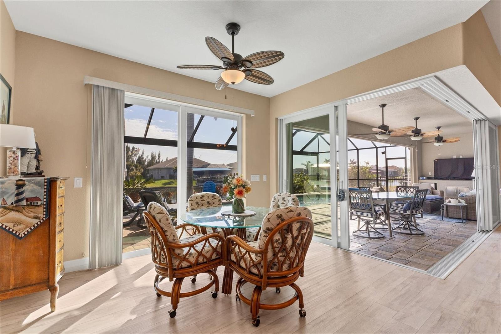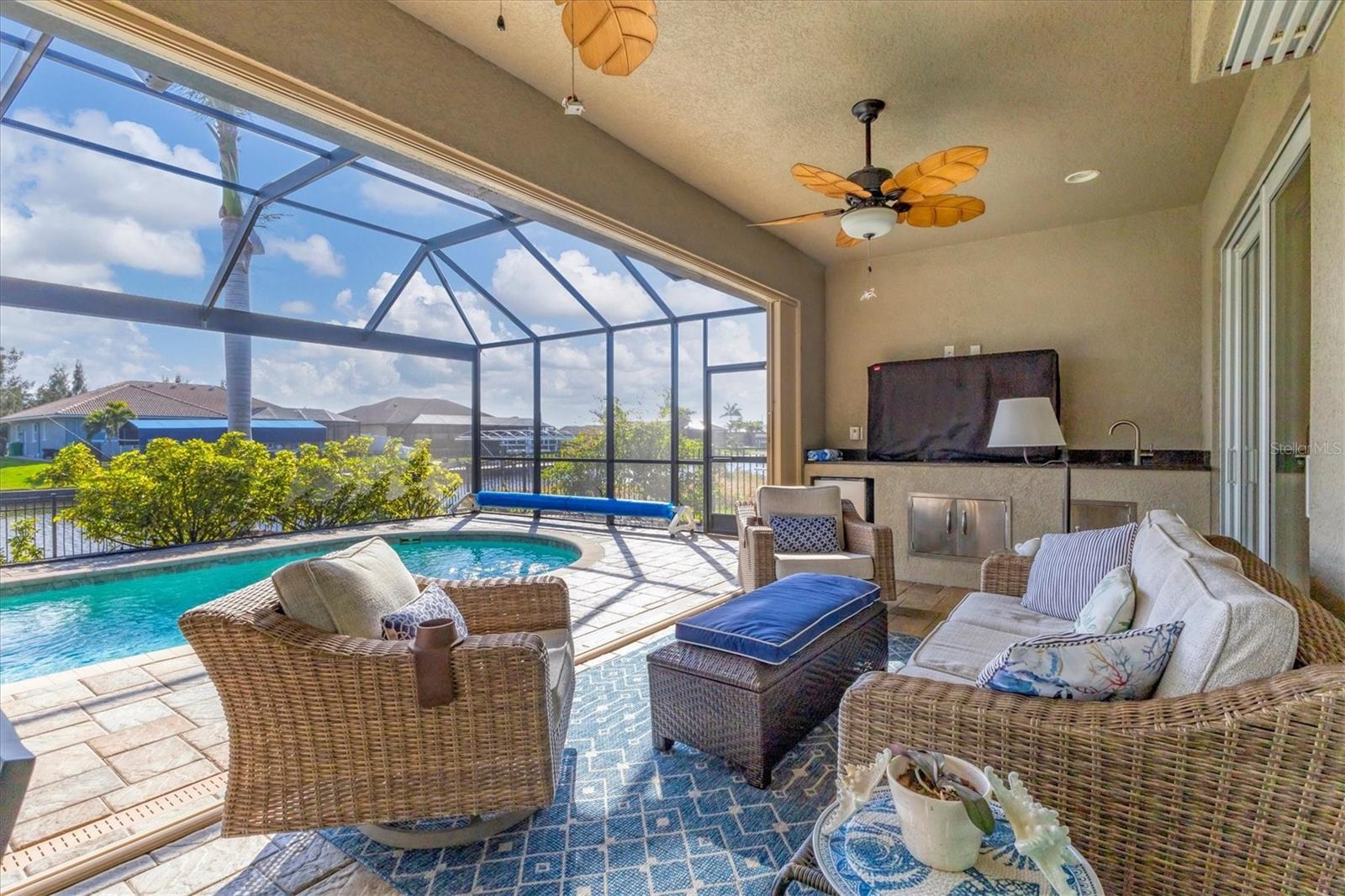 Discover this stunning 3-bedroom, 2-bathroom pool home with a den in the sought-after South Gulf Cove community. Boasting Southern exposure on a canal, this home offers breathtaking waterfront views and quick Gulf access with a Trex dock, 10,000 lb covered boat lift, seawall, and water/electric hookups. Step inside to find luxury vinyl flooring throughout, 8’ doors, and hurricane impact windows and doors. The living room features tray ceilings with lighting, crown molding, an elegant built-in wall accent, an electric fireplace, and expansive zero-corner sliders, seamlessly blending indoor and outdoor living. The gourmet kitchen is a chef’s dream, complete with a breakfast bar, stainless steel appliances, a stunning tile backsplash, solid wood cabinets with under-cabinet lighting, a closet pantry, granite countertops, and a dedicated coffee/wet bar. The primary suite is a private retreat with lanai access, his-and-her walk-in closets, and a luxurious en-suite bath featuring dual sinks and a large walk-in tile shower with a bench and dual shower heads. The split-bedroom floor plan ensures privacy, with spacious guest bedrooms featuring plantation shutters and a guest bath that provides direct pool access. The den/home office includes dual built-in desks for convenience. Additional interior highlights include stylish ceiling fans in every room, a central vacuum system, a fully equipped laundry room with a sink and cabinets, and wiring for a security system. The 3-car garage is a standout, offering epoxy flooring, a 2024 garage door, a screen door for two bays, and built-in cabinetry. The outdoor oasis features an oversized paver driveway and walkways, mature landscaping with Royal Palms, and a screened front entry leading to the elegant double doors. The heated saltwater pool is surrounded by a spacious lanai with panoramic screens for unobstructed water views, an outdoor shower, a sink and refrigerator, and a fully fenced, irrigated backyard. The lanai was rescreened in 2023, and the home boasts a new 2023 roof and a hurricane shutter for added protection. This waterfront gem offers the ultimate Florida lifestyle—luxury, comfort, and direct boating access to the Gulf. Don’t miss your chance to own this exceptional home!