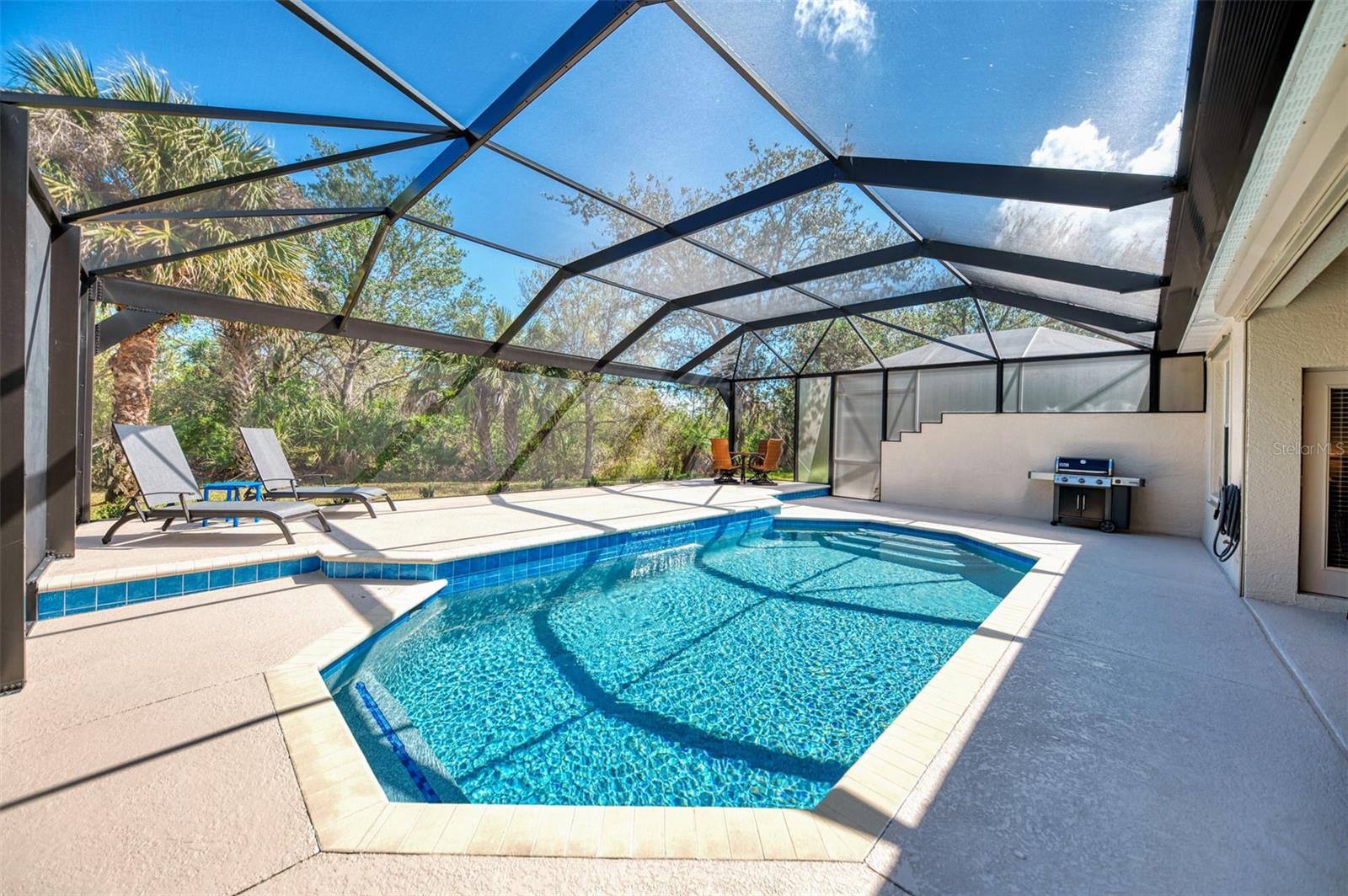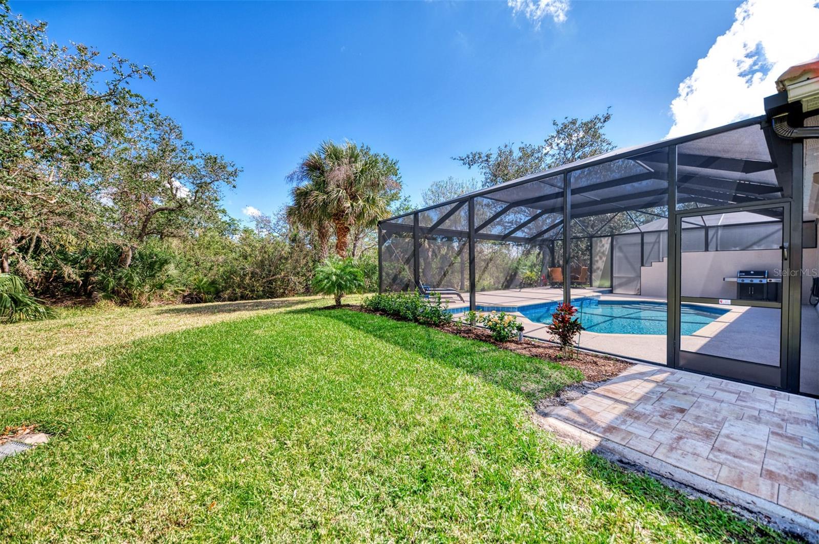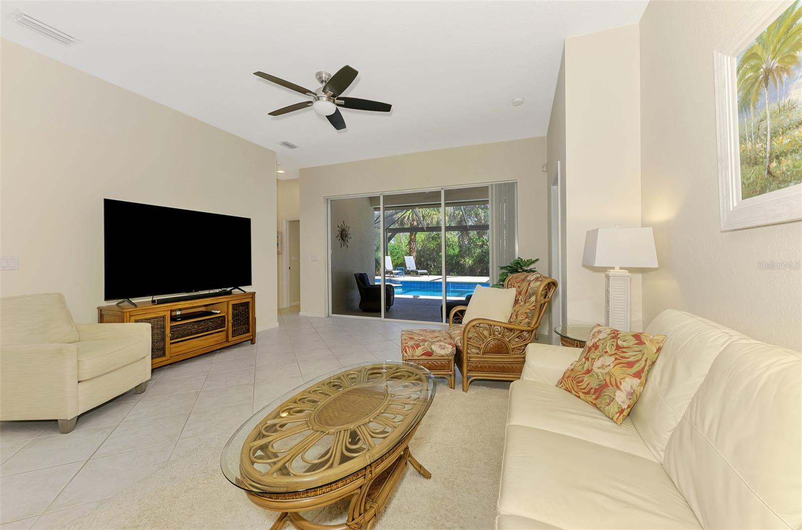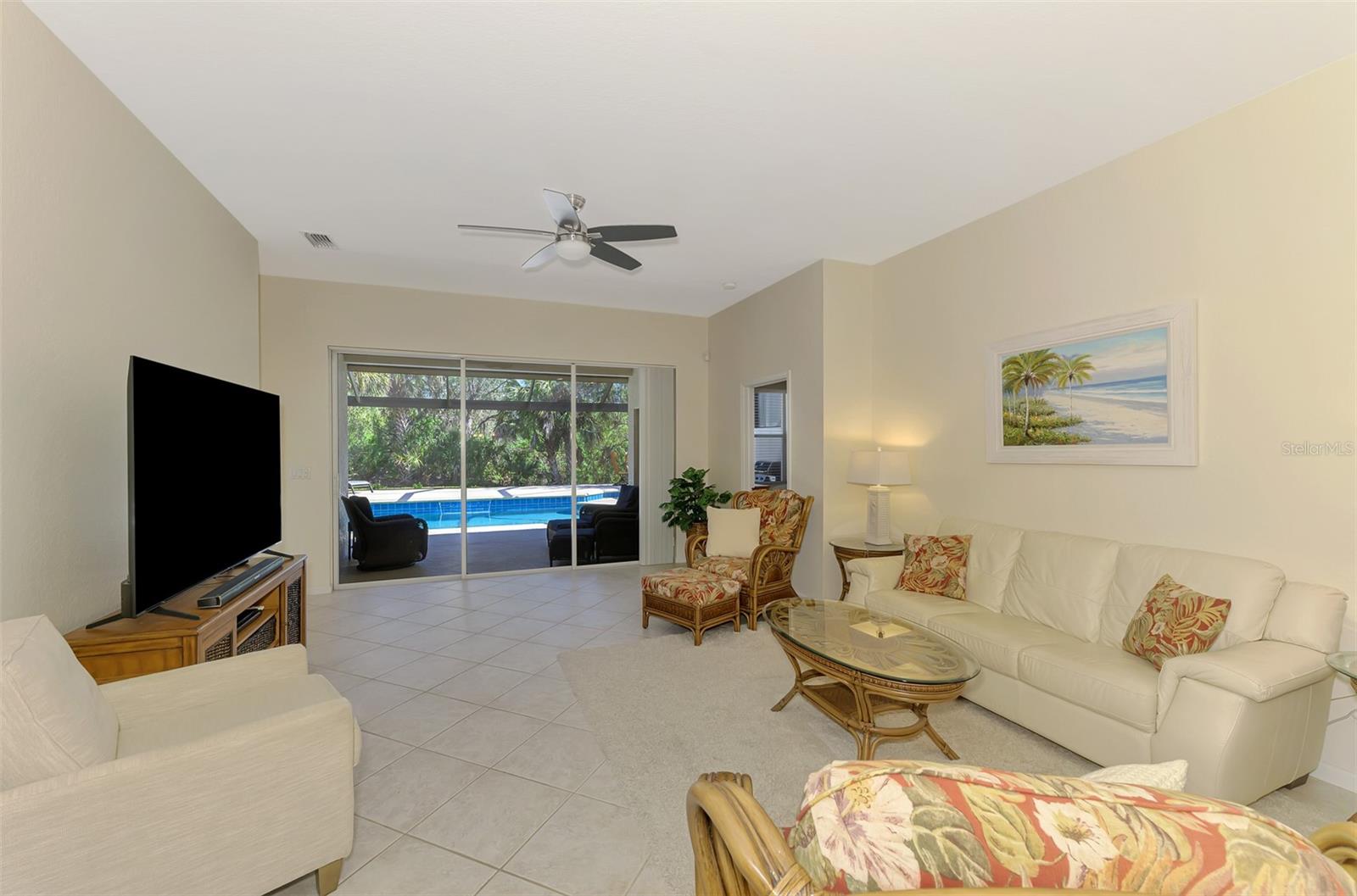 Welcome home to your Florida Oasis at this Meticulous, Beautiful 2 Bedroom, Plus Den, 2 Bathroom SALT WATER POOL VILLA in the gorgeous Riverwood gated golf community. This thoughtfully designed and desired “POINCIANA” FLOOR PLAN offers a Spacious Open Interior, the Privacy of a split bedroom plan, and is set on a deep lot (.22 Acres) surrounded by a tranquil preserve, the ultimate in privacy. The Pool Area is a True Gem, Showcasing a sparkling and COMPLETELY RENOVATED POOL, New DECK & expanded CAGE in 2024, highlighting a Pebbletec® pool surface, new coping stones, waterline tile, LED multi-color Pool Light, and 4’ sheer descent Waterfall. The pool cage is brand new including full view picture window (40’) and the deck has been completely re-surfaced & double-coat stained. The Pool Deck includes an elevated and roomy (10’x40’) SUN DECK. You’ll appreciate this home’s many other features and updates…A Spacious Open Kitchen: Wood Cabinets with crown, ample Granite Countertop workspace, updated Stainless Steel fridge, microwave, dishwasher slide-in range. Favored Ceramic tile flooring on diagonal in living areas. Window Blinds Throughout. Walk-In Closets and NEW (2023) upgraded carpeting in Both Bedrooms. Primary Bedroom offers an En Suite Bathroom boasting a REMODELED WALK-IN SHOWER & TUB. Roof Cleaned & Sealed (2024). Exterior Repainted (2024) and Interior Ceilings and Walls Repainted. Updated ceiling fans in master bath, lanai and garage. NEW (2022) Garage Floor Epoxy Flake Surfacing. Storm/Screen Door at Front Entry. Rain Gutters/Downspouts. ELECTRIC ROLL DOWN Hurricane Screen at Lanai & Clear Hurricane Panels at Windows. Nothing left to do but live the Florida Lifestyle at Riverwood: 1300 acres, gated, golf, resort style community. NEW RESORT STYLE & LAP POOL. SEPARATE FITNESS CENTER, PICKLEBALL COURTS, NEW SMALL AND LARGE DOG PARKS! Enjoy all that Riverwood has to offer in our lush tree lined streets, renovated activity center with all the social activities offered, 6 Har-Tru tennis courts, croquet court. An Audubon Green Community Award Winner for its natural habitat for Florida Wildlife. Optional amenities: Dog Park, Riverwood Golf Club, Par 72 Championship course & Beach Club on Manasota Key. Close to boating, cultural events, dining, shopping & beautiful beaches of SW FL. Located between Sarasota & Ft Myers on Florida’s West Coast in Paradise!