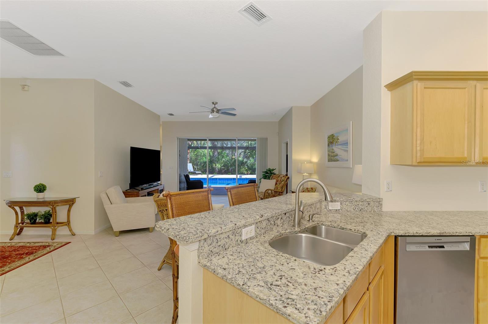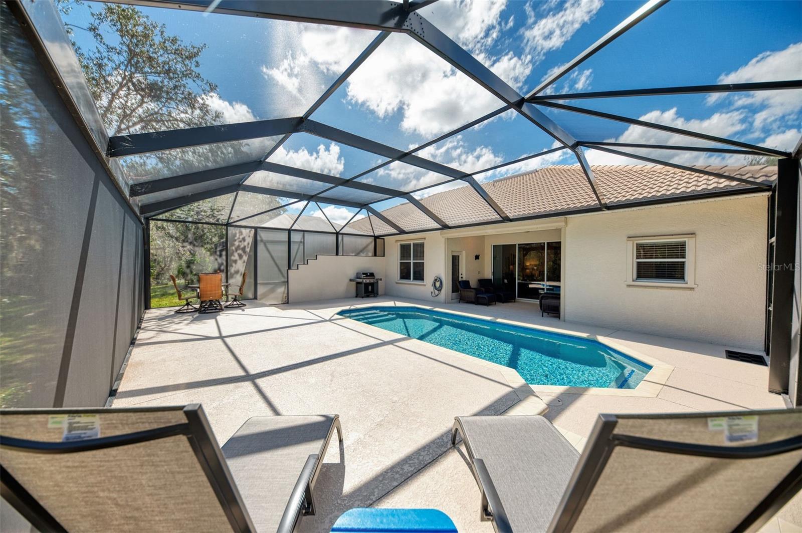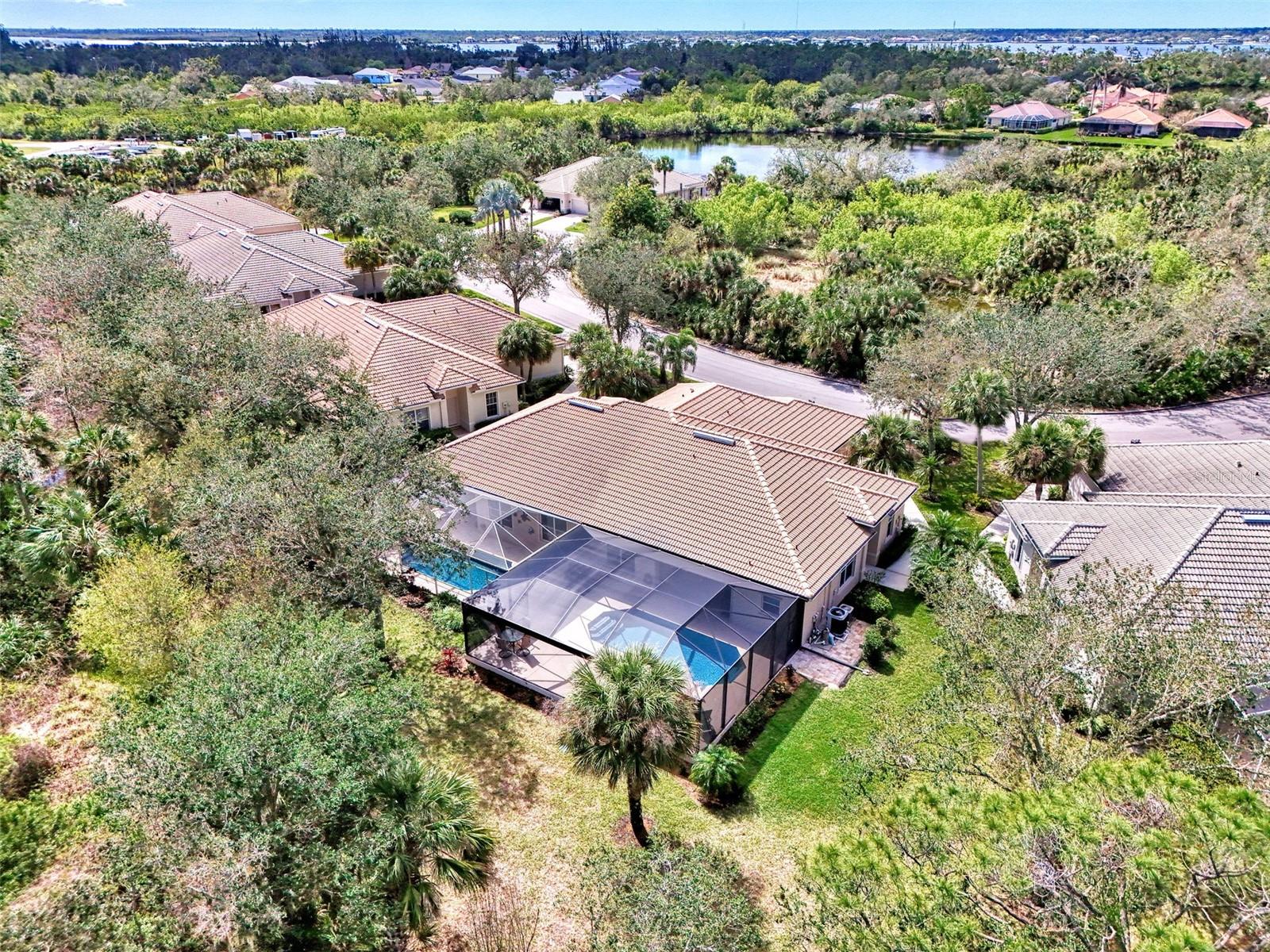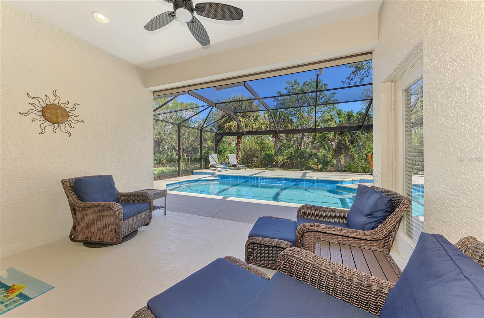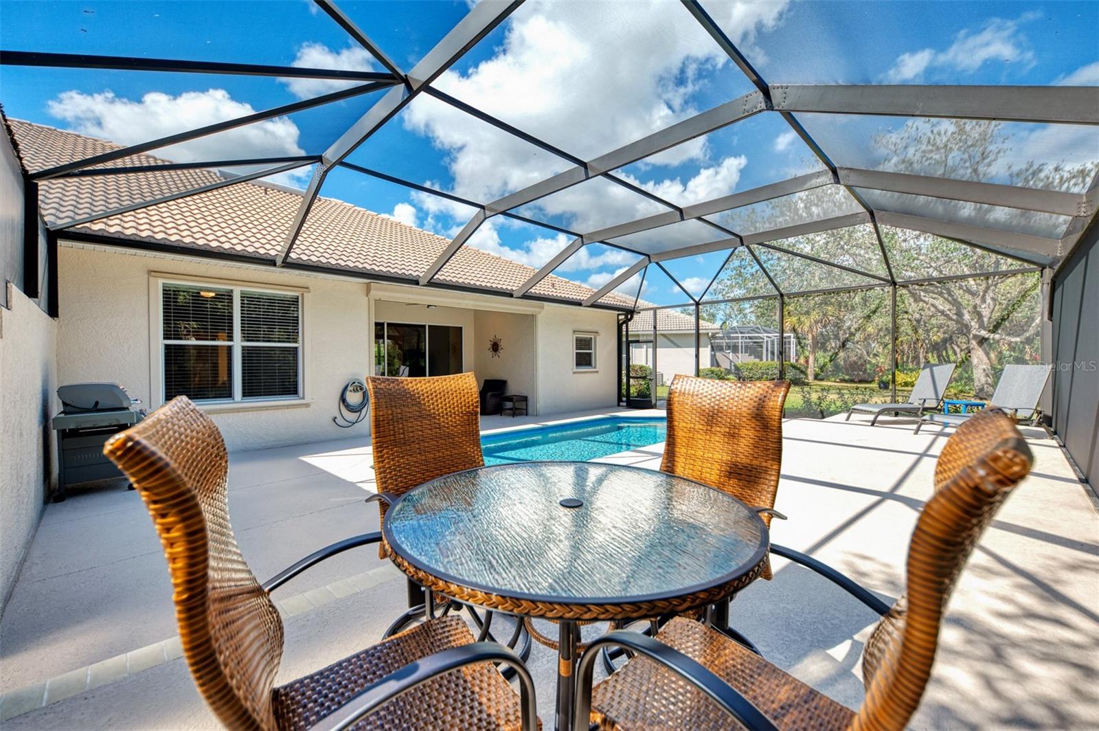 Welcome home to your Florida Oasis at this Meticulous, Beautiful 2 Bedroom, Plus Den, 2 Bathroom SALT WATER POOL VILLA in the gorgeous Riverwood gated golf community. This thoughtfully designed and desired “POINCIANA” FLOOR PLAN offers a Spacious Open Interior, the Privacy of a split bedroom plan, and is set on a deep lot (.22 Acres) surrounded by a tranquil preserve, the ultimate in privacy. The Pool Area is a True Gem, Showcasing a sparkling and COMPLETELY RENOVATED POOL, New DECK & expanded CAGE in 2024, highlighting a Pebbletec® pool surface, new coping stones, waterline tile, LED multi-color Pool Light, and 4’ sheer descent Waterfall. The pool cage is brand new including full view picture window (40’) and the deck has been completely re-surfaced & double-coat stained. The Pool Deck includes an elevated and roomy (10’x40’) SUN DECK. You’ll appreciate this home’s many other features and updates…A Spacious Open Kitchen: Wood Cabinets with crown, ample Granite Countertop workspace, updated Stainless Steel fridge, microwave, dishwasher slide-in range. Favored Ceramic tile flooring on diagonal in living areas. Window Blinds Throughout. Walk-In Closets and NEW (2023) upgraded carpeting in Both Bedrooms. Primary Bedroom offers an En Suite Bathroom boasting a REMODELED WALK-IN SHOWER & TUB. Roof Cleaned & Sealed (2024). Exterior Repainted (2024) and Interior Ceilings and Walls Repainted. Updated ceiling fans in master bath, lanai and garage. NEW (2022) Garage Floor Epoxy Flake Surfacing. Storm/Screen Door at Front Entry. Rain Gutters/Downspouts. ELECTRIC ROLL DOWN Hurricane Screen at Lanai & Clear Hurricane Panels at Windows. Nothing left to do but live the Florida Lifestyle at Riverwood: 1300 acres, gated, golf, resort style community. NEW RESORT STYLE & LAP POOL. SEPARATE FITNESS CENTER, PICKLEBALL COURTS, NEW SMALL AND LARGE DOG PARKS! Enjoy all that Riverwood has to offer in our lush tree lined streets, renovated activity center with all the social activities offered, 6 Har-Tru tennis courts, croquet court. An Audubon Green Community Award Winner for its natural habitat for Florida Wildlife. Optional amenities: Dog Park, Riverwood Golf Club, Par 72 Championship course & Beach Club on Manasota Key. Close to boating, cultural events, dining, shopping & beautiful beaches of SW FL. Located between Sarasota & Ft Myers on Florida’s West Coast in Paradise!