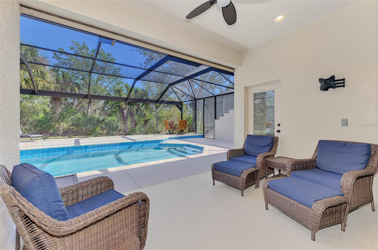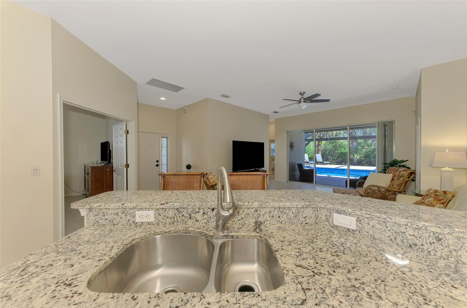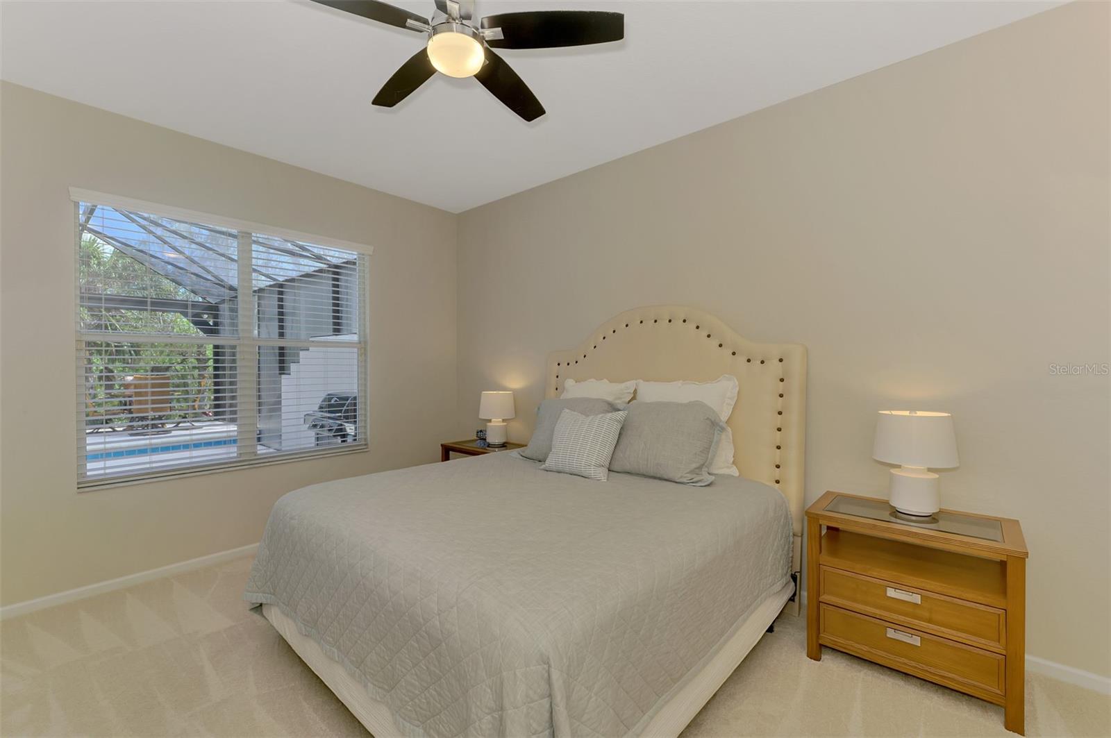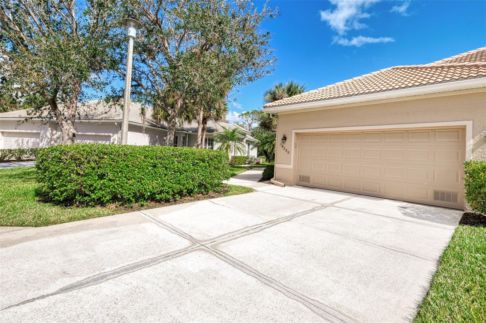 Welcome home to your Florida Oasis at this Meticulous, Beautiful 2 Bedroom, Plus Den, 2 Bathroom SALT WATER POOL VILLA in the gorgeous Riverwood gated golf community. This thoughtfully designed and desired “POINCIANA” FLOOR PLAN offers a Spacious Open Interior, the Privacy of a split bedroom plan, and is set on a deep lot (.22 Acres) surrounded by a tranquil preserve, the ultimate in privacy. The Pool Area is a True Gem, Showcasing a sparkling and COMPLETELY RENOVATED POOL, New DECK & expanded CAGE in 2024, highlighting a Pebbletec® pool surface, new coping stones, waterline tile, LED multi-color Pool Light, and 4’ sheer descent Waterfall. The pool cage is brand new including full view picture window (40’) and the deck has been completely re-surfaced & double-coat stained. The Pool Deck includes an elevated and roomy (10’x40’) SUN DECK. You’ll appreciate this home’s many other features and updates…A Spacious Open Kitchen: Wood Cabinets with crown, ample Granite Countertop workspace, updated Stainless Steel fridge, microwave, dishwasher slide-in range. Favored Ceramic tile flooring on diagonal in living areas. Window Blinds Throughout. Walk-In Closets and NEW (2023) upgraded carpeting in Both Bedrooms. Primary Bedroom offers an En Suite Bathroom boasting a REMODELED WALK-IN SHOWER & TUB. Roof Cleaned & Sealed (2024). Exterior Repainted (2024) and Interior Ceilings and Walls Repainted. Updated ceiling fans in master bath, lanai and garage. NEW (2022) Garage Floor Epoxy Flake Surfacing. Storm/Screen Door at Front Entry. Rain Gutters/Downspouts. ELECTRIC ROLL DOWN Hurricane Screen at Lanai & Clear Hurricane Panels at Windows. Nothing left to do but live the Florida Lifestyle at Riverwood: 1300 acres, gated, golf, resort style community. NEW RESORT STYLE & LAP POOL. SEPARATE FITNESS CENTER, PICKLEBALL COURTS, NEW SMALL AND LARGE DOG PARKS! Enjoy all that Riverwood has to offer in our lush tree lined streets, renovated activity center with all the social activities offered, 6 Har-Tru tennis courts, croquet court. An Audubon Green Community Award Winner for its natural habitat for Florida Wildlife. Optional amenities: Dog Park, Riverwood Golf Club, Par 72 Championship course & Beach Club on Manasota Key. Close to boating, cultural events, dining, shopping & beautiful beaches of SW FL. Located between Sarasota & Ft Myers on Florida’s West Coast in Paradise!