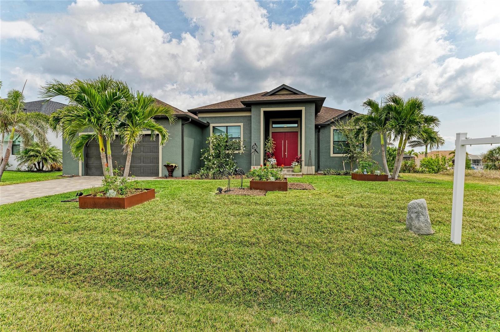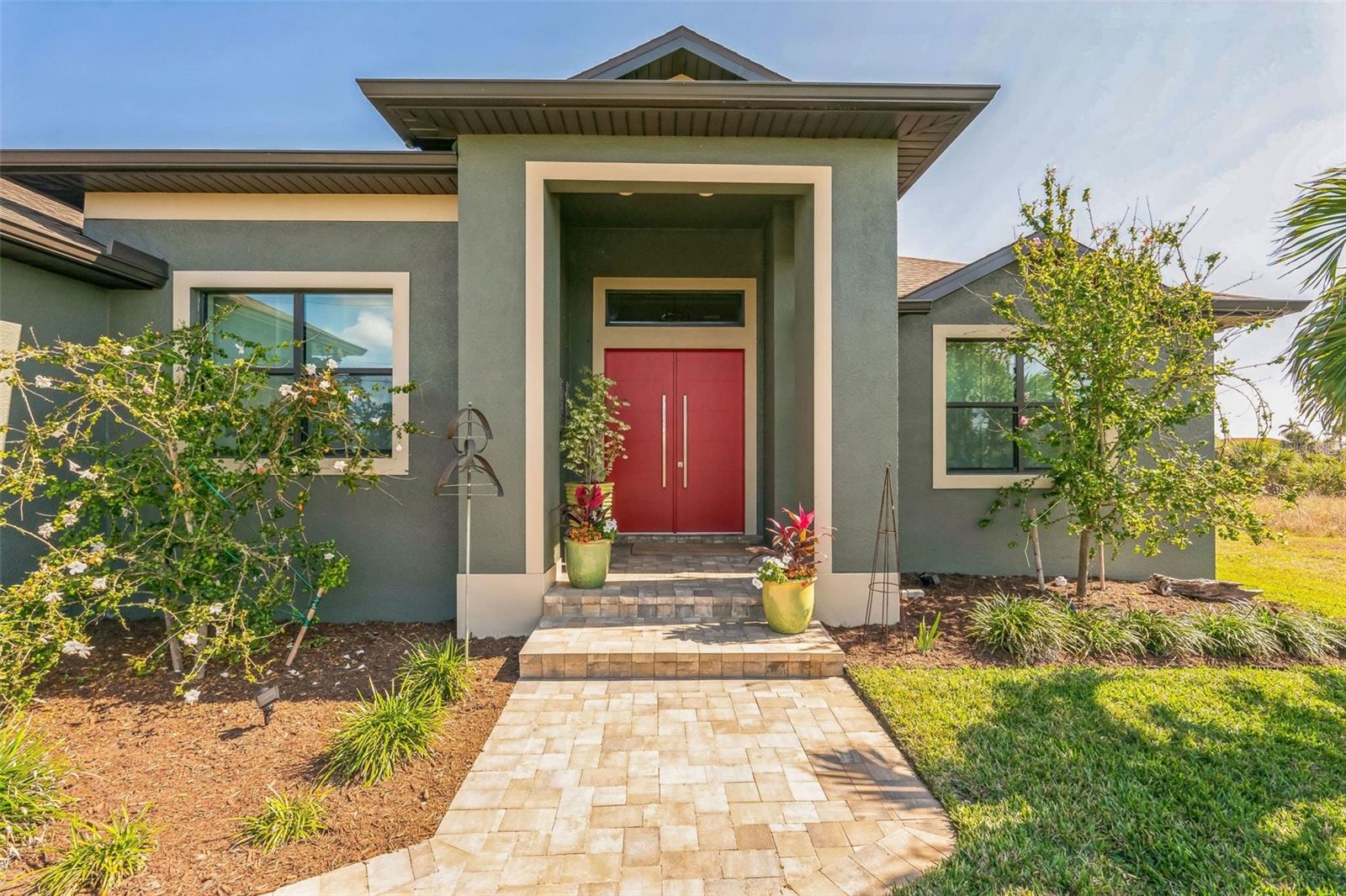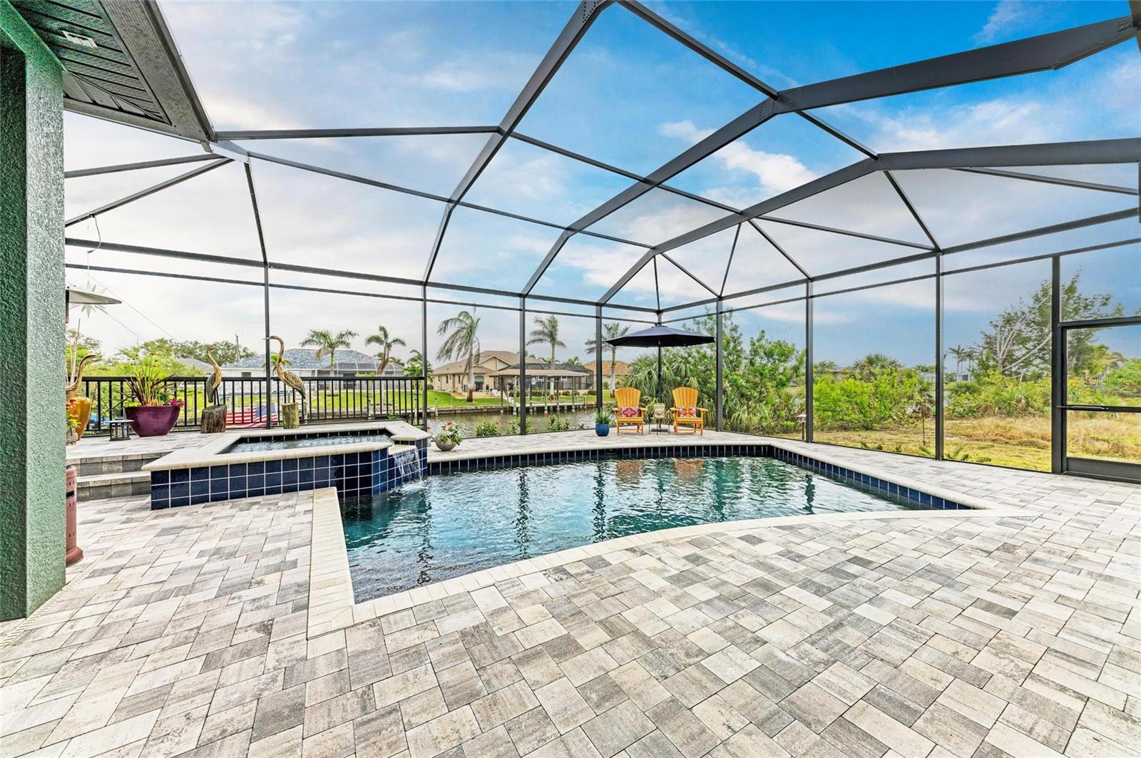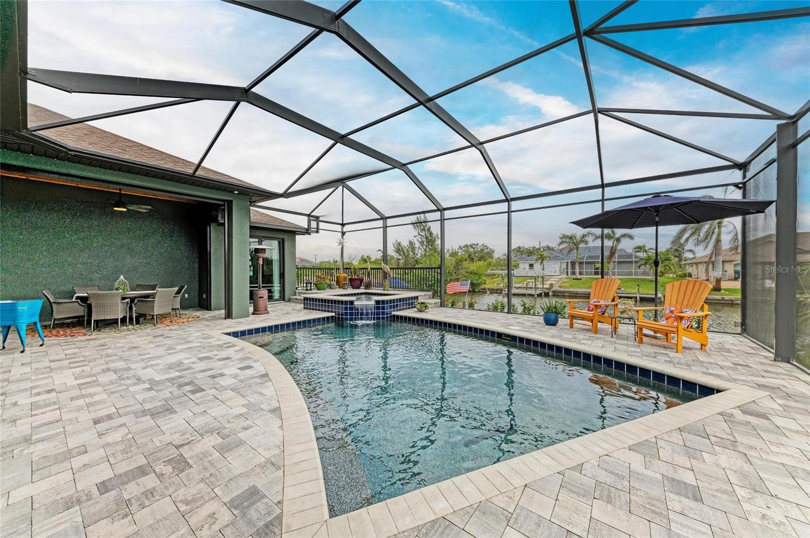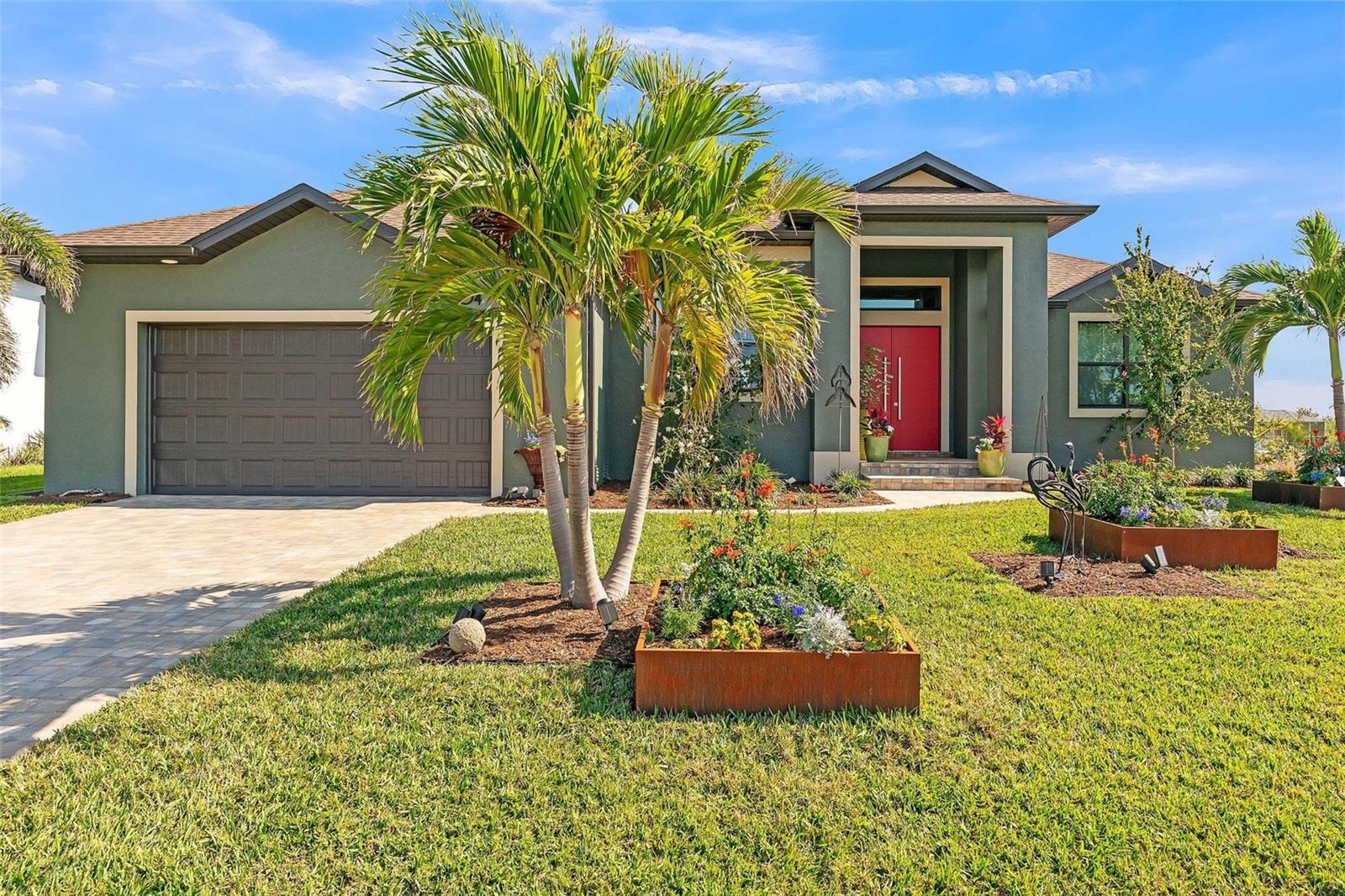 Nestled along serene waterfront, this exquisite contemporary home featuring 3 bedrooms, 2 baths plus bonus room blends modern luxury with elegant design, offering an unparalleled living experience. Pavered driveway and walkway guide you to the step up entry welcoming you inside where you're greeted by an expansive great room featuring a striking coffered 12-foot ceiling, setting the tone for the home’s sophisticated open-plan design. The heart of the home is its gourmet kitchen, showcasing an 8 x 6 foot upgraded granite island, large walk-in pantry, 58" custom wood cabinets with soft close doors and drawers, premium Bosch induction cooktop and Kitchen Aid appliances, all accentuated by upper and lower cabinet lighting. The primary bedroom is a true retreat, highlighted by a tray ceiling with soft lighting and crown molding with sliding doors to the lanai/pool area creating a tranquil atmosphere. The 9x13 walk-in closet is a masterpiece in organization, outfitted with designer shelving and stylish doors provides ample storage for your personal belongings and opens into the laundry room. The ensuite bath is equally impressive, with his/her granite-topped vanities featuring sleek vessel sinks upon granite counters, and a luxurious walk-through shower with upgraded tile work that enhances the spa-like feel. Throughout the living areas and primary suite, non-slip porcelain plank tile adds both elegance and functionality. Solid 8-foot wood doors can be found throughout the home, contributing to its refined, timeless character. Extensive lighting upgrades throughout the space illuminate the home’s unique architectural details. Step through the zero-corner, 10-foot sliding pocket doors that seamlessly connect the great room to the expansive 31x13-foot lanai and pool area. The outdoor space is a true extension of the home, offering a covered dining area, a cozy fireplace, an outdoor kitchen with marine grade cabinet with granite top, and a stunning white pine tongue-and-groove ceiling that adds warmth and charm. The lanai overlooks the pool area, where a 42 x 30-1/2-foot paver deck surrounds a heated, saltwater pool with pebble tec finish, complete with an integral step-up spa with same pebble tec finish. Approved variance allowed sellers to extend the pool surround by 5 feet creating a larger space for entertaining closer to the water. The home is equipped with a multi-zone HVAC system, ensuring comfort throughout every room. Exterior showcases rain gutters, lighting, and mature landscaping that is irrigated from the canal with an enclosed irrigation pump that provides the option to use city water. The 10 x 30 composite dock is the perfect spot for your fishing enjoyment or to dock your boat. The attached garage boasts an air conditioned combination art room/workshop and also presents an ADA compliant ramp for accessing home's entrance. Additional attributes are InReach brand power lifts that eliminate the need for using a ladder to add or remove items that are out of reach. Additionally, all windows are impact resistant. Sliders are either impact or protected by Kevlar screening. With meticulous attention to detail both inside and out, this waterfront home offers the perfect balance of luxury, comfort, and style.