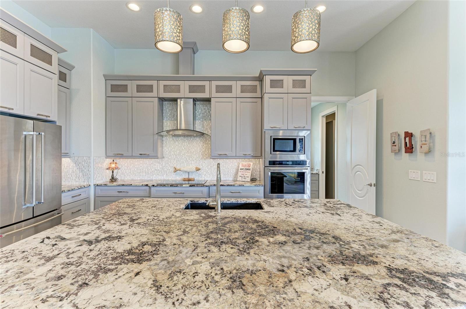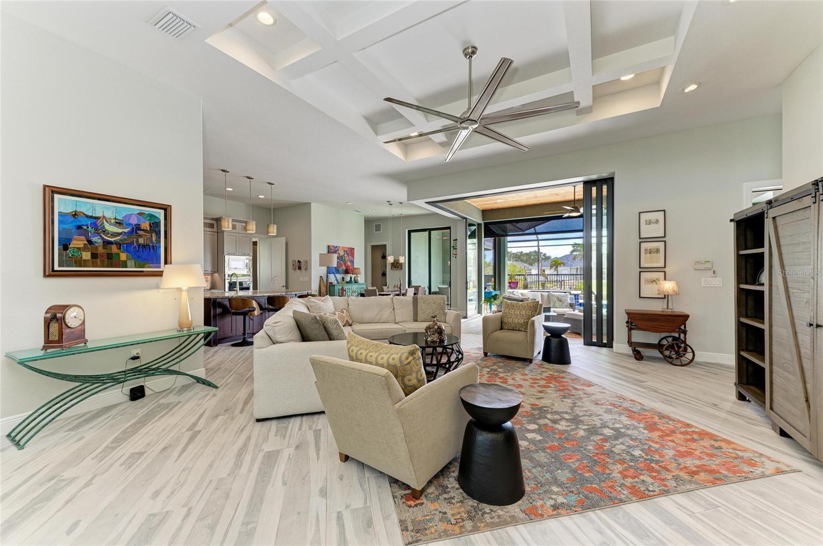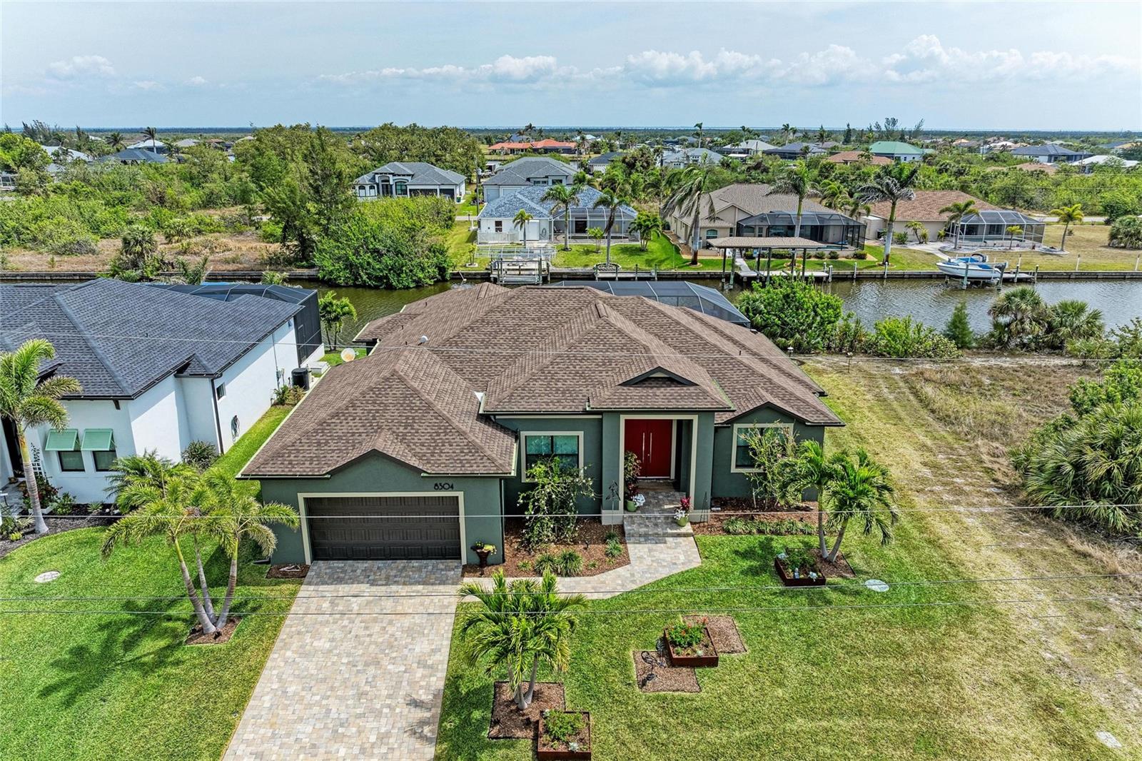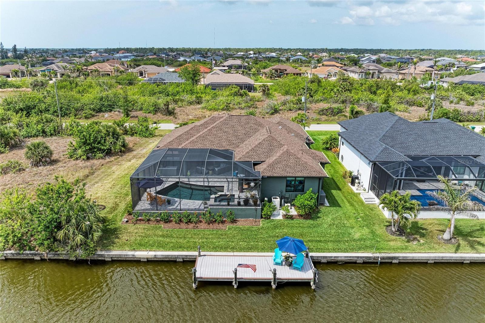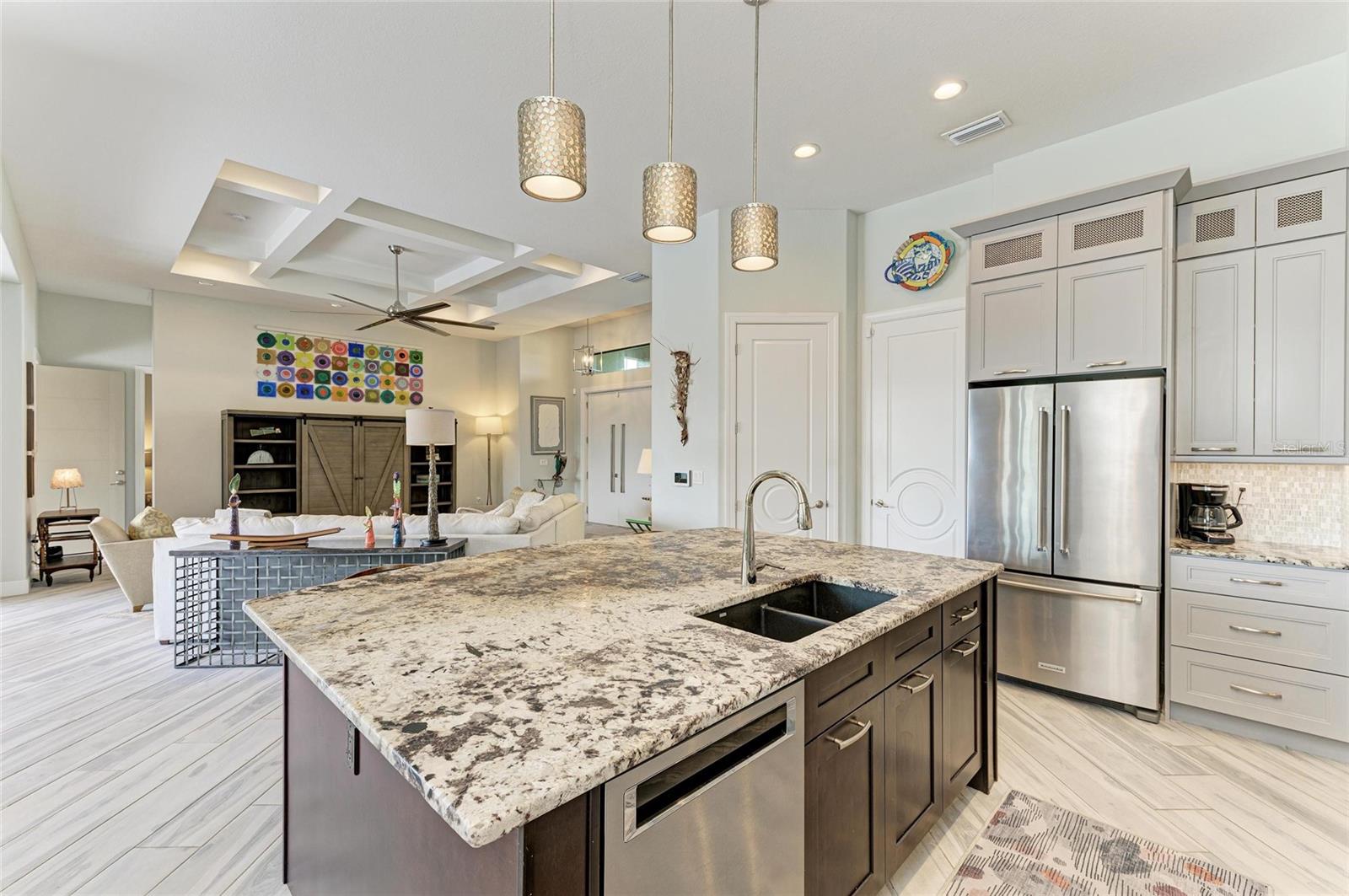 Nestled along serene waterfront, this exquisite contemporary home featuring 3 bedrooms, 2 baths plus bonus room blends modern luxury with elegant design, offering an unparalleled living experience. Pavered driveway and walkway guide you to the step up entry welcoming you inside where you're greeted by an expansive great room featuring a striking coffered 12-foot ceiling, setting the tone for the home’s sophisticated open-plan design. The heart of the home is its gourmet kitchen, showcasing an 8 x 6 foot upgraded granite island, large walk-in pantry, 58" custom wood cabinets with soft close doors and drawers, premium Bosch induction cooktop and Kitchen Aid appliances, all accentuated by upper and lower cabinet lighting. The primary bedroom is a true retreat, highlighted by a tray ceiling with soft lighting and crown molding with sliding doors to the lanai/pool area creating a tranquil atmosphere. The 9x13 walk-in closet is a masterpiece in organization, outfitted with designer shelving and stylish doors provides ample storage for your personal belongings and opens into the laundry room. The ensuite bath is equally impressive, with his/her granite-topped vanities featuring sleek vessel sinks upon granite counters, and a luxurious walk-through shower with upgraded tile work that enhances the spa-like feel. Throughout the living areas and primary suite, non-slip porcelain plank tile adds both elegance and functionality. Solid 8-foot wood doors can be found throughout the home, contributing to its refined, timeless character. Extensive lighting upgrades throughout the space illuminate the home’s unique architectural details. Step through the zero-corner, 10-foot sliding pocket doors that seamlessly connect the great room to the expansive 31x13-foot lanai and pool area. The outdoor space is a true extension of the home, offering a covered dining area, a cozy fireplace, an outdoor kitchen with marine grade cabinet with granite top, and a stunning white pine tongue-and-groove ceiling that adds warmth and charm. The lanai overlooks the pool area, where a 42 x 30-1/2-foot paver deck surrounds a heated, saltwater pool with pebble tec finish, complete with an integral step-up spa with same pebble tec finish. Approved variance allowed sellers to extend the pool surround by 5 feet creating a larger space for entertaining closer to the water. The home is equipped with a multi-zone HVAC system, ensuring comfort throughout every room. Exterior showcases rain gutters, lighting, and mature landscaping that is irrigated from the canal with an enclosed irrigation pump that provides the option to use city water. The 10 x 30 composite dock is the perfect spot for your fishing enjoyment or to dock your boat. The attached garage boasts an air conditioned combination art room/workshop and also presents an ADA compliant ramp for accessing home's entrance. Additional attributes are InReach brand power lifts that eliminate the need for using a ladder to add or remove items that are out of reach. Additionally, all windows are impact resistant. Sliders are either impact or protected by Kevlar screening. With meticulous attention to detail both inside and out, this waterfront home offers the perfect balance of luxury, comfort, and style.
