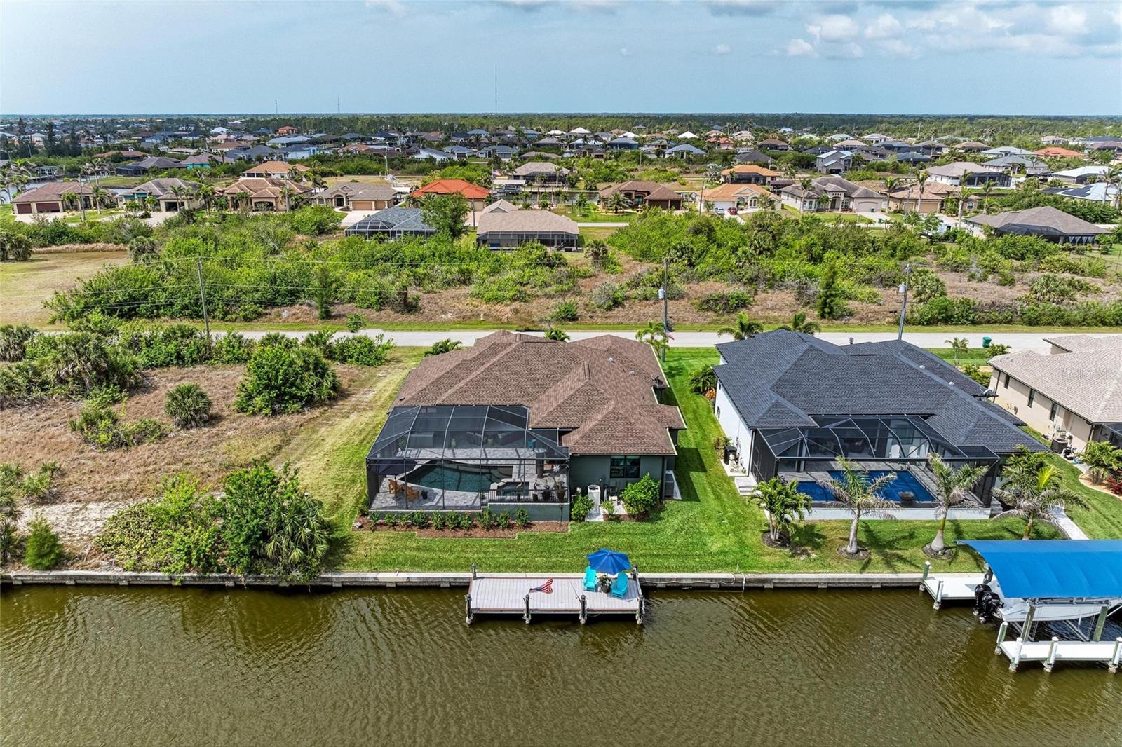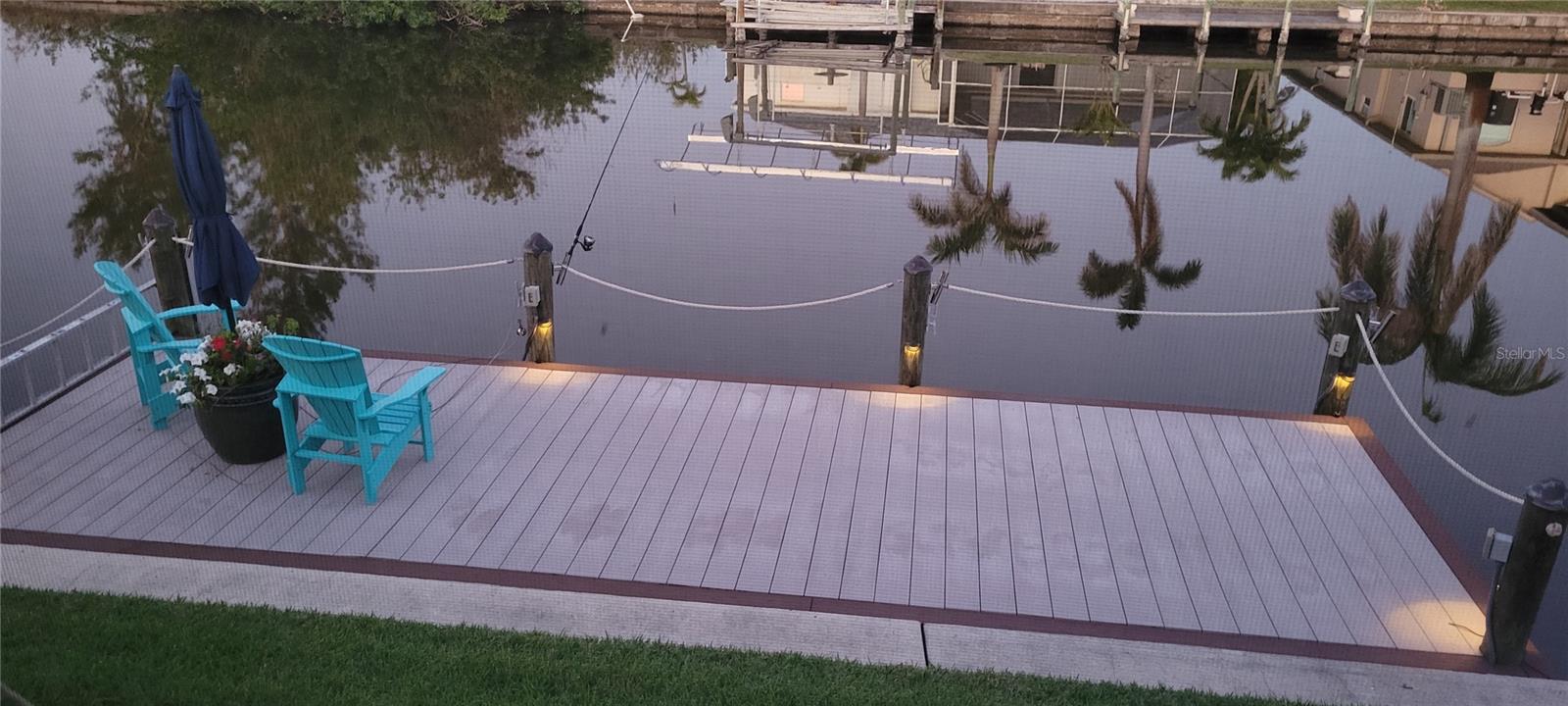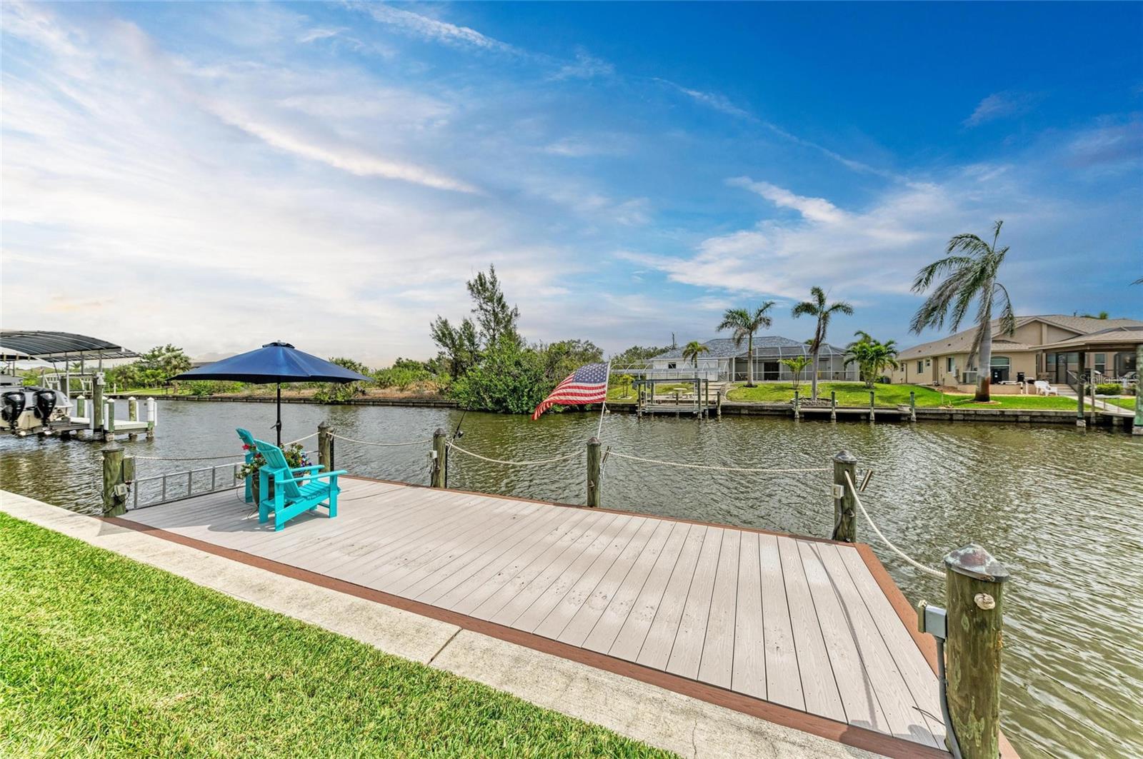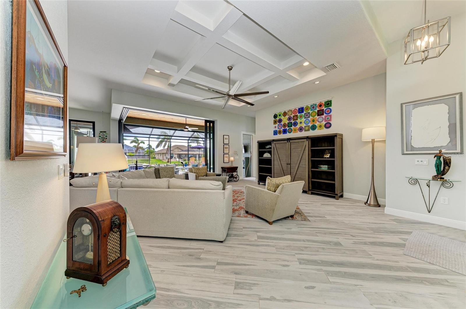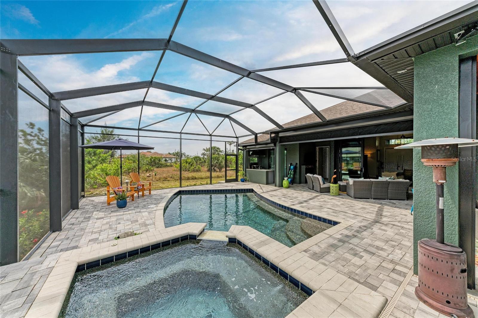 Nestled along serene waterfront, this exquisite contemporary home featuring 3 bedrooms, 2 baths plus bonus room blends modern luxury with elegant design, offering an unparalleled living experience. Pavered driveway and walkway guide you to the step up entry welcoming you inside where you're greeted by an expansive great room featuring a striking coffered 12-foot ceiling, setting the tone for the home’s sophisticated open-plan design. The heart of the home is its gourmet kitchen, showcasing an 8 x 6 foot upgraded granite island, large walk-in pantry, 58" custom wood cabinets with soft close doors and drawers, premium Bosch induction cooktop and Kitchen Aid appliances, all accentuated by upper and lower cabinet lighting. The primary bedroom is a true retreat, highlighted by a tray ceiling with soft lighting and crown molding with sliding doors to the lanai/pool area creating a tranquil atmosphere. The 9x13 walk-in closet is a masterpiece in organization, outfitted with designer shelving and stylish doors provides ample storage for your personal belongings and opens into the laundry room. The ensuite bath is equally impressive, with his/her granite-topped vanities featuring sleek vessel sinks upon granite counters, and a luxurious walk-through shower with upgraded tile work that enhances the spa-like feel. Throughout the living areas and primary suite, non-slip porcelain plank tile adds both elegance and functionality. Solid 8-foot wood doors can be found throughout the home, contributing to its refined, timeless character. Extensive lighting upgrades throughout the space illuminate the home’s unique architectural details. Step through the zero-corner, 10-foot sliding pocket doors that seamlessly connect the great room to the expansive 31x13-foot lanai and pool area. The outdoor space is a true extension of the home, offering a covered dining area, a cozy fireplace, an outdoor kitchen with marine grade cabinet with granite top, and a stunning white pine tongue-and-groove ceiling that adds warmth and charm. The lanai overlooks the pool area, where a 42 x 30-1/2-foot paver deck surrounds a heated, saltwater pool with pebble tec finish, complete with an integral step-up spa with same pebble tec finish. Approved variance allowed sellers to extend the pool surround by 5 feet creating a larger space for entertaining closer to the water. The home is equipped with a multi-zone HVAC system, ensuring comfort throughout every room. Exterior showcases rain gutters, lighting, and mature landscaping that is irrigated from the canal with an enclosed irrigation pump that provides the option to use city water. The 10 x 30 composite dock is the perfect spot for your fishing enjoyment or to dock your boat. The attached garage boasts an air conditioned combination art room/workshop and also presents an ADA compliant ramp for accessing home's entrance. Additional attributes are InReach brand power lifts that eliminate the need for using a ladder to add or remove items that are out of reach. Additionally, all windows are impact resistant. Sliders are either impact or protected by Kevlar screening. With meticulous attention to detail both inside and out, this waterfront home offers the perfect balance of luxury, comfort, and style.