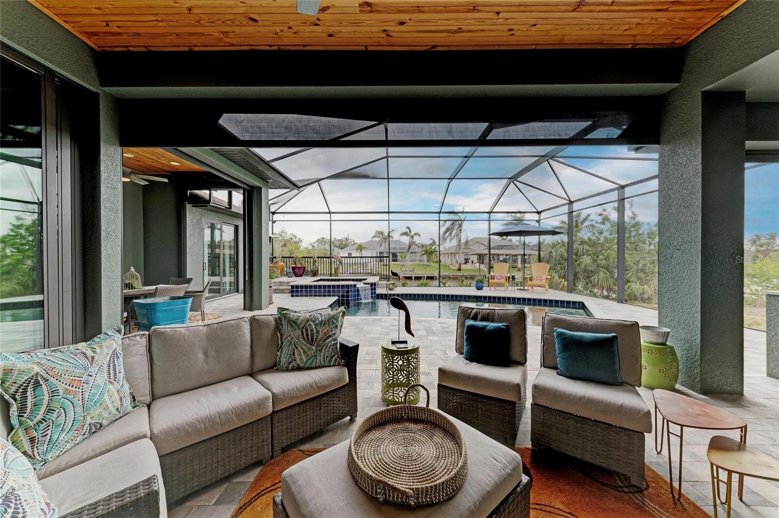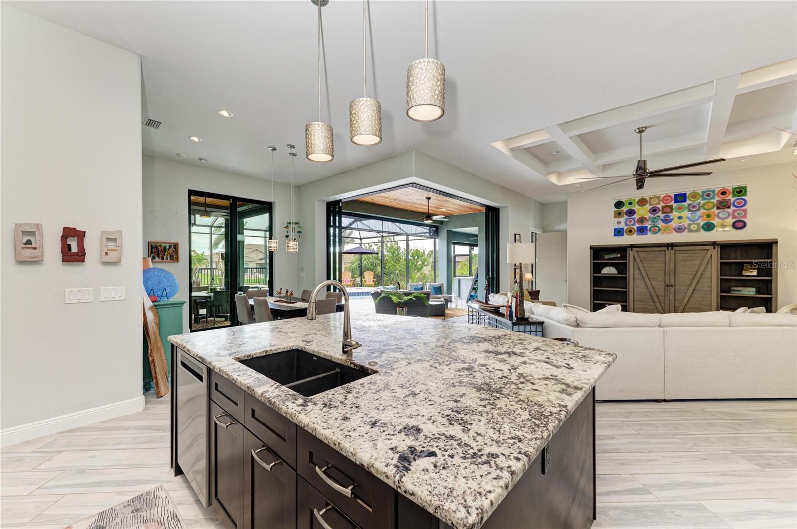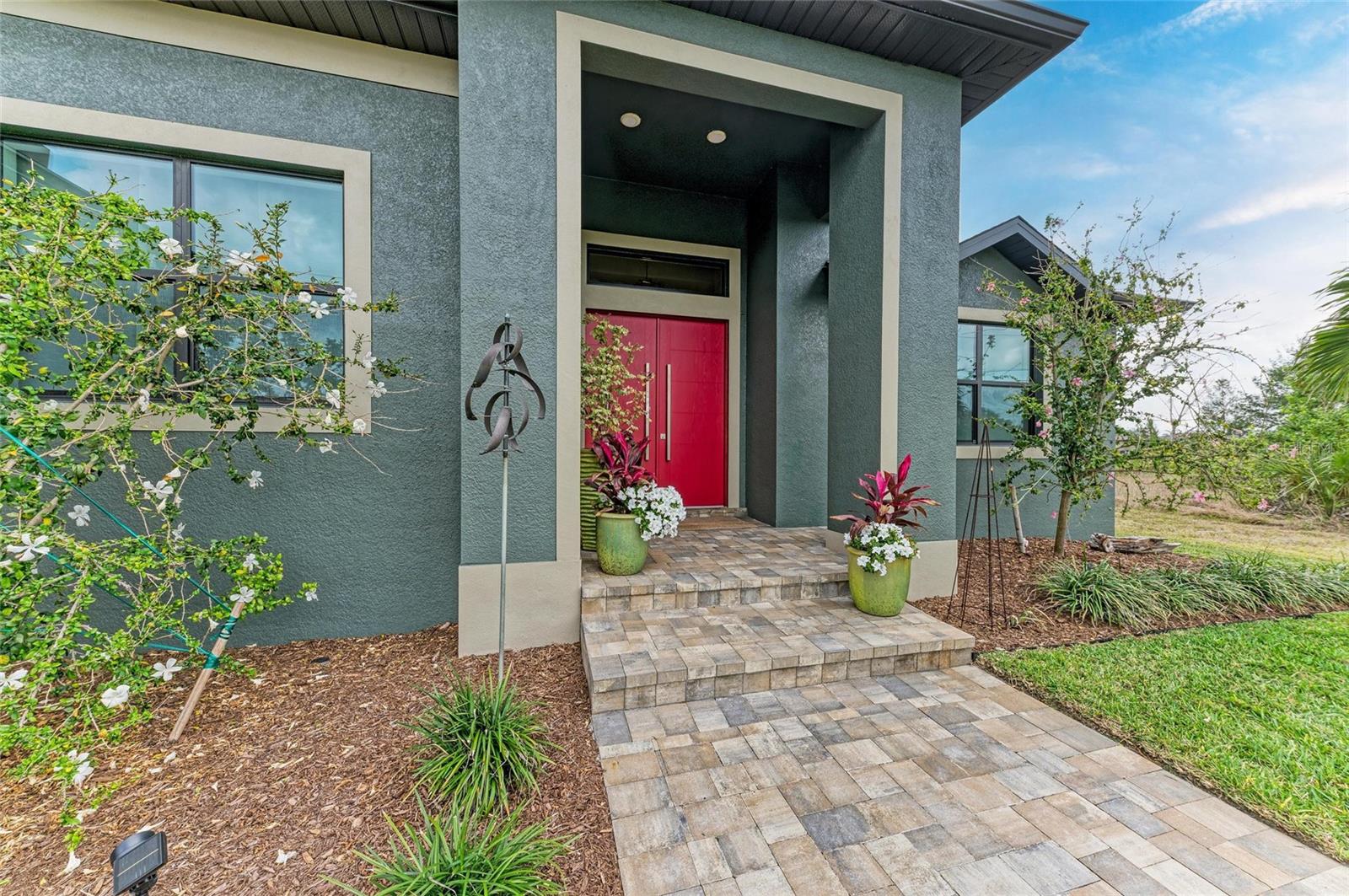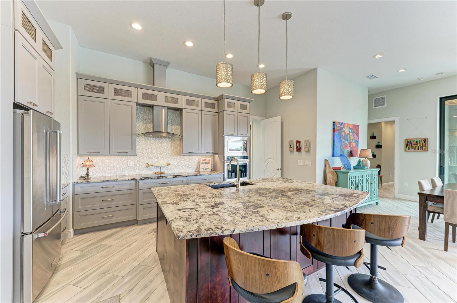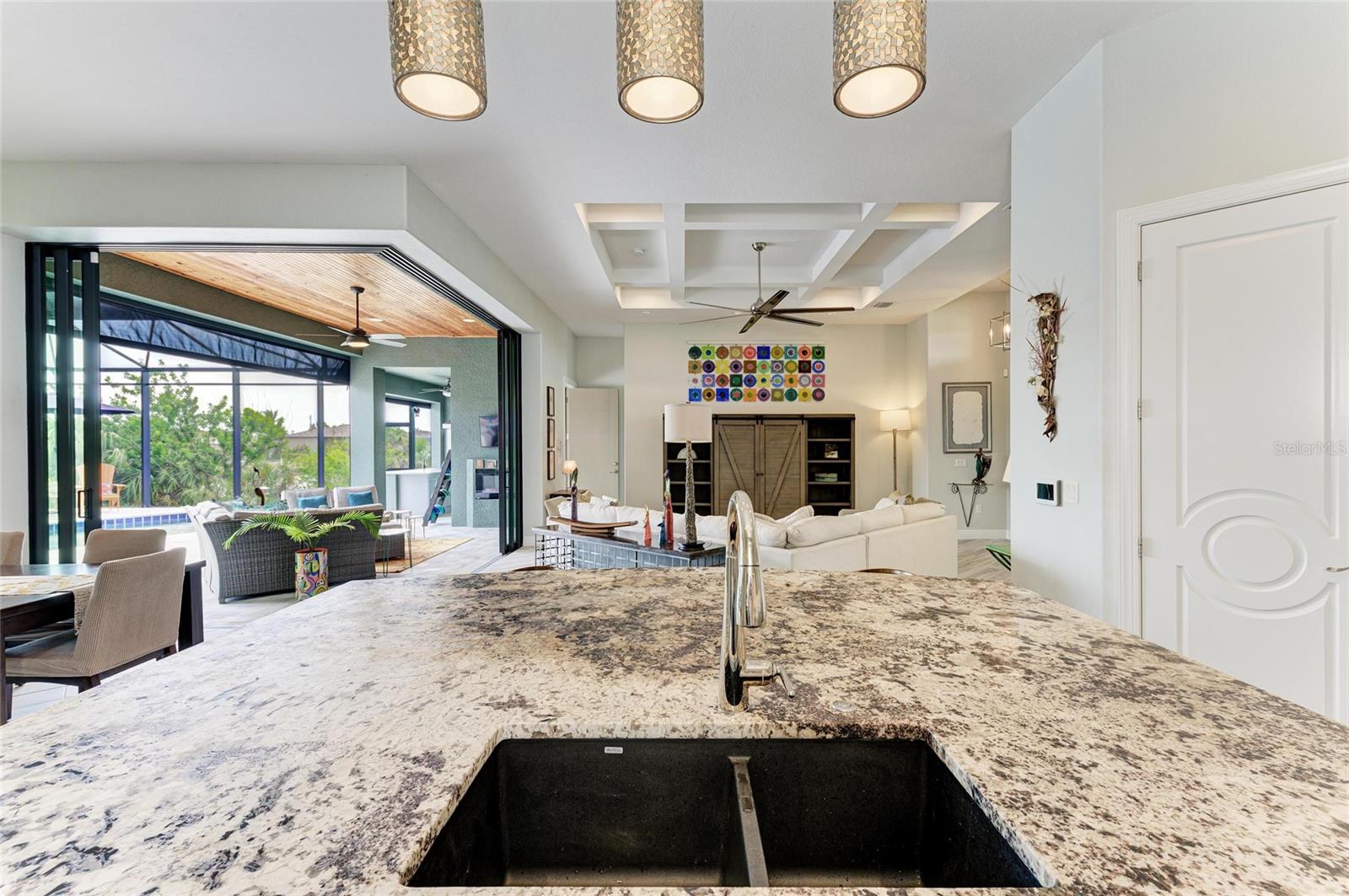 Nestled along serene waterfront, this exquisite contemporary home featuring 3 bedrooms, 2 baths plus bonus room blends modern luxury with elegant design, offering an unparalleled living experience. Pavered driveway and walkway guide you to the step up entry welcoming you inside where you're greeted by an expansive great room featuring a striking coffered 12-foot ceiling, setting the tone for the home’s sophisticated open-plan design. The heart of the home is its gourmet kitchen, showcasing an 8 x 6 foot upgraded granite island, large walk-in pantry, 58" custom wood cabinets with soft close doors and drawers, premium Bosch induction cooktop and Kitchen Aid appliances, all accentuated by upper and lower cabinet lighting. The primary bedroom is a true retreat, highlighted by a tray ceiling with soft lighting and crown molding with sliding doors to the lanai/pool area creating a tranquil atmosphere. The 9x13 walk-in closet is a masterpiece in organization, outfitted with designer shelving and stylish doors provides ample storage for your personal belongings and opens into the laundry room. The ensuite bath is equally impressive, with his/her granite-topped vanities featuring sleek vessel sinks upon granite counters, and a luxurious walk-through shower with upgraded tile work that enhances the spa-like feel. Throughout the living areas and primary suite, non-slip porcelain plank tile adds both elegance and functionality. Solid 8-foot wood doors can be found throughout the home, contributing to its refined, timeless character. Extensive lighting upgrades throughout the space illuminate the home’s unique architectural details. Step through the zero-corner, 10-foot sliding pocket doors that seamlessly connect the great room to the expansive 31x13-foot lanai and pool area. The outdoor space is a true extension of the home, offering a covered dining area, a cozy fireplace, an outdoor kitchen with marine grade cabinet with granite top, and a stunning white pine tongue-and-groove ceiling that adds warmth and charm. The lanai overlooks the pool area, where a 42 x 30-1/2-foot paver deck surrounds a heated, saltwater pool with pebble tec finish, complete with an integral step-up spa with same pebble tec finish. Approved variance allowed sellers to extend the pool surround by 5 feet creating a larger space for entertaining closer to the water. The home is equipped with a multi-zone HVAC system, ensuring comfort throughout every room. Exterior showcases rain gutters, lighting, and mature landscaping that is irrigated from the canal with an enclosed irrigation pump that provides the option to use city water. The 10 x 30 composite dock is the perfect spot for your fishing enjoyment or to dock your boat. The attached garage boasts an air conditioned combination art room/workshop and also presents an ADA compliant ramp for accessing home's entrance. Additional attributes are InReach brand power lifts that eliminate the need for using a ladder to add or remove items that are out of reach. Additionally, all windows are impact resistant. Sliders are either impact or protected by Kevlar screening. With meticulous attention to detail both inside and out, this waterfront home offers the perfect balance of luxury, comfort, and style.