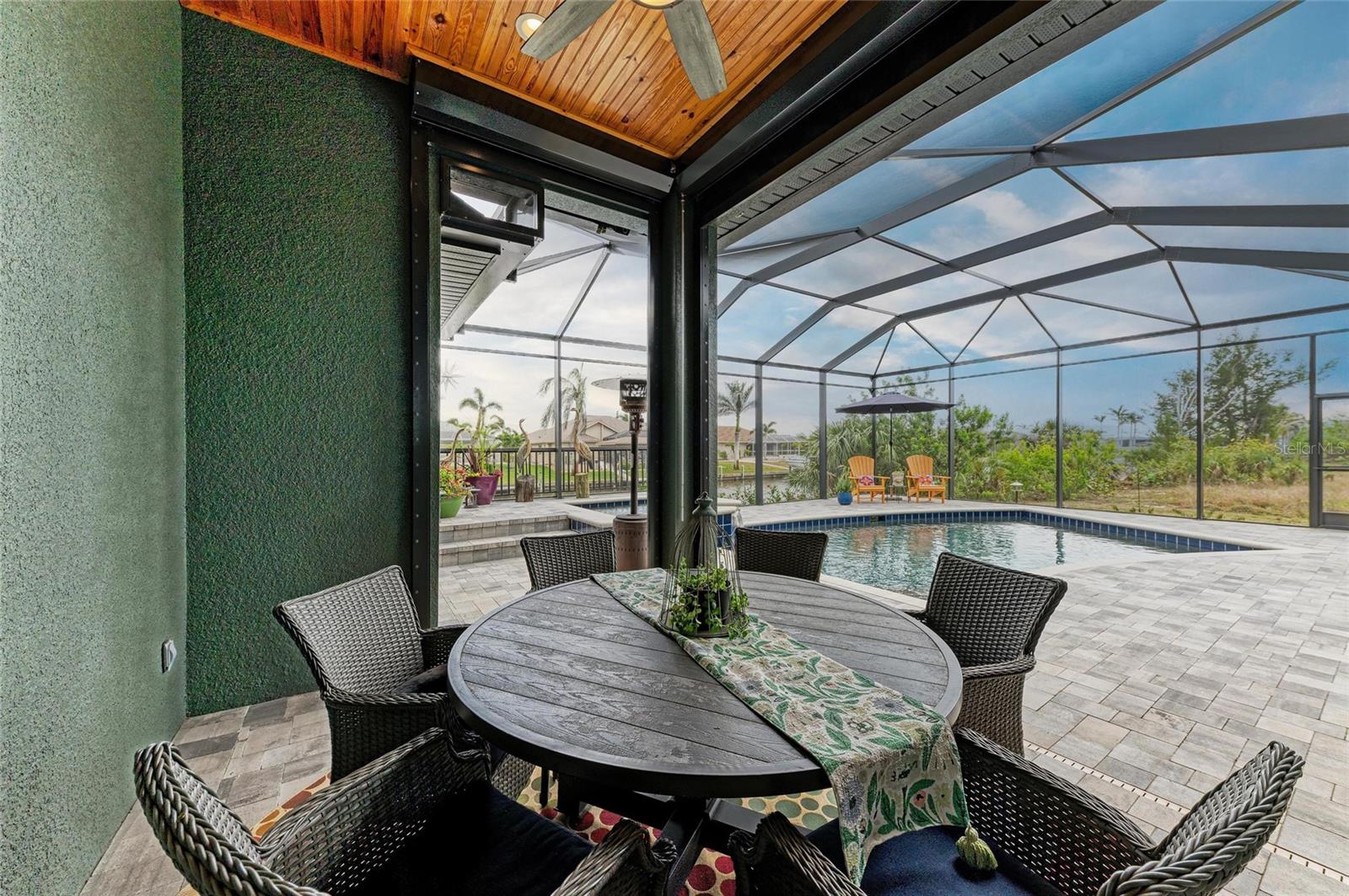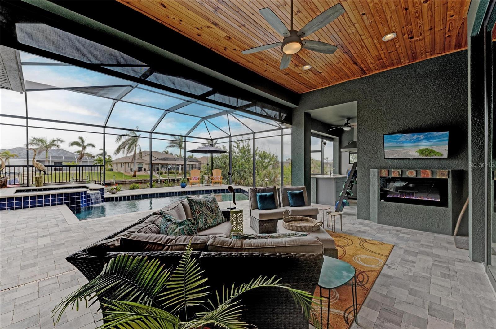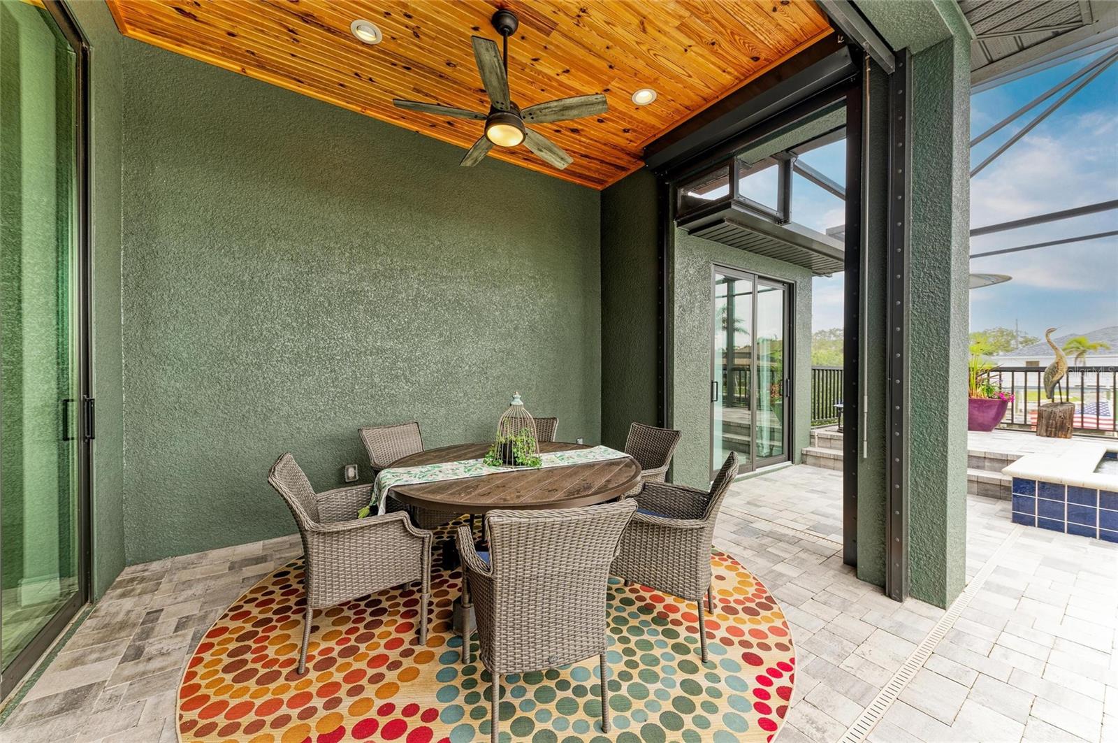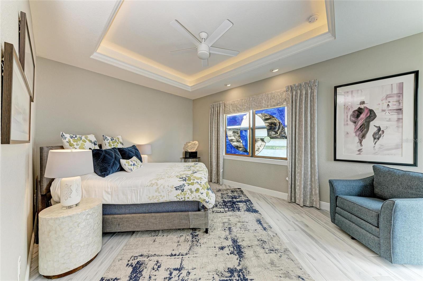 Nestled along serene waterfront, this exquisite contemporary home featuring 3 bedrooms, 2 baths plus bonus room blends modern luxury with elegant design, offering an unparalleled living experience. Pavered driveway and walkway guide you to the step up entry welcoming you inside where you're greeted by an expansive great room featuring a striking coffered 12-foot ceiling, setting the tone for the home’s sophisticated open-plan design. The heart of the home is its gourmet kitchen, showcasing an 8 x 6 foot upgraded granite island, large walk-in pantry, 58" custom wood cabinets with soft close doors and drawers, premium Bosch induction cooktop and Kitchen Aid appliances, all accentuated by upper and lower cabinet lighting. The primary bedroom is a true retreat, highlighted by a tray ceiling with soft lighting and crown molding with sliding doors to the lanai/pool area creating a tranquil atmosphere. The 9x13 walk-in closet is a masterpiece in organization, outfitted with designer shelving and stylish doors provides ample storage for your personal belongings and opens into the laundry room. The ensuite bath is equally impressive, with his/her granite-topped vanities featuring sleek vessel sinks upon granite counters, and a luxurious walk-through shower with upgraded tile work that enhances the spa-like feel. Throughout the living areas and primary suite, non-slip porcelain plank tile adds both elegance and functionality. Solid 8-foot wood doors can be found throughout the home, contributing to its refined, timeless character. Extensive lighting upgrades throughout the space illuminate the home’s unique architectural details. Step through the zero-corner, 10-foot sliding pocket doors that seamlessly connect the great room to the expansive 31x13-foot lanai and pool area. The outdoor space is a true extension of the home, offering a covered dining area, a cozy fireplace, an outdoor kitchen with marine grade cabinet with granite top, and a stunning white pine tongue-and-groove ceiling that adds warmth and charm. The lanai overlooks the pool area, where a 42 x 30-1/2-foot paver deck surrounds a heated, saltwater pool with pebble tec finish, complete with an integral step-up spa with same pebble tec finish. Approved variance allowed sellers to extend the pool surround by 5 feet creating a larger space for entertaining closer to the water. The home is equipped with a multi-zone HVAC system, ensuring comfort throughout every room. Exterior showcases rain gutters, lighting, and mature landscaping that is irrigated from the canal with an enclosed irrigation pump that provides the option to use city water. The 10 x 30 composite dock is the perfect spot for your fishing enjoyment or to dock your boat. The attached garage boasts an air conditioned combination art room/workshop and also presents an ADA compliant ramp for accessing home's entrance. Additional attributes are InReach brand power lifts that eliminate the need for using a ladder to add or remove items that are out of reach. Additionally, all windows are impact resistant. Sliders are either impact or protected by Kevlar screening. With meticulous attention to detail both inside and out, this waterfront home offers the perfect balance of luxury, comfort, and style.