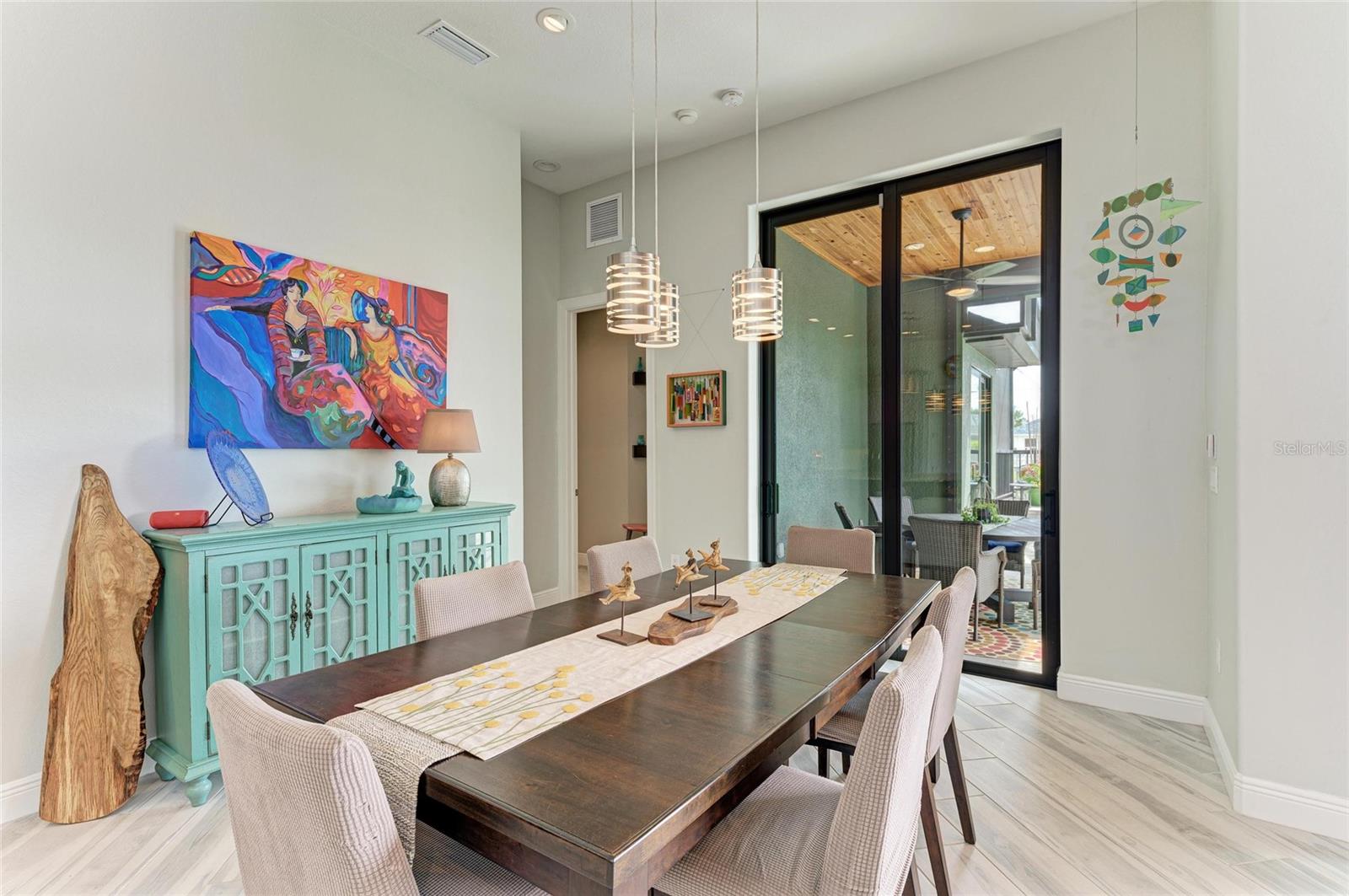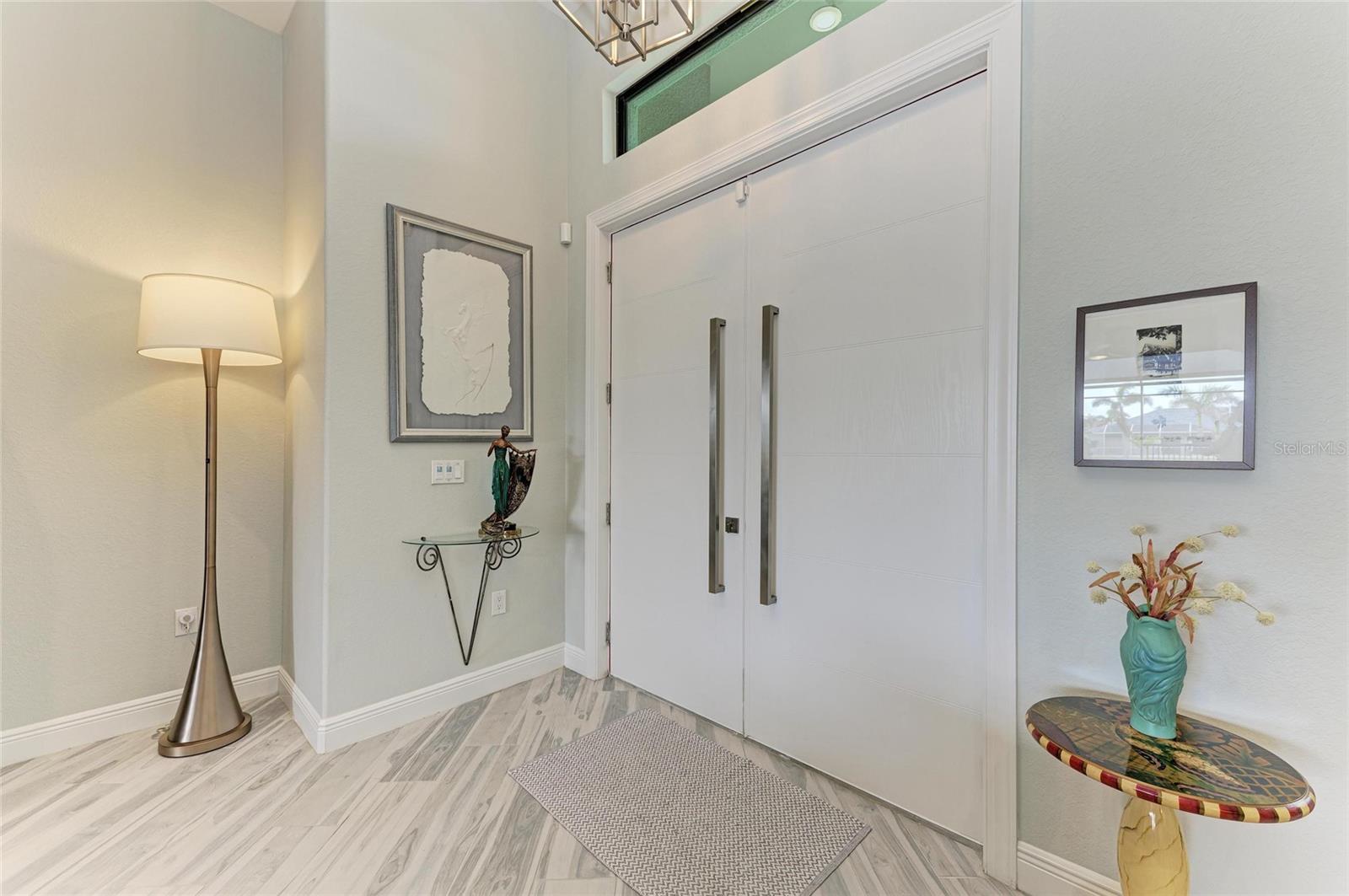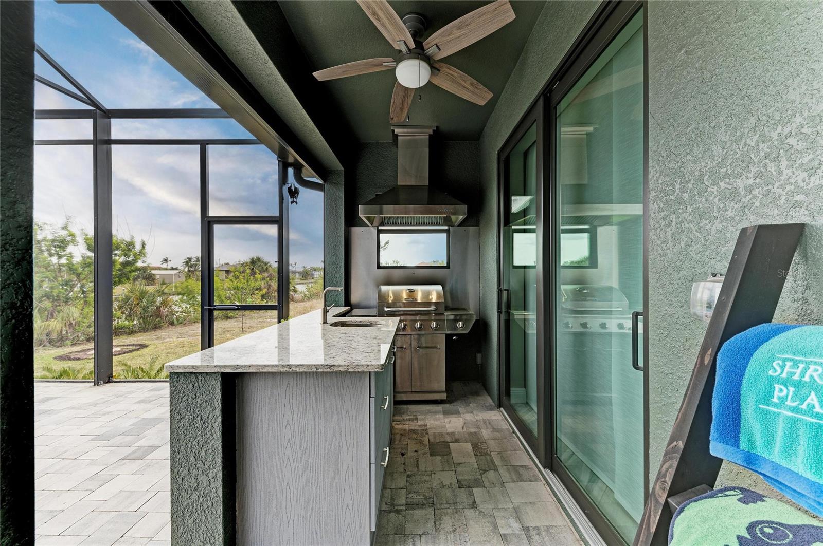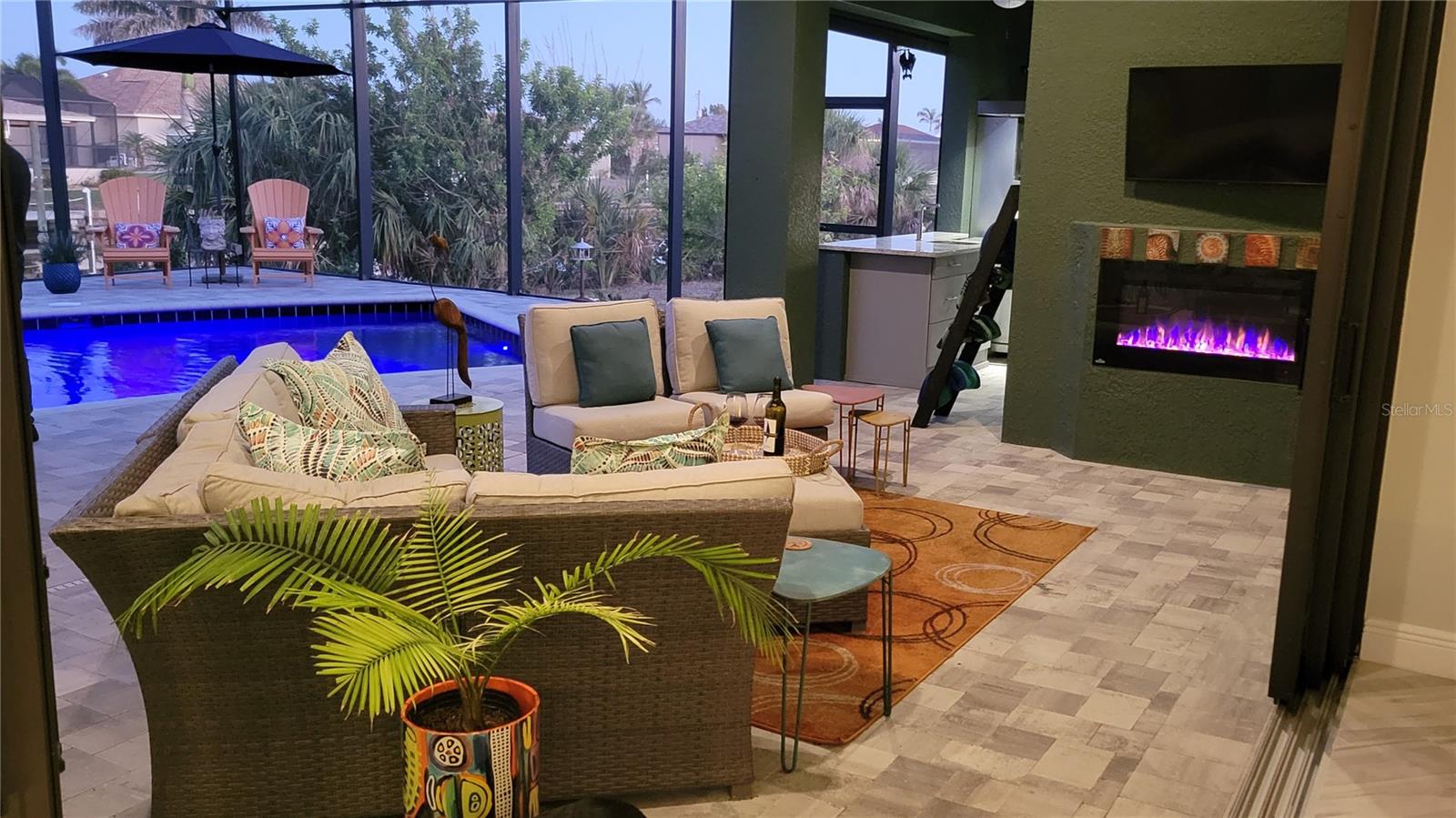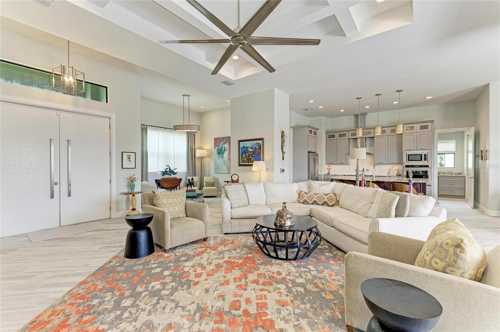 Nestled along serene waterfront, this exquisite contemporary home featuring 3 bedrooms, 2 baths plus bonus room blends modern luxury with elegant design, offering an unparalleled living experience. Pavered driveway and walkway guide you to the step up entry welcoming you inside where you're greeted by an expansive great room featuring a striking coffered 12-foot ceiling, setting the tone for the home’s sophisticated open-plan design. The heart of the home is its gourmet kitchen, showcasing an 8 x 6 foot upgraded granite island, large walk-in pantry, 58" custom wood cabinets with soft close doors and drawers, premium Bosch induction cooktop and Kitchen Aid appliances, all accentuated by upper and lower cabinet lighting. The primary bedroom is a true retreat, highlighted by a tray ceiling with soft lighting and crown molding with sliding doors to the lanai/pool area creating a tranquil atmosphere. The 9x13 walk-in closet is a masterpiece in organization, outfitted with designer shelving and stylish doors provides ample storage for your personal belongings and opens into the laundry room. The ensuite bath is equally impressive, with his/her granite-topped vanities featuring sleek vessel sinks upon granite counters, and a luxurious walk-through shower with upgraded tile work that enhances the spa-like feel. Throughout the living areas and primary suite, non-slip porcelain plank tile adds both elegance and functionality. Solid 8-foot wood doors can be found throughout the home, contributing to its refined, timeless character. Extensive lighting upgrades throughout the space illuminate the home’s unique architectural details. Step through the zero-corner, 10-foot sliding pocket doors that seamlessly connect the great room to the expansive 31x13-foot lanai and pool area. The outdoor space is a true extension of the home, offering a covered dining area, a cozy fireplace, an outdoor kitchen with marine grade cabinet with granite top, and a stunning white pine tongue-and-groove ceiling that adds warmth and charm. The lanai overlooks the pool area, where a 42 x 30-1/2-foot paver deck surrounds a heated, saltwater pool with pebble tec finish, complete with an integral step-up spa with same pebble tec finish. Approved variance allowed sellers to extend the pool surround by 5 feet creating a larger space for entertaining closer to the water. The home is equipped with a multi-zone HVAC system, ensuring comfort throughout every room. Exterior showcases rain gutters, lighting, and mature landscaping that is irrigated from the canal with an enclosed irrigation pump that provides the option to use city water. The 10 x 30 composite dock is the perfect spot for your fishing enjoyment or to dock your boat. The attached garage boasts an air conditioned combination art room/workshop and also presents an ADA compliant ramp for accessing home's entrance. Additional attributes are InReach brand power lifts that eliminate the need for using a ladder to add or remove items that are out of reach. Additionally, all windows are impact resistant. Sliders are either impact or protected by Kevlar screening. With meticulous attention to detail both inside and out, this waterfront home offers the perfect balance of luxury, comfort, and style.