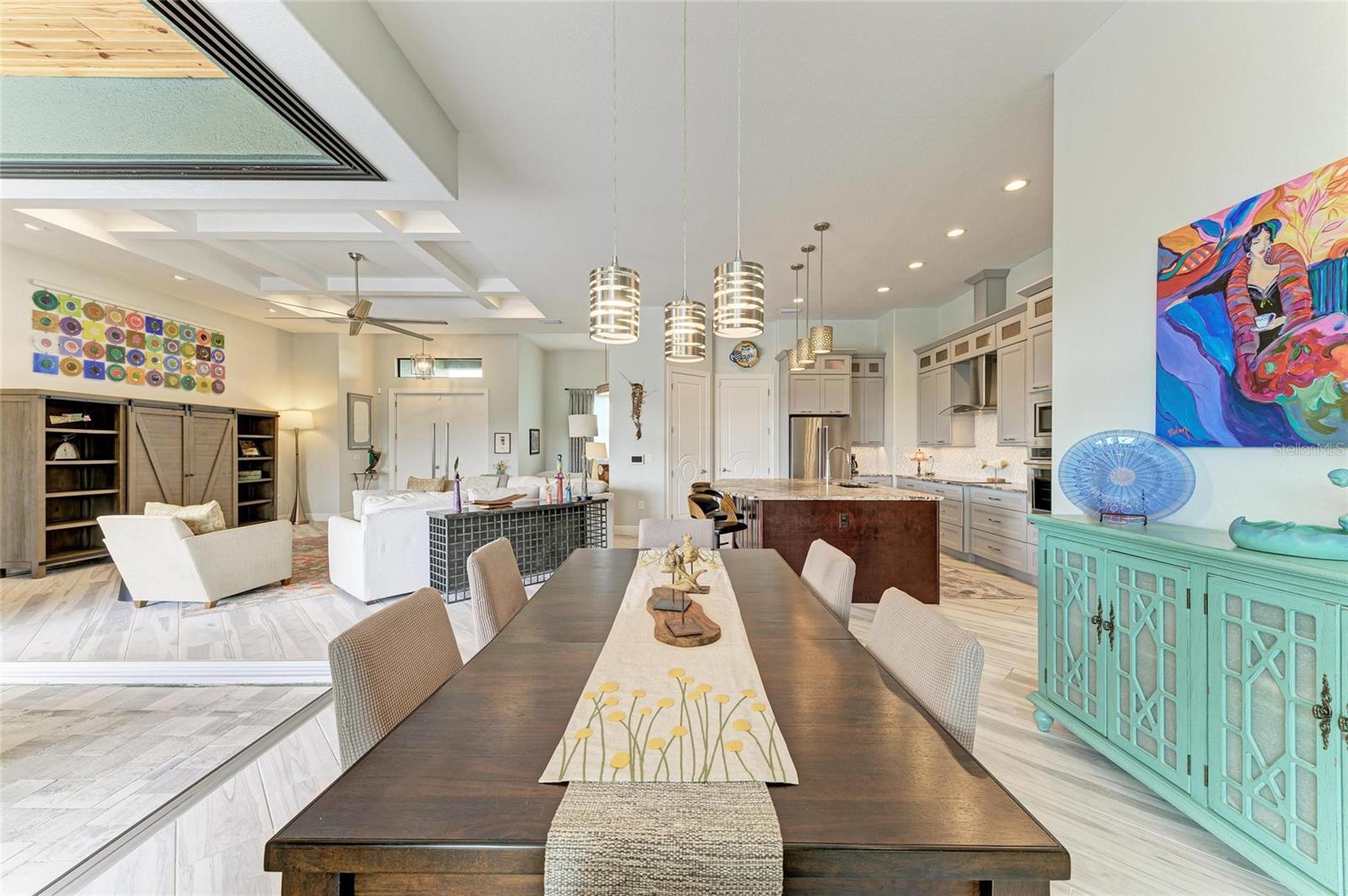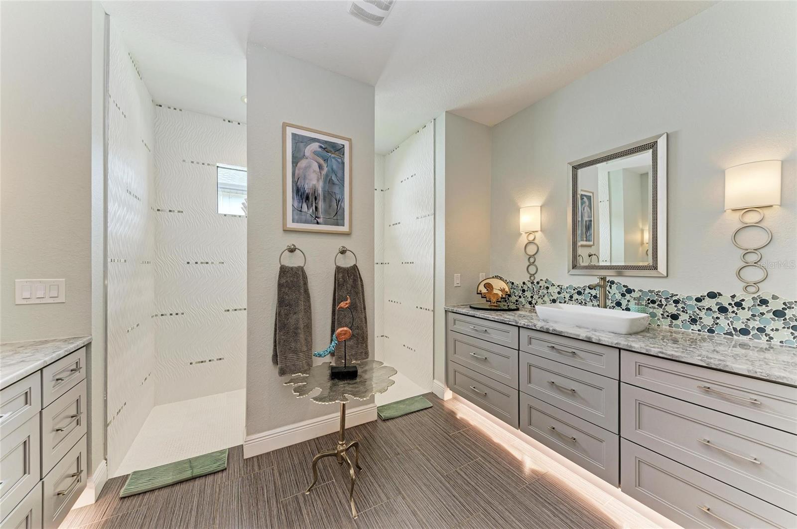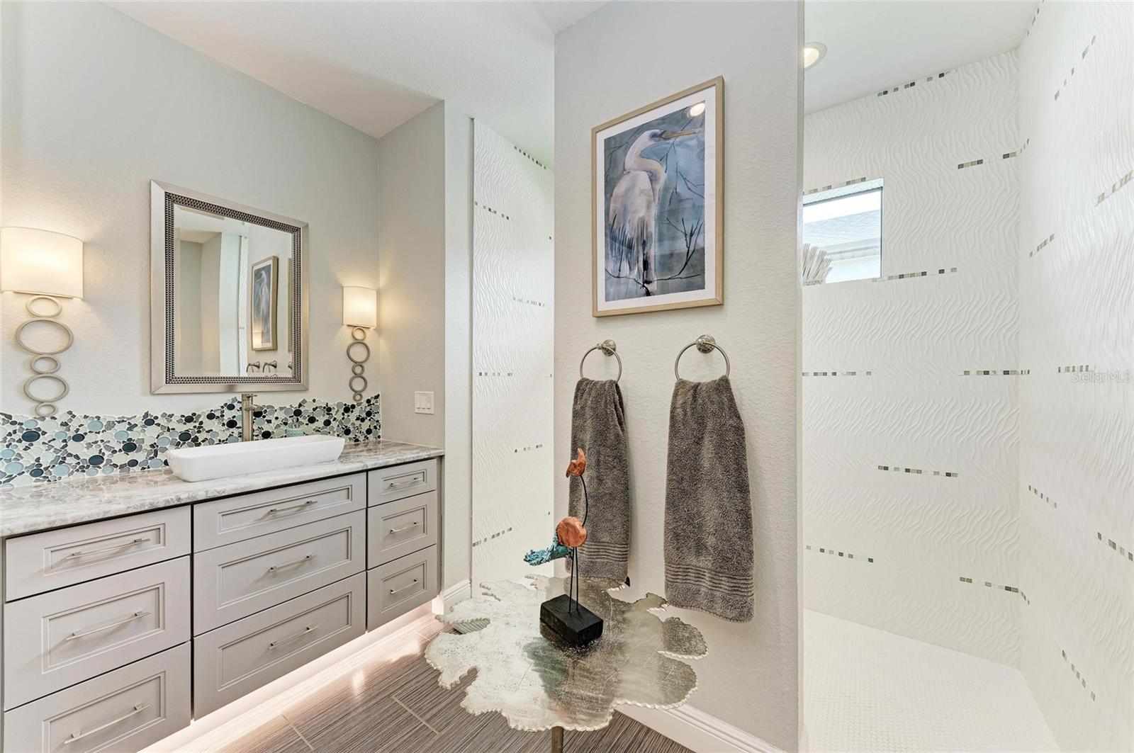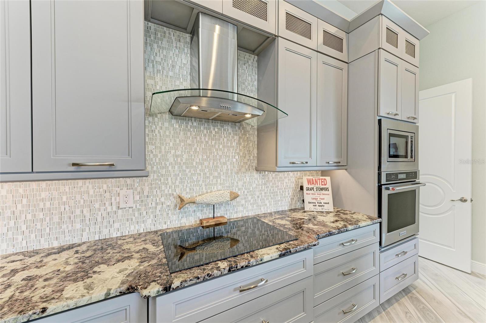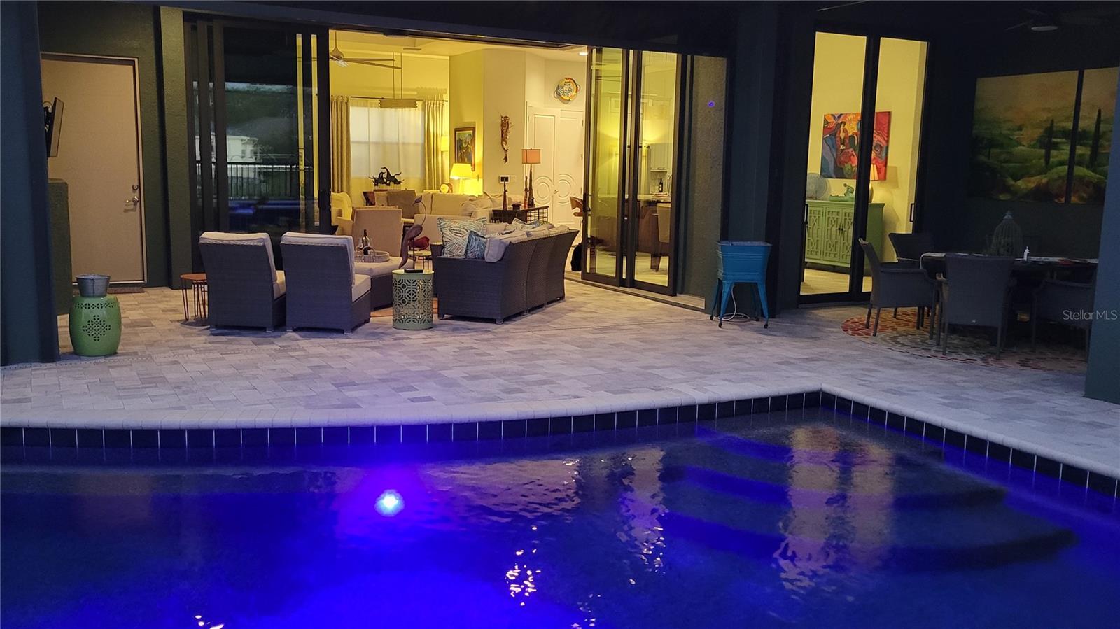 Nestled along serene waterfront, this exquisite contemporary home featuring 3 bedrooms, 2 baths plus bonus room blends modern luxury with elegant design, offering an unparalleled living experience. Pavered driveway and walkway guide you to the step up entry welcoming you inside where you're greeted by an expansive great room featuring a striking coffered 12-foot ceiling, setting the tone for the home’s sophisticated open-plan design. The heart of the home is its gourmet kitchen, showcasing an 8 x 6 foot upgraded granite island, large walk-in pantry, 58" custom wood cabinets with soft close doors and drawers, premium Bosch induction cooktop and Kitchen Aid appliances, all accentuated by upper and lower cabinet lighting. The primary bedroom is a true retreat, highlighted by a tray ceiling with soft lighting and crown molding with sliding doors to the lanai/pool area creating a tranquil atmosphere. The 9x13 walk-in closet is a masterpiece in organization, outfitted with designer shelving and stylish doors provides ample storage for your personal belongings and opens into the laundry room. The ensuite bath is equally impressive, with his/her granite-topped vanities featuring sleek vessel sinks upon granite counters, and a luxurious walk-through shower with upgraded tile work that enhances the spa-like feel. Throughout the living areas and primary suite, non-slip porcelain plank tile adds both elegance and functionality. Solid 8-foot wood doors can be found throughout the home, contributing to its refined, timeless character. Extensive lighting upgrades throughout the space illuminate the home’s unique architectural details. Step through the zero-corner, 10-foot sliding pocket doors that seamlessly connect the great room to the expansive 31x13-foot lanai and pool area. The outdoor space is a true extension of the home, offering a covered dining area, a cozy fireplace, an outdoor kitchen with marine grade cabinet with granite top, and a stunning white pine tongue-and-groove ceiling that adds warmth and charm. The lanai overlooks the pool area, where a 42 x 30-1/2-foot paver deck surrounds a heated, saltwater pool with pebble tec finish, complete with an integral step-up spa with same pebble tec finish. Approved variance allowed sellers to extend the pool surround by 5 feet creating a larger space for entertaining closer to the water. The home is equipped with a multi-zone HVAC system, ensuring comfort throughout every room. Exterior showcases rain gutters, lighting, and mature landscaping that is irrigated from the canal with an enclosed irrigation pump that provides the option to use city water. The 10 x 30 composite dock is the perfect spot for your fishing enjoyment or to dock your boat. The attached garage boasts an air conditioned combination art room/workshop and also presents an ADA compliant ramp for accessing home's entrance. Additional attributes are InReach brand power lifts that eliminate the need for using a ladder to add or remove items that are out of reach. Additionally, all windows are impact resistant. Sliders are either impact or protected by Kevlar screening. With meticulous attention to detail both inside and out, this waterfront home offers the perfect balance of luxury, comfort, and style.