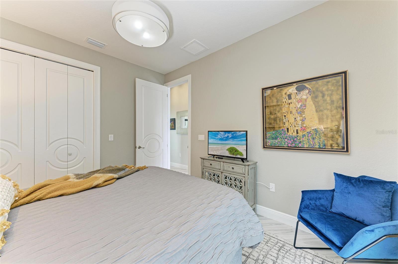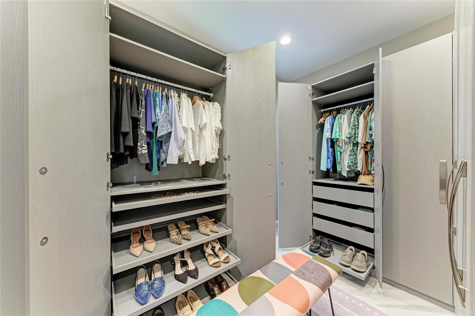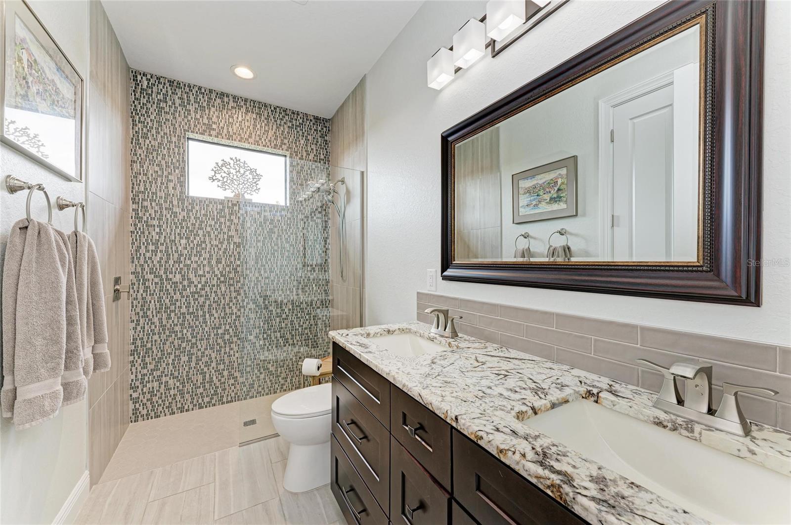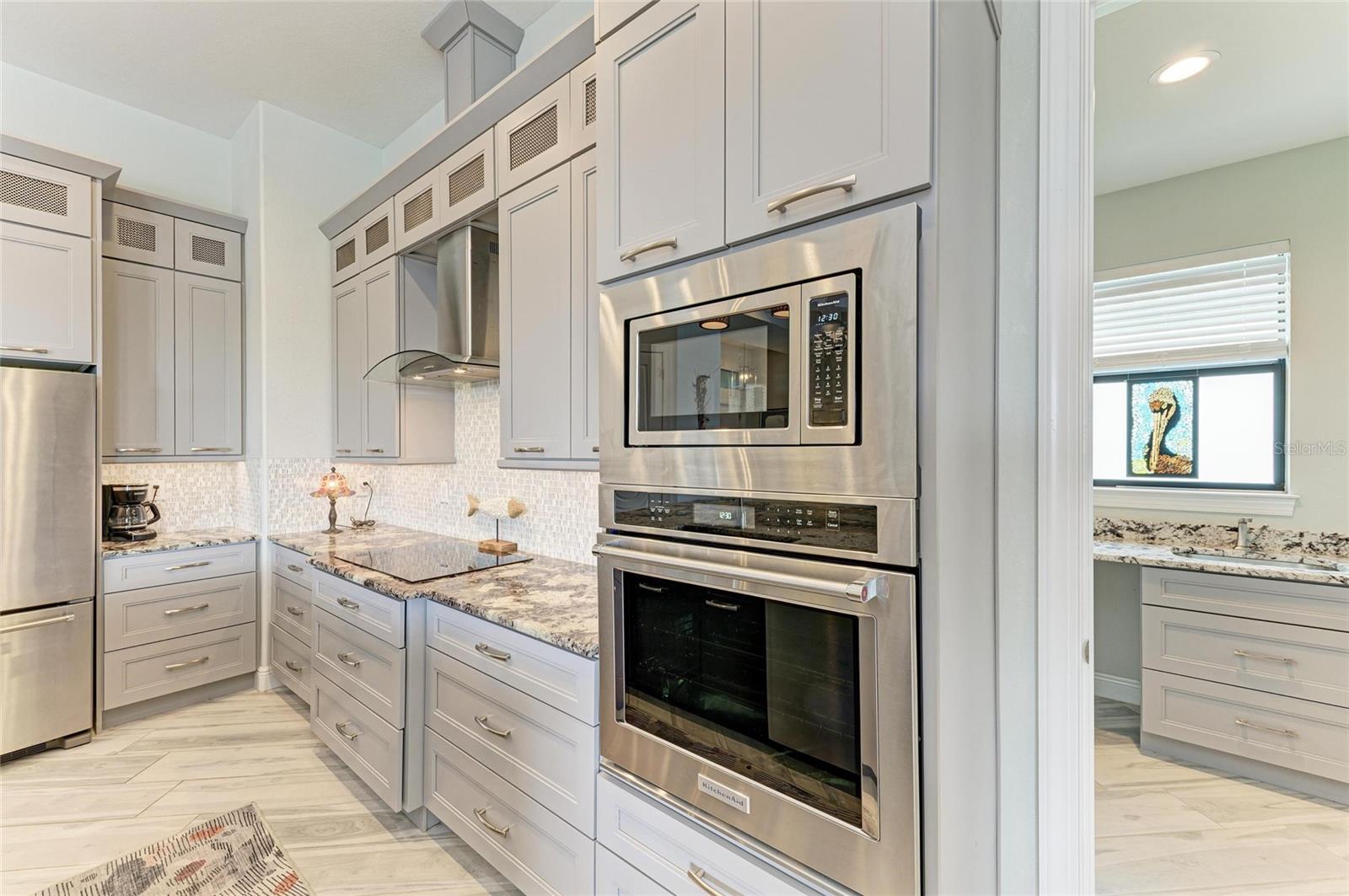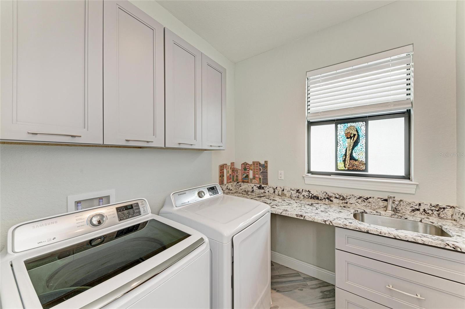 Nestled along serene waterfront, this exquisite contemporary home featuring 3 bedrooms, 2 baths plus bonus room blends modern luxury with elegant design, offering an unparalleled living experience. Pavered driveway and walkway guide you to the step up entry welcoming you inside where you're greeted by an expansive great room featuring a striking coffered 12-foot ceiling, setting the tone for the home’s sophisticated open-plan design. The heart of the home is its gourmet kitchen, showcasing an 8 x 6 foot upgraded granite island, large walk-in pantry, 58" custom wood cabinets with soft close doors and drawers, premium Bosch induction cooktop and Kitchen Aid appliances, all accentuated by upper and lower cabinet lighting. The primary bedroom is a true retreat, highlighted by a tray ceiling with soft lighting and crown molding with sliding doors to the lanai/pool area creating a tranquil atmosphere. The 9x13 walk-in closet is a masterpiece in organization, outfitted with designer shelving and stylish doors provides ample storage for your personal belongings and opens into the laundry room. The ensuite bath is equally impressive, with his/her granite-topped vanities featuring sleek vessel sinks upon granite counters, and a luxurious walk-through shower with upgraded tile work that enhances the spa-like feel. Throughout the living areas and primary suite, non-slip porcelain plank tile adds both elegance and functionality. Solid 8-foot wood doors can be found throughout the home, contributing to its refined, timeless character. Extensive lighting upgrades throughout the space illuminate the home’s unique architectural details. Step through the zero-corner, 10-foot sliding pocket doors that seamlessly connect the great room to the expansive 31x13-foot lanai and pool area. The outdoor space is a true extension of the home, offering a covered dining area, a cozy fireplace, an outdoor kitchen with marine grade cabinet with granite top, and a stunning white pine tongue-and-groove ceiling that adds warmth and charm. The lanai overlooks the pool area, where a 42 x 30-1/2-foot paver deck surrounds a heated, saltwater pool with pebble tec finish, complete with an integral step-up spa with same pebble tec finish. Approved variance allowed sellers to extend the pool surround by 5 feet creating a larger space for entertaining closer to the water. The home is equipped with a multi-zone HVAC system, ensuring comfort throughout every room. Exterior showcases rain gutters, lighting, and mature landscaping that is irrigated from the canal with an enclosed irrigation pump that provides the option to use city water. The 10 x 30 composite dock is the perfect spot for your fishing enjoyment or to dock your boat. The attached garage boasts an air conditioned combination art room/workshop and also presents an ADA compliant ramp for accessing home's entrance. Additional attributes are InReach brand power lifts that eliminate the need for using a ladder to add or remove items that are out of reach. Additionally, all windows are impact resistant. Sliders are either impact or protected by Kevlar screening. With meticulous attention to detail both inside and out, this waterfront home offers the perfect balance of luxury, comfort, and style.