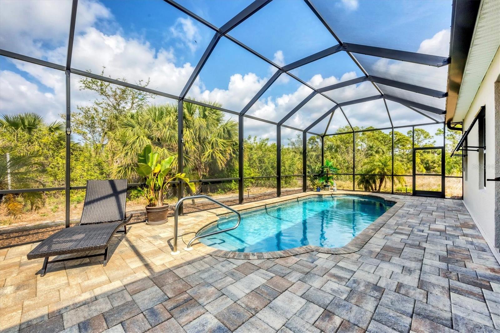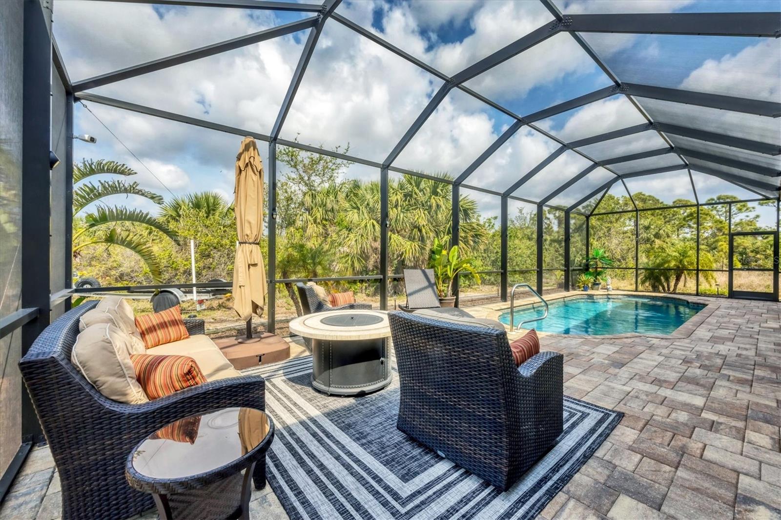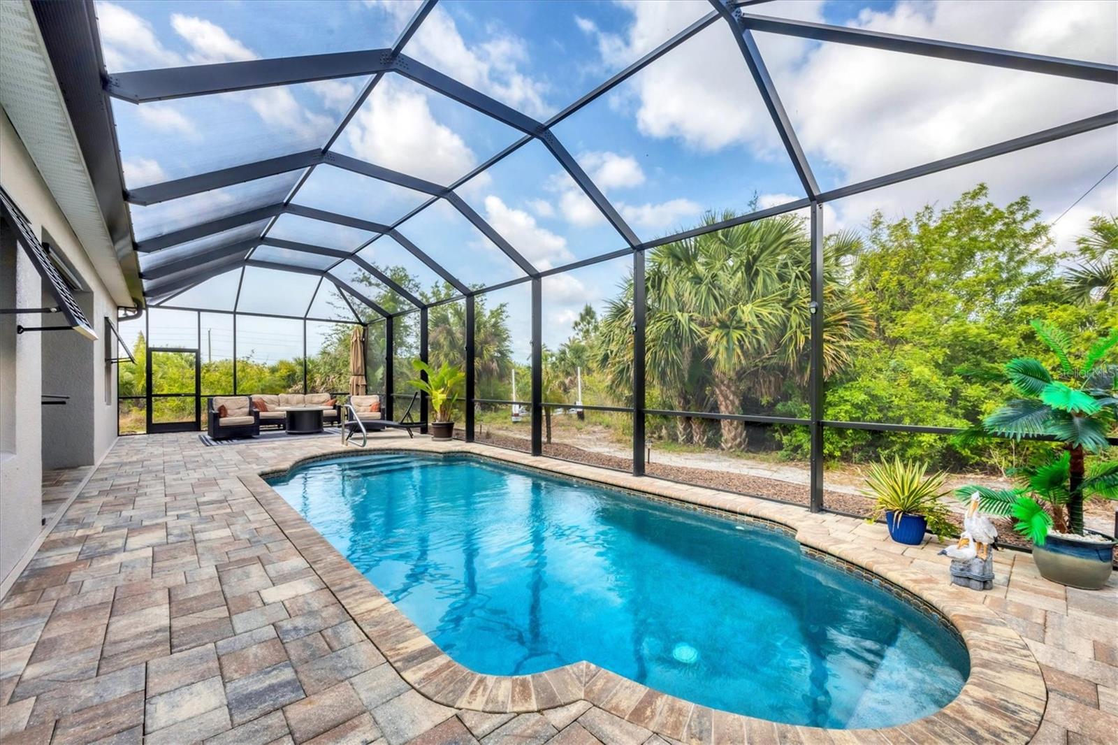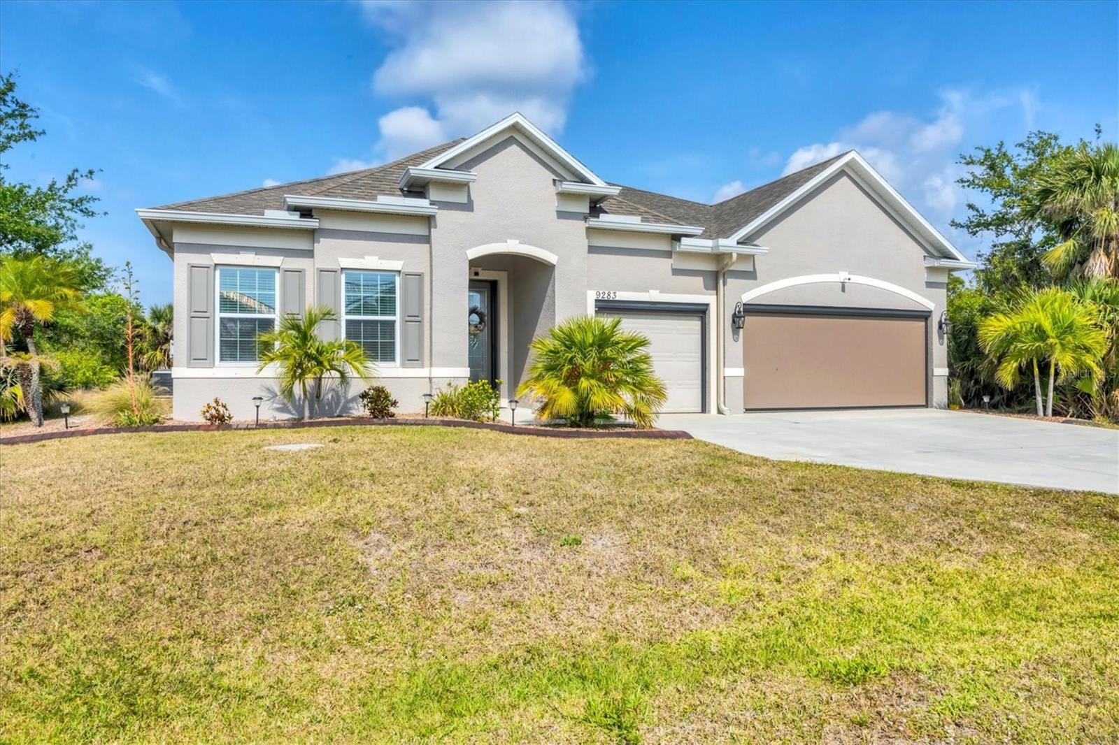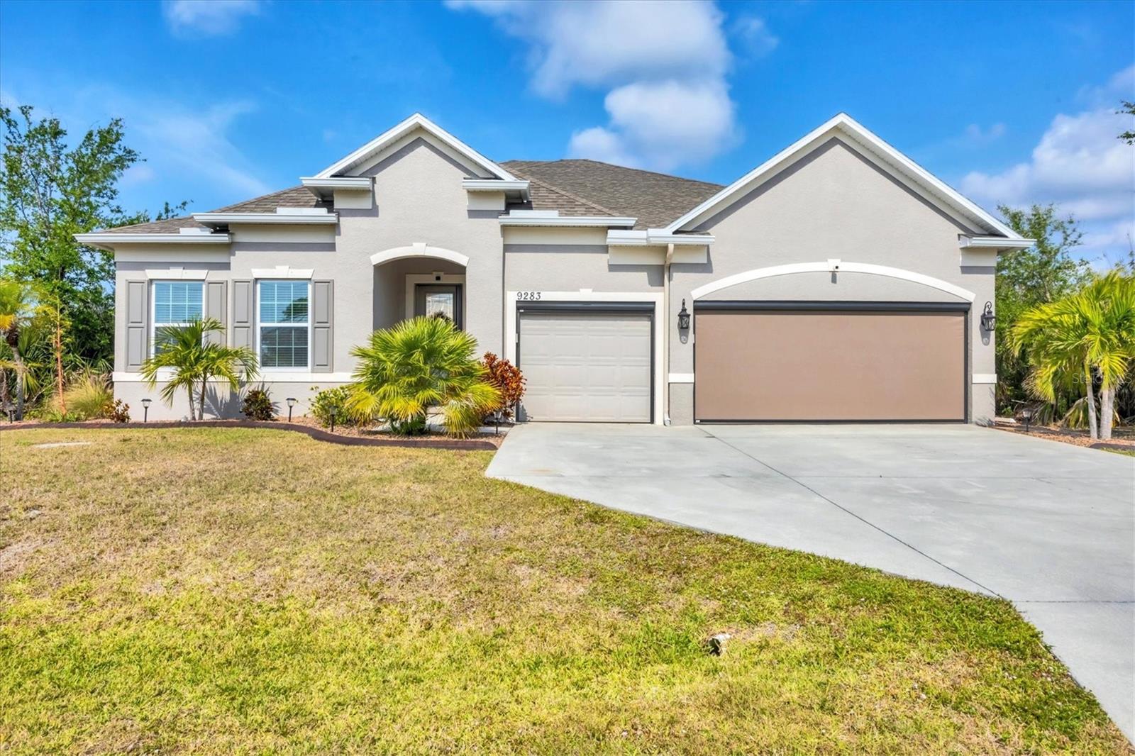 Under contract-accepting backup offers. MOTIVATED SELLERS! Nestled in the sought-after community of South Gulf Cove, this stunning 4-bedroom, 3-bathroom pool home with a 3-car garage offers both luxury and comfort. A charming leaded glass front door with a phantom screen welcomes you inside, where you'll find an open and inviting layout filled with natural light. The beautifully designed kitchen boasts solid wood cabinets, granite countertops, a tile backsplash, a closet pantry, a double oven, stainless steel appliances, and a breakfast bar—perfect for entertaining. Stylish lighting, ceiling fans, crown molding, and elegant finishes flow throughout the home. The spacious master suite features a luxurious en-suite bath with a garden tub, a walk-in tiled shower, dual sinks, and a generous walk-in closet. A private guest suite includes its own walk-in closet and an en-suite bath with a walk-in tiled shower, while bedrooms three and four are split from the others for added privacy and share a well-appointed bath with a tub-shower combo. The dedicated office space offers access to the pool lanai, creating a seamless indoor-outdoor connection. A large inside laundry room with a sink adds convenience. Step outside to the expansive lanai with a new 2023 pool cage, where you can relax in the sun or shade while enjoying the saltwater pool, heated by a brand-new 2024 pool heater. The private backyard and hurricane shutters provide peace of mind. Additional features include motorized screens for the 3-car garage, making this home as practical as it is beautiful. The South Gulf Cove community offers an array of amenities, including a park, playground, bike and walking paths, and a community boat ramp for boating enthusiasts. Located just minutes from shopping, dining, fishing, boating, and gorgeous Gulf beaches, this home has it all! Don't miss the opportunity to own this exceptional South Gulf Cove retreat!