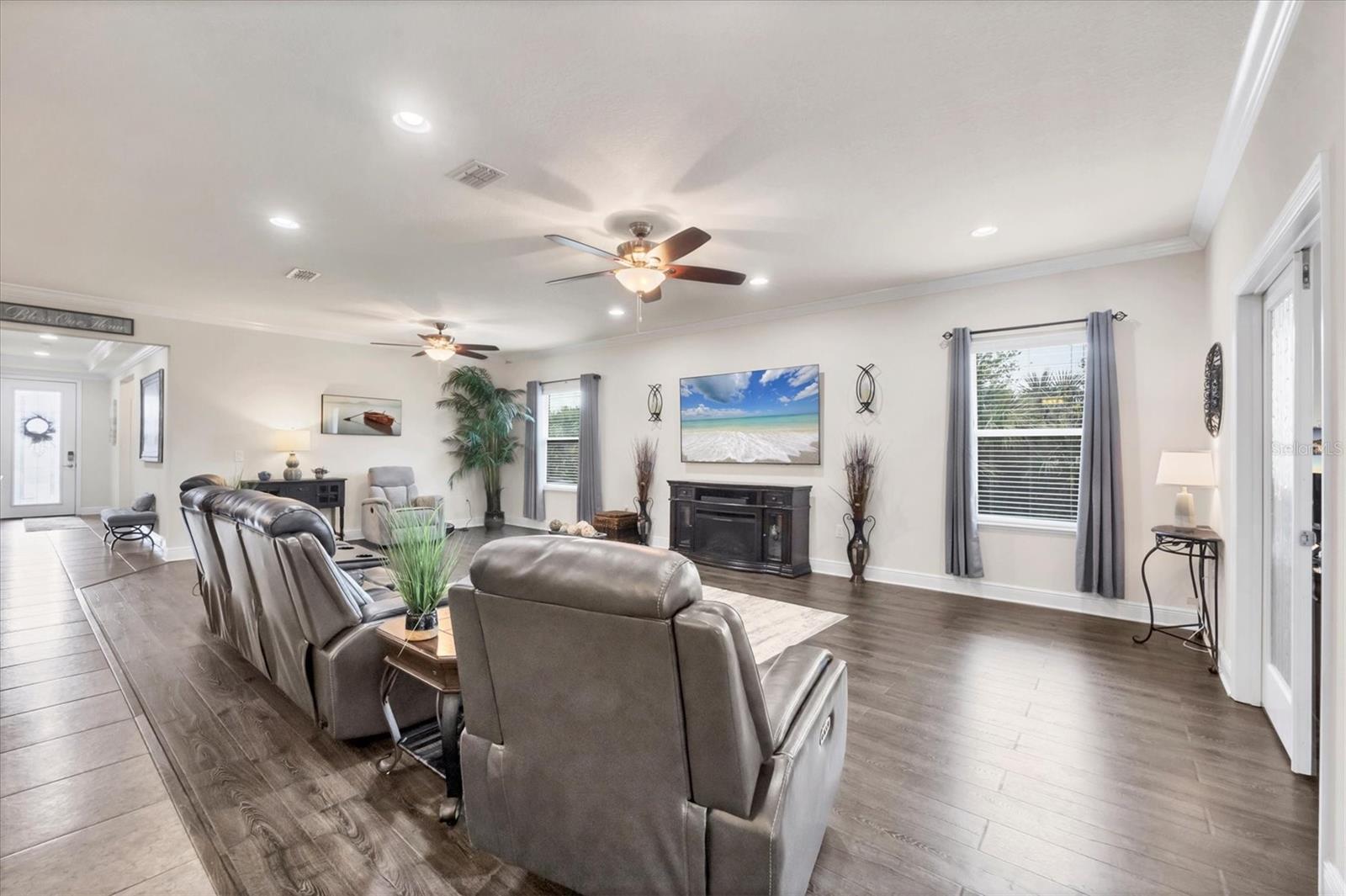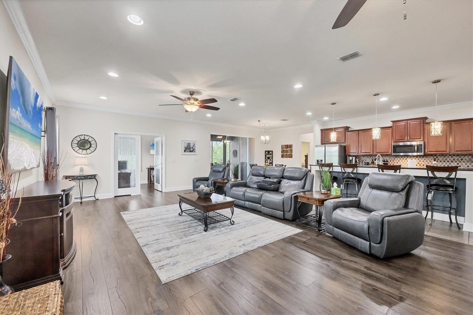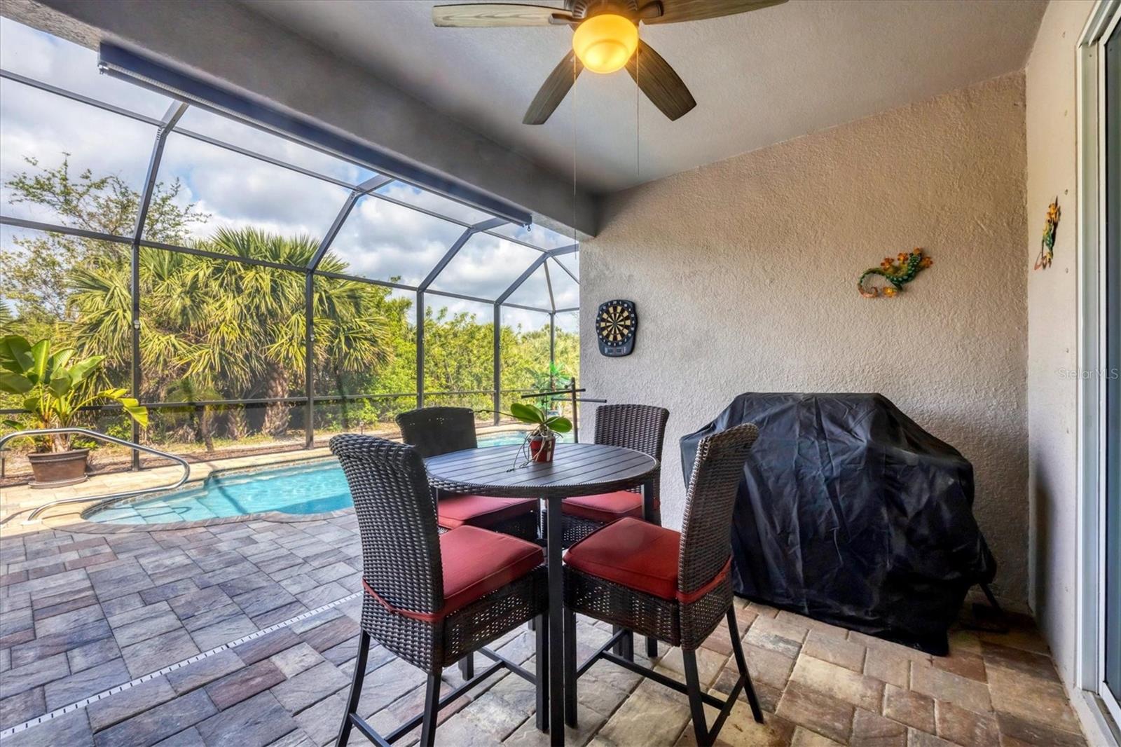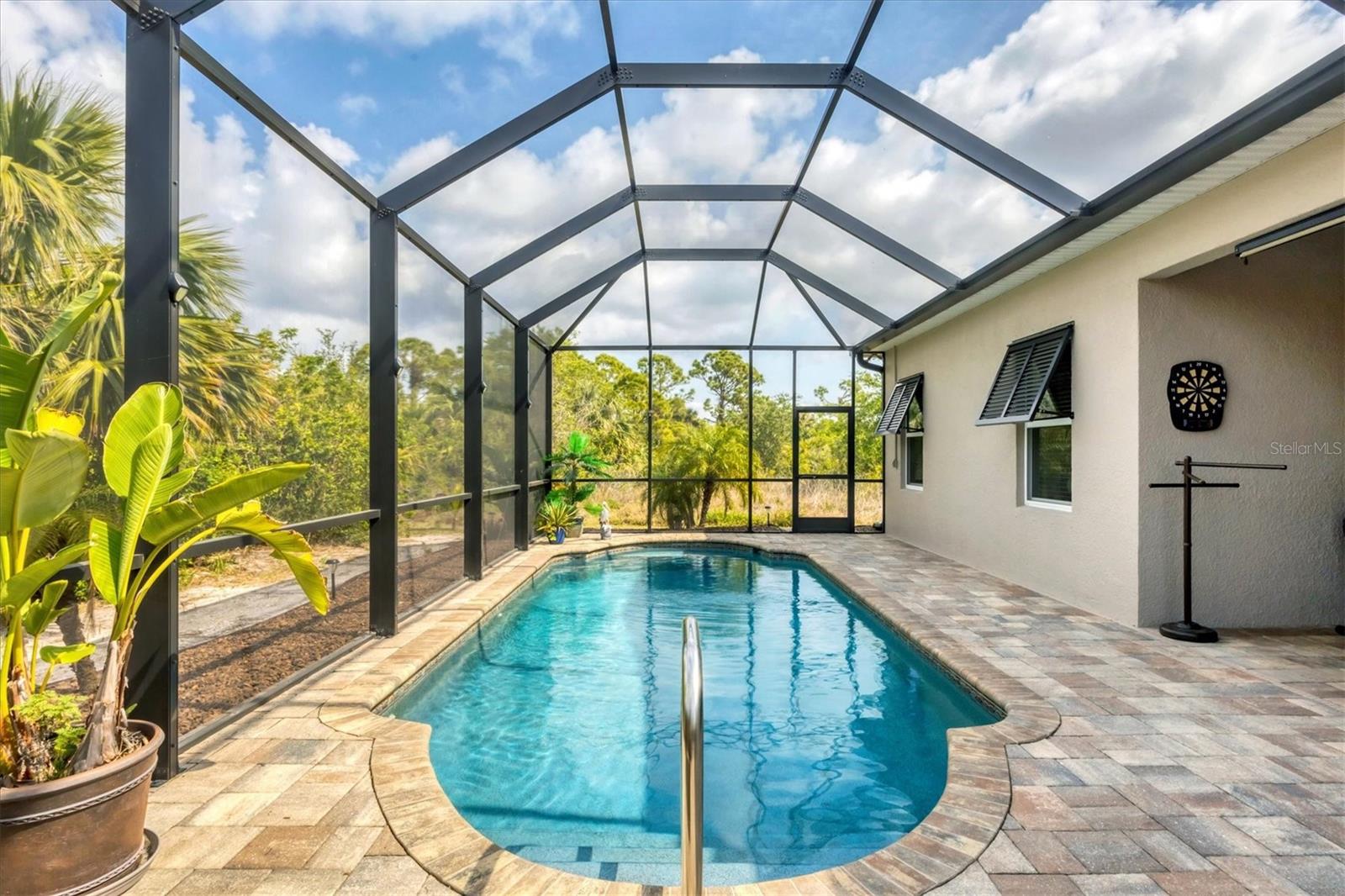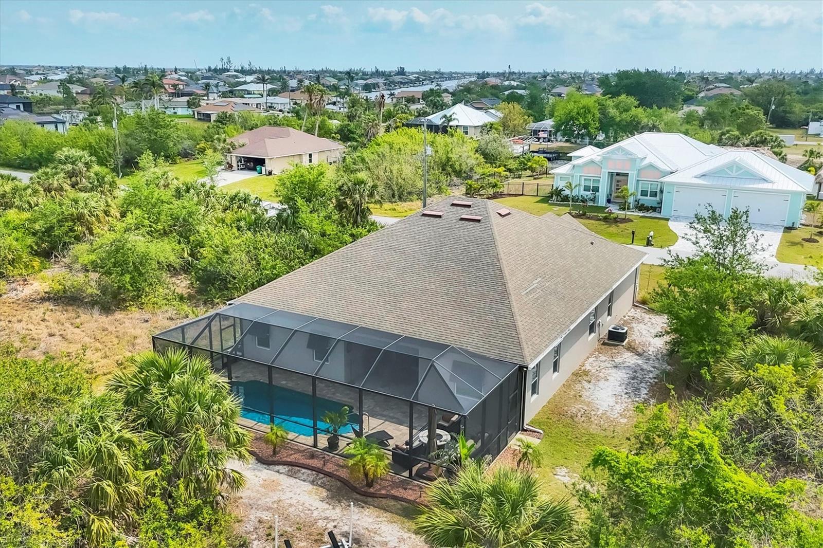 Under contract-accepting backup offers. MOTIVATED SELLERS! Nestled in the sought-after community of South Gulf Cove, this stunning 4-bedroom, 3-bathroom pool home with a 3-car garage offers both luxury and comfort. A charming leaded glass front door with a phantom screen welcomes you inside, where you'll find an open and inviting layout filled with natural light. The beautifully designed kitchen boasts solid wood cabinets, granite countertops, a tile backsplash, a closet pantry, a double oven, stainless steel appliances, and a breakfast bar—perfect for entertaining. Stylish lighting, ceiling fans, crown molding, and elegant finishes flow throughout the home. The spacious master suite features a luxurious en-suite bath with a garden tub, a walk-in tiled shower, dual sinks, and a generous walk-in closet. A private guest suite includes its own walk-in closet and an en-suite bath with a walk-in tiled shower, while bedrooms three and four are split from the others for added privacy and share a well-appointed bath with a tub-shower combo. The dedicated office space offers access to the pool lanai, creating a seamless indoor-outdoor connection. A large inside laundry room with a sink adds convenience. Step outside to the expansive lanai with a new 2023 pool cage, where you can relax in the sun or shade while enjoying the saltwater pool, heated by a brand-new 2024 pool heater. The private backyard and hurricane shutters provide peace of mind. Additional features include motorized screens for the 3-car garage, making this home as practical as it is beautiful. The South Gulf Cove community offers an array of amenities, including a park, playground, bike and walking paths, and a community boat ramp for boating enthusiasts. Located just minutes from shopping, dining, fishing, boating, and gorgeous Gulf beaches, this home has it all! Don't miss the opportunity to own this exceptional South Gulf Cove retreat!