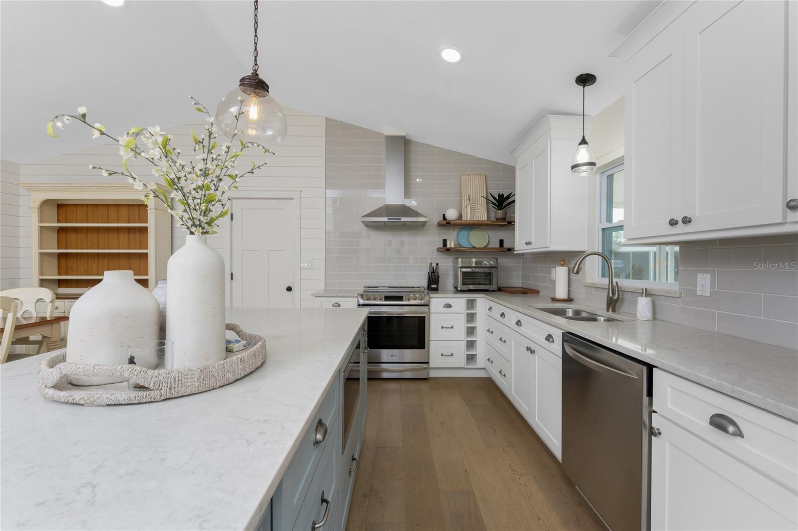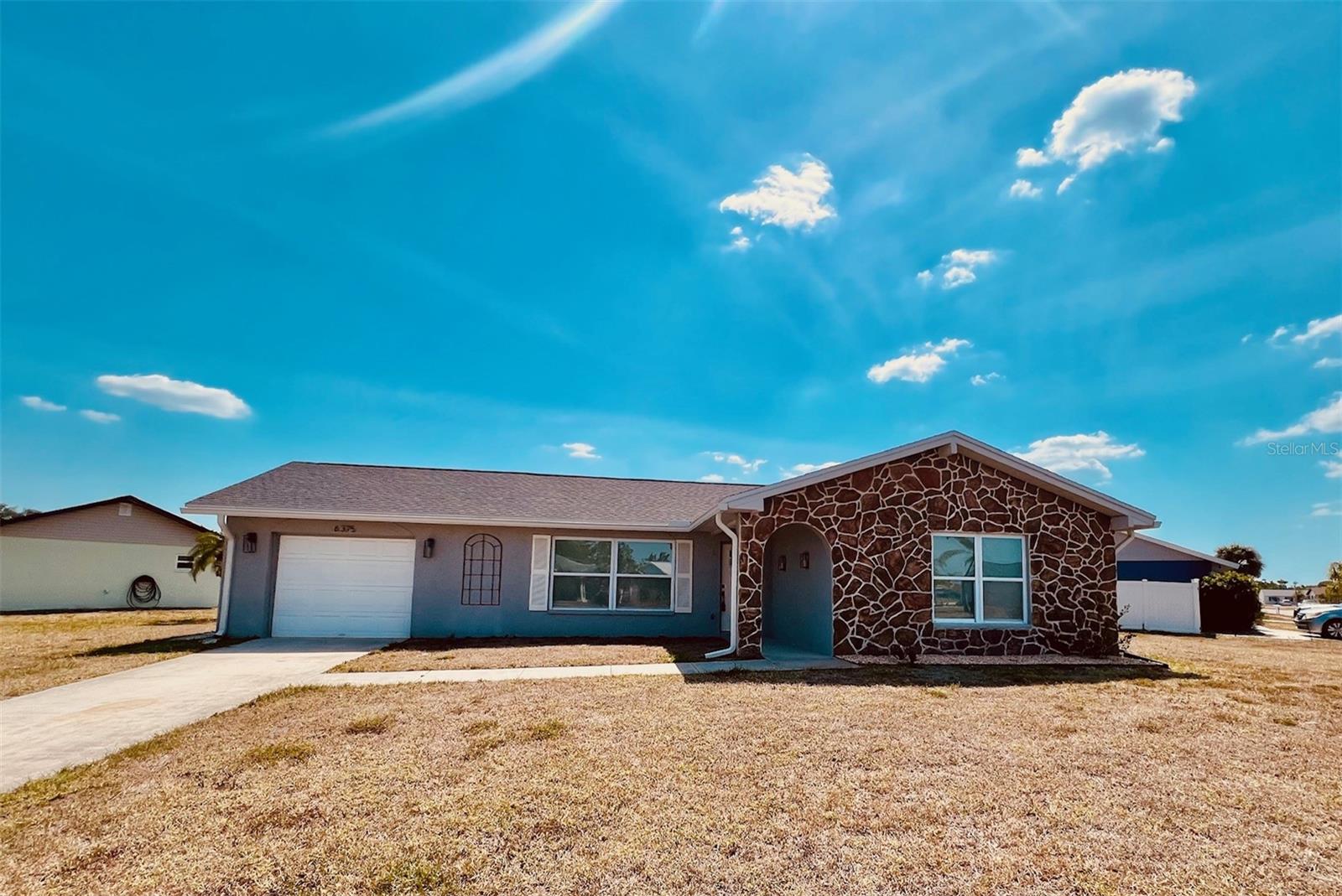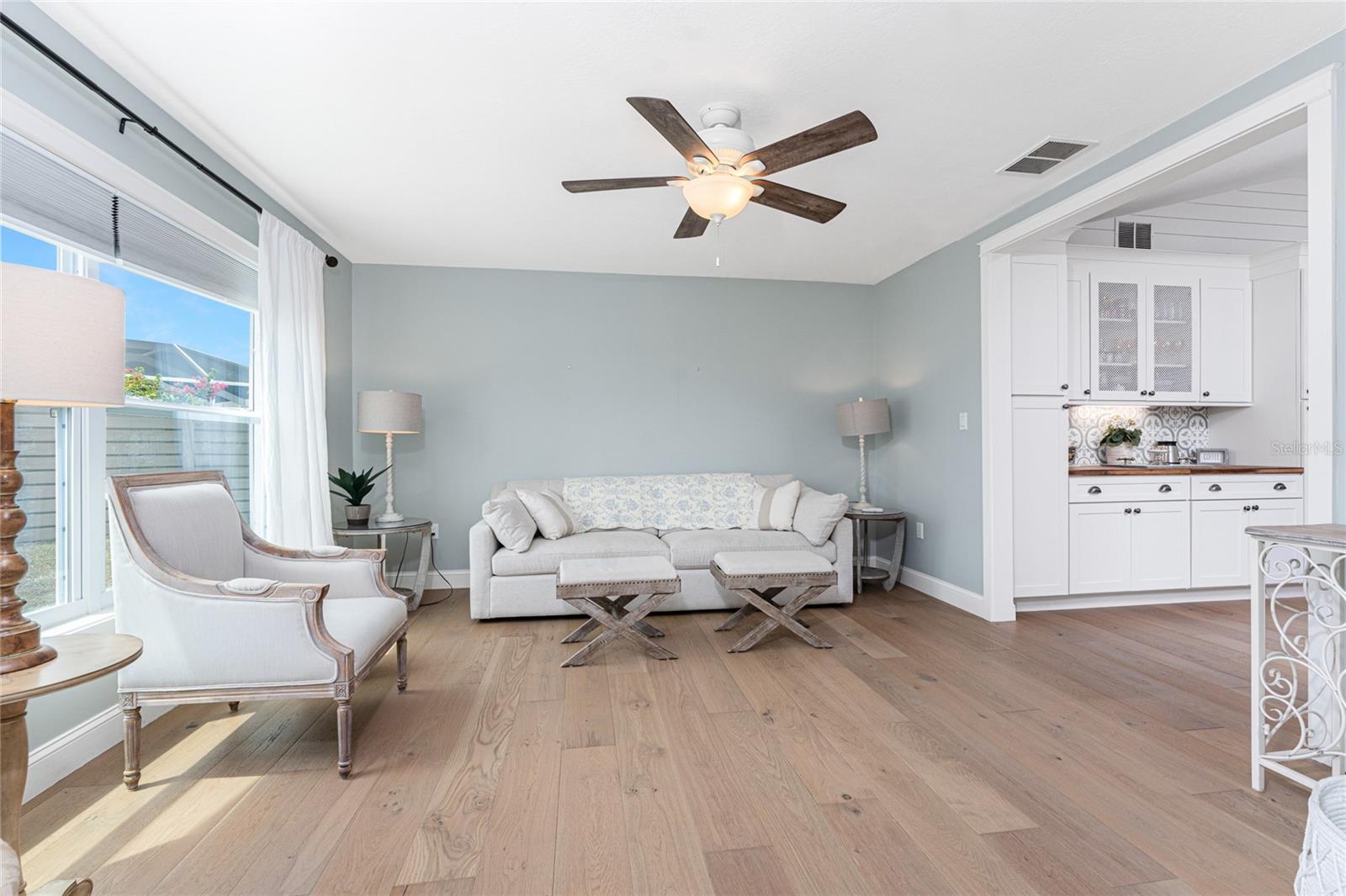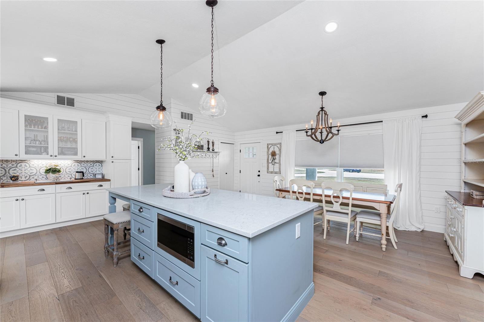 WOW!!! Wait till you view the interior of this two-bedroom, two bath oversized single-car garage home. The quality of craftsmanship is next level; floor to ceiling clapboard walls, countertop to ceiling kitchen backsplash, custom wall panel design in primary bedroom and fully tiled showers in bathrooms. The stunning and spacious kitchen offers a perfect balance of beauty and function. A generous island with built-in microwave includes seating for three & quartz countertops. The kitchen also includes a stainless-steel hood over a glass cook-top stove/range, and all stainless-steel LG appliances. Solid wood plank flooring throughout provides warmth and touch of class. This bright and airy home features a Cathedral ceiling in the Dining Area and Kitchen, and a south facing Family Room adjacent to the screened/covered lanai with an open patio beyond. The primary bedroom includes two side-by-side built-in closets and a stunning en-suite bathroom through the beautiful rolling barn door. Roof replaced 2022, Impact windows and sliding glass door 2018, new electrical panel 2018, and a Manabloc plumbing system. This home is located in the deed restricted community of Gardens of Gulf Cove, which offers lots of amenities: two community pools, a clubhouse and rec center. Fitness equipment, shuffleboard, tennis and pickleball courts, basketball, bocce ball and even a pool table. Conveniently located near public beaches, championship golf courses, shopping and a variety of dining options. The community is also close to the Charlotte County Sports Park, home to the Tampa Bay Rays spring training and Cool Today Park, home to the Atlanta Braves training facility. This a must see to believe home!!!