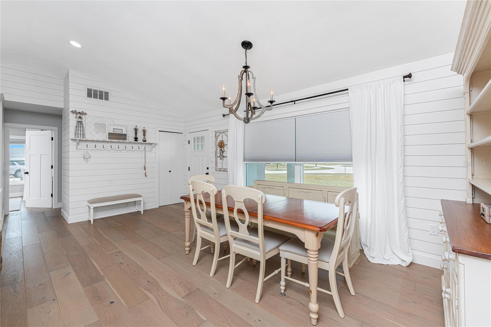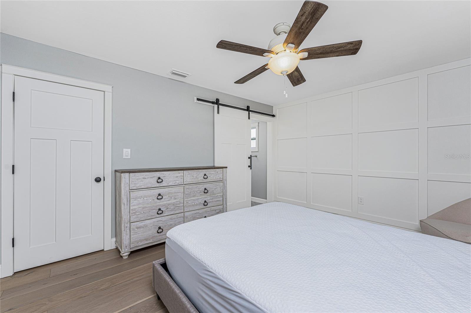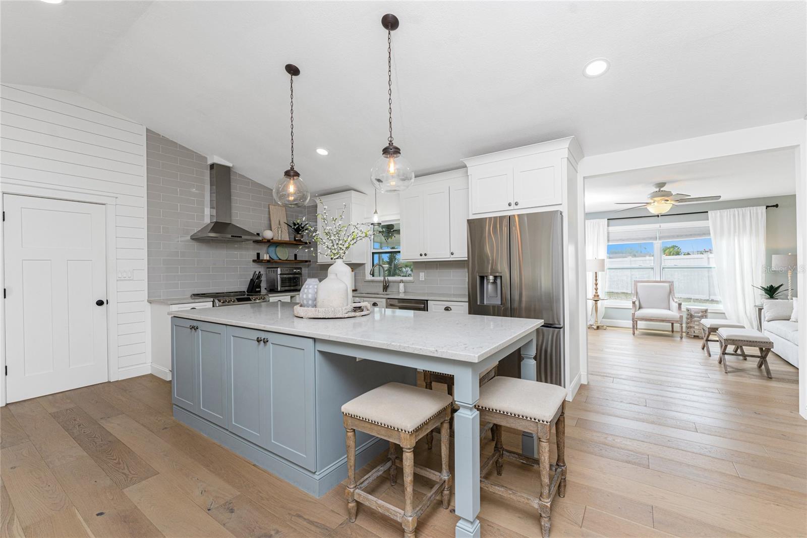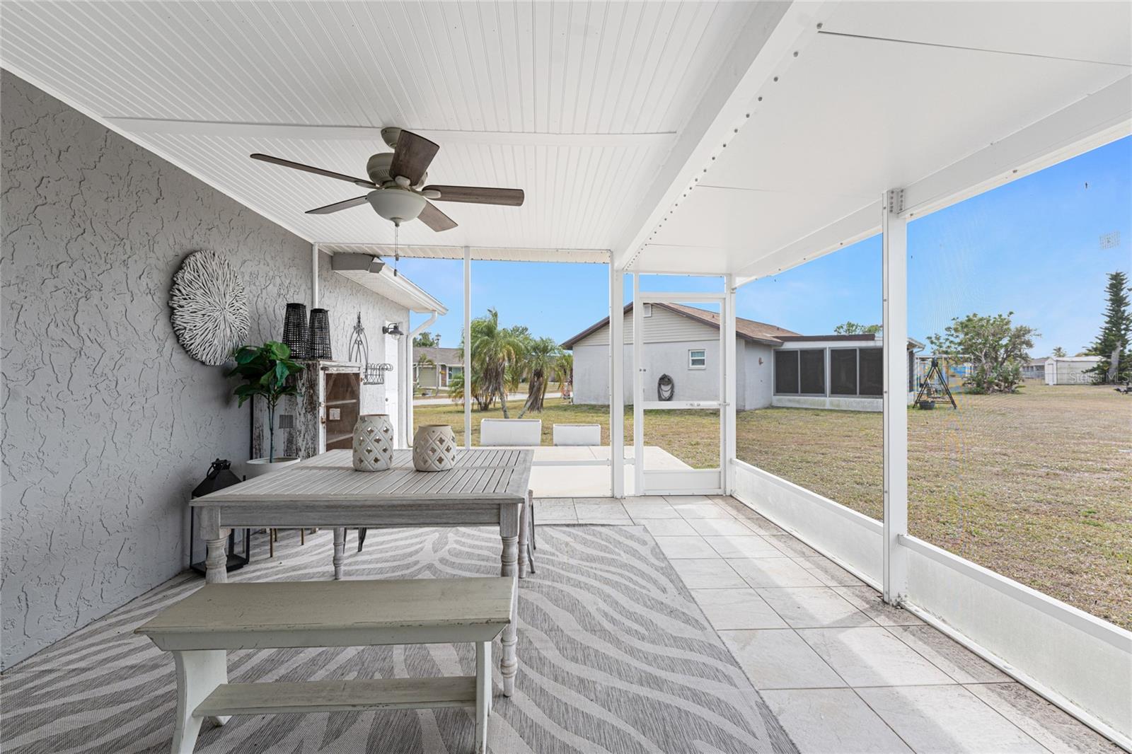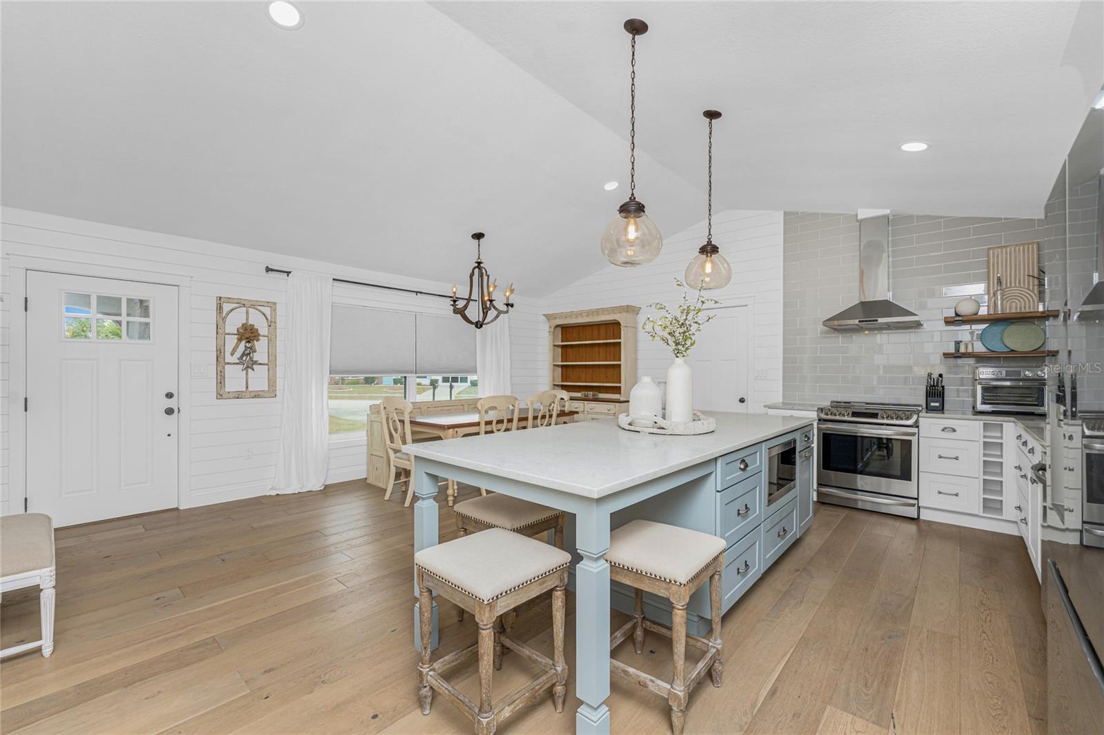 WOW!!! Wait till you view the interior of this two-bedroom, two bath oversized single-car garage home. The quality of craftsmanship is next level; floor to ceiling clapboard walls, countertop to ceiling kitchen backsplash, custom wall panel design in primary bedroom and fully tiled showers in bathrooms. The stunning and spacious kitchen offers a perfect balance of beauty and function. A generous island with built-in microwave includes seating for three & quartz countertops. The kitchen also includes a stainless-steel hood over a glass cook-top stove/range, and all stainless-steel LG appliances. Solid wood plank flooring throughout provides warmth and touch of class. This bright and airy home features a Cathedral ceiling in the Dining Area and Kitchen, and a south facing Family Room adjacent to the screened/covered lanai with an open patio beyond. The primary bedroom includes two side-by-side built-in closets and a stunning en-suite bathroom through the beautiful rolling barn door. Roof replaced 2022, Impact windows and sliding glass door 2018, new electrical panel 2018, and a Manabloc plumbing system. This home is located in the deed restricted community of Gardens of Gulf Cove, which offers lots of amenities: two community pools, a clubhouse and rec center. Fitness equipment, shuffleboard, tennis and pickleball courts, basketball, bocce ball and even a pool table. Conveniently located near public beaches, championship golf courses, shopping and a variety of dining options. The community is also close to the Charlotte County Sports Park, home to the Tampa Bay Rays spring training and Cool Today Park, home to the Atlanta Braves training facility. This a must see to believe home!!!