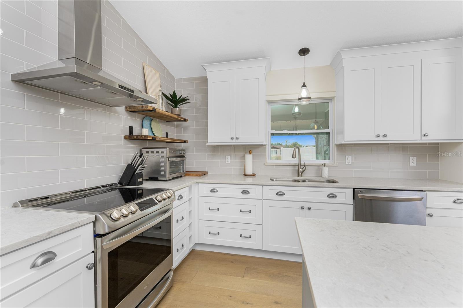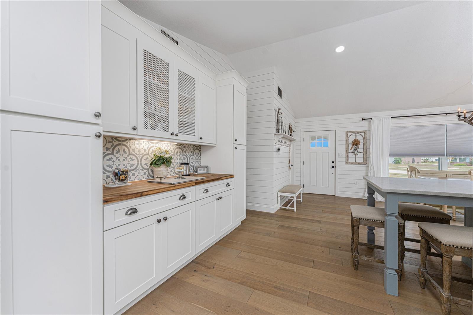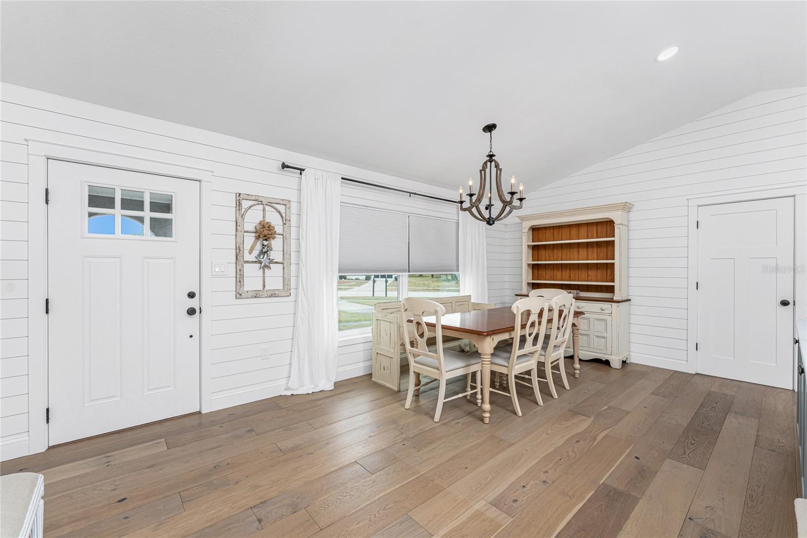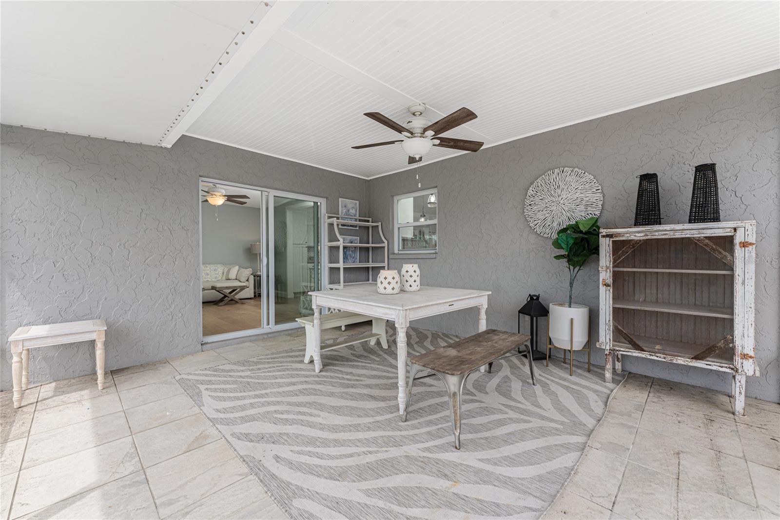 WOW!!! Wait till you view the interior of this two-bedroom, two bath oversized single-car garage home. The quality of craftsmanship is next level; floor to ceiling clapboard walls, countertop to ceiling kitchen backsplash, custom wall panel design in primary bedroom and fully tiled showers in bathrooms. The stunning and spacious kitchen offers a perfect balance of beauty and function. A generous island with built-in microwave includes seating for three & quartz countertops. The kitchen also includes a stainless-steel hood over a glass cook-top stove/range, and all stainless-steel LG appliances. Solid wood plank flooring throughout provides warmth and touch of class. This bright and airy home features a Cathedral ceiling in the Dining Area and Kitchen, and a south facing Family Room adjacent to the screened/covered lanai with an open patio beyond. The primary bedroom includes two side-by-side built-in closets and a stunning en-suite bathroom through the beautiful rolling barn door. Roof replaced 2022, Impact windows and sliding glass door 2018, new electrical panel 2018, and a Manabloc plumbing system. This home is located in the deed restricted community of Gardens of Gulf Cove, which offers lots of amenities: two community pools, a clubhouse and rec center. Fitness equipment, shuffleboard, tennis and pickleball courts, basketball, bocce ball and even a pool table. Conveniently located near public beaches, championship golf courses, shopping and a variety of dining options. The community is also close to the Charlotte County Sports Park, home to the Tampa Bay Rays spring training and Cool Today Park, home to the Atlanta Braves training facility. This a must see to believe home!!!